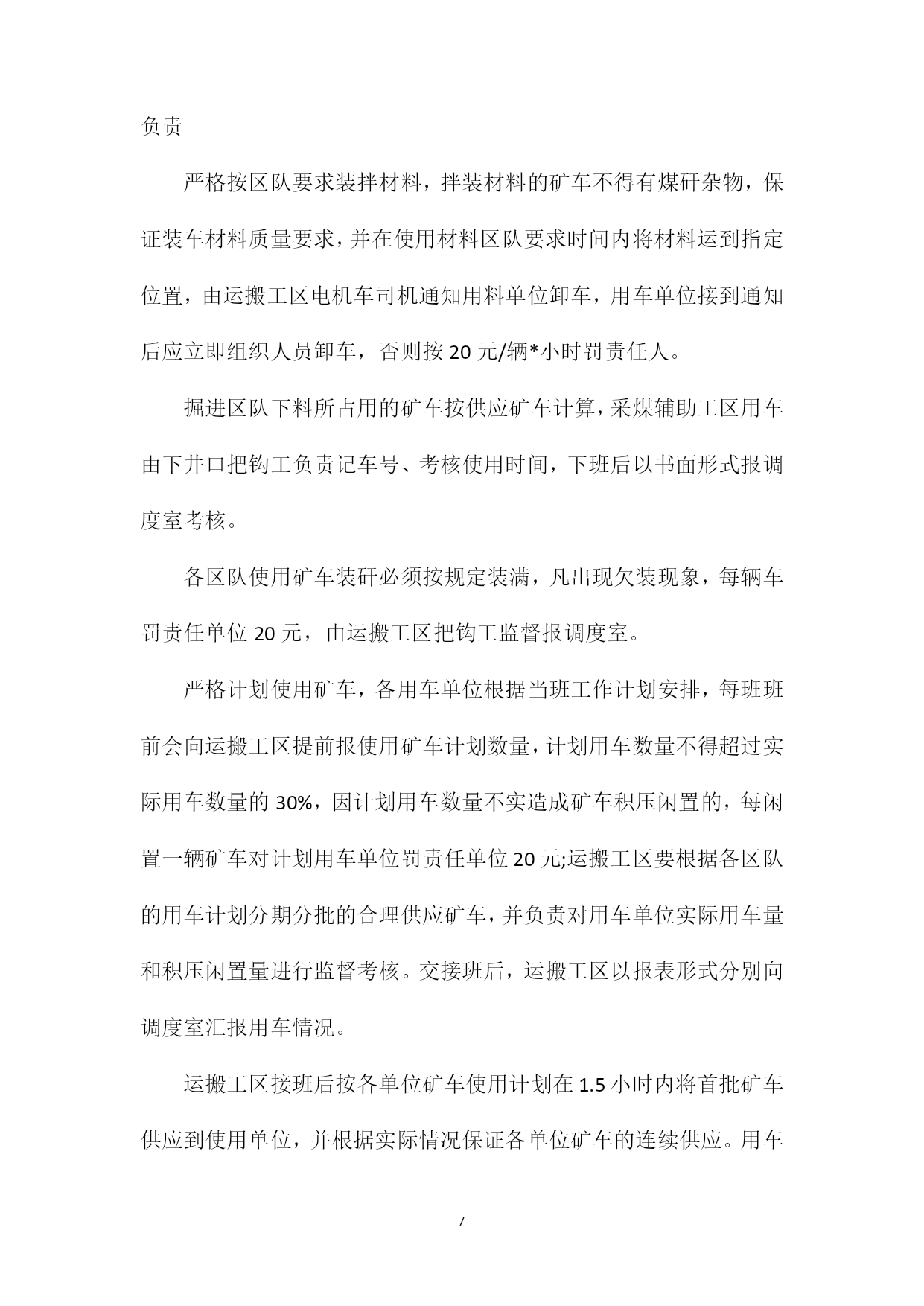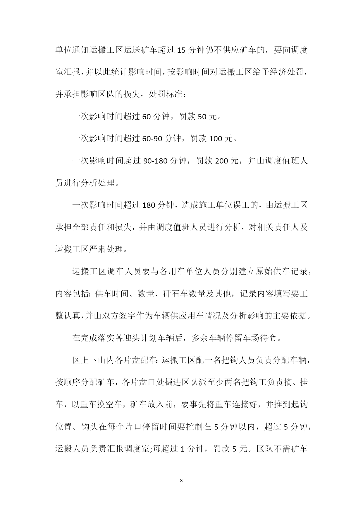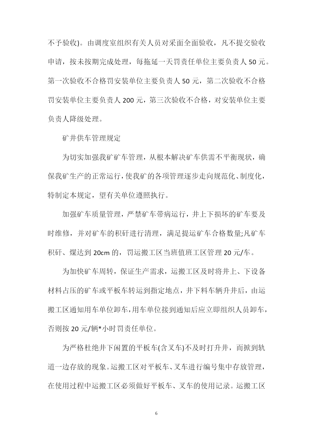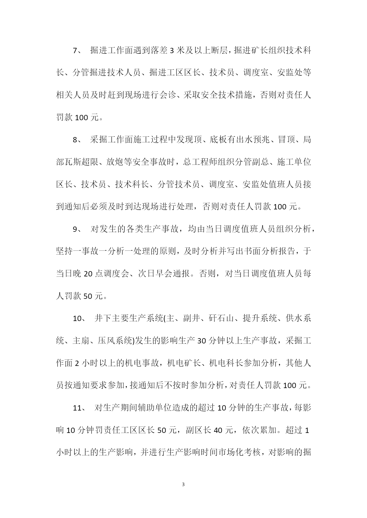 PAGEPAGE27剥皮芝煤矿各类规定汇编剥皮芝煤矿各类规定汇编二0一三年三月目录1、生产事故考核规定2、采煤工作面安装验收规定3、矿井供车管理规定4、升入井料车管理规定5、贯通安全管理规定6、回采与掘进煤含矸石管理规定7、采掘区队出勤管理规定8、安全生产工作安排落实情况考核规定9、调度室事故处理预案10、生产区队交接班管理规定11、关于生产辅助单位职责范围划分的有关规定12、采掘区队管理干部下井带班的有关规定生产事故考核规定1、发生生产事故后,调度室及时通知有关人员并履行调度职责,不服从生产调度指挥的对责任者罚款100元,造成严重后果的从严追究责任。2、发生主提升系统(非正常)中断生产事故30分钟,机电矿长、机电科长、调度主任、调度值班人员、主管单位区长、技术员接到通知后10分钟内必须下井到现场进行处理,否则对责任人罚款100元。3、井上、下主供电系统发生故障停电影响生产超过10分钟的,机电科长、运转区长、技术员、值班电工、调度值班人员接到调度通知后10分钟内(地面)必须到达现场或(井下)下井到现场进行处理,否则对责任人罚款100元;超过30分钟调度员必须通知机电矿长指挥处理。4、采区上、下山提升运输系统出现影响生产30分钟,机电科长、运搬工区区长、技术员、值班电工、调度值班人员接到通知后10分钟内必须下井到现场进行处理,否则对责任人罚款100元。5、采煤工作面出现影响生产30分钟及以上的生产事故,调度室及时通知当日调度值班人员,接通知后当日调度值班人员10分钟内必须下井到现场进行处理,否则对责任人罚款100元。6、采煤工作面遇到落差2.0米及以上断层,采煤矿长组织技术科长、分管采煤技术人员、采煤工区区长、技术员、调度室、安监处等相关人员及时赶到现场进行会诊、采取安全技术措施,否则对责任人罚款100元。7、掘进工作面遇到落差3米及以上断层,掘进矿长组织技术科长、分管掘进技术人员、掘进工区区长、技术员、调度室、安监处等相关人员及时赶到现场进行会诊、采取安全技术措施,否则对责任人罚款100元。8、采掘工作面施工过程中发现顶、底板有出水预兆、冒顶、局部瓦斯超限、放炮等安全事故时,总工程师组织分管副总、施工单位区长、技术员、技术科长、分管技术员、调度室、安监处值班人员接到通知后必须及时到达现场进行处理,否则对责任人罚款100元。9、对发生的各类生产事故,均由当日调度值班人员组织分析,坚持一事故一分析一处理的原则,及时分析并写出书面分析报告,于当日晚20点调度会、次日早会通报。否则,对当日调度值班人员每人罚款50元。10、井下主要生产系统(主、副井、矸石山、提升系统、供水系统、主扇、压风系统)发生的影响生产30分钟以上生产事故,采掘工作面2小时以上的机电事故,机电矿长、机电科长参加分析,其他人员按通知要求参加,接通知后不按时参加分析,对责任人罚款100元。11、对生产期间辅助单位造成的超过10分钟的生产事故,每影响10分钟罚责任工区区长50元,副区长40元,依次累加。超过1小时以上的生产影响,并进行生产影响时间市场化考核,对影响的掘进进尺和产量进行预算后,影响单位承担30%。采掘工区自身原因影响生产的,同样处罚。12、各单位日检修必须严格遵守检修时间,提高检修质量,严禁超时检修(特殊情况汇报调度室,并经分管领导同意的除外)。否则按第11条规定执行。13、各重要岗位机台,必须严格执行现场交接班制度,严格遵守劳动纪律,凡因不按时交接班或交接班不清而影响正常生产,每次罚责任者100元,罚单位负责人50元,并进行通报。14、未经调度室批准严禁在生产时间内随意停风、水、电、皮带、绞车和其它生产设备,对违反此规定者除按第11条执行外,每次对责任人加罚100元。15、各单位发生的所有生产事故必须及时向调度室汇报,否则,对责任者和工区主要负责人罚款100元。采煤工作面安装验收规定一、采煤工作面安装前要成立领导小组,不定期召开安装协调会议,及时解决安装过程中存在的问题,认真监督检查安装质量和进展情况,负责对参与安装工作有关单位和人员跟踪考核。二、超前计划,重点调度技术科要按规定提前安排工作面接续时间,由调度室组织,机电科、技术科、材料小组、供应科、机厂、安装工区参加,提前制定安装报告(报告内容包括:设备布置,设备、材料型号、数量、要求到货时间,工作面供电设计,安装安全措施,安装进度、工期负责人等)。机电科、材料小组提报设备、材料采购计划、维修计划,经矿长审批后分别由供应科、机修厂、材料小组负责组织落实。安装单位必须按照安装时间表积极组织安装,不得拖延时间,确保按期完成。三、严格验收标准工作面移交前必须形成通风、供电、运输(主、辅)、排水、防尘等系统,并达