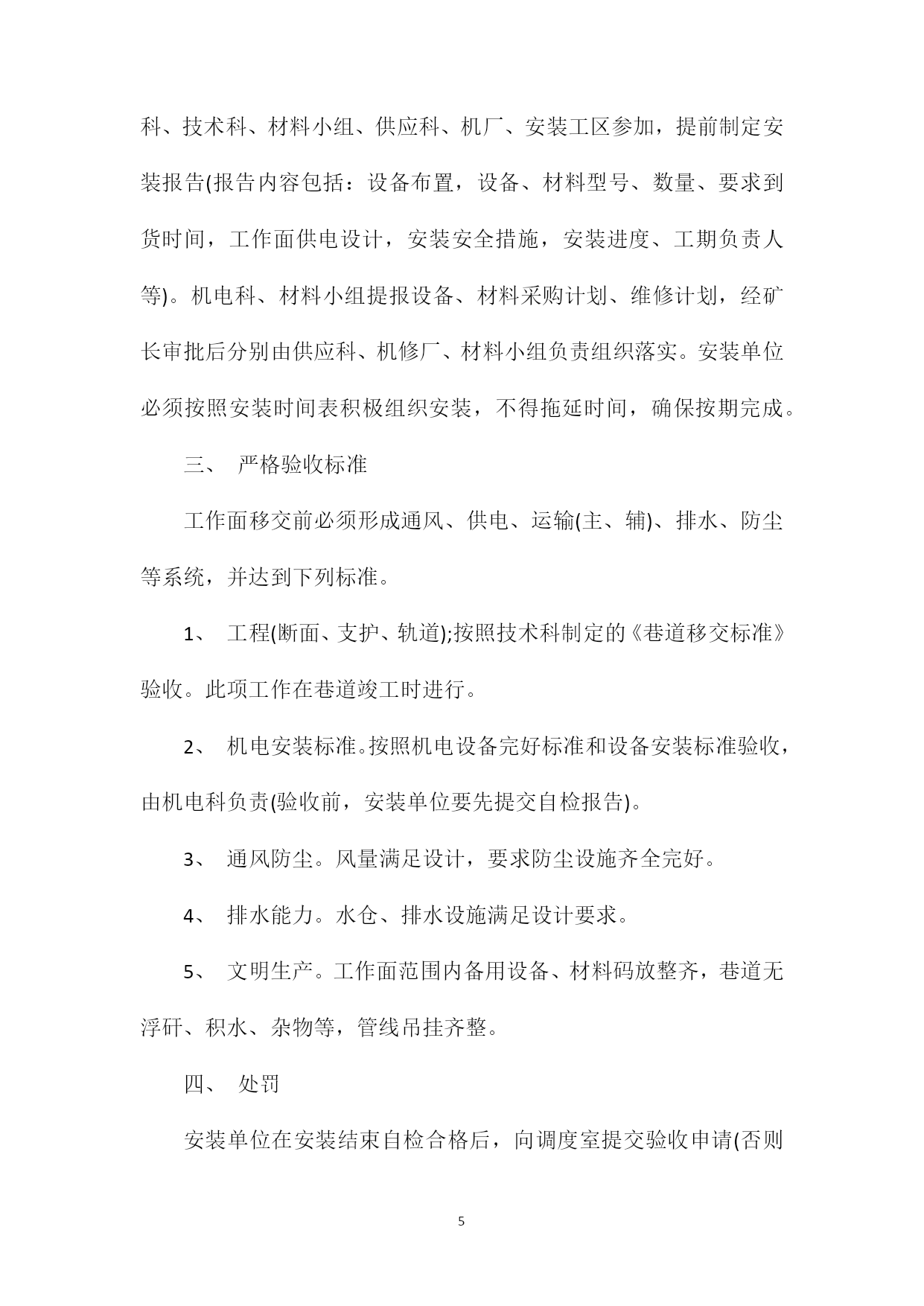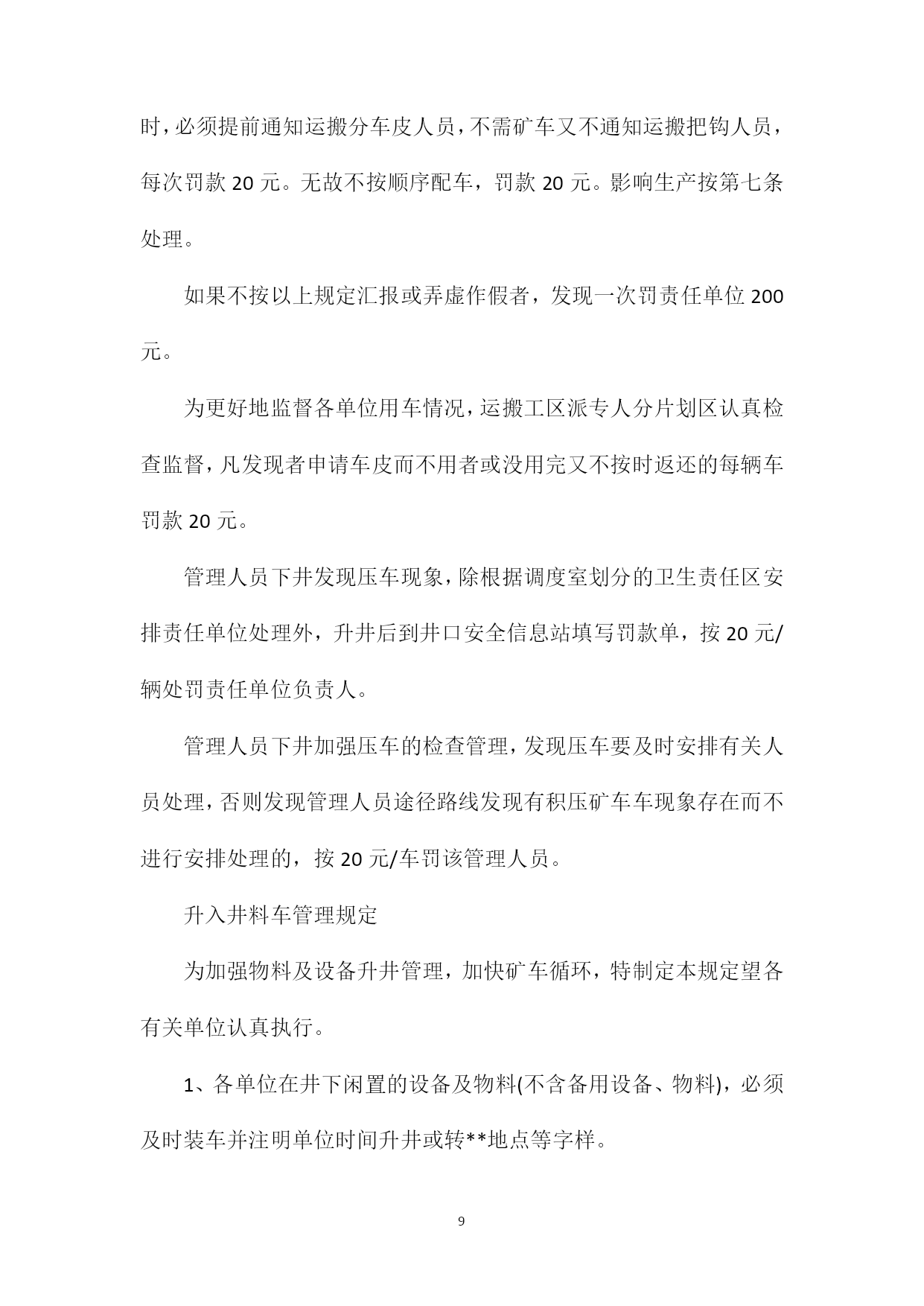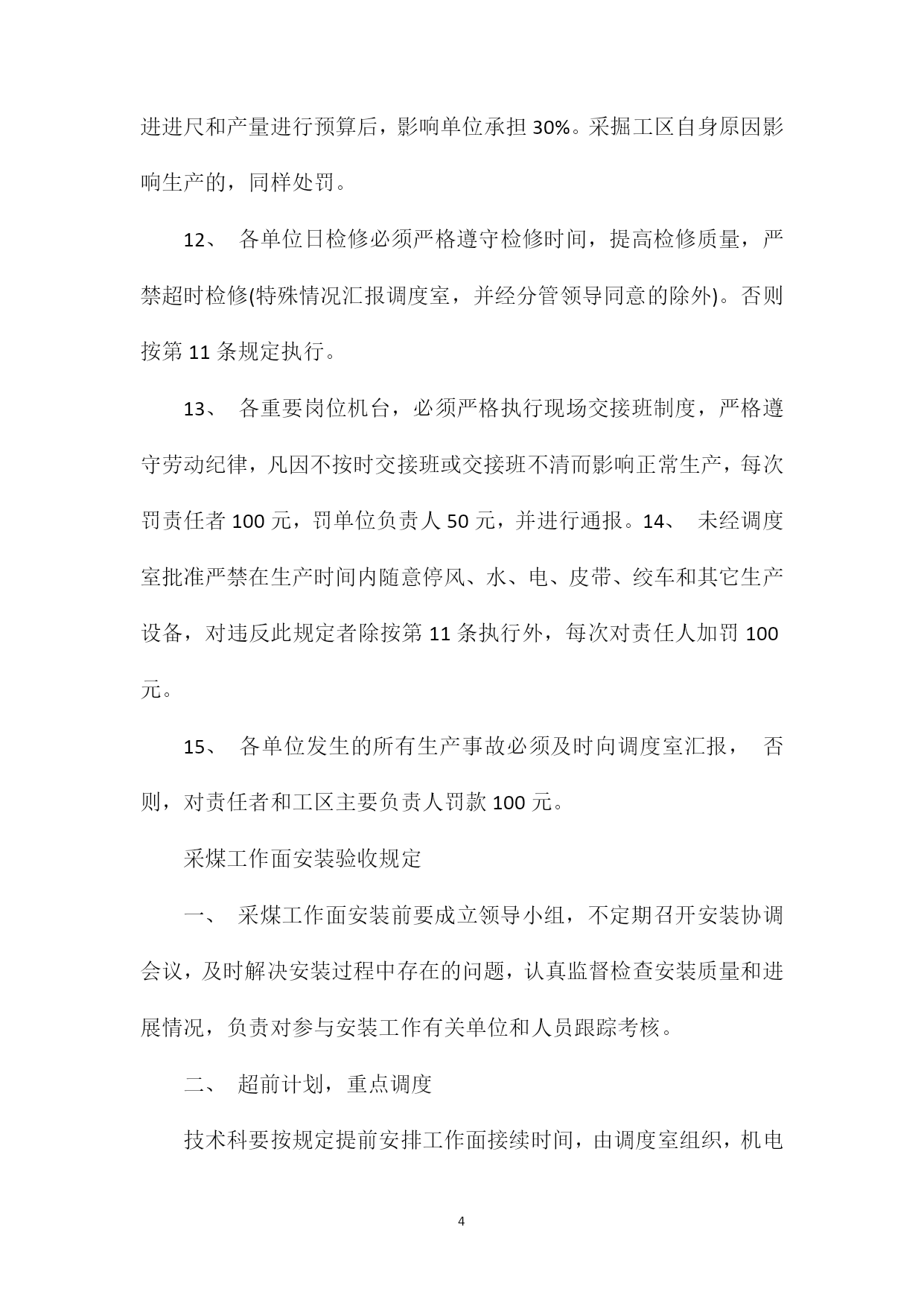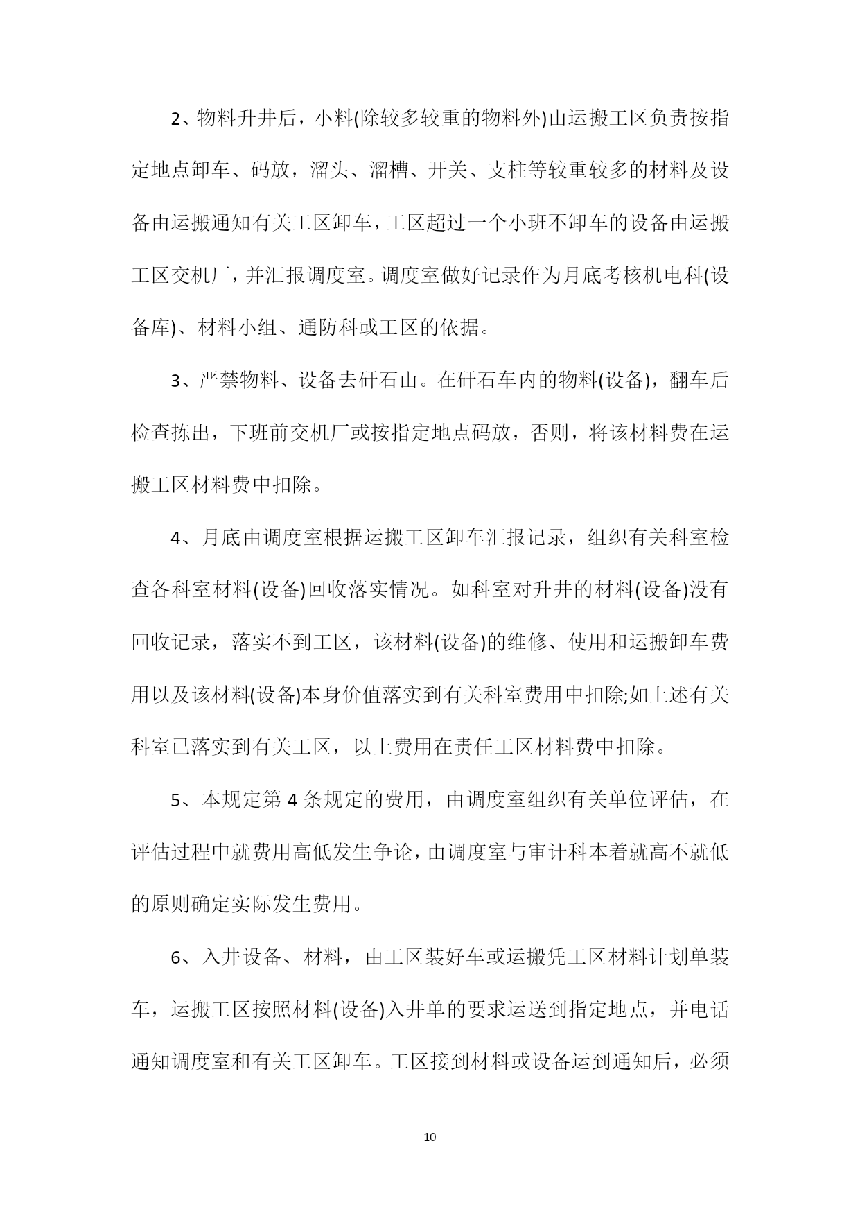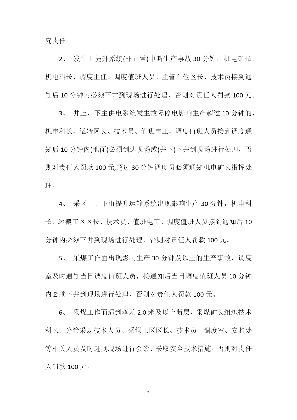 PAGEPAGE27剥皮芝煤矿各类规定汇编剥皮芝煤矿各类规定汇编二0一三年三月目录1、生产事故考核规定2、采煤工作面安装验收规定3、矿井供车管理规定4、升入井料车管理规定5、贯通安全管理规定6、回采与掘进煤含矸石管理规定7、采掘区队出勤管理规定8、安全生产工作安排落实情况考核规定9、调度室事故处理预案10、生产区队交接班管理规定11、关于生产辅助单位职责范围划分的有关规定12、采掘区队管理干部下井带班的有关规定生产事故考核规定1、发生生产事故后,调度室及时通知有关人员并履行调度职责,不服从生产调度指挥的对责任者罚款100元,造成严重后果的从严追究责任。2、发生主提升系统(非正常)中断生产事故30分钟,机电矿长、机电科长、调度主任、调度值班人员、主管单位区长、技术员接到通知后10分钟内必须下井到现场进行处理,否则对责任人罚款100元。3、井上、下主供电系统发生故障停电影响生产超过10分钟的,机电科长、运转区长、技术员、值班电工、调度值班人员接到调度通知后10分钟内(地面)必须到达现场或(井下)下井到现场进行处理,否则对责任人罚款100元;超过30分钟调度员必须通知机电矿长指挥处理。4、采区上、下山提升运输系统出现影响生产30分钟,机电科长、运搬工区区长、技术员、值班电工、调度值班人员接到通知后10分钟内必须下井到现场进行处理,否则对责任人罚款100元。5、采煤工作面出现影响生产30分钟及以上的生产事故,调度室及时通知当日调度值班人员,接通知后当日调度值班人员10分钟内必须下井到现场进行处理,否则对责任人罚款100元。6、采煤工作面遇到落差2.0米及以上断层,采煤矿长组织技术科长、分管采煤技术人员、采煤工区区长、技术员、调度室、安监处等相关人员及时赶到现场进行会诊、采取安全技术措施,否则对责任人罚款100元。7、掘进工作面遇到落差3米及以上断层,掘进矿长组织技术科长、分管掘进技术人员、掘进工区区长、技术员、调度室、安监处等相关人员及时赶到现场进行会诊、采取安全技术措施,否则对责任人罚款100元。8、采掘工作面施工过程中发现顶、底板有出水预兆、冒顶、局部瓦斯超限、放炮等安全事故时,总工程师组织分管副总、施工单位区长、技术员、技术科长、分管技术员、调度室、安监处值班人员接到通知后必须及时到达现场进行处理,否则对责任人罚款100元。9、对发生的各类生产事故,均由当日调度值班人员组织分析,坚持一事故一分析一处理的原则,及时分析并写出书面分析报告,于当日晚20点调度会、次日早会通报。否则,对当日调度值班人员每人罚款50元。10、井下主要生产系统(主、副井、矸石山、提升系统、供水系统、主扇、压风系统)发生的影响生产30分钟以上生产事故,采掘工作面2小时以上的机电事故,机电矿长、机电科长参加分析,其他人员按通知要求参加,接通知后不按时参加分析,对责任人罚款100元。11、对生产期间辅助单位造成的超过10分钟的生产事故,每影响10分钟罚责任工区区长50元,副区长40元,依次累加。超过1小时以上的生产影响,并进行生产影响时间市场化考核,对影响的掘进进尺和产量进行预算后,影响单位承担30%。采掘工区自身原因影响生产的,同样处罚。12、各单位日检修必须严格遵守检修时间,提高检修质量,严禁超时检修(特殊情况汇报调度室,并经分管领导同意的除外)。否则按第11条规定执行。13、各重要岗位机台,必须严格执行现场交接班制度,严格遵守劳动纪律,凡因不按时交接班或交接班不清而影响正常生产,每次罚责任者100元,罚单位负责人50元,并进行通报。14、未经调度室批准严禁在生产时间内随意停风、水、电、皮带、绞车和其它生产设备,对违反此规定者除按第11条执行外,每次对责任人加罚100元。15、各单位发生的所有生产事故必须及时向调度室汇报,否则,对责任者和工区主要负责人罚款100元。采煤工作面安装验收规定一、采煤工作面安装前要成立领导小组,不定期召开安装协调会议,及时解决安装过程中存在的问题,认真监督检查安装质量和进展情况,负责对参与安装工作有关单位和人员跟踪考核。二、超前计划,重点调度技术科要按规定提前安排工作面接续时间,由调度室组织,机电科、技术科、材料小组、供应科、机厂、安装工区参加,提前制定安装报告(报告内容包括:设备布置,设备、材料型号、数量、要求到货时间,工作面供电设计,安装安全措施,安装进度、工期负责人等)。机电科、材料小组提报设备、材料采购计划、维修计划,经矿长审批后分别由供应科、机修厂、材料小组负责组织落实。安装单位必须按照安装时间表积极组织安装,不得拖延时间,确保按期完成。三、严格验收标准工作面移交前必须形成通风、供电、运输(主、辅)、排水、防尘等系统,并达