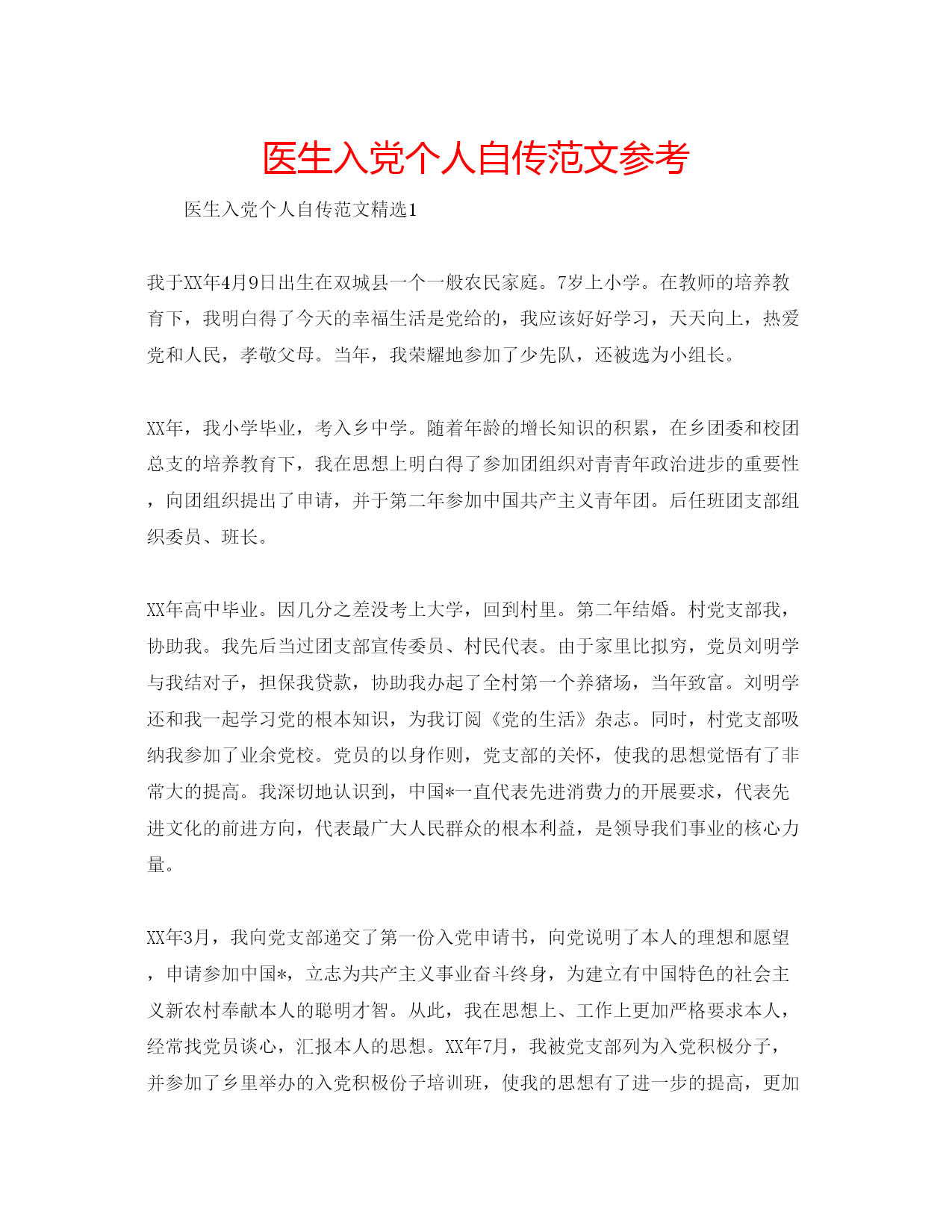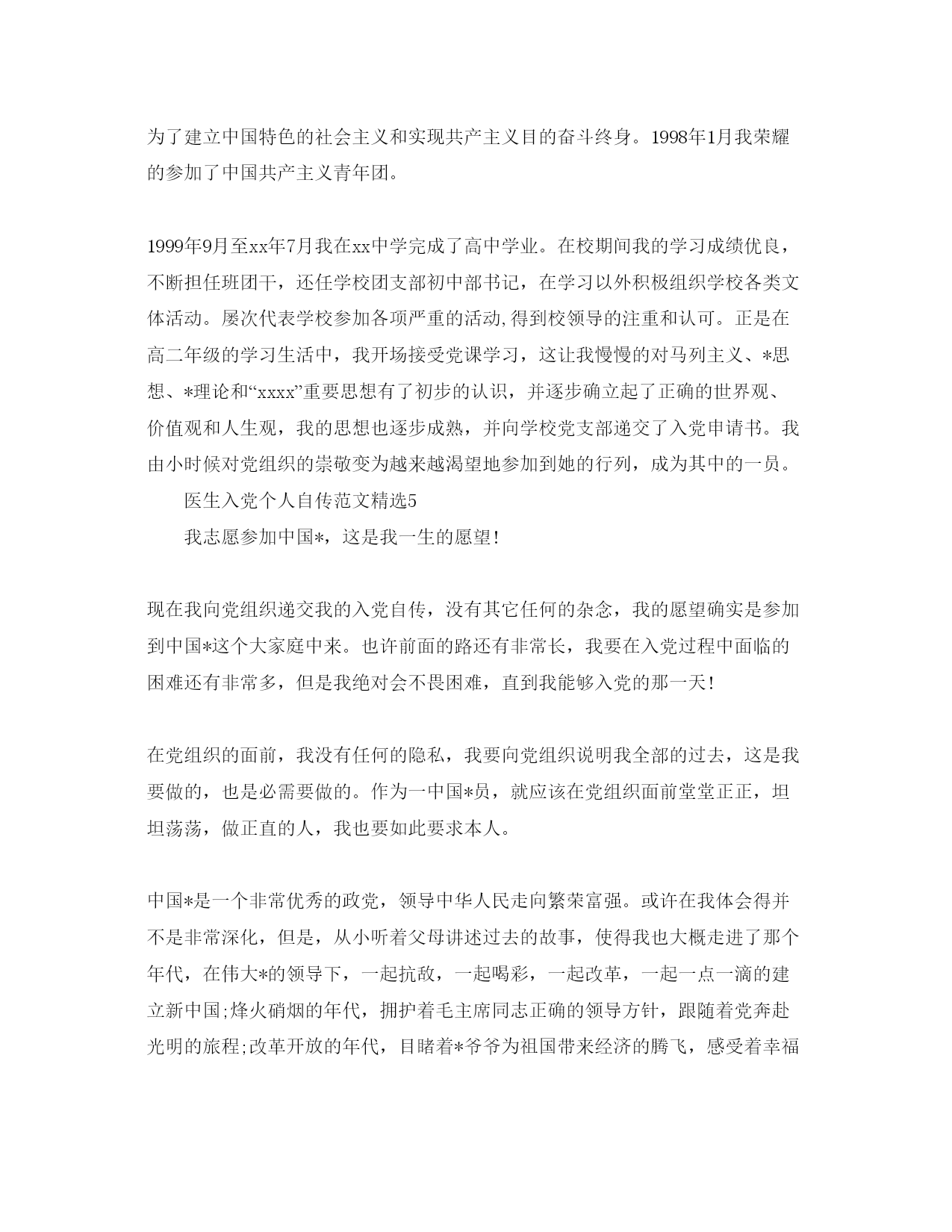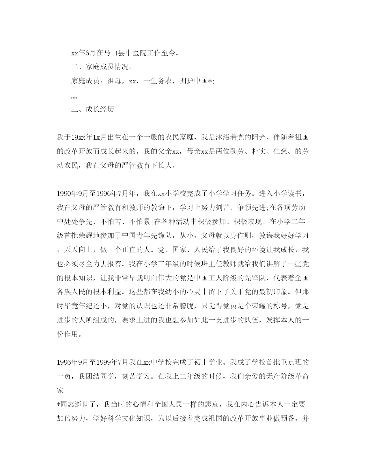 医生入党个人自传范文参考医生入党个人自传范文精选1我于XX年4月9日出生在双城县一个一般农民家庭。7岁上小学。在教师的培养教育下,我明白得了今天的幸福生活是党给的,我应该好好学习,天天向上,热爱党和人民,孝敬父母。当年,我荣耀地参加了少先队,还被选为小组长。XX年,我小学毕业,考入乡中学。随着年龄的增长知识的积累,在乡团委和校团总支的培养教育下,我在思想上明白得了参加团组织对青青年政治进步的重要性,向团组织提出了申请,并于第二年参加中国共产主义青年团。后任班团支部组织委员、班长。XX年高中毕业。因几分之差没考上大学,回到村里。第二年结婚。村党支部我,协助我。我先后当过团支部宣传委员、村民代表。由于家里比拟穷,党员刘明学与我结对子,担保我贷款,协助我办起了全村第一个养猪场,当年致富。刘明学还和我一起学习党的根本知识,为我订阅《党的生活》杂志。同时,村党支部吸纳我参加了业余党校。党员的以身作则,党支部的关怀,使我的思想觉悟有了非常大的提高。我深切地认识到,中国*一直代表先进消费力的开展要求,代表先进文化的前进方向,代表最广大人民群众的根本利益,是领导我们事业的核心力量。XX年3月,我向党支部递交了第一份入党申请书,向党说明了本人的理想和愿望,申请参加中国*,立志为共产主义事业奋斗终身,为建立有中国特色的社会主义新农村奉献本人的聪明才智。从此,我在思想上、工作上更加严格要求本人,经常找党员谈心,汇报本人的思想。XX年7月,我被党支部列为入党积极分子,并参加了乡里举办的入党积极份子培训班,使我的思想有了进一步的提高,更加明确了本人的努力方向,加强了为共产主义而奋斗的信念,决心把本人的一生交给党。XX年1月,党支部批准了我参加“党员联络户”的恳求。我的联络户是刘明涛。他非常困难。我以党员为典范,给他找到了饲料加工的致富路径。当时,我的养猪场已开展到近千头,每天都需要大量的饲料。如此,以我的养猪场为依托,我富,他也会富起来。他没资金,我为他垫付;他不明白技术,我找书本或请教外材明白人,学会了再教他。但是,这时有人说我是为了本人打算。我一时委屈。党员刘明学明白后,和我谈心,使我明白了党员不仅要能够为人民效劳,还要具备任劳任怨为党工作的精神。因而,我放下了思想包袱。我决心,等刘明涛脱了贫,再联络两户贫困户,把党的暖和送给他们,走共同富有之路。回忆本人走过的道路,从开场对党有朴素的感情到今天对党有了深化的认识,能够以党员的标准要求本人,都是党组织培养教育的结果。我决不辜负党对我的培育,接着努力学习和工作,接受党组织的考验,争取早日入党。医生入党个人自传范文精选2我是一名医生,在一所医院担任医政科科长,通过这么多年的浮浮沉沉,我认识到我必需要参加中国*,只有成为中国*的一员,我才感受内心好受些。尽管之前有非常多时机能够入党,但是不知如何的,确实是一次次的错过去了,现在我不能再等了,我决定参加中国*,这是我的肺腑之言。首先我要介绍一下我的个人情况,如此才会在对我入党评选中有个比拟好的客观的评价:我出生在一个领导干部的家庭,从小得到了来自社会和家庭的良好教育,在党的关怀教育下健康成长,从小父母的以身作则给我留下了不可磨灭的印记,那确实是:没有*,就没有新中国。从小,父母就以身作则,教诲我好好学习,天天向上,做一个正直的人。党、国家、人民给了我良好的环境让我成长,我也必须尽全力去报答他们。我非常早就明白伟大的党是中国工人阶级的先锋队,代表着全国各族人民的根本利益。这些都在我幼小的心灵中留下了关于党的最初印象。但那时毕竟年纪还小,对党的认识也还非常朦胧,只觉得党员是个荣耀的称号,党是进步的人所组成的,要求上进的我也想参加如此一支进步的队伍,发挥本人的一份作用。平常我团结同学,刻苦学习,在教师家长们的鼓舞和协助下,我参加了共青团。随着年纪的增长,知识的丰富,我的思想的逐步成熟。我由小时候对党组织的崇敬变为越来越渴望地参加到她的行列,成为她中间的一员。在参加工作后,我又有了新的工作和奋斗目的。对党的认识逐步加深理解。因而我对党组织更加向往,并向党组织郑重地递交了入党申请书。党组织考验我,协助教育我,另外我还在业余时间学习党的根本知识和党的道路方针政策,对党有了较系统全面的认识。多年来,我不管干什么工作,不管在哪个岗位,我都是坚持干一行爱一行,坚持全心全意为人民效劳,工作踏踏实实,任劳任怨,团结同志,保护集体,爱岗敬业,克己奉公。遭到领导和同志们的好评。通过多年的学习和实践,我明白得了*思想、*理论和“三个代表”重要思想是当代中国的马克思主义,是马克思主义在中国开展的新阶段,是我们党的指导思想。通过了长期的锻炼和考虑,对党的认识不断加深。随着本人思想的逐步成熟,我深深地感遭到,我找到了本人的信仰,我一定要成为一名*员为共产主义