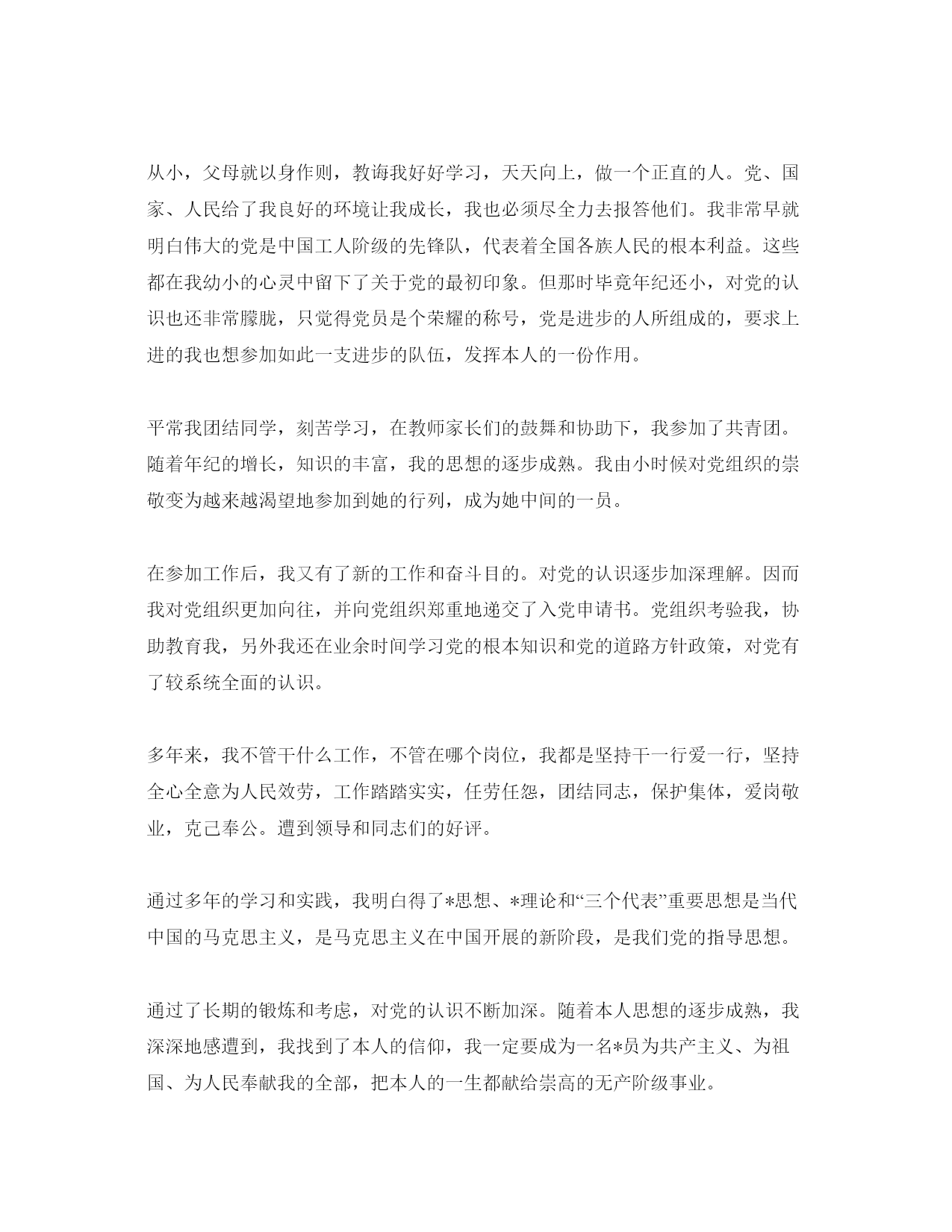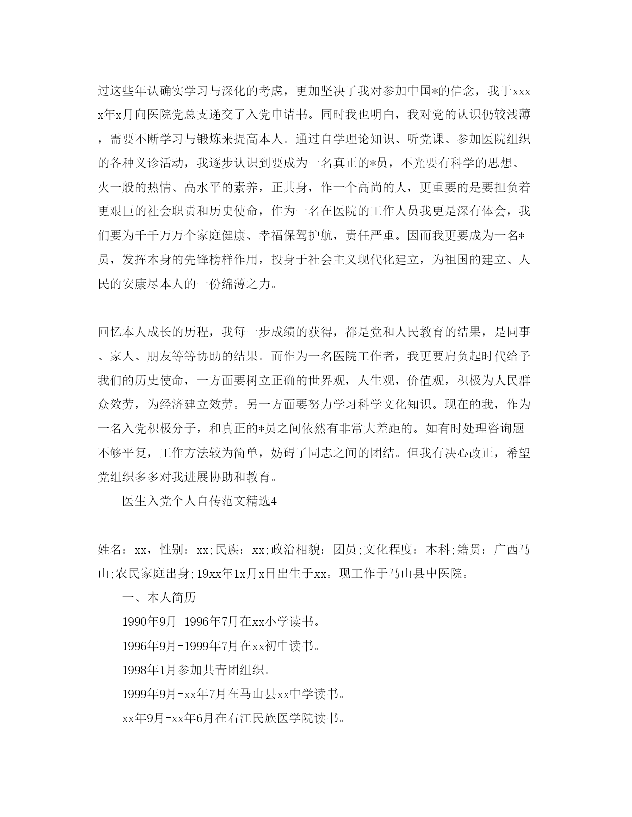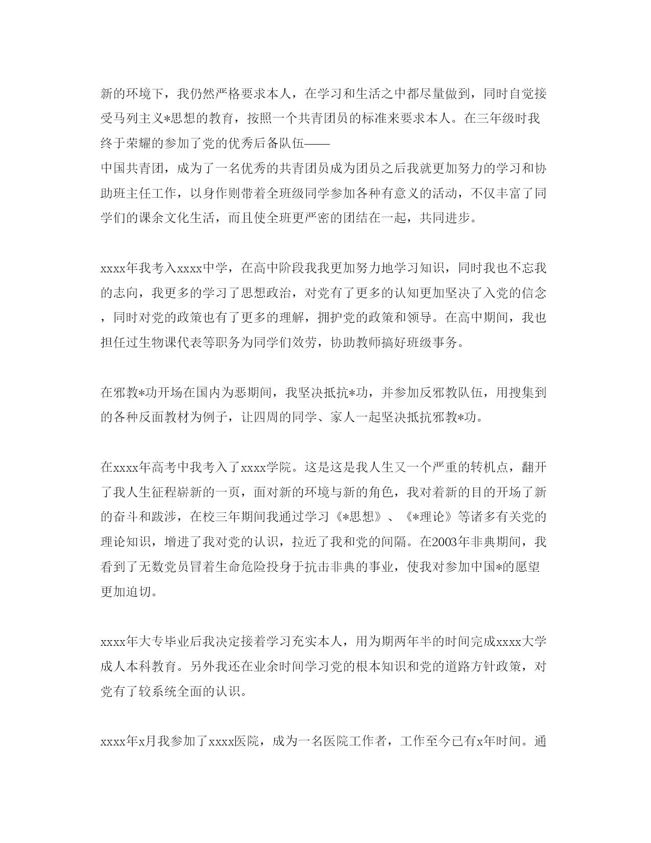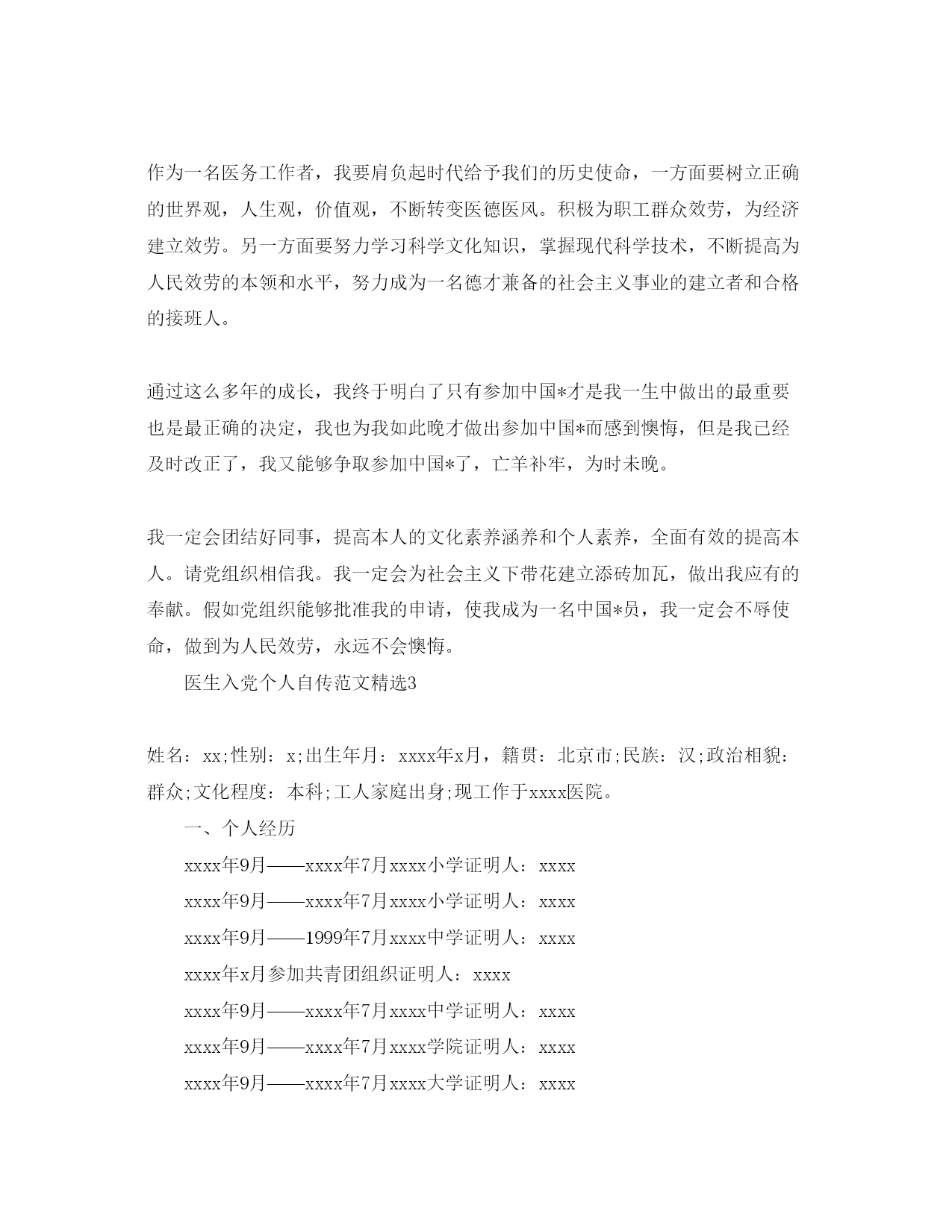 医生入党个人自传范文参考医生入党个人自传范文精选1我于XX年4月9日出生在双城县一个一般农民家庭。7岁上小学。在教师的培养教育下,我明白得了今天的幸福生活是党给的,我应该好好学习,天天向上,热爱党和人民,孝敬父母。当年,我荣耀地参加了少先队,还被选为小组长。XX年,我小学毕业,考入乡中学。随着年龄的增长知识的积累,在乡团委和校团总支的培养教育下,我在思想上明白得了参加团组织对青青年政治进步的重要性,向团组织提出了申请,并于第二年参加中国共产主义青年团。后任班团支部组织委员、班长。XX年高中毕业。因几分之差没考上大学,回到村里。第二年结婚。村党支部我,协助我。我先后当过团支部宣传委员、村民代表。由于家里比拟穷,党员刘明学与我结对子,担保我贷款,协助我办起了全村第一个养猪场,当年致富。刘明学还和我一起学习党的根本知识,为我订阅《党的生活》杂志。同时,村党支部吸纳我参加了业余党校。党员的以身作则,党支部的关怀,使我的思想觉悟有了非常大的提高。我深切地认识到,中国*一直代表先进消费力的开展要求,代表先进文化的前进方向,代表最广大人民群众的根本利益,是领导我们事业的核心力量。XX年3月,我向党支部递交了第一份入党申请书,向党说明了本人的理想和愿望,申请参加中国*,立志为共产主义事业奋斗终身,为建立有中国特色的社会主义新农村奉献本人的聪明才智。从此,我在思想上、工作上更加严格要求本人,经常找党员谈心,汇报本人的思想。XX年7月,我被党支部列为入党积极分子,并参加了乡里举办的入党积极份子培训班,使我的思想有了进一步的提高,更加明确了本人的努力方向,加强了为共产主义而奋斗的信念,决心把本人的一生交给党。XX年1月,党支部批准了我参加“党员联络户”的恳求。我的联络户是刘明涛。他非常困难。我以党员为典范,给他找到了饲料加工的致富路径。当时,我的养猪场已开展到近千头,每天都需要大量的饲料。如此,以我的养猪场为依托,我富,他也会富起来。他没资金,我为他垫付;他不明白技术,我找书本或请教外材明白人,学会了再教他。但是,这时有人说我是为了本人打算。我一时委屈。党员刘明学明白后,和我谈心,使我明白了党员不仅要能够为人民效劳,还要具备任劳任怨为党工作的精神。因而,我放下了思想包袱。我决心,等刘明涛脱了贫,再联络两户贫困户,把党的暖和送给他们,走共同富有之路。回忆本人走过的道路,从开场对党有朴素的感情到今天对党有了深化的认识,能够以党员的标准要求本人,都是党组织培养教育的结果。我决不辜负党对我的培育,接着努力学习和工作,接受党组织的考验,争取早日入党。医生入党个人自传范文精选2我是一名医生,在一所医院担任医政科科长,通过这么多年的浮浮沉沉,我认识到我必需要参加中国*,只有成为中国*的一员,我才感受内心好受些。尽管之前有非常多时机能够入党,但是不知如何的,确实是一次次的错过去了,现在我不能再等了,我决定参加中国*,这是我的肺腑之言。首先我要介绍一下我的个人情况,如此才会在对我入党评选中有个比拟好的客观的评价:我出生在一个领导干部的家庭,从小得到了来自社会和家庭的良好教育,在党的关怀教育下健康成长,从小父母的以身作则给我留下了不可磨灭的印记,那确实是:没有*,就没有新中国。从小,父母就以身作则,教诲我好好学习,天天向上,做一个正直的人。党、国家、人民给了我良好的环境让我成长,我也必须尽全力去报答他们。我非常早就明白伟大的党是中国工人阶级的先锋队,代表着全国各族人民的根本利益。这些都在我幼小的心灵中留下了关于党的最初印象。但那时毕竟年纪还小,对党的认识也还非常朦胧,只觉得党员是个荣耀的称号,党是进步的人所组成的,要求上进的我也想参加如此一支进步的队伍,发挥本人的一份作用。平常我团结同学,刻苦学习,在教师家长们的鼓舞和协助下,我参加了共青团。随着年纪的增长,知识的丰富,我的思想的逐步成熟。我由小时候对党组织的崇敬变为越来越渴望地参加到她的行列,成为她中间的一员。在参加工作后,我又有了新的工作和奋斗目的。对党的认识逐步加深理解。因而我对党组织更加向往,并向党组织郑重地递交了入党申请书。党组织考验我,协助教育我,另外我还在业余时间学习党的根本知识和党的道路方针政策,对党有了较系统全面的认识。多年来,我不管干什么工作,不管在哪个岗位,我都是坚持干一行爱一行,坚持全心全意为人民效劳,工作踏踏实实,任劳任怨,团结同志,保护集体,爱岗敬业,克己奉公。遭到领导和同志们的好评。通过多年的学习和实践,我明白得了*思想、*理论和“三个代表”重要思想是当代中国的马克思主义,是马克思主义在中国开展的新阶段,是我们党的指导思想。通过了长期的锻炼和考虑,对党的认识不断加深。随着本人思想的逐步成熟,我深深地感遭到,我找到了本人的信仰,我一定要成为一名*员为共产主义