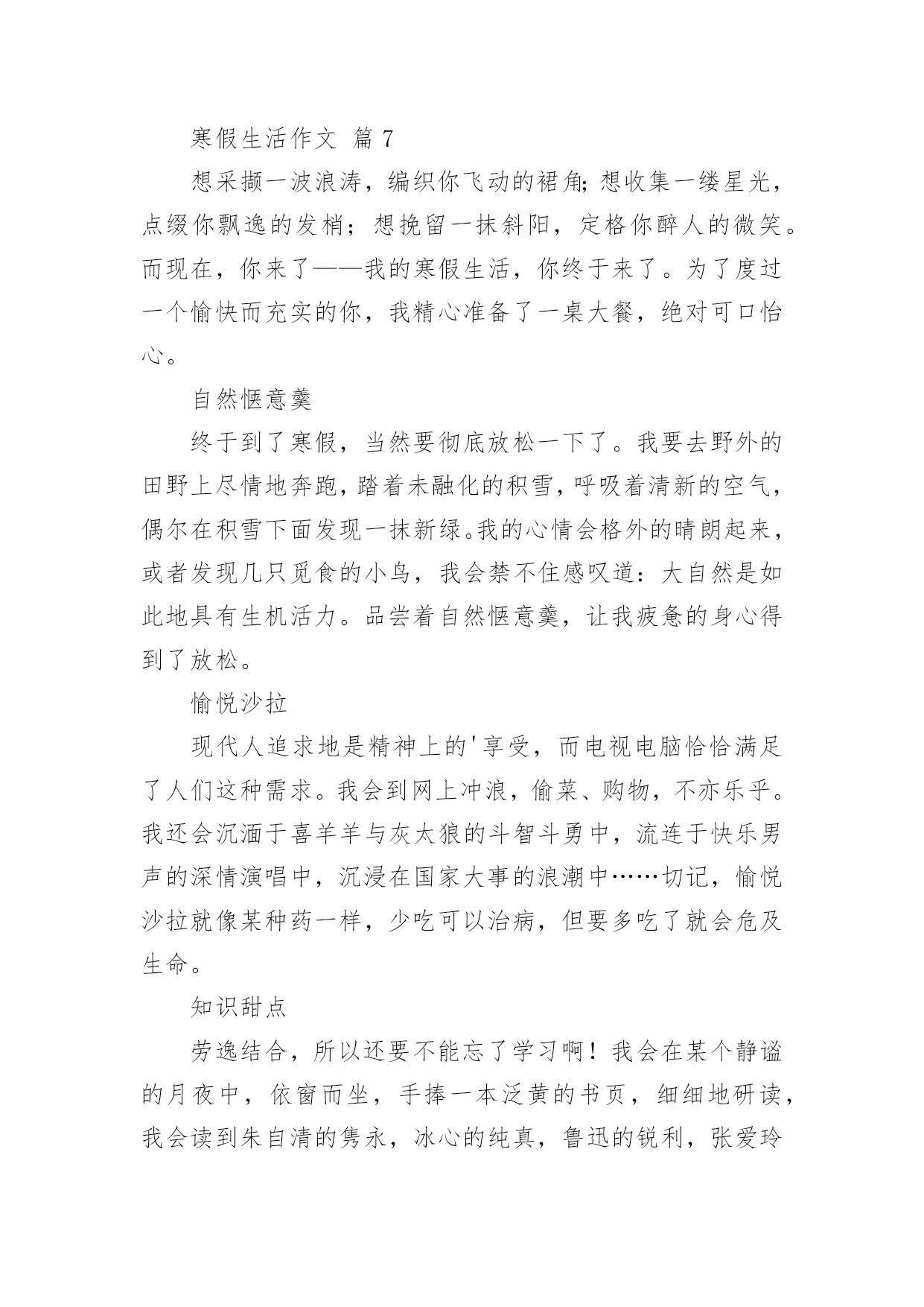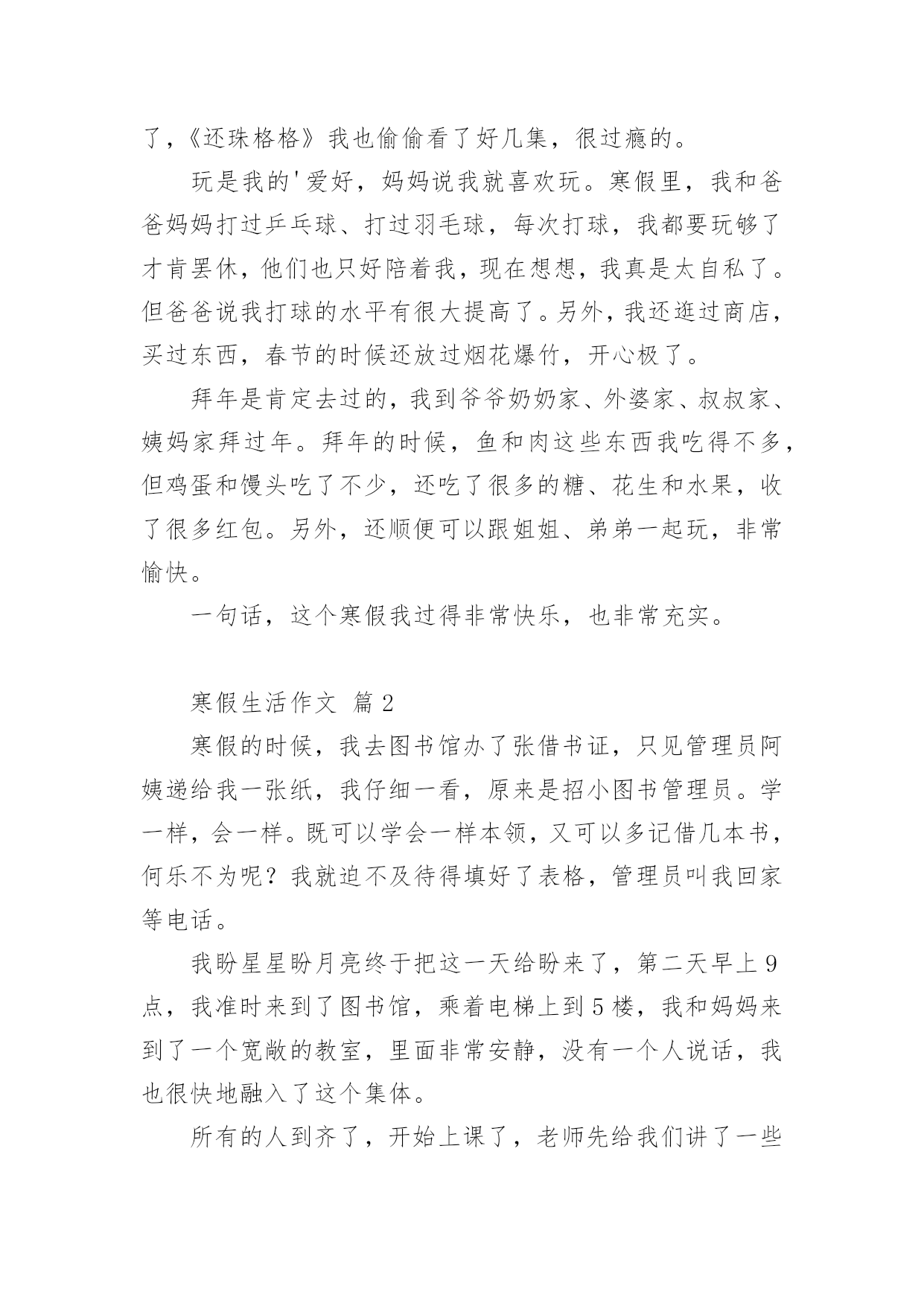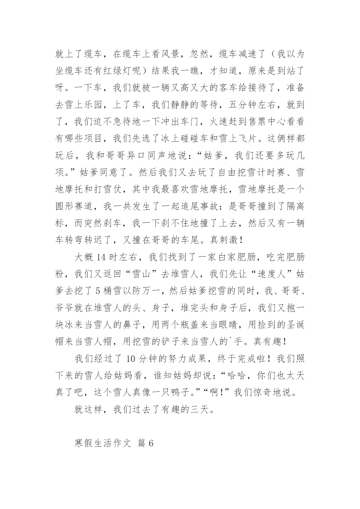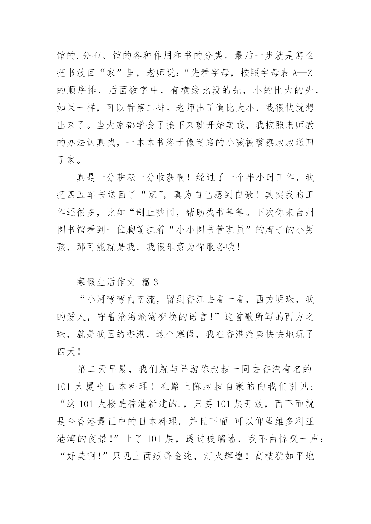 寒假生活作文寒假生活作文经典(14篇)在日常学习、工作或生活中,大家或多或少都会接触过作文吧,作文根据写作时限的不同可以分为限时作文和非限时作文。你所见过的作文是什么样的呢?以下是小编帮大家整理的寒假生活作文,仅供参考,大家一起来看看吧。寒假生活作文篇1期末考试结束,寒假开始了,我带着老师布置的寒假作业回到了家。我想,寒假寒假作业是要做的,玩也是要玩的,最好是玩够了再做寒假作业。但爸爸妈妈说,做寒假作业和玩要交叉进行,就是每天做一部分寒假作业再玩一下。我只好照办。所以,我的寒假生活是这样度过的:做寒假作业、看电视、玩和拜年。做寒假作业,我不够自觉,总要爸爸妈妈催来了,我才去做。做不来的寒假作业只好问爸爸妈妈,他们做不来的,只好空着,准备带回学校问老师。除了少数做不来的寒假作业没完成以外,大部分寒假作业都已完成。看电视我是非常喜欢的,如果爸爸妈妈不叫我做寒假作业,或不把电视机关掉,我真的可以从早上起床看到晚上睡觉。但爸爸说:电视看长了,对眼睛有影响。所以,我实际上只看了一部分动画片和少儿节目,以及春节联欢晚会。对了,《还珠格格》我也偷偷看了好几集,很过瘾的。玩是我的'爱好,妈妈说我就喜欢玩。寒假里,我和爸爸妈妈打过乒乓球、打过羽毛球,每次打球,我都要玩够了才肯罢休,他们也只好陪着我,现在想想,我真是太自私了。但爸爸说我打球的水平有很大提高了。另外,我还逛过商店,买过东西,春节的时候还放过烟花爆竹,开心极了。拜年是肯定去过的,我到爷爷奶奶家、外婆家、叔叔家、姨妈家拜过年。拜年的时候,鱼和肉这些东西我吃得不多,但鸡蛋和馒头吃了不少,还吃了很多的糖、花生和水果,收了很多红包。另外,还顺便可以跟姐姐、弟弟一起玩,非常愉快。一句话,这个寒假我过得非常快乐,也非常充实。寒假生活作文篇2寒假的时候,我去图书馆办了张借书证,只见管理员阿姨递给我一张纸,我仔细一看,原来是招小图书管理员。学一样,会一样。既可以学会一样本领,又可以多记借几本书,何乐不为呢?我就迫不及待得填好了表格,管理员叫我回家等电话。我盼星星盼月亮终于把这一天给盼来了,第二天早上9点,我准时来到了图书馆,乘着电梯上到5楼,我和妈妈来到了一个宽敞的教室,里面非常安静,没有一个人说话,我也很快地融入了这个集体。所有的人到齐了,开始上课了,老师先给我们讲了一些馆的.分布、馆的各种作用和书的分类。最后一步就是怎么把书放回“家”里,老师说:“先看字母,按照字母表A—Z的顺序排,后面数字中,有横线比没的先,小的比大的先,如果一样,可以看第二排。老师出了道比大小,我很快就想出来了。当大家都学会了接下来就开始实践,我按照老师教的办法认真找,一本本书终于像迷路的小孩被警察叔叔送回了家。真是一分耕耘一分收获啊!经过了一个半小时工作,我把四五车书送回了“家”,真为自己感到自豪!其实我的工作还很多,比如“制止吵闹,帮助找书等等。下次你来台州图书馆看到一位胸前挂着“小小图书管理员”的牌子的小男孩,那可能就是我,我很乐意为你服务哦!寒假生活作文篇3“小河弯弯向南流,留到香江去看一看,西方明珠,我的爱人,守着沧海沧海变换的诺言!”这首歌所写的西方之珠,就是我国的香港,这个寒假,我在香港痛爽快快地玩了四天!第二天早晨,我们就与导游陈叔叔一同去香港有名的101大厦吃日本料理!在路上陈叔叔自豪的向我们引见:“这101大楼是香港新建的.,只要101层开放,而下面就是全香港最正中的日本料理。并且下面可以仰望维多利亚港湾的夜景!”上了101层,透过玻璃墙,我不由惊叹一声:“好美啊!”只见上面纸醉金迷,灯火辉煌!高楼犹如平地一样绵亘不绝;灯火就如有数颗珍珠一样将香港点亮;还早晨停泊着一些游轮,仿佛晶莹剔透的贝壳!陈叔叔骄傲的说道:“假如是星期五维多利亚港湾还会举行焰火晚会,那是别提有多美丽了!”“真的吗?”我似乎看见了那时的美景,我有些兴奋也有些遗憾。合理我们如痴如醉是,效劳员上菜了,看蟹子寿司顺滑鲜嫩,金枪鱼寿司美味可口,鳗鱼寿司酸酸甜甜,芥末令我耐人寻味。其中的重头戏还属龙虾刺身,夹起一片,闻一闻,丝毫没有海鲜的腥味,反而有股苦涩扑鼻而来,龙虾刺身晶莹剔透,划一的铺在通红的虾壳下面,真是美丽。悄悄咬一口,鲜香可口,入口即化,真是色香味俱全啊!最妙的是龙虾头被雕琢成了宫门,它的身躯被雕琢成华美的宫殿,每一个细节,每一次雕琢,都是非常精致!在香港的四天里,我还旅游了杜莎夫人的蜡像馆,外面活灵活现的蜡像令我惊叹;玩耍了陆地公园,憨态可掬的熊猫令我哈哈大笑;收索了迪士尼乐园,巴斯光年乐园令我恋恋不舍。香港你真不愧是我国的西方之珠啊!香港我何时能重回你的怀抱?寒假生活作文篇4星期一,我跟着妈妈一起去外婆家玩儿,一路上欢声笑语,一个多小时过去了,终于到了外婆家。小时候,最开心的就是去外婆家玩儿,因为能吃上好吃的菜,穿上好看的衣