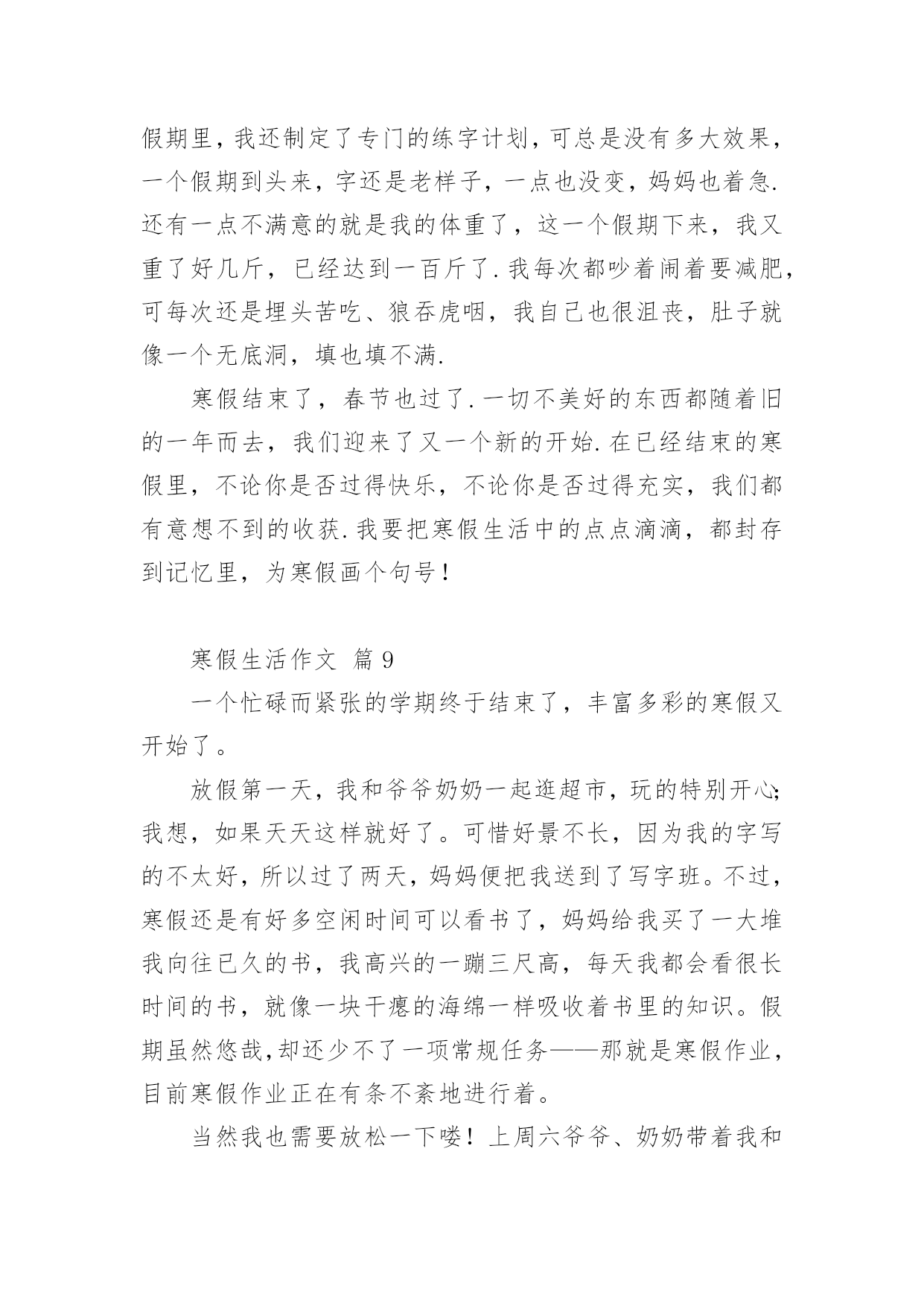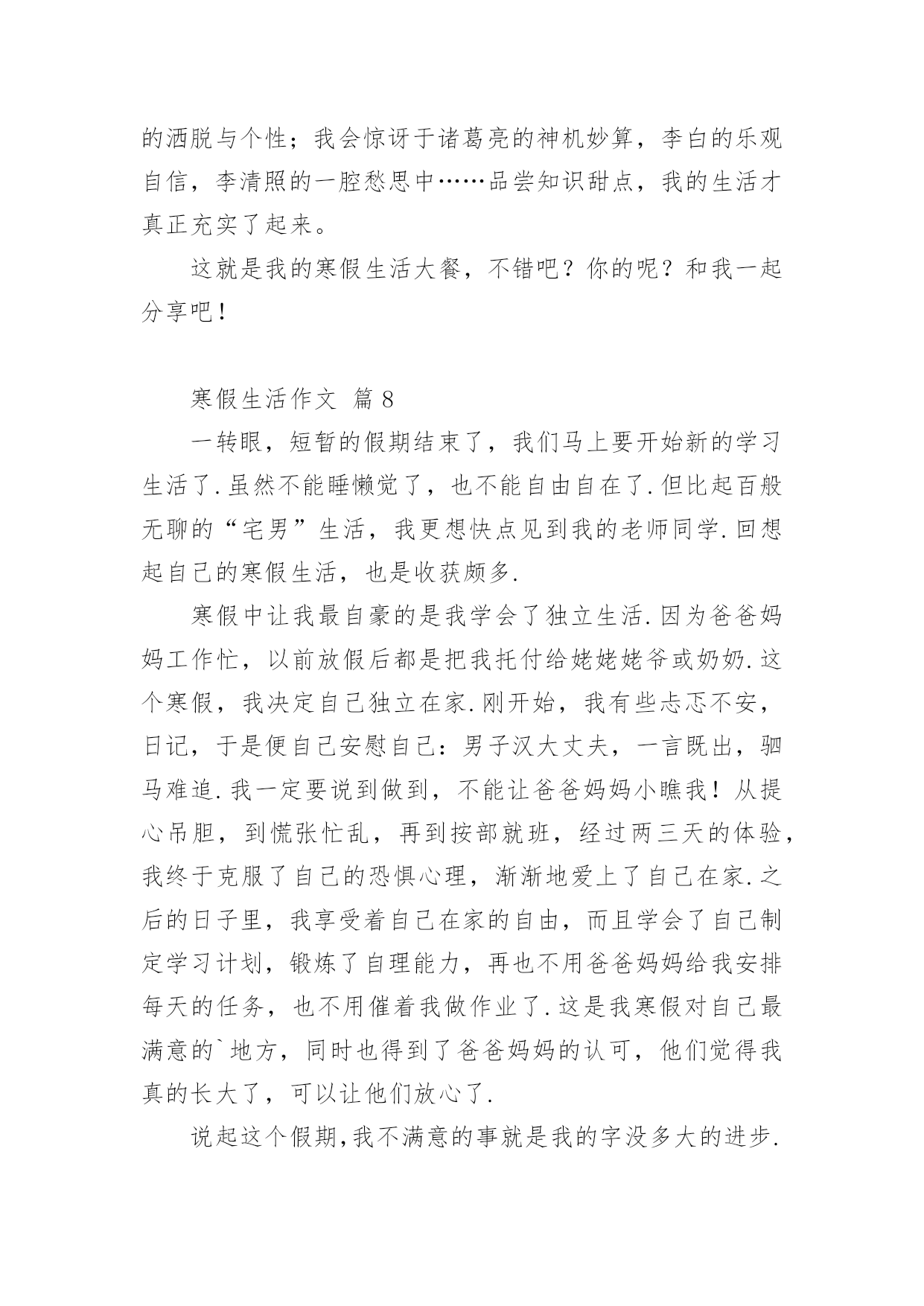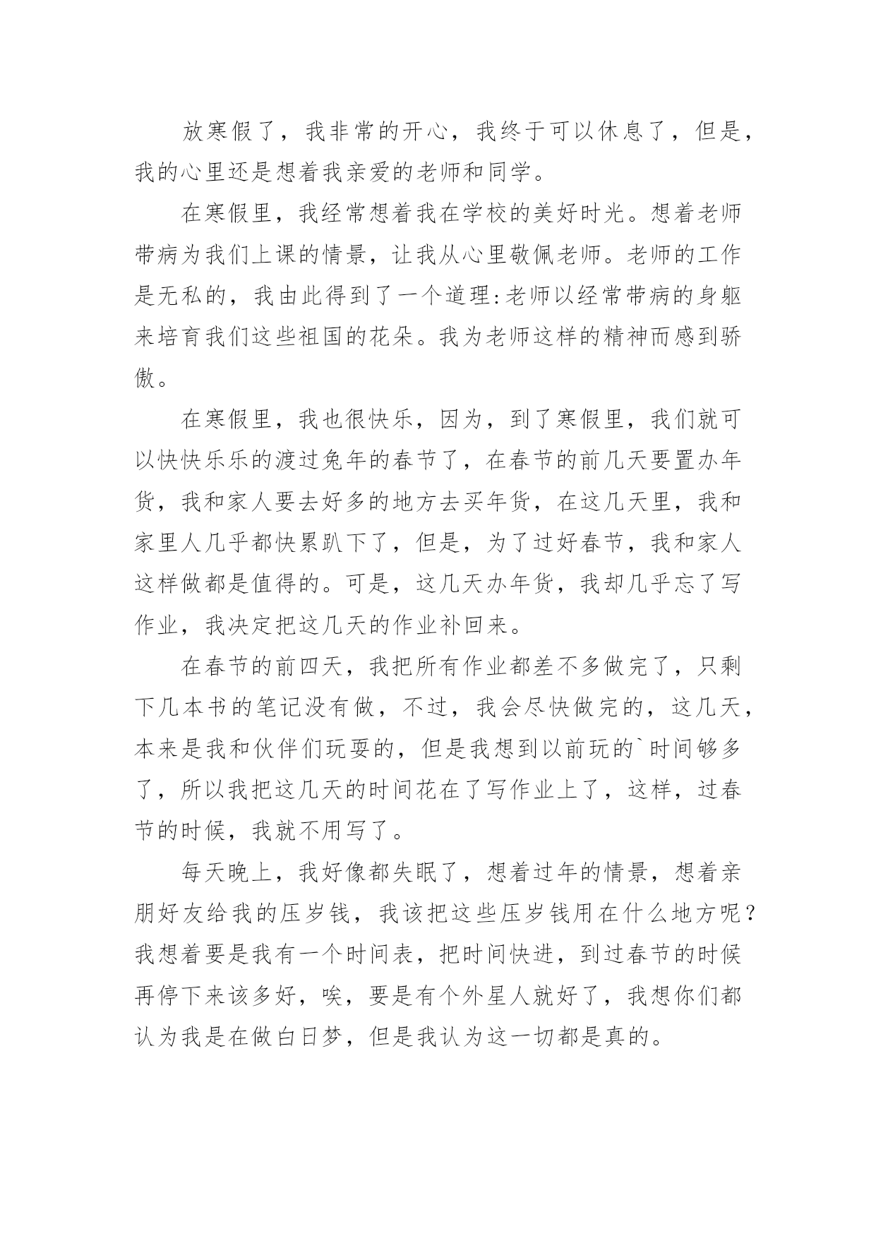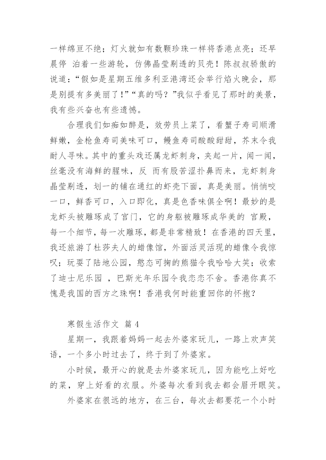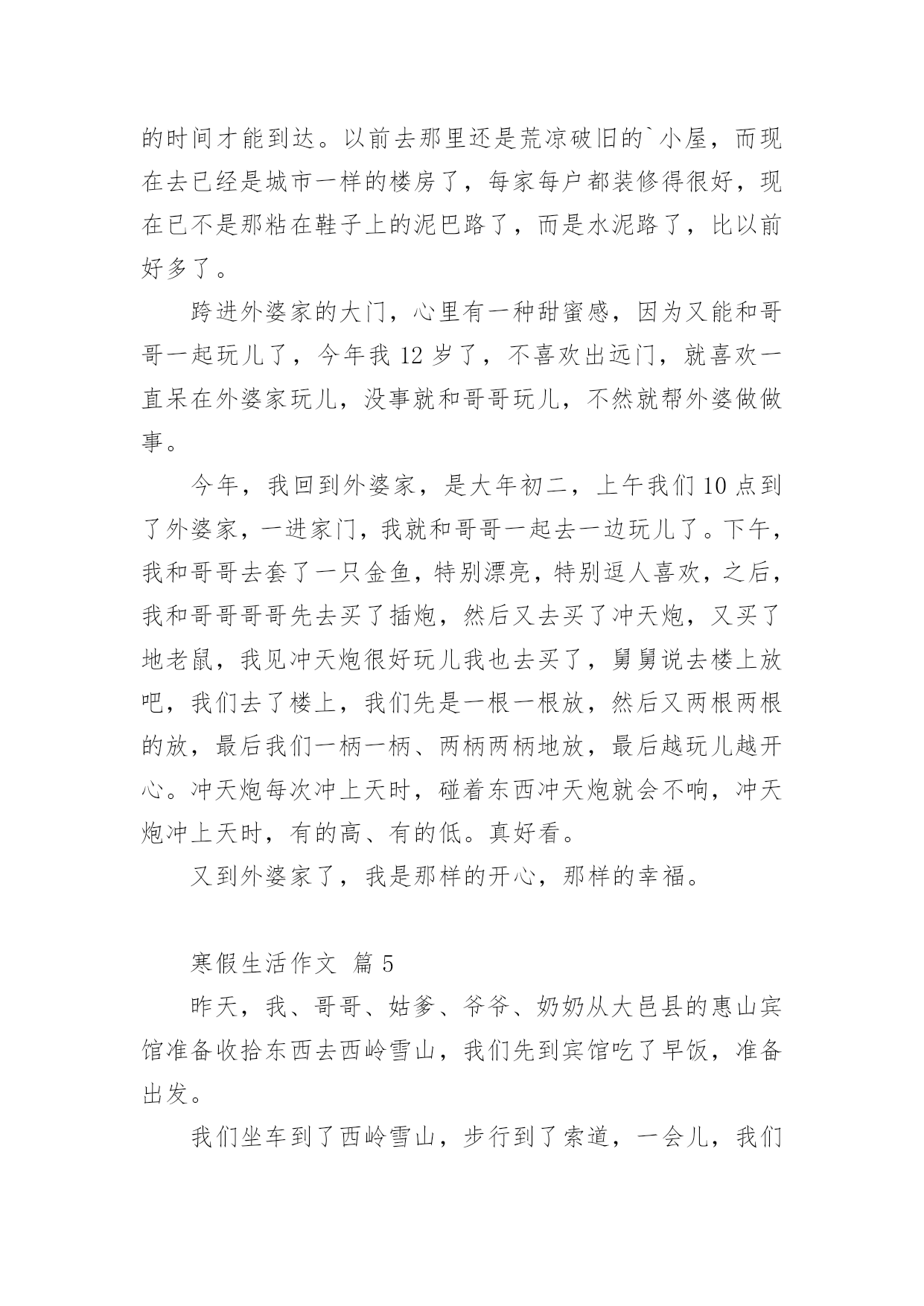 寒假生活作文寒假生活作文经典(14篇)在日常学习、工作或生活中,大家或多或少都会接触过作文吧,作文根据写作时限的不同可以分为限时作文和非限时作文。你所见过的作文是什么样的呢?以下是小编帮大家整理的寒假生活作文,仅供参考,大家一起来看看吧。寒假生活作文篇1期末考试结束,寒假开始了,我带着老师布置的寒假作业回到了家。我想,寒假寒假作业是要做的,玩也是要玩的,最好是玩够了再做寒假作业。但爸爸妈妈说,做寒假作业和玩要交叉进行,就是每天做一部分寒假作业再玩一下。我只好照办。所以,我的寒假生活是这样度过的:做寒假作业、看电视、玩和拜年。做寒假作业,我不够自觉,总要爸爸妈妈催来了,我才去做。做不来的寒假作业只好问爸爸妈妈,他们做不来的,只好空着,准备带回学校问老师。除了少数做不来的寒假作业没完成以外,大部分寒假作业都已完成。看电视我是非常喜欢的,如果爸爸妈妈不叫我做寒假作业,或不把电视机关掉,我真的可以从早上起床看到晚上睡觉。但爸爸说:电视看长了,对眼睛有影响。所以,我实际上只看了一部分动画片和少儿节目,以及春节联欢晚会。对了,《还珠格格》我也偷偷看了好几集,很过瘾的。玩是我的'爱好,妈妈说我就喜欢玩。寒假里,我和爸爸妈妈打过乒乓球、打过羽毛球,每次打球,我都要玩够了才肯罢休,他们也只好陪着我,现在想想,我真是太自私了。但爸爸说我打球的水平有很大提高了。另外,我还逛过商店,买过东西,春节的时候还放过烟花爆竹,开心极了。拜年是肯定去过的,我到爷爷奶奶家、外婆家、叔叔家、姨妈家拜过年。拜年的时候,鱼和肉这些东西我吃得不多,但鸡蛋和馒头吃了不少,还吃了很多的糖、花生和水果,收了很多红包。另外,还顺便可以跟姐姐、弟弟一起玩,非常愉快。一句话,这个寒假我过得非常快乐,也非常充实。寒假生活作文篇2寒假的时候,我去图书馆办了张借书证,只见管理员阿姨递给我一张纸,我仔细一看,原来是招小图书管理员。学一样,会一样。既可以学会一样本领,又可以多记借几本书,何乐不为呢?我就迫不及待得填好了表格,管理员叫我回家等电话。我盼星星盼月亮终于把这一天给盼来了,第二天早上9点,我准时来到了图书馆,乘着电梯上到5楼,我和妈妈来到了一个宽敞的教室,里面非常安静,没有一个人说话,我也很快地融入了这个集体。所有的人到齐了,开始上课了,老师先给我们讲了一些馆的.分布、馆的各种作用和书的分类。最后一步就是怎么把书放回“家”里,老师说:“先看字母,按照字母表A—Z的顺序排,后面数字中,有横线比没的先,小的比大的先,如果一样,可以看第二排。老师出了道比大小,我很快就想出来了。当大家都学会了接下来就开始实践,我按照老师教的办法认真找,一本本书终于像迷路的小孩被警察叔叔送回了家。真是一分耕耘一分收获啊!经过了一个半小时工作,我把四五车书送回了“家”,真为自己感到自豪!其实我的工作还很多,比如“制止吵闹,帮助找书等等。下次你来台州图书馆看到一位胸前挂着“小小图书管理员”的牌子的小男孩,那可能就是我,我很乐意为你服务哦!寒假生活作文篇3“小河弯弯向南流,留到香江去看一看,西方明珠,我的爱人,守着沧海沧海变换的诺言!”这首歌所写的西方之珠,就是我国的香港,这个寒假,我在香港痛爽快快地玩了四天!第二天早晨,我们就与导游陈叔叔一同去香港有名的101大厦吃日本料理!在路上陈叔叔自豪的向我们引见:“这101大楼是香港新建的.,只要101层开放,而下面就是全香港最正中的日本料理。并且下面可以仰望维多利亚港湾的夜景!”上了101层,透过玻璃墙,我不由惊叹一声:“好美啊!”只见上面纸醉金迷,灯火辉煌!高楼犹如平地一样绵亘不绝;灯火就如有数颗珍珠一样将香港点亮;还早晨停泊着一些游轮,仿佛晶莹剔透的贝壳!陈叔叔骄傲的说道:“假如是星期五维多利亚港湾还会举行焰火晚会,那是别提有多美丽了!”“真的吗?”我似乎看见了那时的美景,我有些兴奋也有些遗憾。合理我们如痴如醉是,效劳员上菜了,看蟹子寿司顺滑鲜嫩,金枪鱼寿司美味可口,鳗鱼寿司酸酸甜甜,芥末令我耐人寻味。其中的重头戏还属龙虾刺身,夹起一片,闻一闻,丝毫没有海鲜的腥味,反而有股苦涩扑鼻而来,龙虾刺身晶莹剔透,划一的铺在通红的虾壳下面,真是美丽。悄悄咬一口,鲜香可口,入口即化,真是色香味俱全啊!最妙的是龙虾头被雕琢成了宫门,它的身躯被雕琢成华美的宫殿,每一个细节,每一次雕琢,都是非常精致!在香港的四天里,我还旅游了杜莎夫人的蜡像馆,外面活灵活现的蜡像令我惊叹;玩耍了陆地公园,憨态可掬的熊猫令我哈哈大笑;收索了迪士尼乐园,巴斯光年乐园令我恋恋不舍。香港你真不愧是我国的西方之珠啊!香港我何时能重回你的怀抱?寒假生活作文篇4星期一,我跟着妈妈一起去外婆家玩儿,一路上欢声笑语,一个多小时过去了,终于到了外婆家。小时候,最开心的就是去外婆家玩儿,因为能吃上好吃的菜,穿上好看的衣