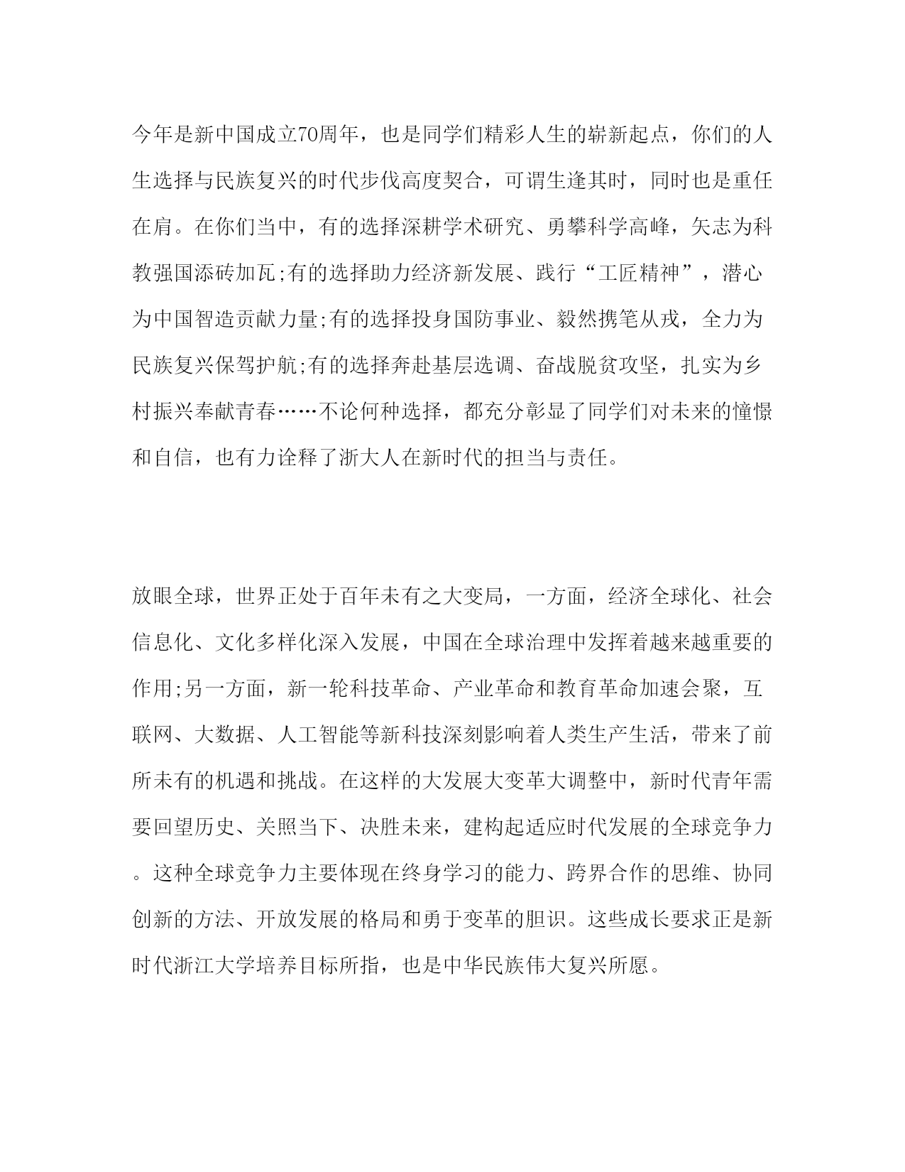 PAGE此资料由网络收集而来,如有侵权请告知上传者立即删除。资料共分享,我们负责传递知识。在2020年春季研究生毕业典礼上的讲话——争做具有全球竞争力的新时代青年亲爱的同学们:大家下午好!又是一年阳春三月,再看满园樱花芳菲,不知不觉就到了说“再见”的时候。作为校长和学长,在惜别之际,更多地是欣慰,非常高兴能与同学们一起分享学业有成的喜悦,和你们的父母、师长、亲朋一起见证你们走向新的人生阶段。在此,我谨代表学校,向同学们送上最衷心的祝贺与最美好的祝愿!时间是伟大的书写者,同学们的研究生生涯如校园内的樱花一般,美好而绚丽。在浙里,大家逐渐适应了新变化,拥有了新朋友,培养了新爱好,最重要的是“求是创新”精神已融入大家的血液,更凝聚成一种力量,成为你们一生中最宝贵的财富。今年是新中国成立70周年,也是同学们精彩人生的崭新起点,你们的人生选择与民族复兴的时代步伐高度契合,可谓生逢其时,同时也是重任在肩。在你们当中,有的选择深耕学术研究、勇攀科学高峰,矢志为科教强国添砖加瓦;有的选择助力经济新发展、践行“工匠精神”,潜心为中国智造贡献力量;有的选择投身国防事业、毅然携笔从戎,全力为民族复兴保驾护航;有的选择奔赴基层选调、奋战脱贫攻坚,扎实为乡村振兴奉献青春……不论何种选择,都充分彰显了同学们对未来的憧憬和自信,也有力诠释了浙大人在新时代的担当与责任。放眼全球,世界正处于百年未有之大变局,一方面,经济全球化、社会信息化、文化多样化深入发展,中国在全球治理中发挥着越来越重要的作用;另一方面,新一轮科技革命、产业革命和教育革命加速会聚,互联网、大数据、人工智能等新科技深刻影响着人类生产生活,带来了前所未有的机遇和挑战。在这样的大发展大变革大调整中,新时代青年需要回望历史、关照当下、决胜未来,建构起适应时代发展的全球竞争力。这种全球竞争力主要体现在终身学习的能力、跨界合作的思维、协同创新的方法、开放发展的格局和勇于变革的胆识。这些成长要求正是新时代浙江大学培养目标所指,也是中华民族伟大复兴所愿。希望同学们坚持终身学习。学校长期致力于发展一流的教育教学,推动卓越的研究生教育,引导学生德才兼备、全面发展,实现知识、能力、素质、人格并重。面向未来,大家要继续保持学生心态,善于学习,始终保持敏锐的洞察力和判断力,主动融入网络化、数字化、个性化的终身学习体系,与时俱进升级新知识、掌握新方法、提升新素养、涵育新品格,努力成为永不止步的学习型人才。希望同学们坚持跨界合作。学校长期致力于推进一流学科的创新发展,打造人尽其才的人才队伍体系,深入实施“创新2030计划”,引导学生在学教相长、交叉会聚中创新研究范式。面向未来,大家要继续保持学者风范,积极破除专业思维定势,敢于走出“舒适区”,主动融通科学与人文,推进跨团队合作、跨学科研讨、跨领域交流,努力成为融合发展的复合式领导者。希望同学们坚持协同创新。学校长期致力于构建一流的创新生态系统,推动创新动能转化为育人优势,引导学生在科教融合中练就创新内功。面向未来,大家要继续保持创新者定位,主动开展团结协作,勇于探索未知,面向理论创新、实践创新、制度创新、文化创新等领域,充分激发创造潜能,实现更多“从0到1”的原创性突破,努力成为引领创新的标杆性人物。希望同学们坚持开放发展。学校长期致力于实施全球开放发展战略,强化与世界顶尖大学的实质性合作,持续拓展全球链接的国际合作网络,引导学生在对外办学中提升国际视野。面向未来,大家要继续保持开放者心胸,主动适应全球化风云,全面服务国家区域战略需求,不断涵养包容的心态、秉持博大的胸怀、遵循开源的思路、开拓高远的境界,努力成为人类命运共同体的坚定践行者。希望同学们坚持变革图强。学校长期致力于推进治理能力现代化,通过深化改革激发师生民主管理热情,引导学生在自我管理中快速成长。面向未来,大家要继续保持改革者姿态,始终坚定求变信念,始终彰显变革魄力,始终展示革新智慧,同时注重在发展中把握趋势、在变化中把握不变,想别人之未想、做别人之未做、成别人之未成,努力成为改革浪潮的时代弄潮儿。亲爱的同学们,xxx总书记在今年的新年贺词中提到,“我们都在努力奔跑,我们都是追梦人”。作为新时代的青年,大家注定要“跑步前进”,希望你们在未来的人生路上,善于运用终身学习的能力、跨界合作的思维、协同创新的方法、开放发展的格局和勇于变革的胆识,争做具有全球竞争力的新时代追梦人!最后,衷心祝愿同学们健康、成功、幸福!母校会一直牵挂你们、关注你们、支持你们、祝福你们,希望大家常回家看看!谢谢大家!