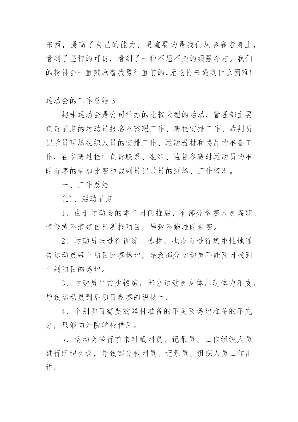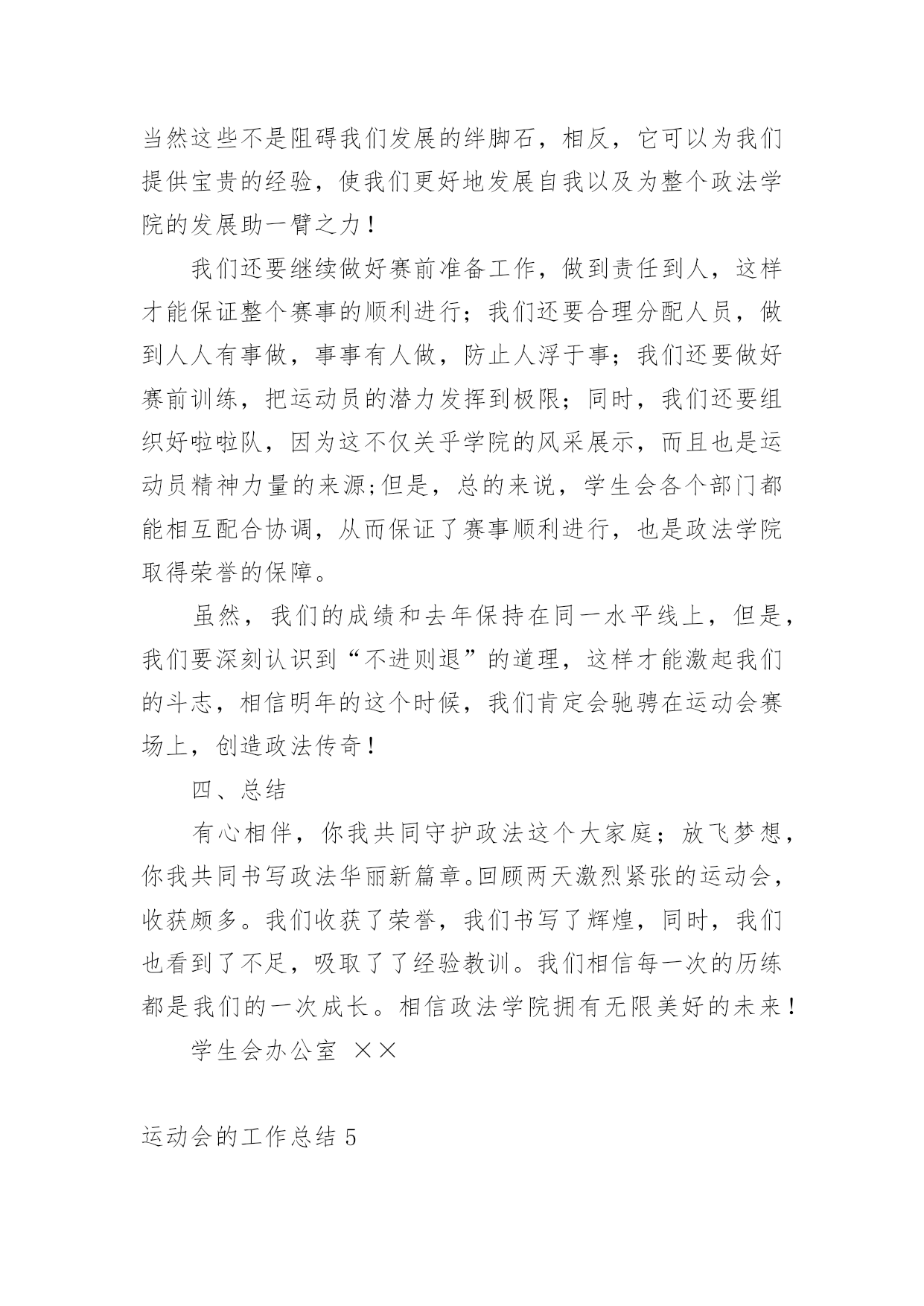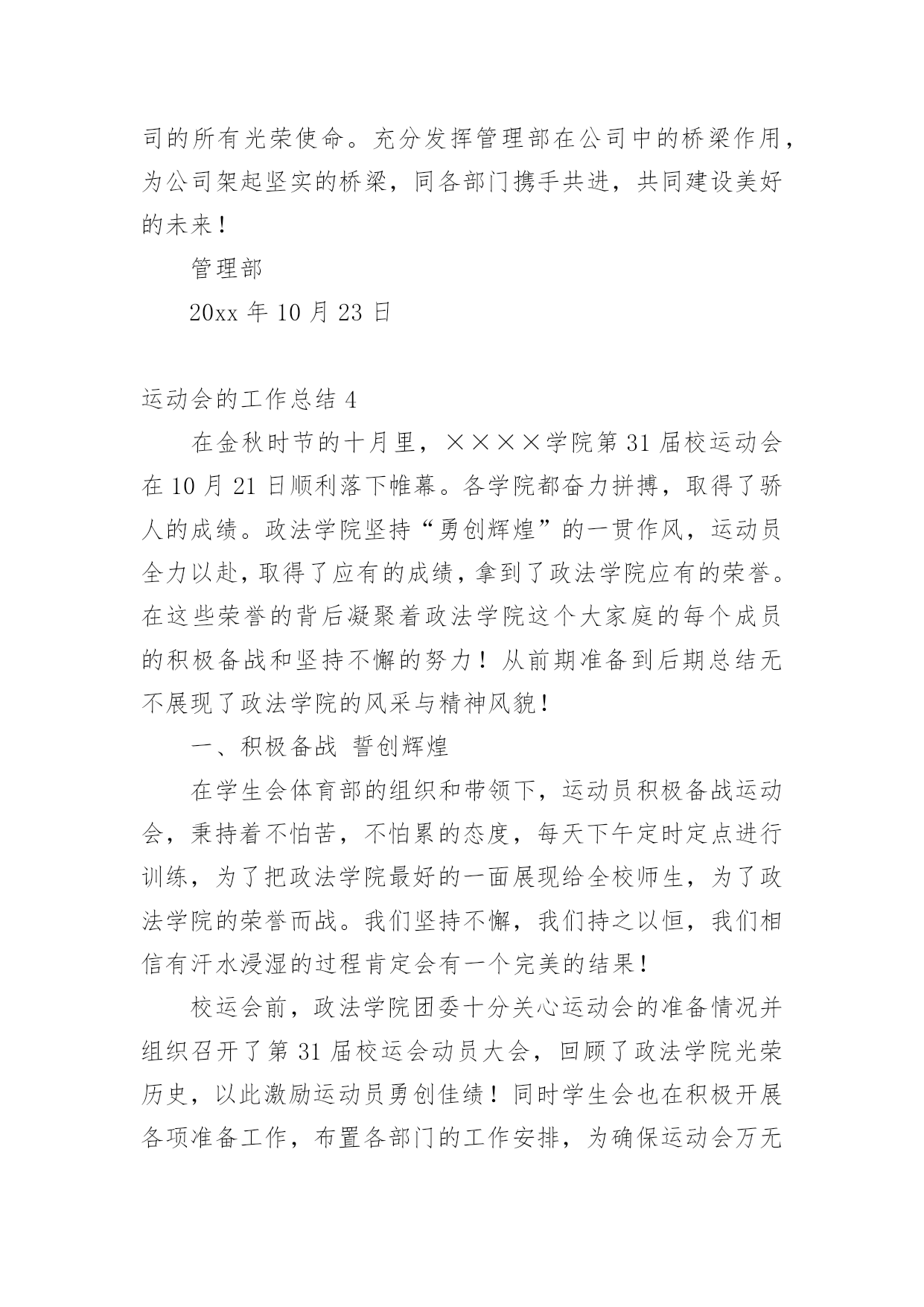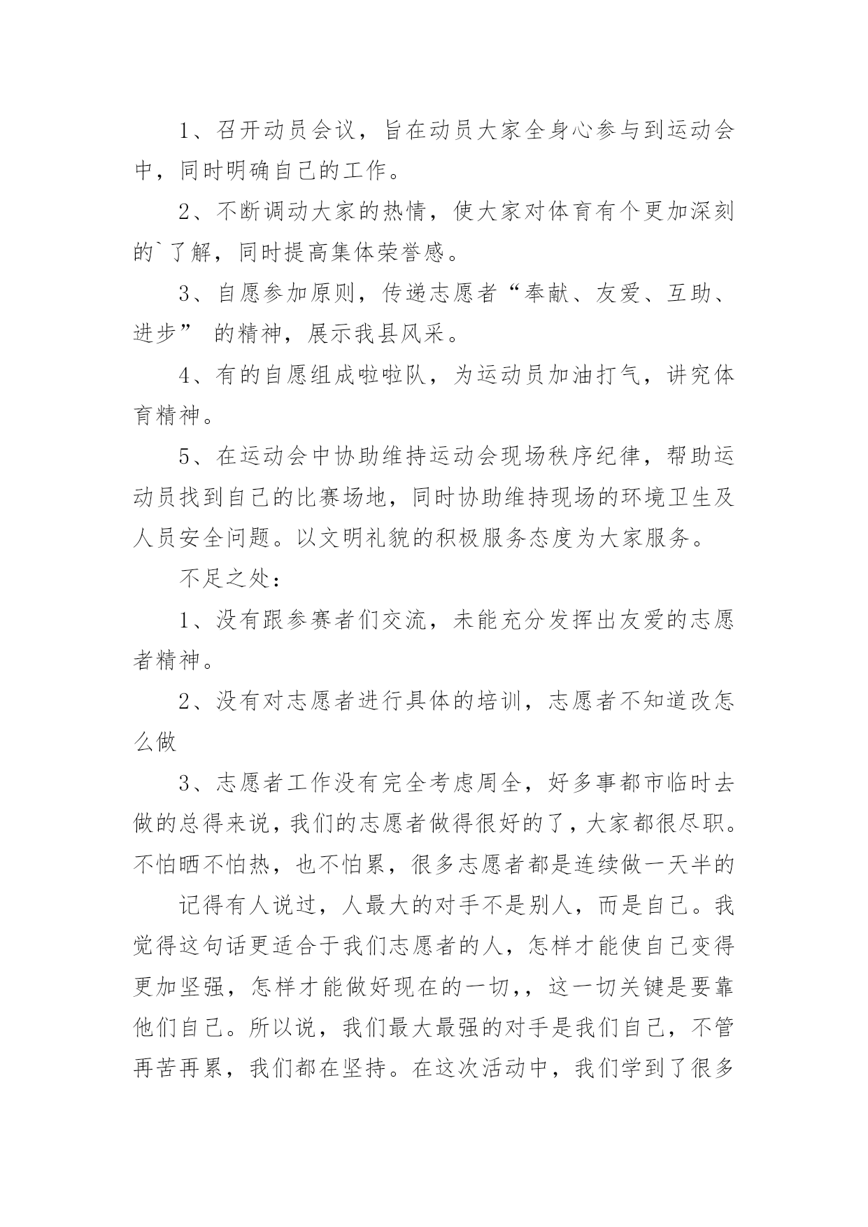 运动会的工作总结总结就是对一个时期的学习、工作或其完成情况进行一次全面系统的回顾和分析的书面材料,他能够提升我们的书面表达能力,为此我们要做好回顾,写好总结。我们该怎么去写总结呢?下面是小编帮大家整理的运动会的工作总结,希望对大家有所帮助。运动会的工作总结1时间匆匆,短短两天的新生运动会也成功的拉下了帷幕。这次活动也是我入学以来第一次校园大型体育运动活动。我也积极的加入活动中,虽未作出什么成果,但自己也从中学到了不少的东西,自己也有所心得体会!!工作安排:1。在学姐的带领下各位成员积极参加光荣榜,加油牌。赛程表的制作2。安排各位成员在各个比赛场地,拍照记录运动员的比赛中的精彩瞬间,记录下工作人员的工作情况。工作体会:在制作加油牌时,我感受到“人多力量大”的真正含义,正所谓,“三个臭皮匠赛过诸葛亮”嘛!在和同学们的交流,探讨中总是有着总是有着一个比一个好点子层出不穷的出现,想法一个比一个更新颖,让我忍不住发出阵阵惊叹!也让我体会到“一枝独秀不是春,百花齐开春满园”的真谛!当学姐和我们分享拍照经验时,内心不断的发出阵阵感慨,原来拍照也是一门技术活,我还只是一名拍照的门外汉罢了!在拍照时总会遇到种种意外情况,比如:天气,比如:人手不够,再比如:拍照时错过了最佳时间。等等问题!我也需要在第一时间想好办法和对策,这对于我来说,也是一个前所未有挑战!!身体虽累,但却值得!这也是为什么很多人说学生会是一个很能锻炼人的地方吧!我自己需要学习,需要提高,需要改变,需要纠正的地方还有太多,太多!!未来打算;如果将来能成为学生会正式的成员,希望能与学姐学长们多多交流,分享一些经验,提高自己,改变自己,然自己慢慢变成憧憬的`人!!在学生会内踏踏实实,努力做好自己的事!磨练好我的拍照技术,将来成为一名一流的拍客!!运动会的工作总结220xx年8月8日晚上,海南省趣味运动会在澄迈县绿地广场拉开帷幕。这是一场成功的运动会,成功的开幕式给了我们一个好的开始,澄迈县更是用新颖的方式展示了澄迈县的风采,为澄迈县取得更好的成绩奠定了基础。在整个运动会中,我们一共有50名志愿者。在运动会中起到了关键性的作用,纵观全局,我们有些做法可以继续发扬,不过也有不足之处,值得改善。优良之处:1、召开动员会议,旨在动员大家全身心参与到运动会中,同时明确自己的工作。2、不断调动大家的热情,使大家对体育有个更加深刻的`了解,同时提高集体荣誉感。3、自愿参加原则,传递志愿者“奉献、友爱、互助、进步”的精神,展示我县风采。4、有的自愿组成啦啦队,为运动员加油打气,讲究体育精神。5、在运动会中协助维持运动会现场秩序纪律,帮助运动员找到自己的比赛场地,同时协助维持现场的环境卫生及人员安全问题。以文明礼貌的积极服务态度为大家服务。不足之处:1、没有跟参赛者们交流,未能充分发挥出友爱的志愿者精神。2、没有对志愿者进行具体的培训,志愿者不知道改怎么做3、志愿者工作没有完全考虑周全,好多事都市临时去做的总得来说,我们的志愿者做得很好的了,大家都很尽职。不怕晒不怕热,也不怕累,很多志愿者都是连续做一天半的记得有人说过,人最大的对手不是别人,而是自己。我觉得这句话更适合于我们志愿者的人,怎样才能使自己变得更加坚强,怎样才能做好现在的一切,,这一切关键是要靠他们自己。所以说,我们最大最强的对手是我们自己,不管再苦再累,我们都在坚持。在这次活动中,我们学到了很多东西,提高了自己的能力。更重要的是我们从参赛者身上,看到了坚持的可贵,看到了一种不屈不挠的顽强斗志。我们的精神会一直鼓励着我勇往直前的,无论将来遇到什么困难!运动会的工作总结3趣味运动会是公司举办的比较大型的活动,管理部主要负责前期的运动员报名及整理工作、赛程安排工作、裁判员记录员现场组织人员的安排工作、运动器材和奖品的准备工作,在参赛过程中负责联系、组织、监督参赛时运动员的准时有序的参加比赛和裁判员记录员的到场、工作情况。一、工作总结(1)、活动前期1、由于运动会的举行时间推后,有部分参赛人员离职、请假或不清楚自己所报项目,导致不能准时参赛。2、运动员未进行训练、选拔,也没有进行集中性地通告运动员每个项目比赛场地,导致部分运动员不能及时找到个别项目的场地。3、运动员平常少锻炼,部分运动员身体出现体力不支,导致运动员到后项目参赛的积极性。4、个别项目需要的器材准备的不足及场地准备的不充分,只能向外院学校借用。5、运动会举行前未对裁判员、记录员、工作组织人员进行组织会议,导致部分裁判员、记录员、组织人员工作出错。6、裁判员记录员没有补助和礼品,导致他们的工作积极性减弱。7、未安排后勤工作人员和医务人员。(2)、活动中期1、比赛正在进行时,有临时报名参赛或临时替换人员参赛。导致影响项目结束时间。2、喊话筒用到中途没有电,导致影响组织人员组织运动员参