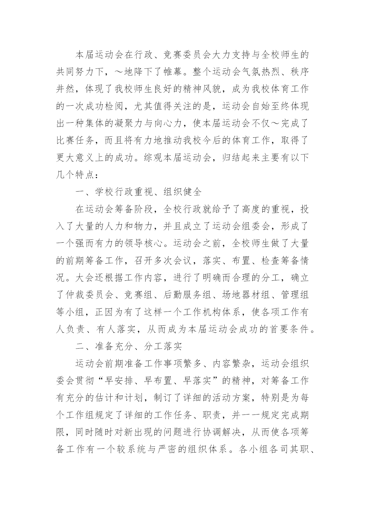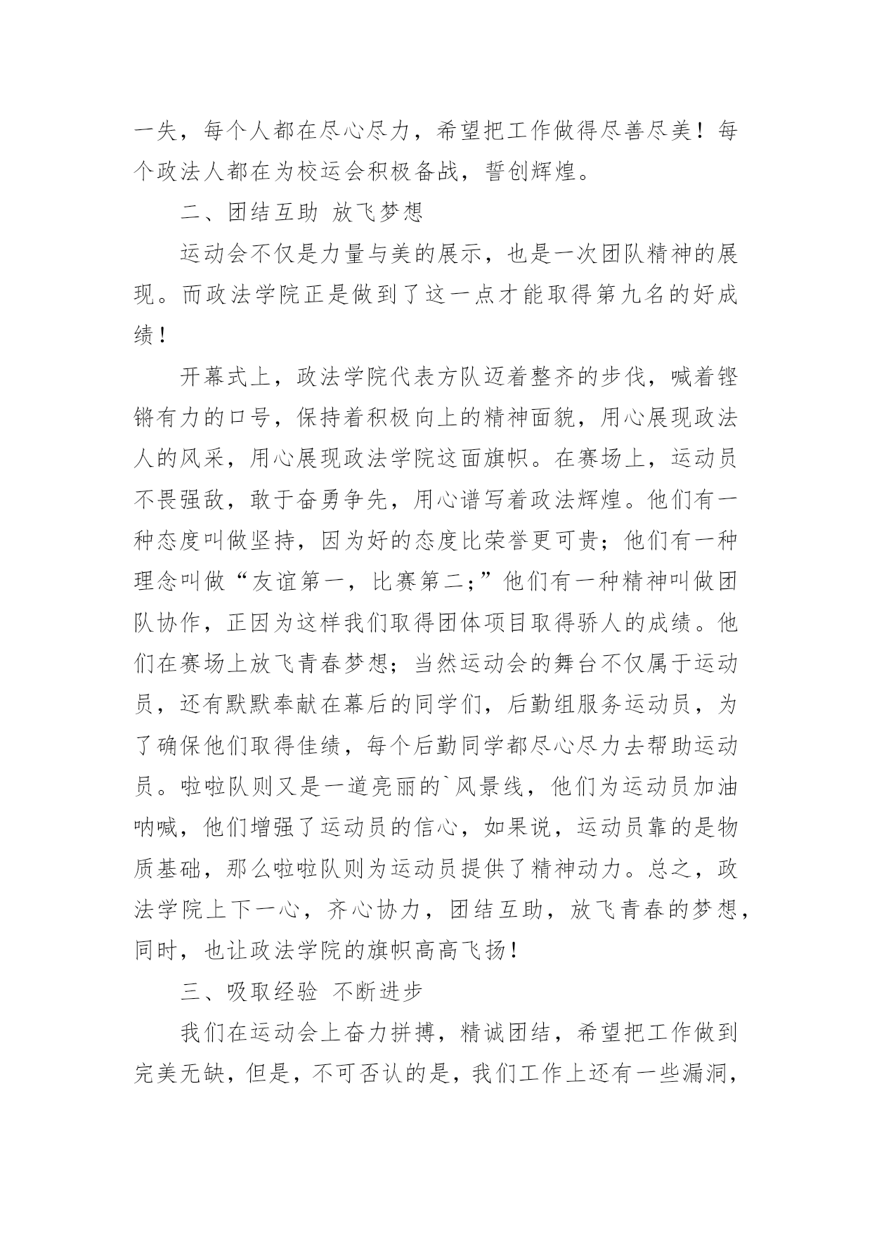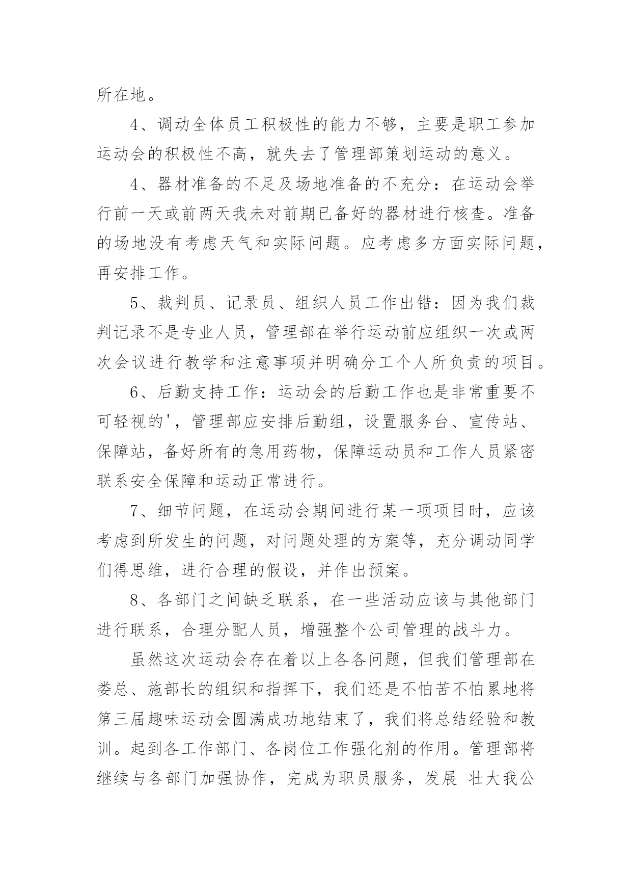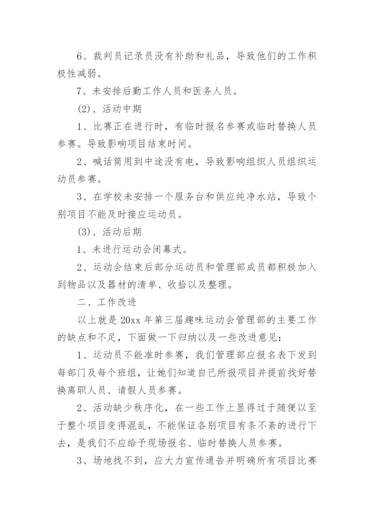 运动会的工作总结总结就是对一个时期的学习、工作或其完成情况进行一次全面系统的回顾和分析的书面材料,他能够提升我们的书面表达能力,为此我们要做好回顾,写好总结。我们该怎么去写总结呢?下面是小编帮大家整理的运动会的工作总结,希望对大家有所帮助。运动会的工作总结1时间匆匆,短短两天的新生运动会也成功的拉下了帷幕。这次活动也是我入学以来第一次校园大型体育运动活动。我也积极的加入活动中,虽未作出什么成果,但自己也从中学到了不少的东西,自己也有所心得体会!!工作安排:1。在学姐的带领下各位成员积极参加光荣榜,加油牌。赛程表的制作2。安排各位成员在各个比赛场地,拍照记录运动员的比赛中的精彩瞬间,记录下工作人员的工作情况。工作体会:在制作加油牌时,我感受到“人多力量大”的真正含义,正所谓,“三个臭皮匠赛过诸葛亮”嘛!在和同学们的交流,探讨中总是有着总是有着一个比一个好点子层出不穷的出现,想法一个比一个更新颖,让我忍不住发出阵阵惊叹!也让我体会到“一枝独秀不是春,百花齐开春满园”的真谛!当学姐和我们分享拍照经验时,内心不断的发出阵阵感慨,原来拍照也是一门技术活,我还只是一名拍照的门外汉罢了!在拍照时总会遇到种种意外情况,比如:天气,比如:人手不够,再比如:拍照时错过了最佳时间。等等问题!我也需要在第一时间想好办法和对策,这对于我来说,也是一个前所未有挑战!!身体虽累,但却值得!这也是为什么很多人说学生会是一个很能锻炼人的地方吧!我自己需要学习,需要提高,需要改变,需要纠正的地方还有太多,太多!!未来打算;如果将来能成为学生会正式的成员,希望能与学姐学长们多多交流,分享一些经验,提高自己,改变自己,然自己慢慢变成憧憬的`人!!在学生会内踏踏实实,努力做好自己的事!磨练好我的拍照技术,将来成为一名一流的拍客!!运动会的工作总结220xx年8月8日晚上,海南省趣味运动会在澄迈县绿地广场拉开帷幕。这是一场成功的运动会,成功的开幕式给了我们一个好的开始,澄迈县更是用新颖的方式展示了澄迈县的风采,为澄迈县取得更好的成绩奠定了基础。在整个运动会中,我们一共有50名志愿者。在运动会中起到了关键性的作用,纵观全局,我们有些做法可以继续发扬,不过也有不足之处,值得改善。优良之处:1、召开动员会议,旨在动员大家全身心参与到运动会中,同时明确自己的工作。2、不断调动大家的热情,使大家对体育有个更加深刻的`了解,同时提高集体荣誉感。3、自愿参加原则,传递志愿者“奉献、友爱、互助、进步”的精神,展示我县风采。4、有的自愿组成啦啦队,为运动员加油打气,讲究体育精神。5、在运动会中协助维持运动会现场秩序纪律,帮助运动员找到自己的比赛场地,同时协助维持现场的环境卫生及人员安全问题。以文明礼貌的积极服务态度为大家服务。不足之处:1、没有跟参赛者们交流,未能充分发挥出友爱的志愿者精神。2、没有对志愿者进行具体的培训,志愿者不知道改怎么做3、志愿者工作没有完全考虑周全,好多事都市临时去做的总得来说,我们的志愿者做得很好的了,大家都很尽职。不怕晒不怕热,也不怕累,很多志愿者都是连续做一天半的记得有人说过,人最大的对手不是别人,而是自己。我觉得这句话更适合于我们志愿者的人,怎样才能使自己变得更加坚强,怎样才能做好现在的一切,,这一切关键是要靠他们自己。所以说,我们最大最强的对手是我们自己,不管再苦再累,我们都在坚持。在这次活动中,我们学到了很多东西,提高了自己的能力。更重要的是我们从参赛者身上,看到了坚持的可贵,看到了一种不屈不挠的顽强斗志。我们的精神会一直鼓励着我勇往直前的,无论将来遇到什么困难!运动会的工作总结3趣味运动会是公司举办的比较大型的活动,管理部主要负责前期的运动员报名及整理工作、赛程安排工作、裁判员记录员现场组织人员的安排工作、运动器材和奖品的准备工作,在参赛过程中负责联系、组织、监督参赛时运动员的准时有序的参加比赛和裁判员记录员的到场、工作情况。一、工作总结(1)、活动前期1、由于运动会的举行时间推后,有部分参赛人员离职、请假或不清楚自己所报项目,导致不能准时参赛。2、运动员未进行训练、选拔,也没有进行集中性地通告运动员每个项目比赛场地,导致部分运动员不能及时找到个别项目的场地。3、运动员平常少锻炼,部分运动员身体出现体力不支,导致运动员到后项目参赛的积极性。4、个别项目需要的器材准备的不足及场地准备的不充分,只能向外院学校借用。5、运动会举行前未对裁判员、记录员、工作组织人员进行组织会议,导致部分裁判员、记录员、组织人员工作出错。6、裁判员记录员没有补助和礼品,导致他们的工作积极性减弱。7、未安排后勤工作人员和医务人员。(2)、活动中期1、比赛正在进行时,有临时报名参赛或临时替换人员参赛。导致影响项目结束时间。2、喊话筒用到中途没有电,导致影响组织人员组织运动员参