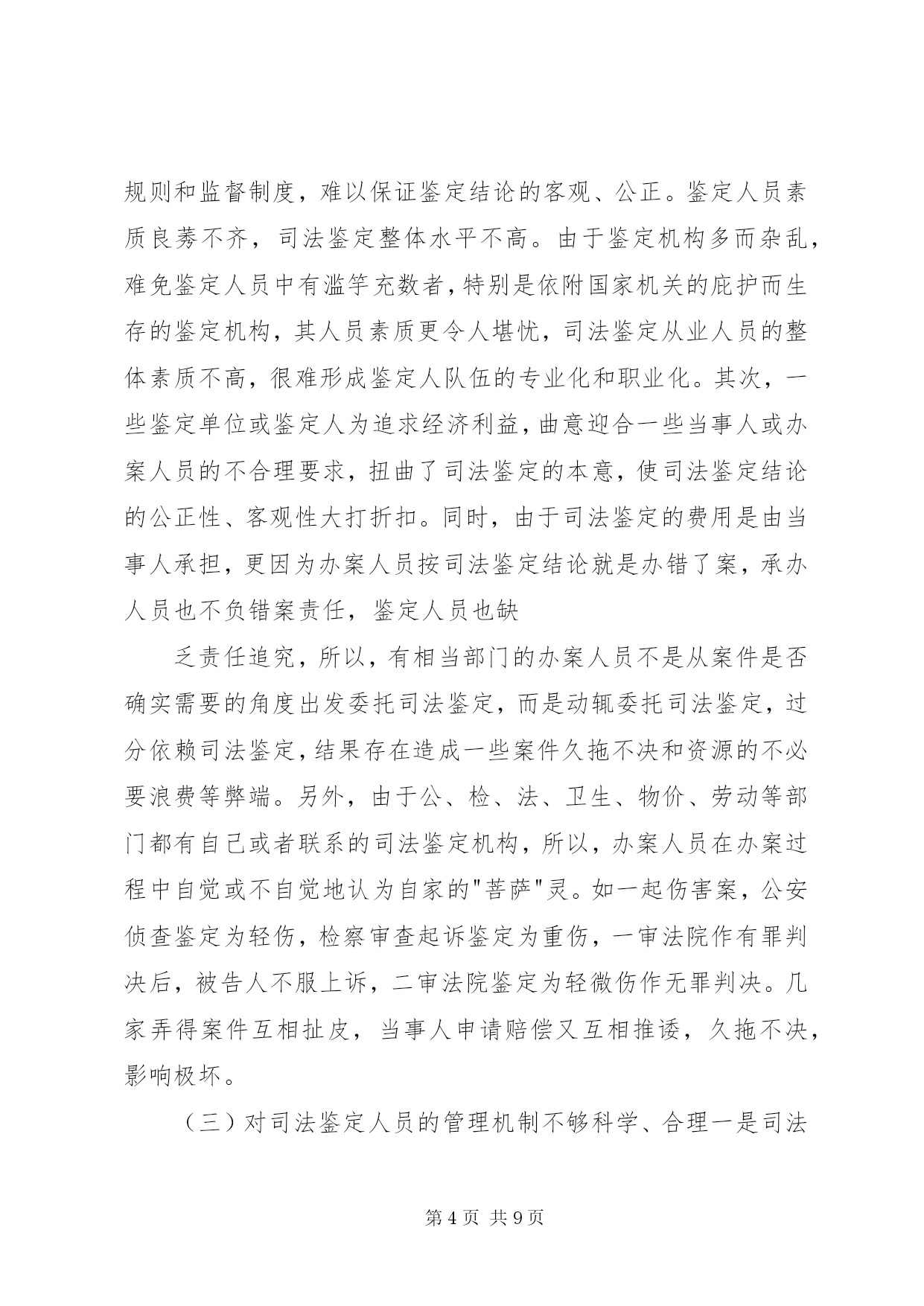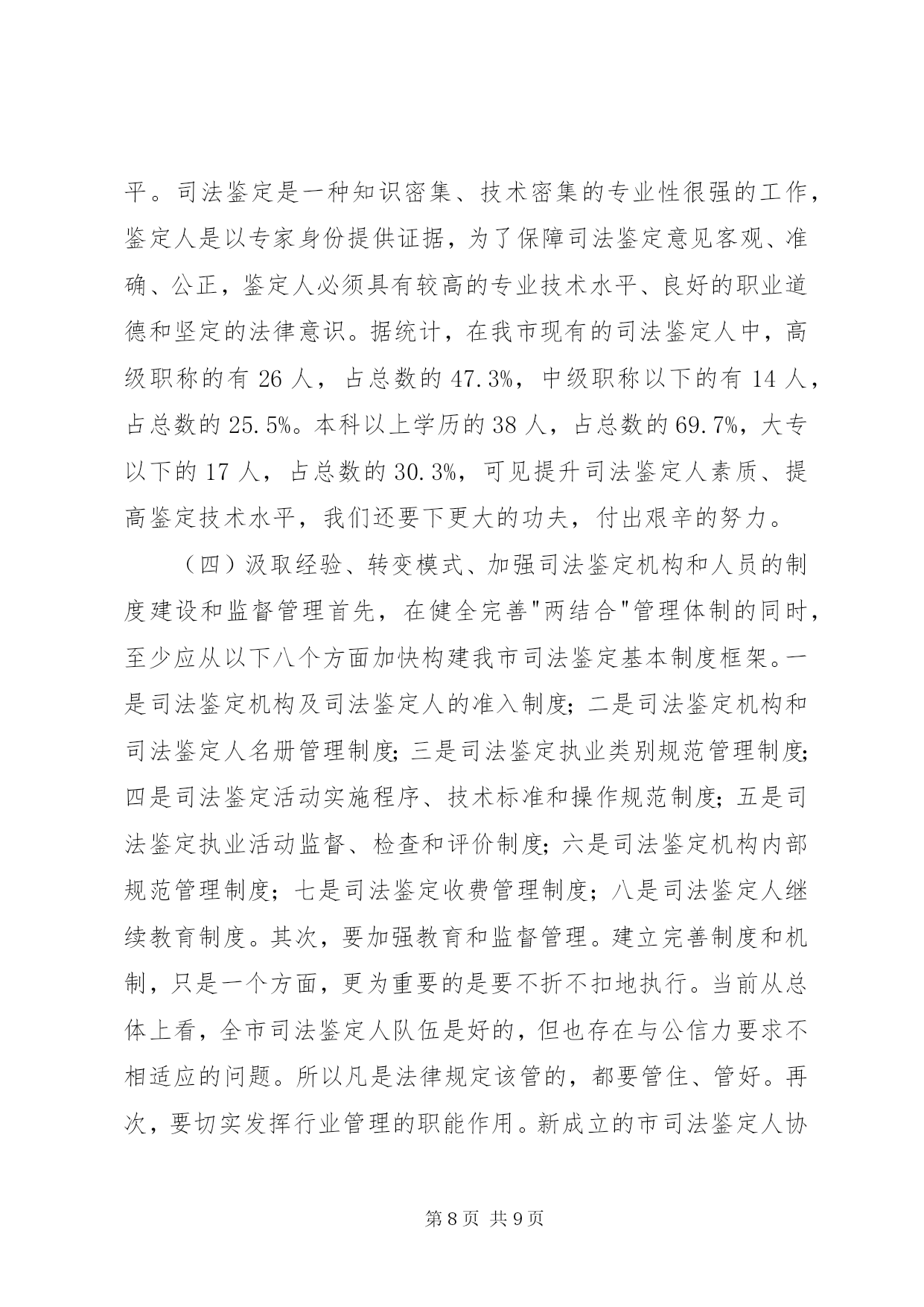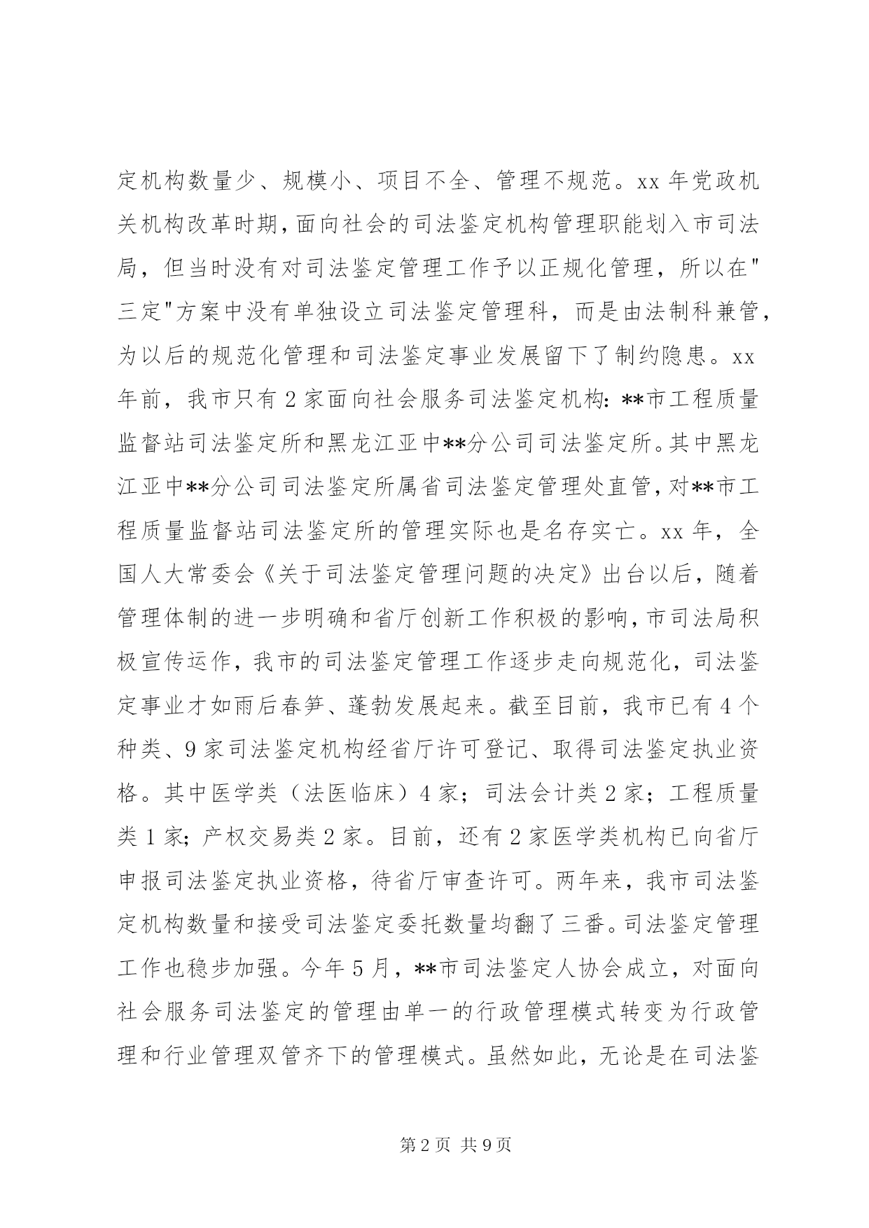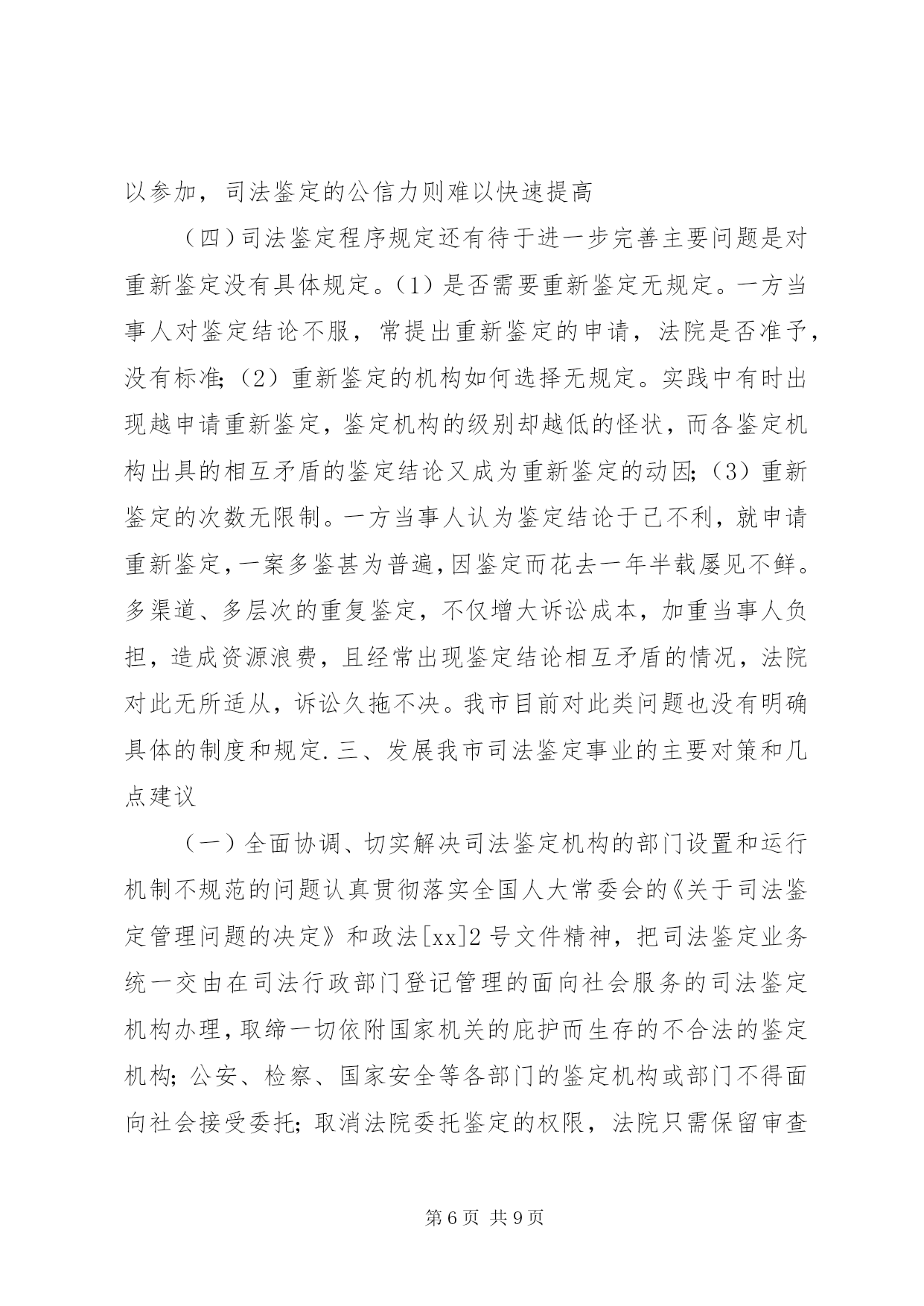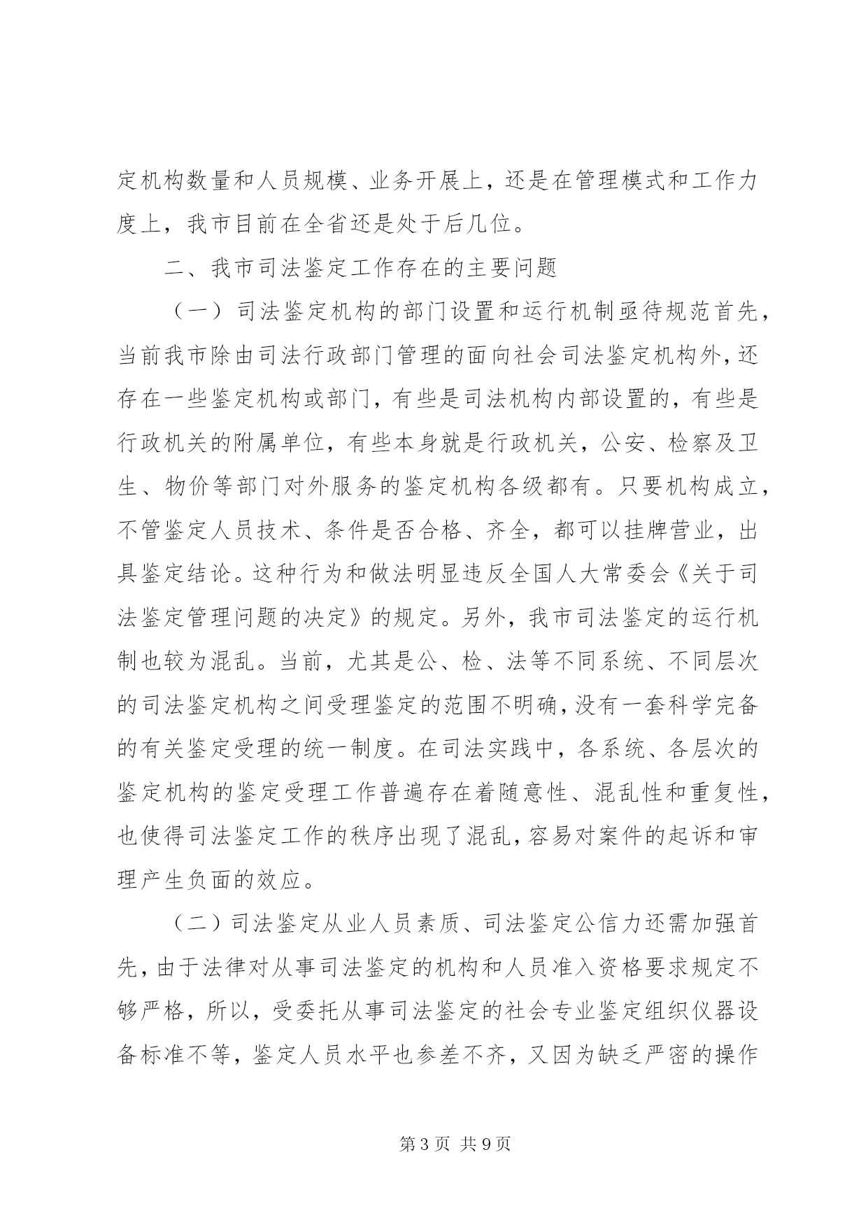 第PAGE\*Arabic\*MERGEFORMAT9页共NUMPAGES\*MERGEFORMAT9页司法鉴定工作状况调研报告市面向社会服务司法鉴定机构如雨后春笋、蓬勃发展起来,司法鉴定管理模式在我市呈现出积极探索、稳妥推进的新局面。但我市也存在着司法鉴定的运行机制较为混乱、司法鉴定从业人员的整体素质不高、司法鉴定人员的管理机制不够科学、合理等问题。为此,笔者根据工作经验和体会,对发展我市司法鉴定事业提出了一些主要对策和建议。【关键词】司法鉴定;现状;问题;对策司法鉴定是在诉讼过程中,对于案件中的某些专门性问题,按诉讼法的规定,经当事人申请,司法机关决定,或司法机关主动决定,指派、聘请具有专门知识的鉴定人,运用科学技术手段,对专门性问题做出判断结论的一种核实证据的活动。简单地说,司法鉴定就是侦查、起诉、审判等诉讼活动中依法进行的鉴定。那么什么是面向社会服务的司法鉴定活动。除司法机关内部鉴定机构因业务需要而进行的无偿司法鉴定活动之外的其他司法鉴定活动,均为面向社会服务的司法鉴定活动。目前,司法鉴定管理模式在我市呈现出积极探索、稳妥推进的新局面。现笔者就我市司法鉴定工作的发展及现状、存在主要问题、完善对策建议作尝试性的探讨。一、我市司法鉴定工作的发展和现状**市面向社会服务司法鉴定工作同全省其他地市相比起步较晚、基础薄弱、规模较小、管理相对滞后。受经济大环境影响,我市面向社会服务的司法鉴定机构数量少、规模小、项目不全、管理不规范。xx年党政机关机构改革时期,面向社会的司法鉴定机构管理职能划入市司法局,但当时没有对司法鉴定管理工作予以正规化管理,所以在"三定"方案中没有单独设立司法鉴定管理科,而是由法制科兼管,为以后的规范化管理和司法鉴定事业发展留下了制约隐患。xx年前,我市只有2家面向社会服务司法鉴定机构:**市工程质量监督站司法鉴定所和黑龙江亚中**分公司司法鉴定所。其中黑龙江亚中**分公司司法鉴定所属省司法鉴定管理处直管,对**市工程质量监督站司法鉴定所的管理实际也是名存实亡。xx年,全国人大常委会《关于司法鉴定管理问题的决定》出台以后,随着管理体制的进一步明确和省厅创新工作积极的影响,市司法局积极宣传运作,我市的司法鉴定管理工作逐步走向规范化,司法鉴定事业才如雨后春笋、蓬勃发展起来。截至目前,我市已有4个种类、9家司法鉴定机构经省厅许可登记、取得司法鉴定执业资格。其中医学类(法医临床)4家;司法会计类2家;工程质量类1家;产权交易类2家。目前,还有2家医学类机构已向省厅申报司法鉴定执业资格,待省厅审查许可。两年来,我市司法鉴定机构数量和接受司法鉴定委托数量均翻了三番。司法鉴定管理工作也稳步加强。今年5月,**市司法鉴定人协会成立,对面向社会服务司法鉴定的管理由单一的行政管理模式转变为行政管理和行业管理双管齐下的管理模式。虽然如此,无论是在司法鉴定机构数量和人员规模、业务开展上,还是在管理模式和工作力度上,我市目前在全省还是处于后几位。二、我市司法鉴定工作存在的主要问题(一)司法鉴定机构的部门设置和运行机制亟待规范首先,当前我市除由司法行政部门管理的面向社会司法鉴定机构外,还存在一些鉴定机构或部门,有些是司法机构内部设置的,有些是行政机关的附属单位,有些本身就是行政机关,公安、检察及卫生、物价等部门对外服务的鉴定机构各级都有。只要机构成立,不管鉴定人员技术、条件是否合格、齐全,都可以挂牌营业,出具鉴定结论。这种行为和做法明显违反全国人大常委会《关于司法鉴定管理问题的决定》的规定。另外,我市司法鉴定的运行机制也较为混乱。当前,尤其是公、检、法等不同系统、不同层次的司法鉴定机构之间受理鉴定的范围不明确,没有一套科学完备的有关鉴定受理的统一制度。在司法实践中,各系统、各层次的鉴定机构的鉴定受理工作普遍存在着随意性、混乱性和重复性,也使得司法鉴定工作的秩序出现了混乱,容易对案件的起诉和审理产生负面的效应。(二)司法鉴定从业人员素质、司法鉴定公信力还需加强首先,由于法律对从事司法鉴定的机构和人员准入资格要求规定不够严格,所以,受委托从事司法鉴定的社会专业鉴定组织仪器设备标准不等,鉴定人员水平也参差不齐,又因为缺乏严密的操作规则和监督制度,难以保证鉴定结论的客观、公正。鉴定人员素质良莠不齐,司法鉴定整体水平不高。由于鉴定机构多而杂乱,难免鉴定人员中有滥竽充数者,特别是依附国家机关的庇护而生存的鉴定机构,其人员素质更令人堪忧,司法鉴定从业人员的整体素质不高,很难形成鉴定人队伍的专业化和职业化。其次,一些鉴定单位或鉴定人为追求经济利益,曲意迎合一些当事人或办案人员的不合理要求,扭曲了司法鉴定的本意,使司法鉴定结论的公正性、客观性大打折扣。同时,由于司法鉴定的费用是由当事人承担,更因为办案人员按司法鉴定结论就是办错了