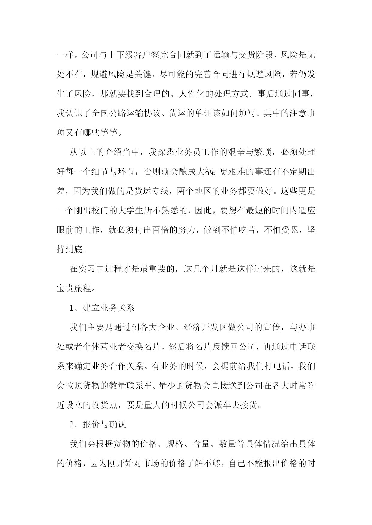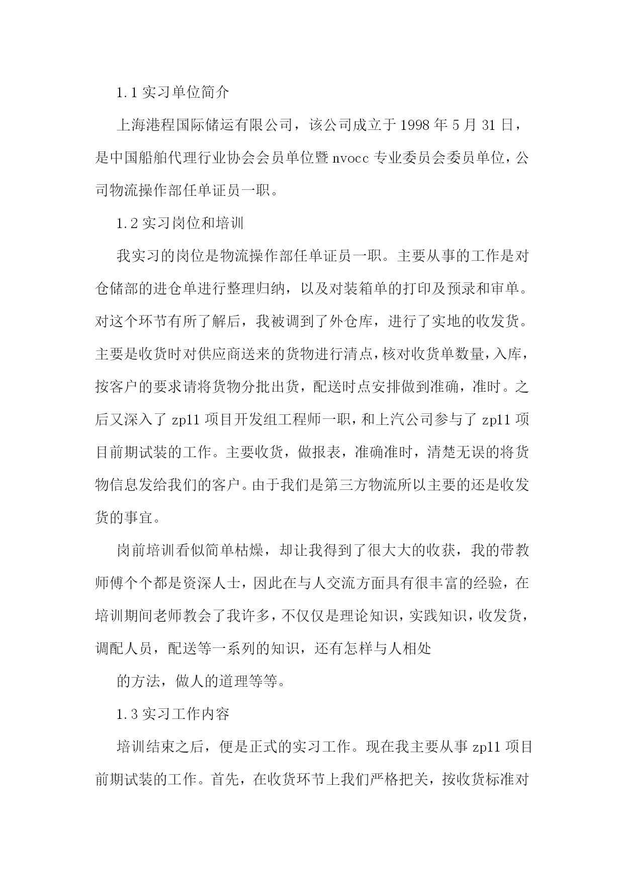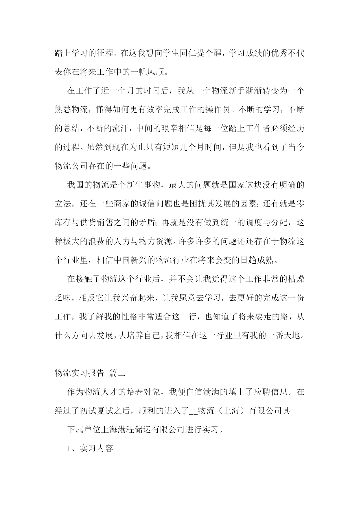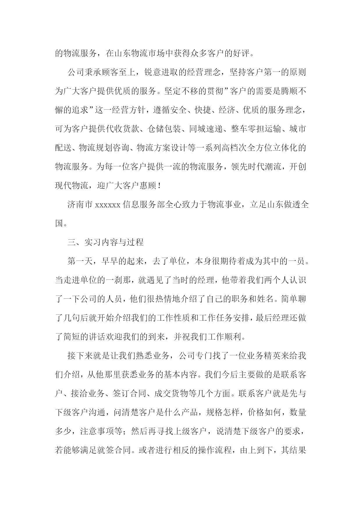 物流实习报告【优秀4篇】在物流公司的实习报告篇一一、实习目的进入单位实习,是为了进一步了解物流的运作和相关设施,设备与人员技术技能,物流设施设备等的基本常识;掌握物流系统的构成和物流基本环节,掌握运输,仓储,包装,装卸搬运,配送,信息处理等基本的物流作业功能的相关知识,做到学以致用,把从学校学到的理论知识与实际工作中的实践贯穿起来,并依据学习的理论提出自己的意见。从社会实践中,逐步完善自我、发展自我,最终完全融入现实生活当中,做一名言出必行、知识与能力兼备、符合社会主义发展目标的合格大学生。二、单位介绍济南市xxxx信息服务部是由一批具有丰富物流经验的精英所组成。主要经营全国范围内的货物运输等。公司现有提送货车辆20余部、干线运输车辆100余部、箱式货车50余部、员工50余人,网点遍布山东全省,网络覆盖全国各大中城市。提供主要方向济南到东北三省全境,北京、山西、新疆、内蒙、陕西全境,宁夏、兰州、西宁、拉萨全境,四川、重庆、昆明全境,上海、广州等全国各省市全境服务。公司本着客户满意是我们最大的心愿为服务宗旨,以诚信、安全、快捷、准确为服务承诺,珍惜与客户的每一次合作,用脚踏实地的作风,以”一流的团队,一流的服务,一流的质量”为客户提供最完善的物流服务,在山东物流市场中获得众多客户的好评。公司秉承顾客至上,锐意进取的经营理念,坚持客户第一的原则为广大客户提供优质的服务。坚定不移的贯彻”客户的需要是腾顺不懈的追求”这一经营方针,遵循安全、快捷、经济、优质的服务理念,可为客户提供代收货款、仓储包装、同城速递、整车零担运输、城市配送、物流规划咨询、物流方案设计等一系列高档次全方位立体化的物流服务。为每一位客户提供一流的物流服务,领先时代潮流,开创现代物流,迎广大客户惠顾!济南市xxxxxx信息服务部全心致力于物流事业,立足山东做透全国。三、实习内容与过程第一天,早早的起来,去了单位,本身很期待着成为其中的一员。当走进单位的一刹那,就遇见了当时的经理,他带着我们两个人认识了一下公司的人员,他们很热情地介绍了自己的职务和姓名。简单聊了几句后就开始介绍我们的工作性质和工作任务安排,最后经理还做了简短的讲话欢迎我们的到来,并祝我们工作顺利。接下来就是让我们熟悉业务,公司专门找了一位业务精英来给我们介绍,从他那里获悉业务的基本内容。我们今后主要做的是联系客户、接洽业务、签订合同、成交货物等几个方面。联系客户就是先与下级客户沟通,问清楚客户是什么产品,规格怎样,价格如何,数量多少,注意事项等;然后再寻找上级客户,说清楚下级客户的要求,若能够满足就签合同。或者进行相反的操作流程,由上到下,其结果一样。公司与上下级客户签完合同就到了运输与交货阶段,风险是无处不在,规避风险是关键,尽可能的完善合同进行规避风险,若仍发生了风险,那就要找到合理的、人性化的处理方式。事后通过同事,我认识了全国公路运输协议、货运的单证该如何填写、其中的注意事项又有哪些等等。从以上的介绍当中,我深悉业务员工作的艰辛与繁琐,必须处理好每一个细节与环节,否则就会酿成大祸;更艰难的事还有不定期出差,因为我们做的是货运专线,两个地区的业务都要做好。这些更是一个刚出校门的大学生所不熟悉的,因此,要想在最短的时间内适应眼前的工作,就必须付出百倍的努力,做到不怕吃苦,不怕受累,坚持到底。在实习中过程才是最重要的,这几个月就是这样过来的,这就是宝贵旅程。1、建立业务关系我们主要是通过到各大企业、经济开发区做公司的宣传,与办事处或者个体营业者交换名片,然后将名片反馈回公司,再通过电话联系来确定业务合作关系。有业务的时候,会提前给我们打电话,我们会按照货物的数量联系车。量少的货物会直接送到公司在各大时常附近设立的收货点,要是量大的时候公司会派车去接货。2、报价与确认我们会根据货物的价格、规格、含量、数量等具体情况给出具体的价格,因为刚开始对市场的价格了解不够,自己不能报出价格的时候,我们会让经理直接联系客户做出回答或者是客户和经理联系。当经过双方的友好协商对价格达成共识后,接下来又到了下一步签订合同。3、签订运输合同签订运输合同这一环节并不是很复杂,只是存在一方要与我公司签订运输合同,也就是货主;签合同要注意的事项有:合同条款要求严谨,责任风险要求划分清楚,违约及补救要求详细明确,纠纷解决办法要求得当得体,合同有效期限等等。商榷了有关运输、装卸、仓储等事宜,还规定在接收到我方的提货通知后要即使提货,否则后果自负。4、付款与收货等到货物从货主那里换装完毕后发往目的地后,大约需要一到两天的时间。货物到站后,返回到货通知,同时在目的地提供发货通知,以便双方及时提货。若出现短量现象,应该按照合同条款作出处理。当对方提货是我们会收取运费,当然收取的运费会比给司机的运