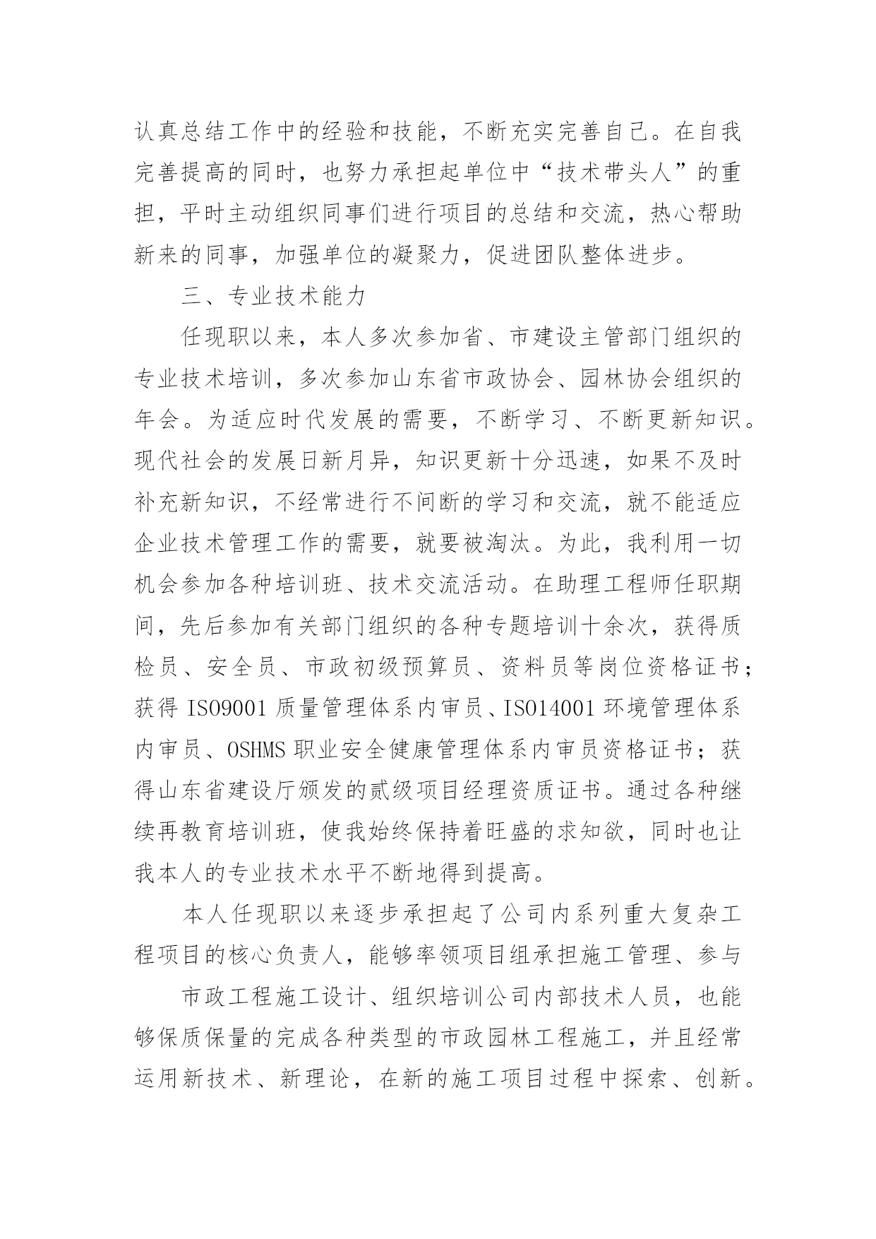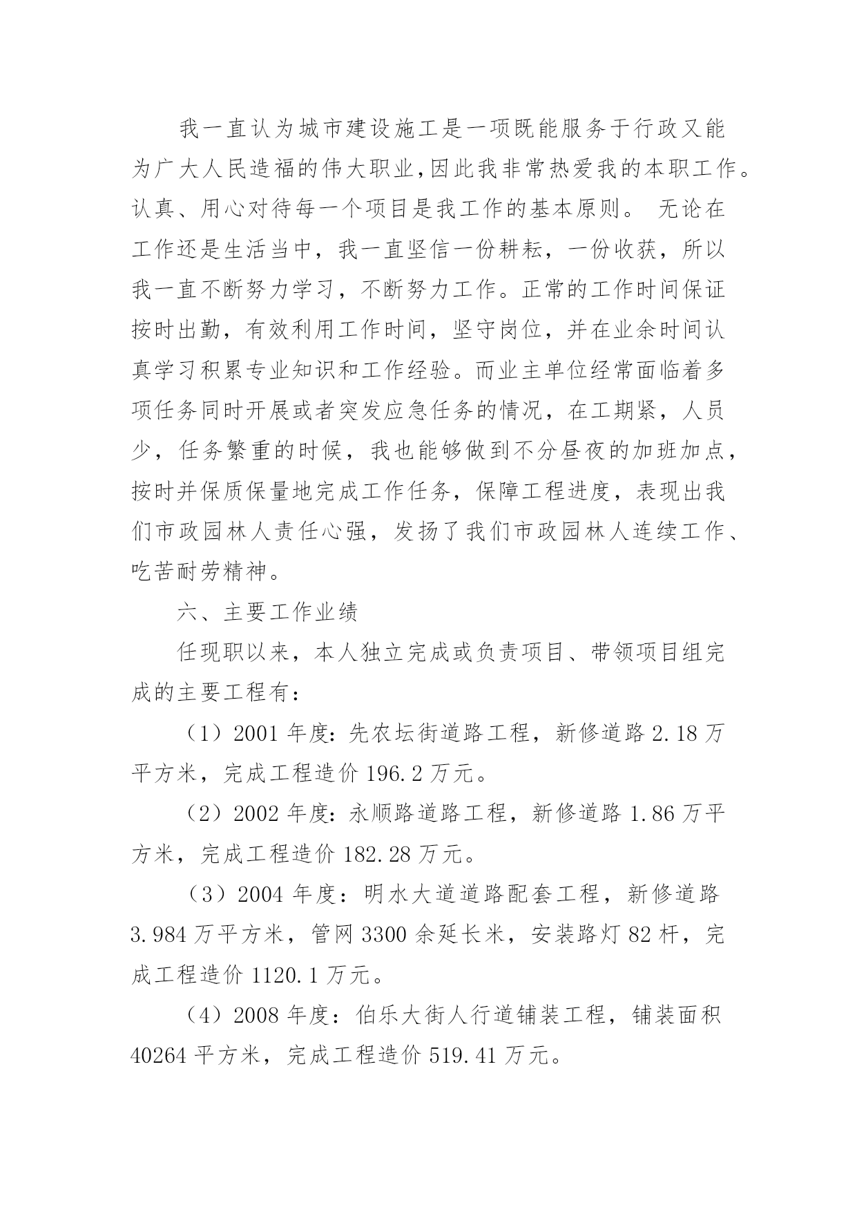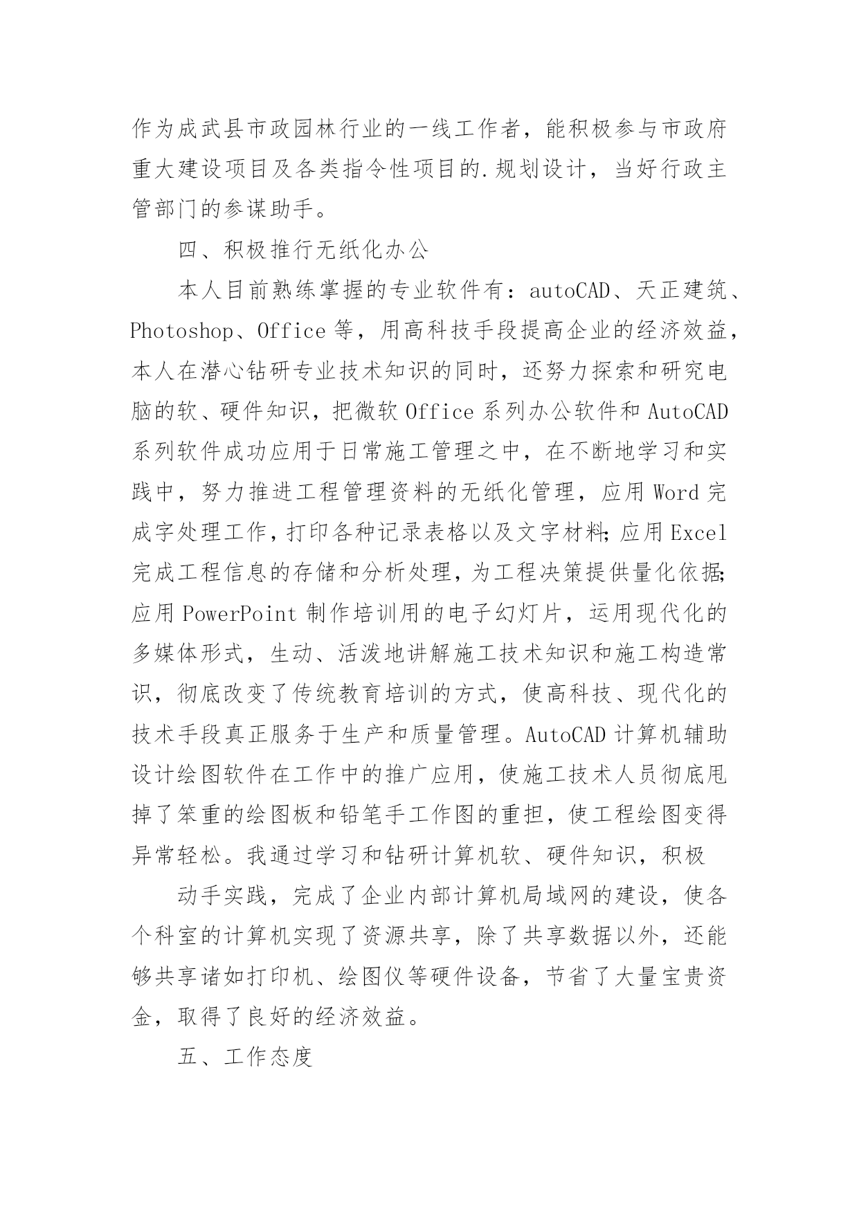 中级职称建筑专业技术工作总结中级职称建筑专业技术工作总结一、个人简历本人1987年毕业于中央农业广播学校,农学专业,中专学历。就职于成武县市政园林处从事市政道路、桥梁、排水和园林绿化施工工作。1994年被任命为成武县是真园林处副主任至今。一直从事市政道路、桥梁、排水和园林绿化施工工作,在“德、能、勤、绩”等方面均表现突出。二、政治思想及道德品质首先,在思想上积极要求进步,紧跟时代步伐,认真学习党和国家的方针政策,了解社会的最新动态。一直以一名党员的标准严格要求自己,自觉接受党组织和同事们的监督和帮助,坚持不懈地克服自身的缺点,弥补自己的不足,争取在以后漫长的岁月中经得起考验。作为一个城市建设的工作者,我一直坚守建筑行业的职业道德,努力在行政手段、大众利益与群众需求之间寻找最大交集和平衡点,力求我所负责的每一个项目都能够做到真正务实。因此,认真、用心的对待每一个项目是我工作的基本原则。这一点,也得到了建设局领导和公司领导的一致认可。自参加工作以来,我身怀强烈的主人翁精神,将公司的发展与自己的发展紧密的联系到一起。我一直遵守公司的各项规章制度,积极服从领导的工作安排,圆满完成各种工作任务,维护集体荣誉。在工作中积极努力,任劳任怨,认真学习相关专业知识,认真总结工作中的经验和技能,不断充实完善自己。在自我完善提高的同时,也努力承担起单位中“技术带头人”的重担,平时主动组织同事们进行项目的总结和交流,热心帮助新来的同事,加强单位的凝聚力,促进团队整体进步。三、专业技术能力任现职以来,本人多次参加省、市建设主管部门组织的专业技术培训,多次参加山东省市政协会、园林协会组织的年会。为适应时代发展的需要,不断学习、不断更新知识。现代社会的发展日新月异,知识更新十分迅速,如果不及时补充新知识,不经常进行不间断的学习和交流,就不能适应企业技术管理工作的需要,就要被淘汰。为此,我利用一切机会参加各种培训班、技术交流活动。在助理工程师任职期间,先后参加有关部门组织的各种专题培训十余次,获得质检员、安全员、市政初级预算员、资料员等岗位资格证书;获得ISO9001质量管理体系内审员、ISO14001环境管理体系内审员、OSHMS职业安全健康管理体系内审员资格证书;获得山东省建设厅颁发的贰级项目经理资质证书。通过各种继续再教育培训班,使我始终保持着旺盛的求知欲,同时也让我本人的专业技术水平不断地得到提高。本人任现职以来逐步承担起了公司内系列重大复杂工程项目的核心负责人,能够率领项目组承担施工管理、参与市政工程施工设计、组织培训公司内部技术人员,也能够保质保量的完成各种类型的市政园林工程施工,并且经常运用新技术、新理论,在新的施工项目过程中探索、创新。作为成武县市政园林行业的一线工作者,能积极参与市政府重大建设项目及各类指令性项目的.规划设计,当好行政主管部门的参谋助手。四、积极推行无纸化办公本人目前熟练掌握的专业软件有:autoCAD、天正建筑、Photoshop、Office等,用高科技手段提高企业的经济效益,本人在潜心钻研专业技术知识的同时,还努力探索和研究电脑的软、硬件知识,把微软Office系列办公软件和AutoCAD系列软件成功应用于日常施工管理之中,在不断地学习和实践中,努力推进工程管理资料的无纸化管理,应用Word完成字处理工作,打印各种记录表格以及文字材料;应用Excel完成工程信息的存储和分析处理,为工程决策提供量化依据;应用PowerPoint制作培训用的电子幻灯片,运用现代化的多媒体形式,生动、活泼地讲解施工技术知识和施工构造常识,彻底改变了传统教育培训的方式,使高科技、现代化的技术手段真正服务于生产和质量管理。AutoCAD计算机辅助设计绘图软件在工作中的推广应用,使施工技术人员彻底甩掉了笨重的绘图板和铅笔手工作图的重担,使工程绘图变得异常轻松。我通过学习和钻研计算机软、硬件知识,积极动手实践,完成了企业内部计算机局域网的建设,使各个科室的计算机实现了资源共享,除了共享数据以外,还能够共享诸如打印机、绘图仪等硬件设备,节省了大量宝贵资金,取得了良好的经济效益。五、工作态度我一直认为城市建设施工是一项既能服务于行政又能为广大人民造福的伟大职业,因此我非常热爱我的本职工作。认真、用心对待每一个项目是我工作的基本原则。无论在工作还是生活当中,我一直坚信一份耕耘,一份收获,所以我一直不断努力学习,不断努力工作。正常的工作时间保证按时出勤,有效利用工作时间,坚守岗位,并在业余时间认真学习积累专业知识和工作经验。而业主单位经常面临着多项任务同时开展或者突发应急任务的情况,在工期紧,人员少,任务繁重的时候,我也能够做到不分昼夜的加班加点,按时并保质保量地完成工作任务,保障工程进度,表现出我们市政园林人责任心强,发扬了我们市政园林人连续工作、吃