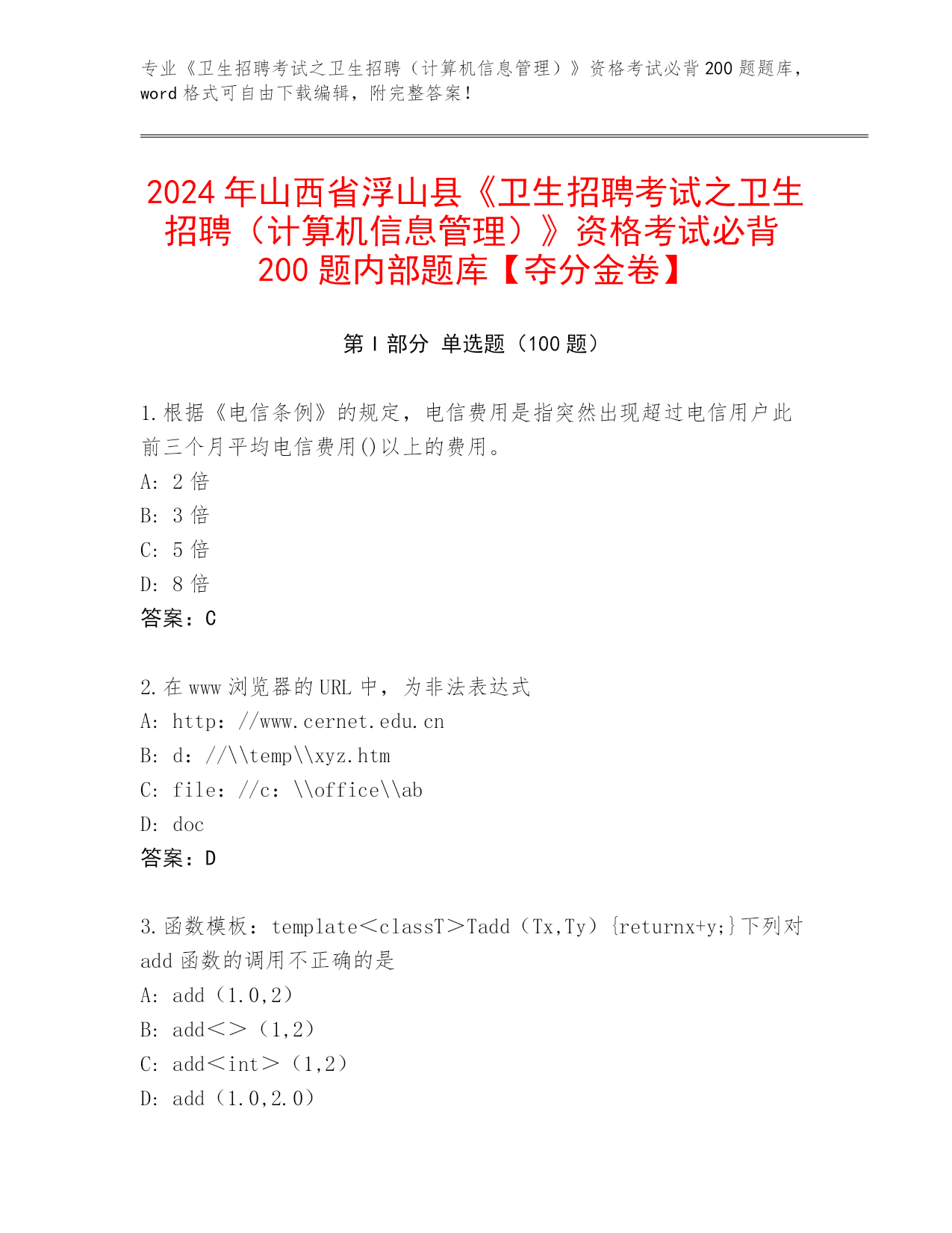 2024年山西省浮山县《卫生招聘考试之卫生招聘(计算机信息管理)》资格考试必背200题内部题库【夺分金卷】