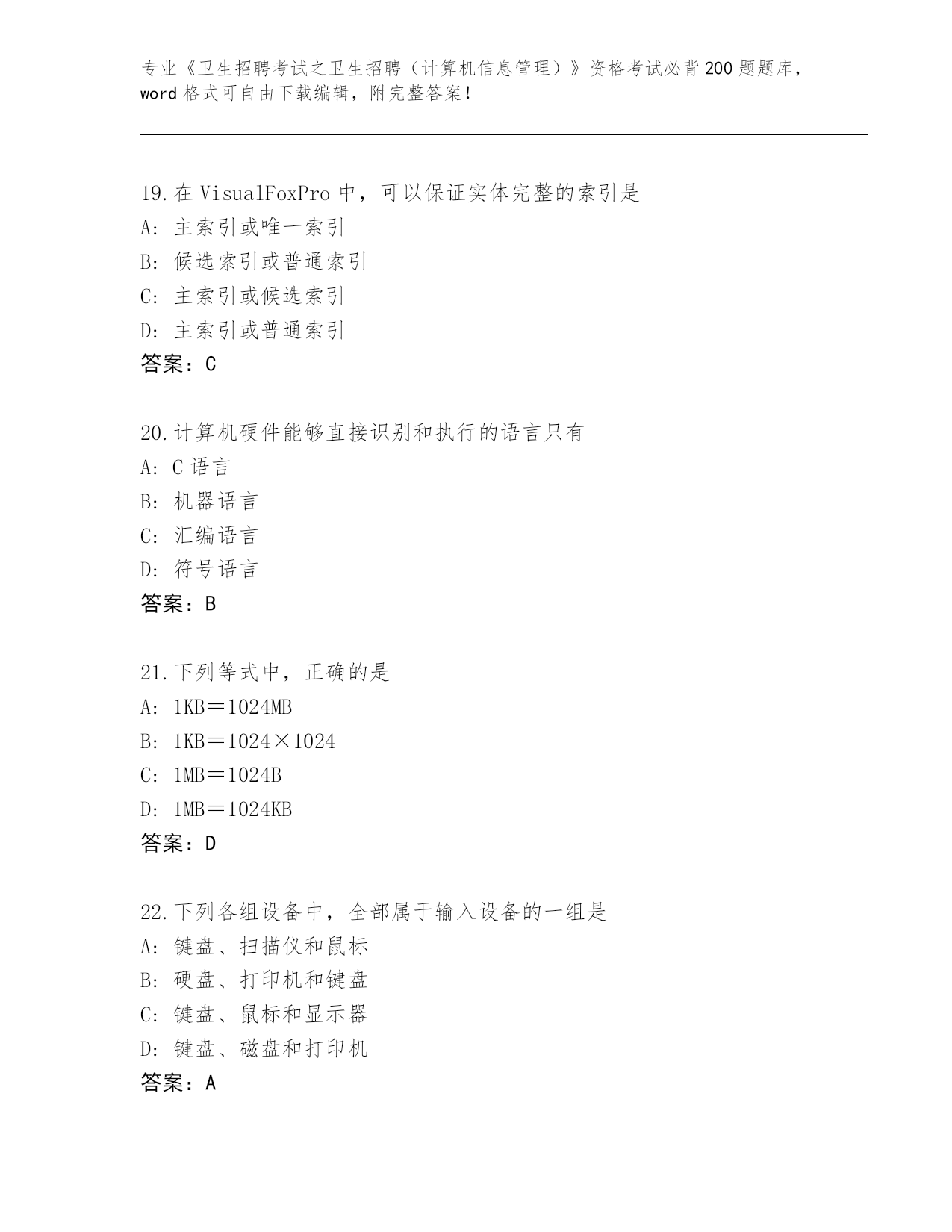 山西省河曲县《卫生招聘考试之卫生招聘(计算机信息管理)》资格考试必背200题大全【夺分金卷】
