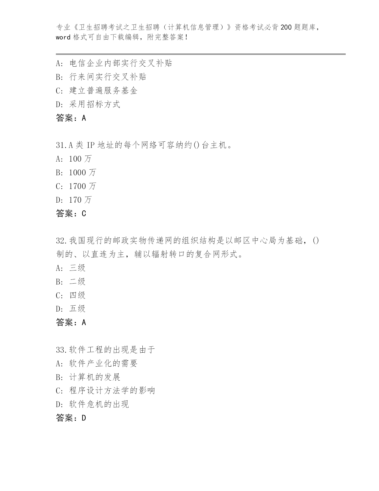 内部使用甘肃省《卫生招聘考试之卫生招聘(计算机信息管理)》考试必背200题真题【夺分金卷】
