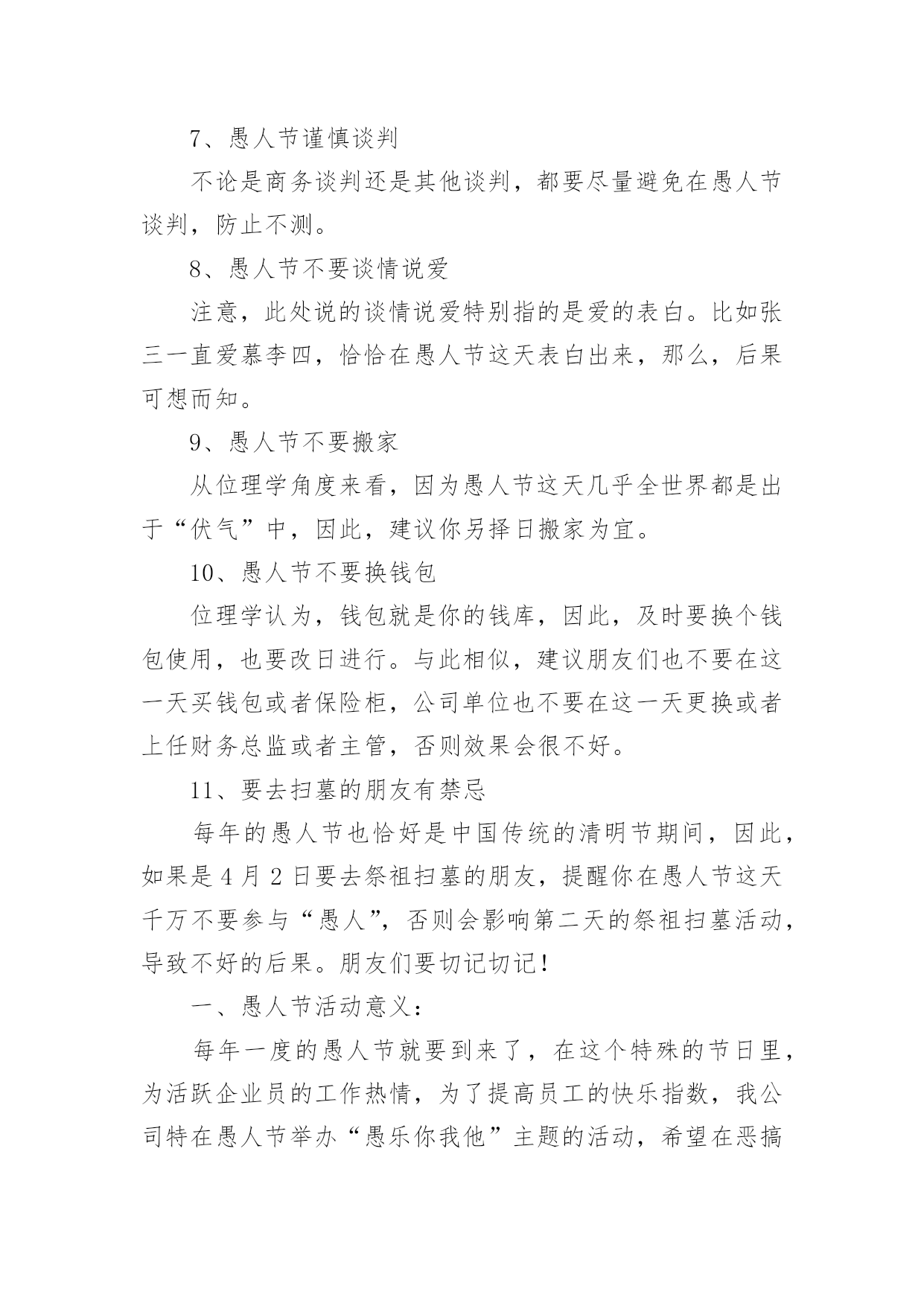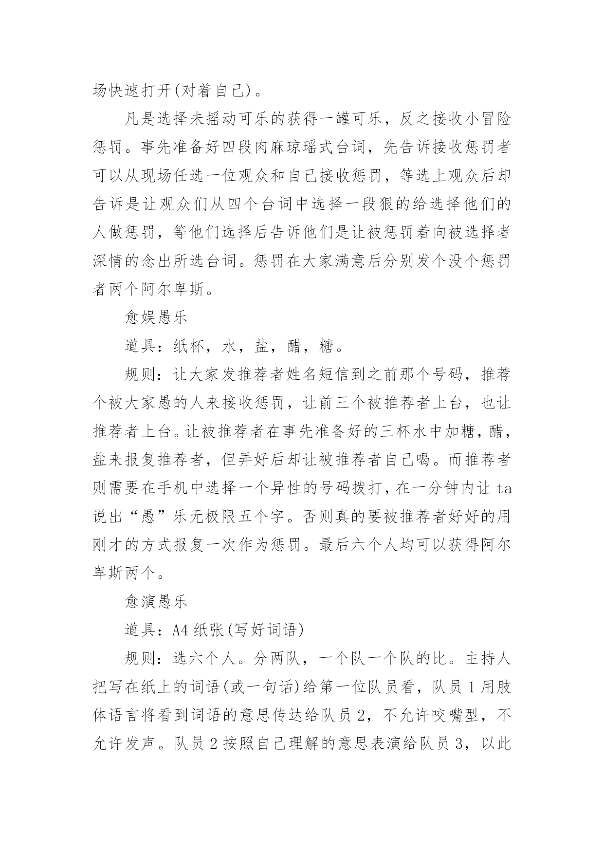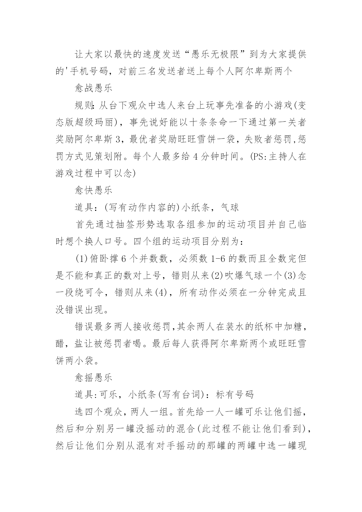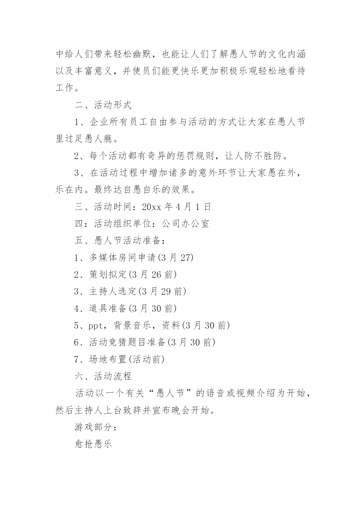 愚人节活动方案愚人节活动方案合集15篇为了确保事情或工作能无误进行,就常常需要事先准备方案,方案指的是为某一次行动所制定的计划类文书。优秀的方案都具备一些什么特点呢?以下是小编收集整理的愚人节活动方案,仅供参考,欢迎大家阅读。愚人节活动方案11、愚人节愚人时间上有禁忌无论什么人,愚人节这天玩笑只能开到中午12点之前,这是约定俗成的严格规矩。过了中午还找乐子的人是一个比被他取笑的人还大的傻瓜。过了钟点还开玩笑的人会立刻碰钉子,自找没趣儿。朋友们或许都知道,过去什么情况下适合午时动作呢?许多电影都有类似描述:“午时时辰已到——”云云。实际上,从中国的传统风水位理学角度来看,下午三点就不能恶作剧。因此认为其实在下午三点之前都不为过。如果某位朋友忽视了愚人节有时间禁忌,不管不顾一意孤行,那么,相信他或她此后的运势会一落千丈。朋友们务必谨慎,首先在时间上要把握好,千万不能玩过头。2、愚人节不能开过头的玩笑比如张三通知李四,说王二出了车祸,赶紧到某某医院等等。这种愚人方式会给双方都带来运势上的差错,导致健康事业情感都会出问题。3、愚人节不能开政治玩笑或恐怖玩笑举例:当每个人在愚人节都小心翼翼提防他人的做弄时,美国俄亥俄州Portage县的市民却因为5名少女策划的愚人节玩笑搞得全城惊恐不安。某年愚人节早晨,Portage县危险物品与炸弹调查局收到来自Ravenna市区紧急报告,称在Ravenna市区的西大街圣母教堂、Portage县法院、里德纪念图书馆,Ravenna中学等处发现了17个可疑的包裹:这些包裹均为正方形,用金色包装纸包装格外醒目。这些可疑的包裹让当地居民莫名惊恐。经过调查这些可疑的包裹是由5名十六七岁的少女制作和放置。这5名少女称这些包裹的制作方法是从一家网站上得知的。4、愚人节谨慎许愿不论许什么愿,也不论在那儿许愿,都建议你尽量都要避开这天去许愿。5、愚人节不要送礼物不管出于什么原因,都要谨慎在愚人节送礼,否则就不是“礼轻意重”了。如果你在愚人节送了贵重礼品,则更是错上加错。6、愚人节不要过生日如果有人恰巧是4月1日生日,那么,也要避开愚人节过生日。建议你:一是错开时间,比如3月底或者4月2日过生日,要没将你出生那年的公历4月1日换算成农历,以农历为准来过生日。7、愚人节谨慎谈判不论是商务谈判还是其他谈判,都要尽量避免在愚人节谈判,防止不测。8、愚人节不要谈情说爱注意,此处说的谈情说爱特别指的是爱的表白。比如张三一直爱慕李四,恰恰在愚人节这天表白出来,那么,后果可想而知。9、愚人节不要搬家从位理学角度来看,因为愚人节这天几乎全世界都是出于“伏气”中,因此,建议你另择日搬家为宜。10、愚人节不要换钱包位理学认为,钱包就是你的钱库,因此,及时要换个钱包使用,也要改日进行。与此相似,建议朋友们也不要在这一天买钱包或者保险柜,公司单位也不要在这一天更换或者上任财务总监或者主管,否则效果会很不好。11、要去扫墓的朋友有禁忌每年的愚人节也恰好是中国传统的清明节期间,因此,如果是4月2日要去祭祖扫墓的朋友,提醒你在愚人节这天千万不要参与“愚人”,否则会影响第二天的祭祖扫墓活动,导致不好的后果。朋友们要切记切记!一、愚人节活动意义:每年一度的愚人节就要到来了,在这个特殊的节日里,为活跃企业员的工作热情,为了提高员工的快乐指数,我公司特在愚人节举办“愚乐你我他”主题的活动,希望在恶搞中给人们带来轻松幽默,也能让人们了解愚人节的文化内涵以及丰富意义,并使员们能更快乐更加积极乐观轻松地看待工作。二、活动形式1、企业所有员工自由参与活动的方式让大家在愚人节里过足愚人瘾。2、每个活动都有奇异的惩罚规则,让人防不胜防。3、在活动过程中增加诸多的意外环节让大家愚在外,乐在内。最终达自愚自乐的效果。三、活动时间:20xx年4月1日四:活动组织单位:公司办公室五、愚人节活动准备:1、多媒体房间申请(3月27)2、策划拟定(3月26前)3、主持人选定(3月29前)4、道具准备(3月30前)5、ppt,背景音乐,资料(3月30前)6、活动竞猜题目准备(3月30前)7、场地布置(活动前)六、活动流程活动以一个有关“愚人节”的语音或视频介绍为开始,然后主持人上台致辞并宣布晚会开始。游戏部分:愈抢愚乐让大家以最快的速度发送“愚乐无极限”到为大家提供的'手机号码,对前三名发送者送上每个人阿尔卑斯两个愈战愚乐规则:从台下观众中选人来台上玩事先准备的小游戏(变态版超级玛丽),事先说好能以十条条命一下通过第一关者奖励阿尔卑斯3,最优者奖励旺旺雪饼一袋,失败者惩罚,惩罚方式见策划附。每个人最多给4分钟时间。(PS:主持人在游戏过程中可以念)愈快愚乐道具:(写有动作内容的)小纸条,气球首先通过抽签形势选取各组参加的运动项目并自己临时想个换人口号。四个组的运动项目分别为:(1)