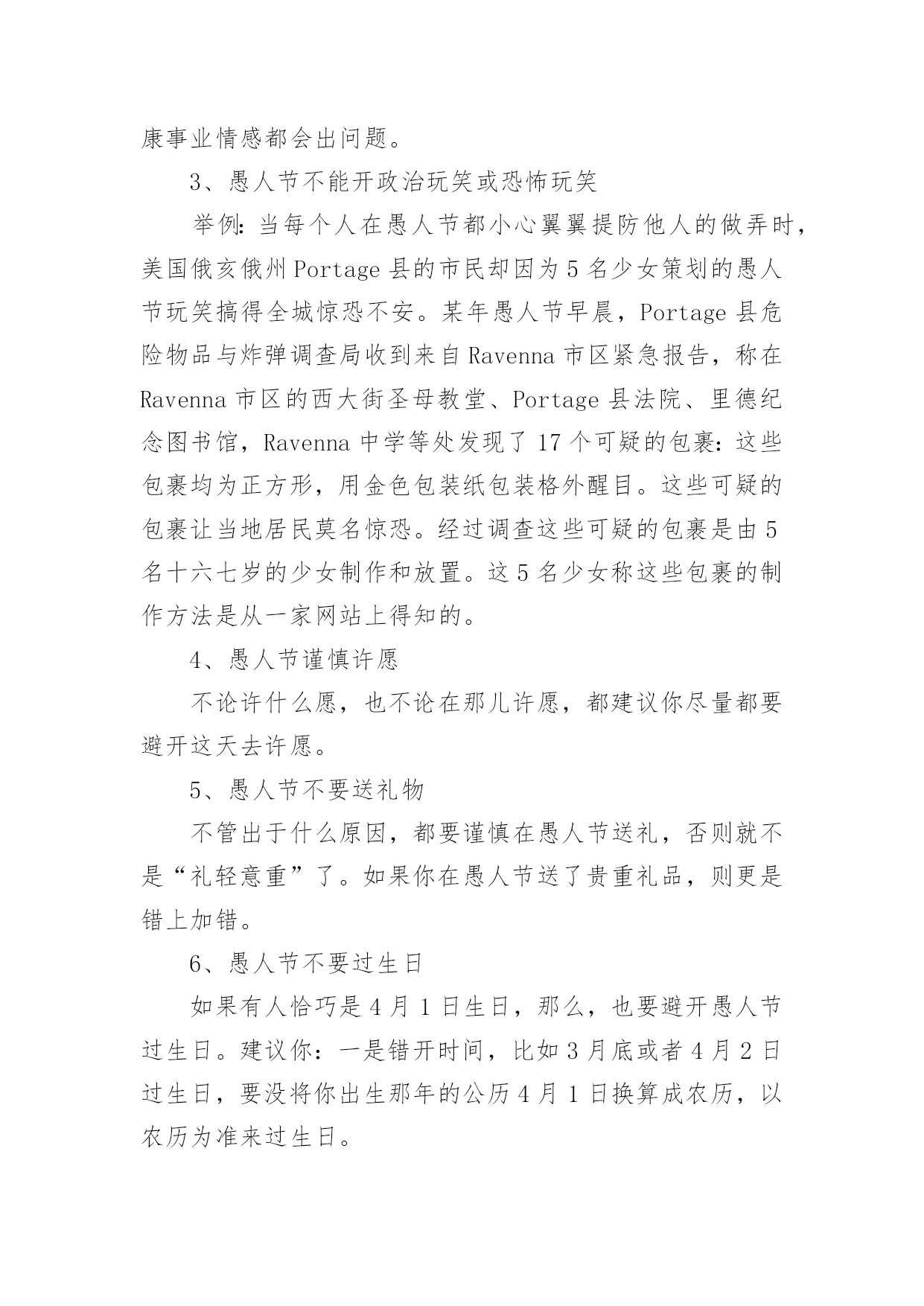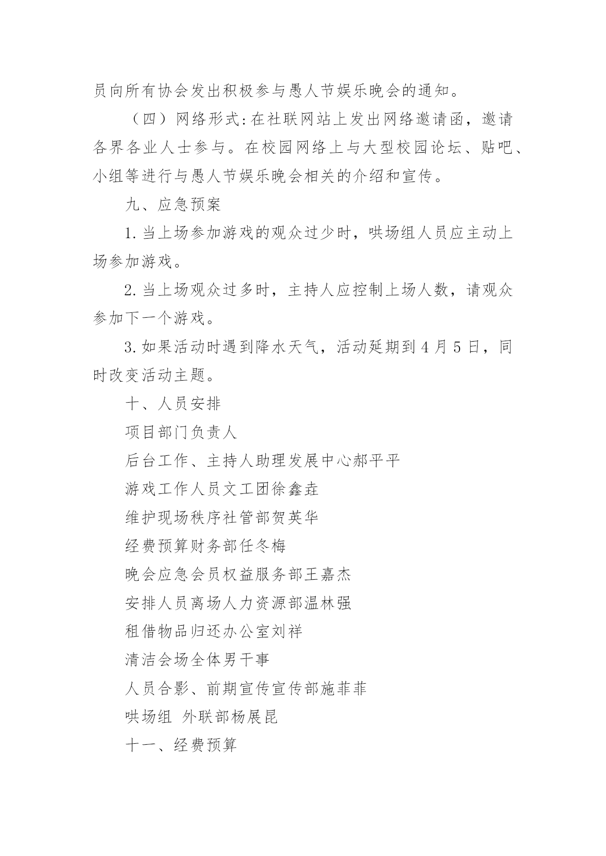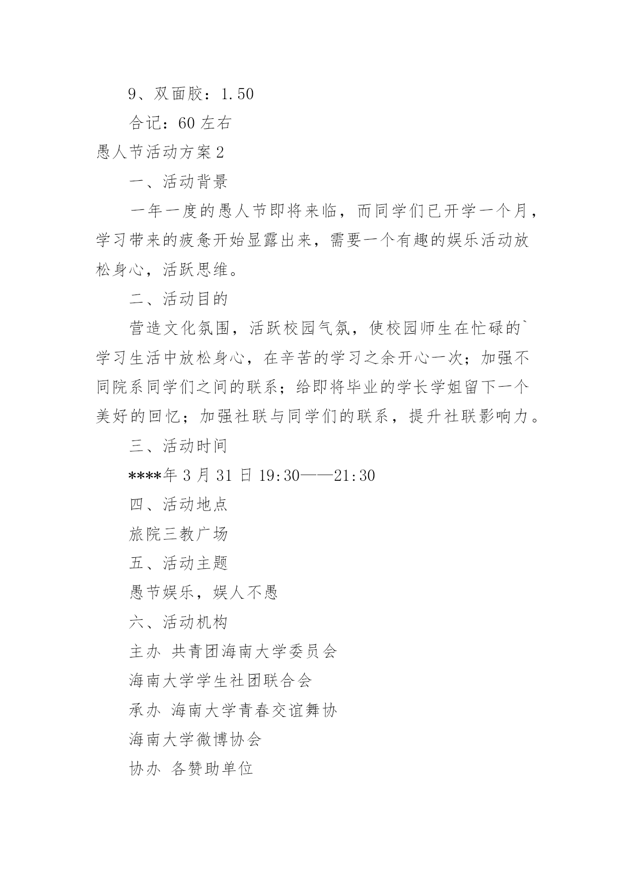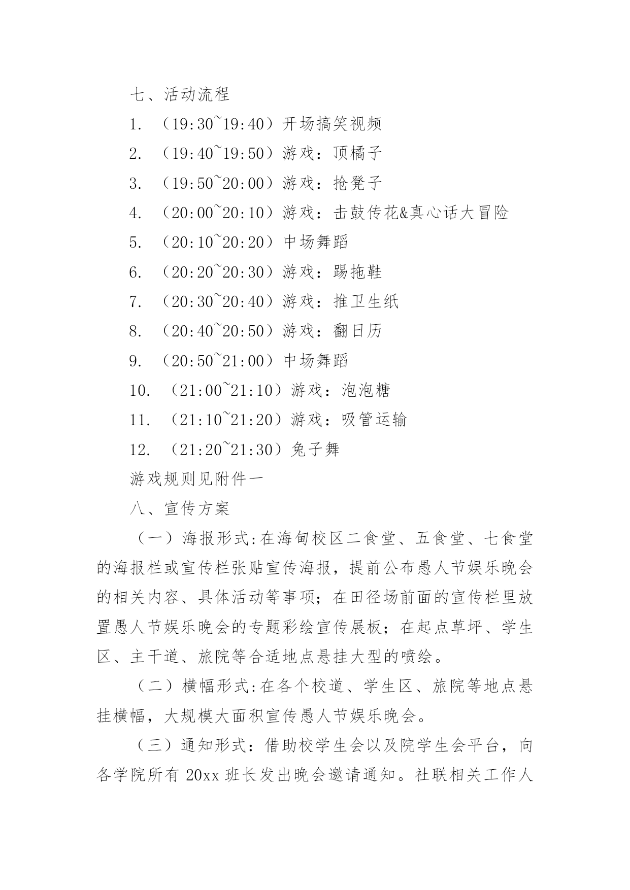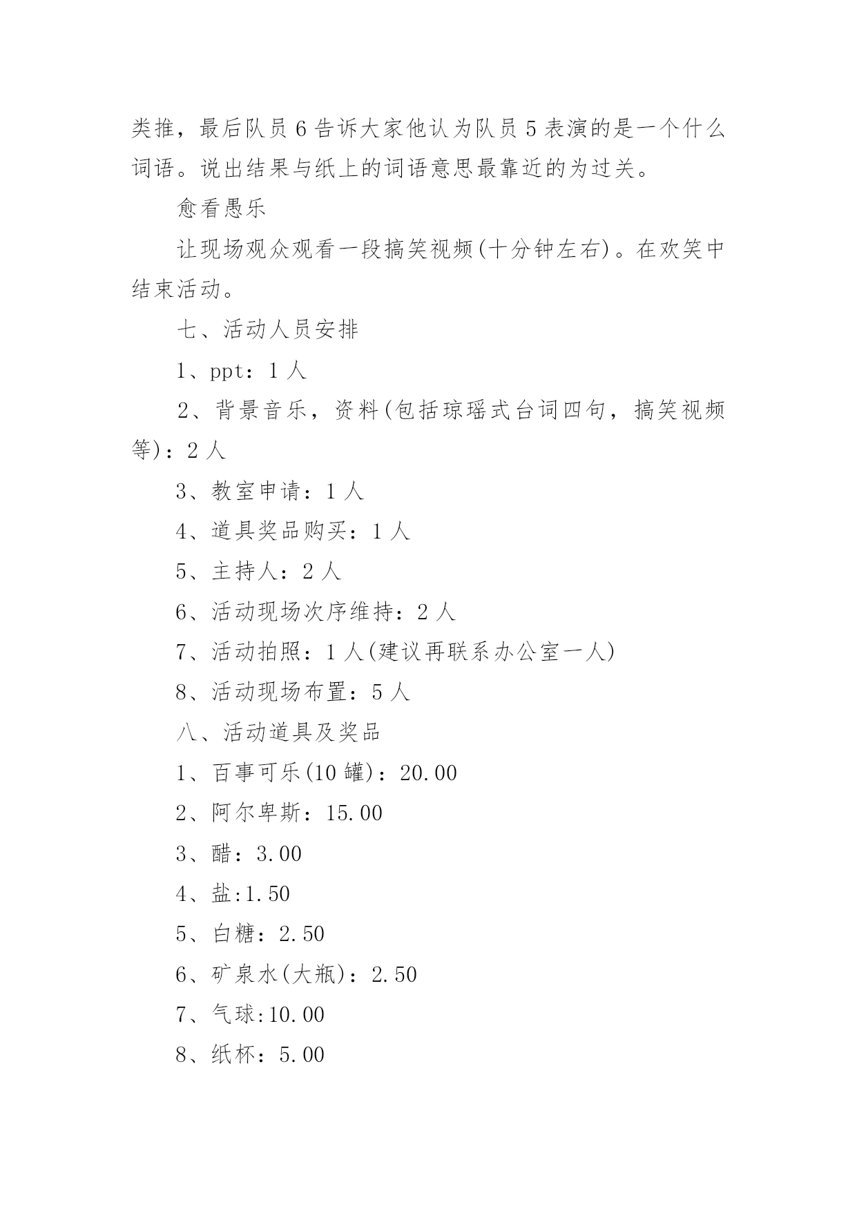 愚人节活动方案愚人节活动方案合集15篇为了确保事情或工作能无误进行,就常常需要事先准备方案,方案指的是为某一次行动所制定的计划类文书。优秀的方案都具备一些什么特点呢?以下是小编收集整理的愚人节活动方案,仅供参考,欢迎大家阅读。愚人节活动方案11、愚人节愚人时间上有禁忌无论什么人,愚人节这天玩笑只能开到中午12点之前,这是约定俗成的严格规矩。过了中午还找乐子的人是一个比被他取笑的人还大的傻瓜。过了钟点还开玩笑的人会立刻碰钉子,自找没趣儿。朋友们或许都知道,过去什么情况下适合午时动作呢?许多电影都有类似描述:“午时时辰已到——”云云。实际上,从中国的传统风水位理学角度来看,下午三点就不能恶作剧。因此认为其实在下午三点之前都不为过。如果某位朋友忽视了愚人节有时间禁忌,不管不顾一意孤行,那么,相信他或她此后的运势会一落千丈。朋友们务必谨慎,首先在时间上要把握好,千万不能玩过头。2、愚人节不能开过头的玩笑比如张三通知李四,说王二出了车祸,赶紧到某某医院等等。这种愚人方式会给双方都带来运势上的差错,导致健康事业情感都会出问题。3、愚人节不能开政治玩笑或恐怖玩笑举例:当每个人在愚人节都小心翼翼提防他人的做弄时,美国俄亥俄州Portage县的市民却因为5名少女策划的愚人节玩笑搞得全城惊恐不安。某年愚人节早晨,Portage县危险物品与炸弹调查局收到来自Ravenna市区紧急报告,称在Ravenna市区的西大街圣母教堂、Portage县法院、里德纪念图书馆,Ravenna中学等处发现了17个可疑的包裹:这些包裹均为正方形,用金色包装纸包装格外醒目。这些可疑的包裹让当地居民莫名惊恐。经过调查这些可疑的包裹是由5名十六七岁的少女制作和放置。这5名少女称这些包裹的制作方法是从一家网站上得知的。4、愚人节谨慎许愿不论许什么愿,也不论在那儿许愿,都建议你尽量都要避开这天去许愿。5、愚人节不要送礼物不管出于什么原因,都要谨慎在愚人节送礼,否则就不是“礼轻意重”了。如果你在愚人节送了贵重礼品,则更是错上加错。6、愚人节不要过生日如果有人恰巧是4月1日生日,那么,也要避开愚人节过生日。建议你:一是错开时间,比如3月底或者4月2日过生日,要没将你出生那年的公历4月1日换算成农历,以农历为准来过生日。7、愚人节谨慎谈判不论是商务谈判还是其他谈判,都要尽量避免在愚人节谈判,防止不测。8、愚人节不要谈情说爱注意,此处说的谈情说爱特别指的是爱的表白。比如张三一直爱慕李四,恰恰在愚人节这天表白出来,那么,后果可想而知。9、愚人节不要搬家从位理学角度来看,因为愚人节这天几乎全世界都是出于“伏气”中,因此,建议你另择日搬家为宜。10、愚人节不要换钱包位理学认为,钱包就是你的钱库,因此,及时要换个钱包使用,也要改日进行。与此相似,建议朋友们也不要在这一天买钱包或者保险柜,公司单位也不要在这一天更换或者上任财务总监或者主管,否则效果会很不好。11、要去扫墓的朋友有禁忌每年的愚人节也恰好是中国传统的清明节期间,因此,如果是4月2日要去祭祖扫墓的朋友,提醒你在愚人节这天千万不要参与“愚人”,否则会影响第二天的祭祖扫墓活动,导致不好的后果。朋友们要切记切记!一、愚人节活动意义:每年一度的愚人节就要到来了,在这个特殊的节日里,为活跃企业员的工作热情,为了提高员工的快乐指数,我公司特在愚人节举办“愚乐你我他”主题的活动,希望在恶搞中给人们带来轻松幽默,也能让人们了解愚人节的文化内涵以及丰富意义,并使员们能更快乐更加积极乐观轻松地看待工作。二、活动形式1、企业所有员工自由参与活动的方式让大家在愚人节里过足愚人瘾。2、每个活动都有奇异的惩罚规则,让人防不胜防。3、在活动过程中增加诸多的意外环节让大家愚在外,乐在内。最终达自愚自乐的效果。三、活动时间:20xx年4月1日四:活动组织单位:公司办公室五、愚人节活动准备:1、多媒体房间申请(3月27)2、策划拟定(3月26前)3、主持人选定(3月29前)4、道具准备(3月30前)5、ppt,背景音乐,资料(3月30前)6、活动竞猜题目准备(3月30前)7、场地布置(活动前)六、活动流程活动以一个有关“愚人节”的语音或视频介绍为开始,然后主持人上台致辞并宣布晚会开始。游戏部分:愈抢愚乐让大家以最快的速度发送“愚乐无极限”到为大家提供的'手机号码,对前三名发送者送上每个人阿尔卑斯两个愈战愚乐规则:从台下观众中选人来台上玩事先准备的小游戏(变态版超级玛丽),事先说好能以十条条命一下通过第一关者奖励阿尔卑斯3,最优者奖励旺旺雪饼一袋,失败者惩罚,惩罚方式见策划附。每个人最多给4分钟时间。(PS:主持人在游戏过程中可以念)愈快愚乐道具:(写有动作内容的)小纸条,气球首先通过抽签形势选取各组参加的运动项目并自己临时想个换人口号。四个组的运动项目分别为:(1)