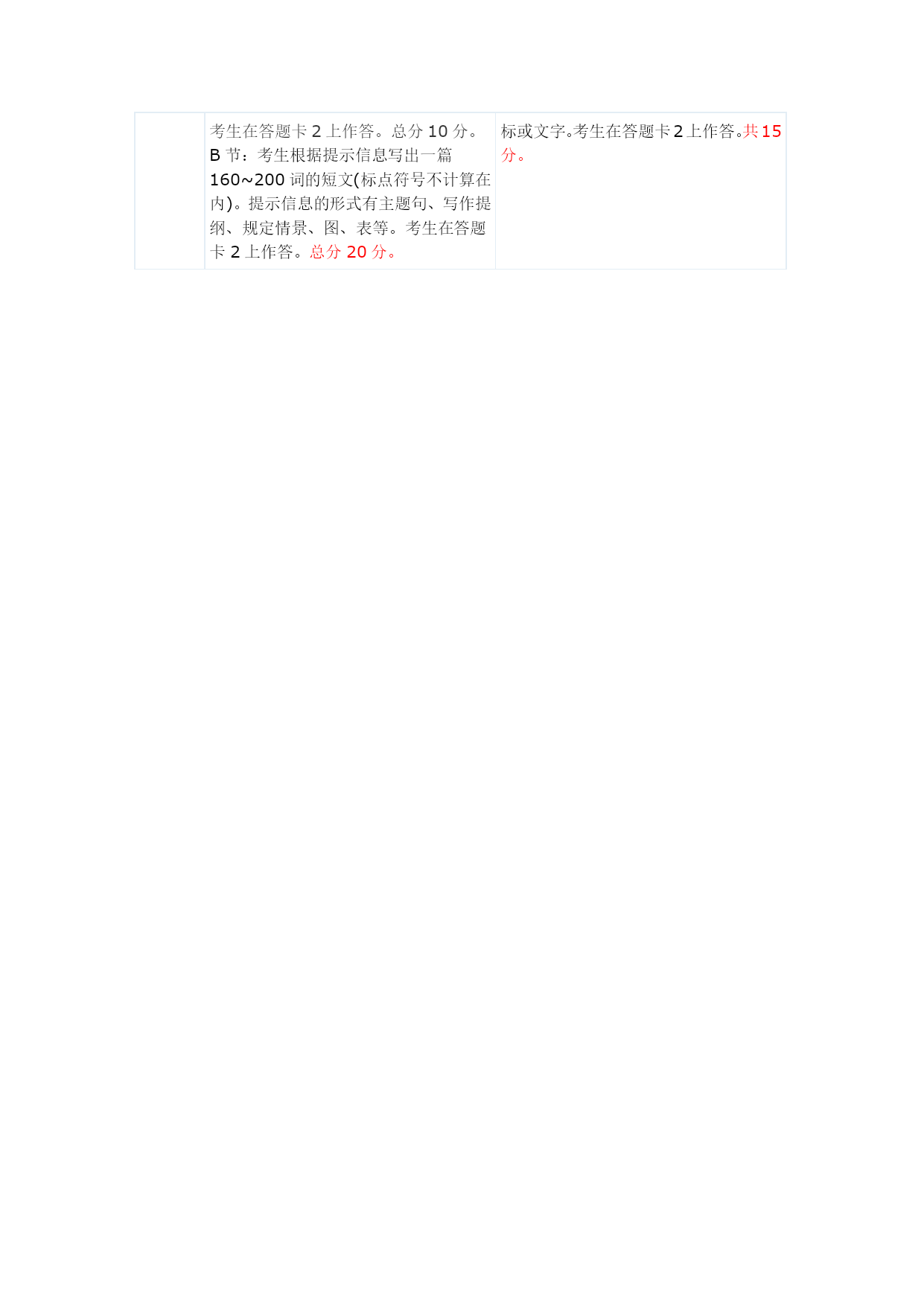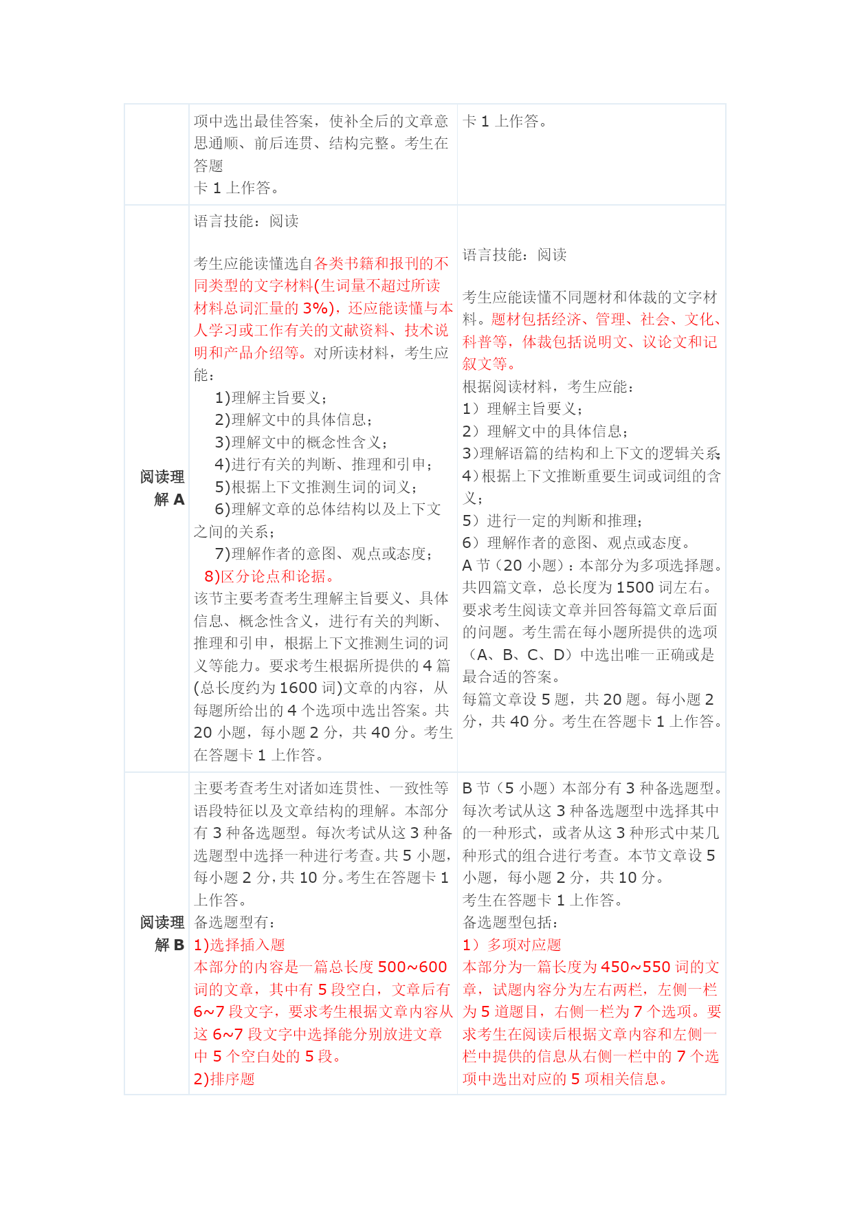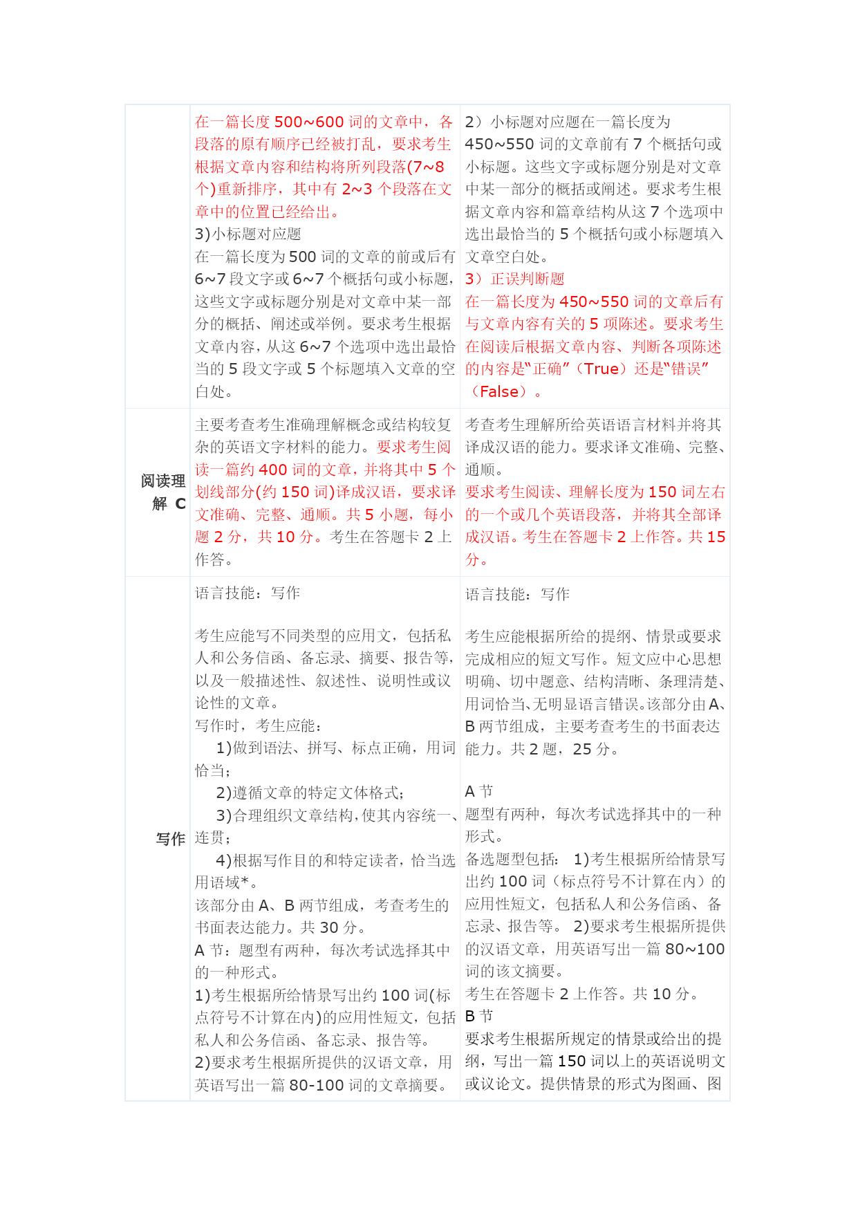 研究生考试英语(一)、英语(二)的区别题型《2011年全国硕士研究生入学统一考试英语(一)考试大纲》《2011年全国硕士研究生入学统一考试英语(二)考试大纲》词汇考生应能掌握5500左右的词汇以及相关词组。除掌握词汇的基本含义外,考生还应掌握词汇之间的词义关系,如同义词、近义词、反义词等;掌握词汇之间的搭配关系,如动词与介词,形容词与介词,形容词与名词等;掌握词汇生产的基本知识,如词源、词根、词缀等。英语语言的演化是一个世界范围内的动态发展过程,它受到科技发展和社会进步的影响。这意味着需要对本大纲词汇表不断进行研究和定期的修订。此外,全国硕士研究生入学英语统一考试是为非英语专业考生设置的。考虑到交际的需要,考生还应自行掌握与本人工作或专业相关的词汇,以及涉及个人好恶、生活习惯、宗教信仰等方面的词汇。考生应能较熟练地掌握5500个左右常用英语词汇以及相关常用词组。考生应能根据具体语境、句子结构或上下文理解一些非常用词的词义。语法考生应能熟练地运用基本的语法知识。本大纲没有专门列出对语法知识的具体要求,其目的是鼓励考生用听、说、读、写的实践代替单纯的语法知识学习,以求考生在交际中更准确、自如地运用语法知识。考生应能熟练地运用基本的语法知识,其中包括:(1)名词、代词的数和格的构成及其用法;(2)动词时态、语态的构成及其用法;(3)形容词与副词的比较级和最高级的构成及其用法;(4)常用连接词的词义及其用法;(5)非谓语动词(不定式、动名词、分词)的构成及其用法;(6)虚拟语气的构成及其用法;(7)各类从句(定语从句、主语从句、表语从句等)及强调句型的结构及其用法;(8)倒装句、插入语的结构及其用法。英语知识运用该部分不仅考查考生对不同语境中规范的语言要素(包括词汇、表达方式和结构)的掌握程度,而且还考查考生对语段特征(如连贯性和一致性等)的辨识能力等。共20小题,每小题0.5分,共10分。在一篇240~280词的文章中留出20个空白,要求考生从每题给出的4个选项中选出最佳答案,使补全后的文章意思通顺、前后连贯、结构完整。考生在答题卡1上作答。主要考查考生对英语知识的综合运用能力。共20小题,每小题0.5分,共10分。在一篇约350词的文章中留出20个空白,要求考生从每题给出的4个选项中选出最佳答案,使补全后的文章意思通顺、前后连贯、结构完整。考生在答题卡1上作答。阅读理解A语言技能:阅读考生应能读懂选自各类书籍和报刊的不同类型的文字材料(生词量不超过所读材料总词汇量的3%),还应能读懂与本人学习或工作有关的文献资料、技术说明和产品介绍等。对所读材料,考生应能:1)理解主旨要义;2)理解文中的具体信息;3)理解文中的概念性含义;4)进行有关的判断、推理和引申;5)根据上下文推测生词的词义;6)理解文章的总体结构以及上下文之间的关系;7)理解作者的意图、观点或态度;8)区分论点和论据。该节主要考查考生理解主旨要义、具体信息、概念性含义,进行有关的判断、推理和引申,根据上下文推测生词的词义等能力。要求考生根据所提供的4篇(总长度约为1600词)文章的内容,从每题所给出的4个选项中选出答案。共20小题,每小题2分,共40分。考生在答题卡1上作答。语言技能:阅读考生应能读懂不同题材和体裁的文字材料。题材包括经济、管理、社会、文化、科普等,体裁包括说明文、议论文和记叙文等。根据阅读材料,考生应能:1)理解主旨要义;2)理解文中的具体信息;3)理解语篇的结构和上下文的逻辑关系;4)根据上下文推断重要生词或词组的含义;5)进行一定的判断和推理;6)理解作者的意图、观点或态度。A节(20小题):本部分为多项选择题。共四篇文章,总长度为1500词左右。要求考生阅读文章并回答每篇文章后面的问题。考生需在每小题所提供的选项(A、B、C、D)中选出唯一正确或是最合适的答案。每篇文章设5题,共20题。每小题2分,共40分。考生在答题卡1上作答。阅读理解B主要考查考生对诸如连贯性、一致性等语段特征以及文章结构的理解。本部分有3种备选题型。每次考试从这3种备选题型中选择一种进行考查。共5小题,每小题2分,共10分。考生在答题卡1上作答。备选题型有:1)选择插入题本部分的内容是一篇总长度500~600词的文章,其中有5段空白,文章后有6~7段文字,要求考生根据文章内容从这6~7段文字中选择能分别放进文章中5个空白处的5段。2)排序题在一篇长度500~600词的文章中,各段落的原有顺序已经被打乱,要求考生根据文章内容和结构将所列段落(7~8个)重新排序,其中有2~3个段落在文章中的位置已经给出。3)小标题对应题在一篇长度为500词的文章的前或后有6~7段文字或6~7个概括句或小标题,这些文字或标题分别是对文章中某一部分的概括、阐述或举例。要求考生根据文章内容,从这