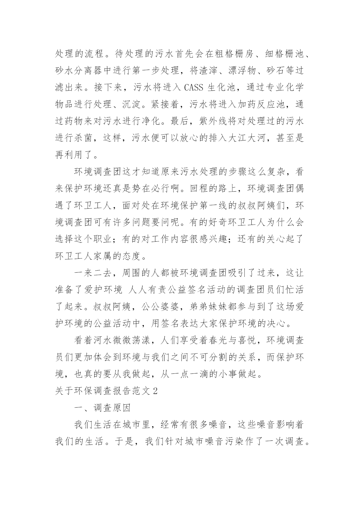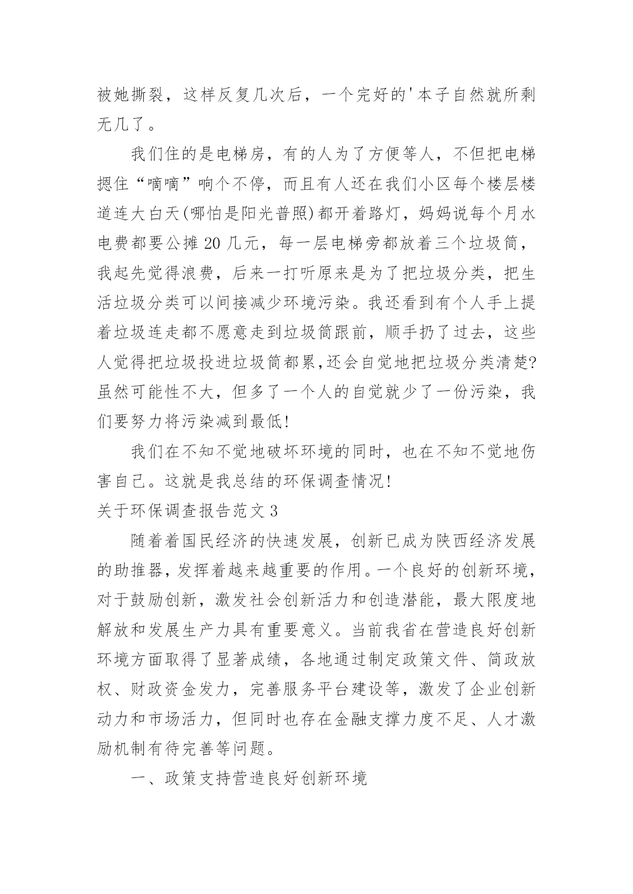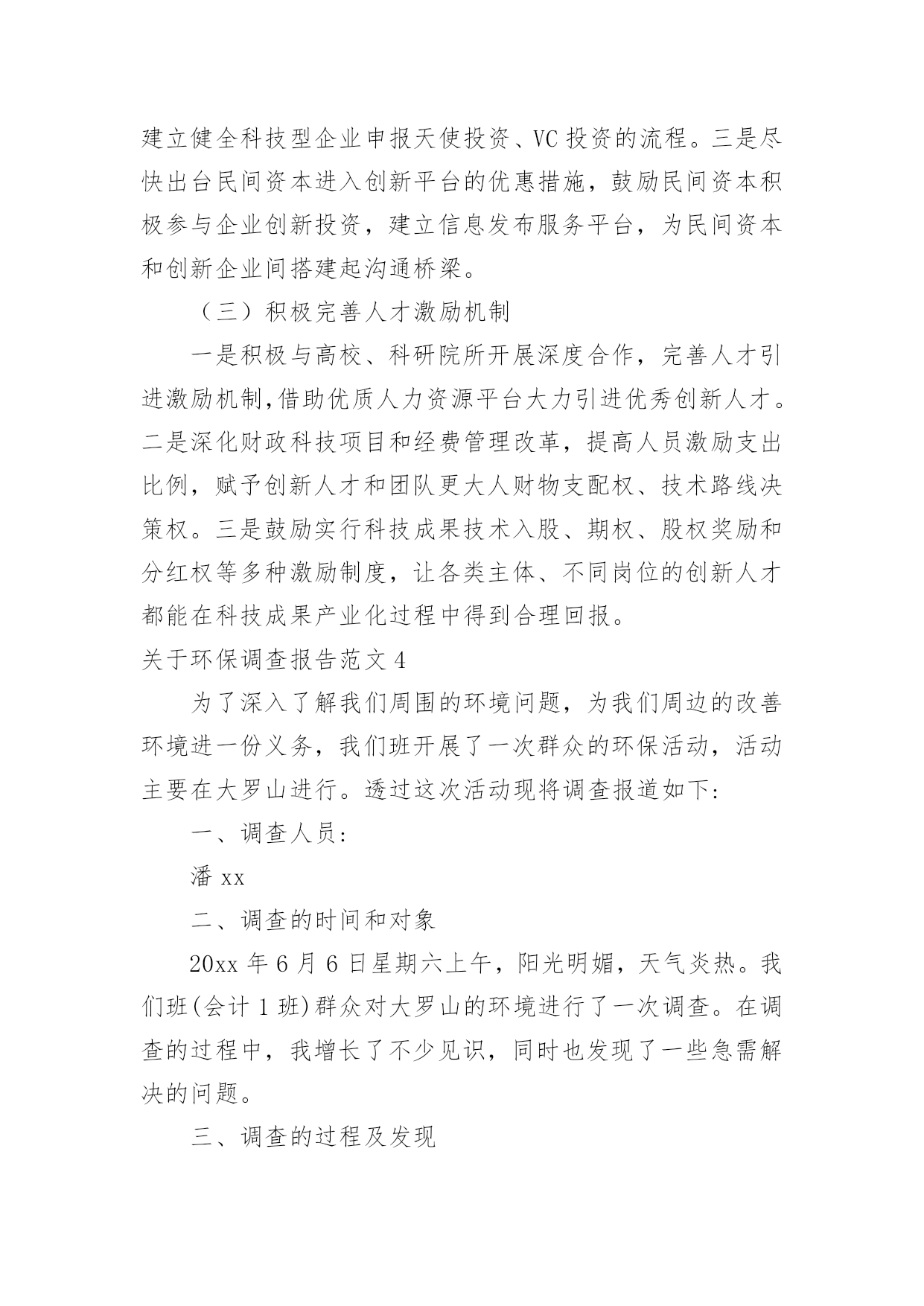 环保调查报告关于环保调查报告范文在不断进步的时代,报告不再是罕见的东西,报告具有成文事后性的特点。我们应当如何写报告呢?以下是小编整理的关于环保调查报告范文,欢迎大家借鉴与参考,希望对大家有所帮助。关于环保调查报告范文1山川、海洋、森林、湖泊,不同的地域,造就了绝无仅有的美景。但随着时代的发展,经济的扩张,越来越多的美景消失不见,也有越来越多的人为了美景的重现努力着。为了探寻这背后的故事,三年级十班的环境调查员们走出校园,目击环境污染的现场,见证改善环境的决心,聆听环卫工人的心声,感受环境与人类的相融。走在河边,油菜花在风中摇摆,美丽动人,但更加吸引环境调查团眼球的还是水面上不时漂浮的垃圾,污水的注入也让河流失去了原有的清澈。看到这样对比强烈的.场景,环境调查员们不禁思考了起来,河里的垃圾从何而来?排入大江大河的污水是否经过处理?这对周边的环境又造成了怎样的后果?接下来,环境调查团前往污水处理厂,了解污水如何处理甚至能够被再利用。污水处理厂的王厂长带着环境调查团了解了整个污水处理的流程。待处理的污水首先会在粗格栅房、细格栅池、砂水分离器中进行第一步处理,将渣滓、漂浮物、砂石等过滤出来。接下来,污水将进入CASS生化池,通过专业化学物品进行处理、沉淀。紧接着,污水将进入加药反应池,通过药物来对污水进行净化。最后,紫外线将对处理过的污水进行杀菌,这样,污水便可以放心的排入大江大河,甚至是再利用了。环境调查团这才知道原来污水处理的步骤这么复杂,看来保护环境还真是势在必行啊。回程的路上,环境调查团偶遇了环卫工人,面对处在环境保护第一线的叔叔阿姨们,环境调查团可有许多问题要问呢。有的好奇环卫工人为什么会选择这个职业;有的对工作内容很感兴趣;还有的关心起了环卫工人家属的态度。一来二去,周围的人都被环境调查团吸引了过来,这让准备了爱护环境人人有责公益签名活动的调查团员们忙活了起来。叔叔阿姨,公公婆婆,弟弟妹妹都参与到了这场爱护环境的公益活动中,用签名表达大家保护环境的决心。看着河水微微荡漾,人们享受着春光与喜悦,环境调查员们更加体会到环境与我们之间不可分割的关系,而保护环境,也真的要从我做起,从一点一滴的小事做起。关于环保调查报告范文2一、调查原因我们生活在城市里,经常有很多噪音,这些噪音影响着我们的生活。于是,我们针对城市噪音污染作了一次调查。二、调查方法1.向身边的人询问是否经常受噪音的影响,有没有干扰正常生活。2.感受城市噪音给我们的生活带来的影响。3、通过网络了解城市噪音给我们的健康带来的危害。三、资料整理信息渠道涉及的方面具体内容访问同学噪音对生活的影响影响睡眠质量、正常学习到商场里、马路边亲身体验噪音对人体的影响轻微的噪音会让人觉得心烦,噪音较大,比如商场里播放的强劲音乐,让人耳朵痛、头昏脑涨。马路上的各种噪音不但影响听力,而且影响注意力的集中。环保调查报告篇生活中有很多地方需要我们留心观察,特别是生活中很多地方要我们来个环保小调查。我自己家里,妈妈总是把热水器一天到完开着,那些热水没用,过了一会冷了又会自动开起来,真是浪费电呀!我们家用水顶环保,也是把拖地板水冲进马桶。我妈妈看到我作业写的不好,就把纸揉成一团。有些纸上甚至没有写过一个字,却被她丢弃,被脚无情地践踏。本来是完好的本子,被她撕裂,这样反复几次后,一个完好的'本子自然就所剩无几了。我们住的是电梯房,有的人为了方便等人,不但把电梯摁住“嘀嘀”响个不停,而且有人还在我们小区每个楼层楼道连大白天(哪怕是阳光普照)都开着路灯,妈妈说每个月水电费都要公摊20几元,每一层电梯旁都放着三个垃圾筒,我起先觉得浪费,后来一打听原来是为了把垃圾分类,把生活垃圾分类可以间接减少环境污染。我还看到有个人手上提着垃圾连走都不愿意走到垃圾筒跟前,顺手扔了过去,这些人觉得把垃圾投进垃圾筒都累,还会自觉地把垃圾分类清楚?虽然可能性不大,但多了一个人的自觉就少了一份污染,我们要努力将污染减到最低!我们在不知不觉地破坏环境的同时,也在不知不觉地伤害自己。这就是我总结的环保调查情况!关于环保调查报告范文3随着着国民经济的快速发展,创新已成为陕西经济发展的助推器,发挥着越来越重要的作用。一个良好的创新环境,对于鼓励创新,激发社会创新活力和创造潜能,最大限度地解放和发展生产力具有重要意义。当前我省在营造良好创新环境方面取得了显著成绩,各地通过制定政策文件、简政放权、财政资金发力,完善服务平台建设等,激发了企业创新动力和市场活力,但同时也存在金融支撑力度不足、人才激励机制有待完善等问题。一、政策支持营造良好创新环境(一)实施顶层设计,提供政策支持实施创新驱动发展战略的关键步骤,就是加强顶层设计,近年来,全省各地为鼓励创新、推动发展,相继制定和出台了一系列政策文件,从顶层设计上,为营造良好创新环境提供实实在
