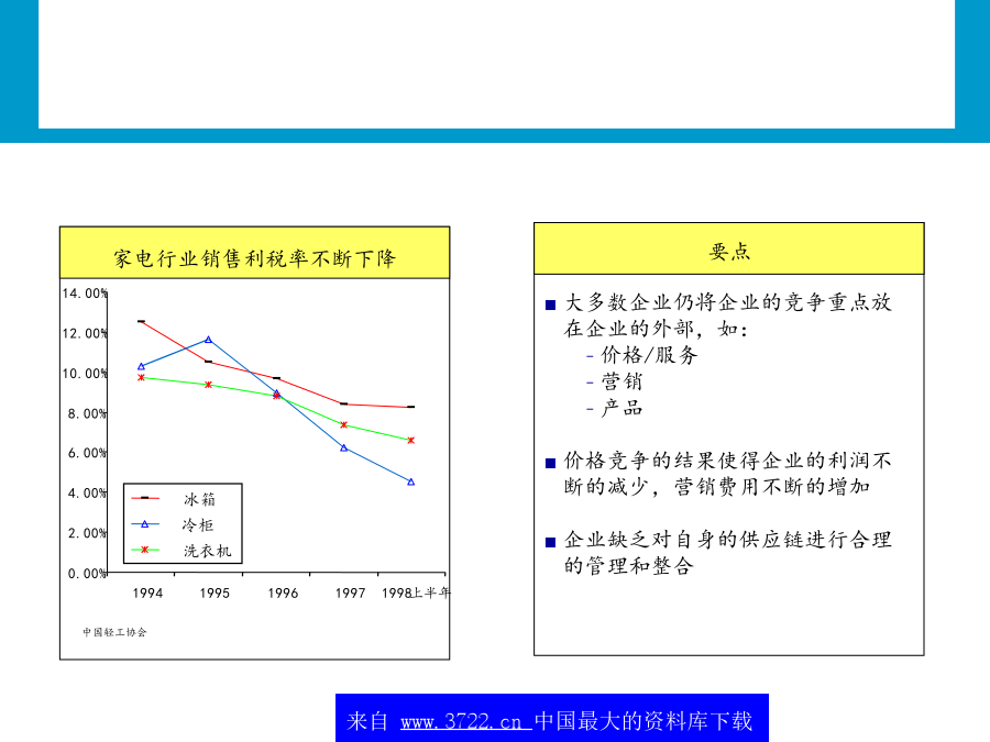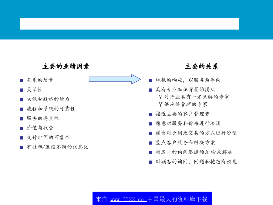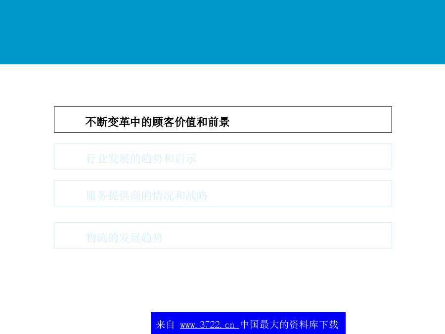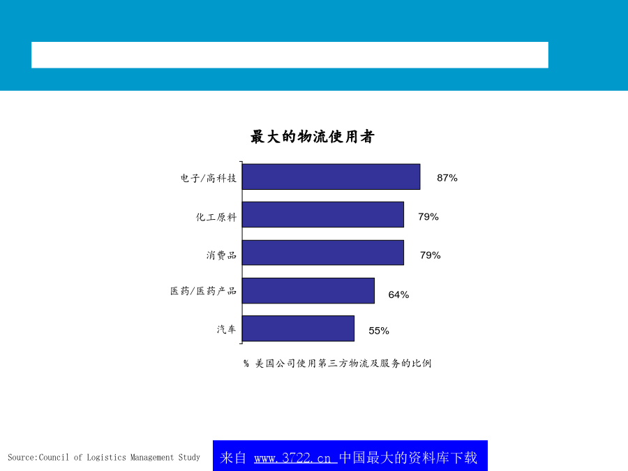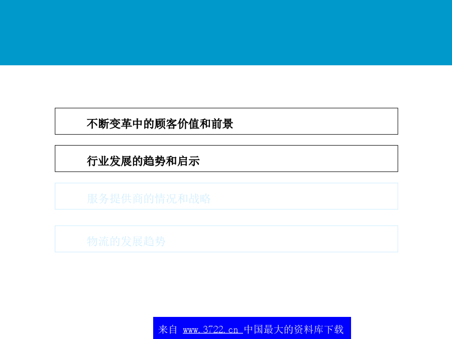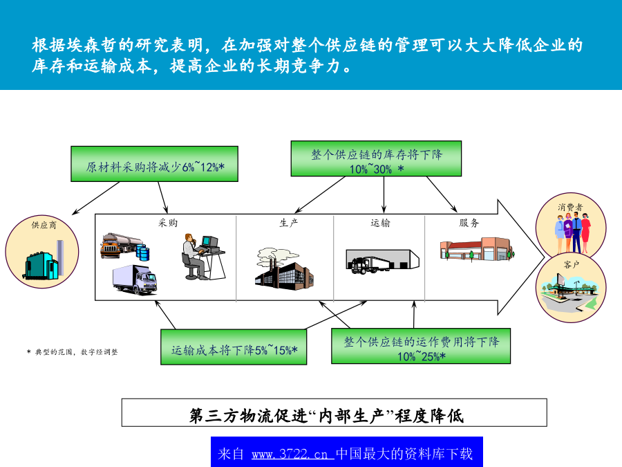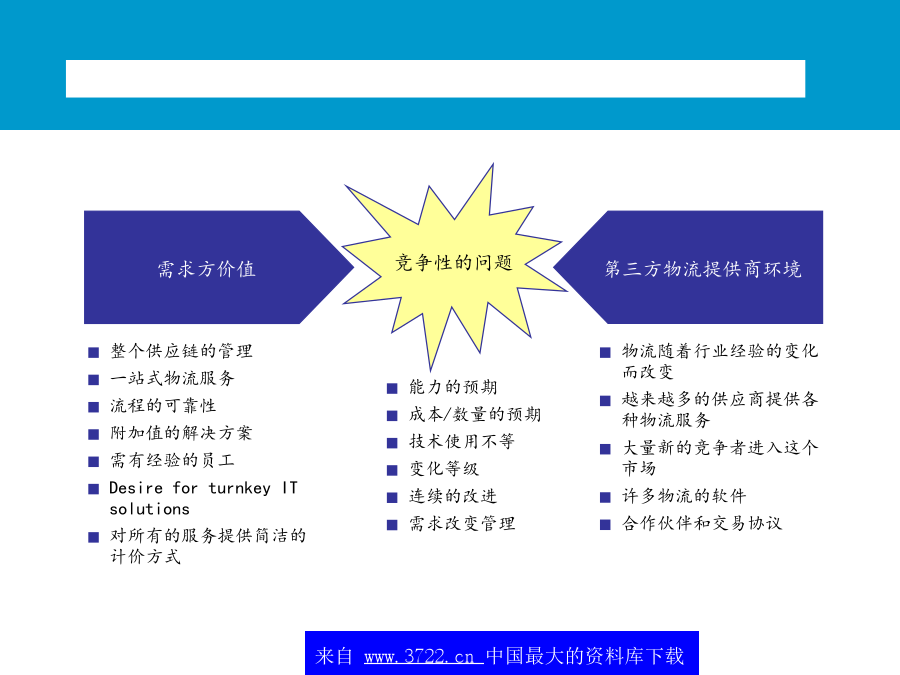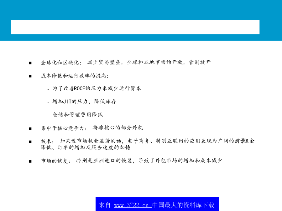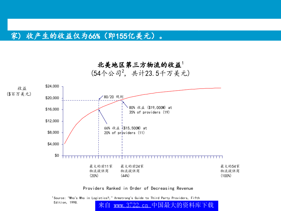 中国,青岛朱农飞经理2001年5月不断变革中的顾客价值和前景随着企业竞争的加剧,企业竞争的重点将从外部的价格竞争和服务竞争转向对内部成本的控制。*典型的范围,数字经调整全球化和区域化:减少贸易壁垒,全球和本地市场的开放,管制放开成本降低和运行效率的提高:为了改善ROCE的压力来减少运行资本增加JIT的压力,降低库存仓储和管理费用降低集中于核心竞争力:将非核心的部分外包技术:如果说市场机会显著的话,电子商务、特别互联网的应用表现为广阔的前景(租金降低、订单的增加及服务速度的加快)市场的恢复:特别是亚洲进口的恢复,导致了外包市场的增加和成本减少北美地区第三方物流的收益1(54个公司2,共计23.5千万美元)最大的物流使用者需求方价值主要的关系不断变革中的顾客价值和前景整个供应链的观点价值一些大型的3PL提供商在其自身能力的发展和新客户的发展方面正在变得越来越主动购并使得服务的地域越来越小物运代理和全球化运输能力将全球的仓库/分销企业连接起来为客户提供门到门的服务对某些功能性服务,例如运输,物流提供商利用自身的合作伙伴,提供全球性服务其他的功能服务商愿意与海外的具有相同核心竞争力的伙伴进行合作第三方物流的提供高必须更好地创造全球化根据核心竞争力来制定服务建立起一定的能力来为现有的客户服务提供相应的服务内容来为客户服务提供所有服务内容Notes:Companieslistedaretheindustryleadersintheirrespectiveregion.Industryplacementisbasedonacombinationoffunctionalcapabilitiesandinputfromindustryexpertsonperformanceandmarketperceptions.最常用的物流外包项目供应链的哪些方面被外包?另外,外包已经成为第三方物流的发展趋势未来的情况竞争压力迫使公司寻找新的方法来保持优势需要联盟和购并客户成本节省驱3PL增加缺乏对价值创造的积极性而导致人们不愿通过成本的降低来提高价值短视的特征不断变革中的顾客价值和前景从全球范围内,第三方物流公司发展可以根据其核心能力和历史背景大致分为六个类别X主导各种物流服务提供商的定位?第三方物流供应商所面临的问题为了取得未来的成功,第三方物流商交流发展一个高度集成的市场服务战略物流服务商需要决定应用怎样的信息战略来为客户负责高决定使用第三方物流服务的因素货运商与供应链上的其它运营商形成联盟预测互联网技术最终会带给客户的“圣杯”-天衣无缝的,跨公司的,时时的供应链运作-建立在信息上的贸易,而非有形资产或库存大型的软件公司,如SAP,I2和Manugistics试图重新开拓业务策略定位–投资发展(和创造客户的兴趣/确信)其第4物流的能力。新兴的互联网支持的中介环节(货运交易中心,网络等)提供对所有货运价格的可视性,提高在竞争者和中间商之间的现价竟标,增加新的增值服务,其中包括对预计提供服务的可视,连接,提醒,对供应链的参与者进行评分(Descarte,Optimum,Celarix),实现物流的自动化(如,货运管理,财务结算)不断变革中的顾客价值和前景对企业来说,实现真正重大的供应链改进在于转向新的商业模式未来的关键能力在于合作一次性供应链重新设计新商业模式的例子-4PL处于行业领带地位的成功的第四方物流模式,结合了Ryder,IBM,i2Technologies和埃森哲的能力