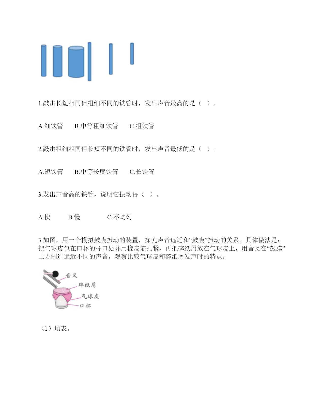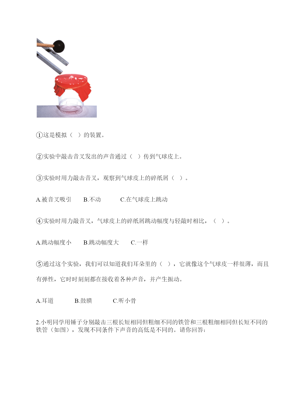 小学科学《声音》练习题一.选择题(共10题,共20分)1.下面方法不能使下图中的钢尺发出声音的是()。A.拉伸钢尺B.拍打钢尺C.敲击钢尺2.在我们耳朵里,时时刻刻都在接收各种声音并产生振动的结构是()。A.鼓膜B.听小骨C.听觉神经3.人体能感受振动的器官是()。A.眼B.鼻C.耳4.我们能够发出声音的器官是()。A.舌B.声带C.鳃5.二胡弦绷直后,拉动它发出声音。把弦再绷得紧一些,再次拉动它,听到发出的声音()。A.比松的时候音高高B.比松的时候声音弱C.比松的时候声音低6.手指轻轻接触到桌面,并在桌面上滑动一段距离,当耳贴在桌子一角上,再这样让手指滑动时,()。A.耳朵听到一样清晰的声音B.它们几乎没有声音C.贴在桌角上听得更清晰7.用手按住正在发声的锣,声音会马上停止,这是因为()。A.手挡住了声音B.手吸收了声音C.锣被按住后停止了振动8.下列关于声音的说法中,不正确的是()。A.人说话的声音是靠嘴唇振动产生的B.声音不能在真空中传播C.用手握紧发声的音叉,声音就会停止D.经常掏耳朵会影响听力9.如果要探究尺子长短和音高的关系,我们最好要用()。A.不同的力量来拨动尺子B.同样的力量来拨动尺子C.都可以10.小明自制了一个橡皮筋琴,如图:用相同大小的力从细弦到粗弦依次弹拨,声音的变化是()。A.从低到高B.从高到低C.从弱到强二.填空题(共10题,共50分)1.用钟锤敲击编钟,轻敲或重敲同一只编钟所发出声音()不同;用相同的力敲大小不同的编钟所发出声音的()不同。2.乐器发出高低不同的声音的原理是物体振动得越快,发出的声音();物体铜动得越慢,发出的声音()。3.音叉是一种()的仪器,是用来()乐器和()音高的。音叉上的字母代表(),数字代表音叉每秒()。4.声音可以用高、()强、()等词来描述。5.在同样的碗里倒入不同量的水,用木棍轻轻敲击碗(敲击的力量相同),我们听到盛水少的碗发出的声音(),盛水多的碗发出的声音()。(“高”或“低”)6.将一根皮筋绷在纸盒上,绷得越紧,振动时发出的声音越();绷得越松,振动发出的声音越()。(选填“高”或“低”)7.有些声音让我们觉得(),比如();有些声音让我们觉得(),比如()。8.耳由()、()、()三部分组成。9.()很薄而且有弹性,即使是很轻的声音,它都会产生振动。10.()是传播声音的重要物质,在()中声音不能传播。三.判断题(共10题,共20分)1.流水声、鸟叫声、雨声都属于自然界的声音。()2.耳朵贴在书桌上,可以听见同桌的写字声。()3.声音是通过外耳道传到鼓膜的,所以耳廓只是好看,对我们听到声音是没有什么作用的。()4.人从喉咙里发出声音,说明声带在发生振动。()5.声音的高低是由物体振动的幅度决定的。振动幅度越大,音调越高。()6.描述声音可以用高、低、强、弱等词汇。()7.吹口哨可以发出声音。()8.水里发出的声音我们是不可能听到的。()9.人说话的声音是由舌头振动产生的。()10.声音过高或过强都不会对我们的听力产生伤害。()四.连线题(共1题,共4分)1.请将生活中有关声音的现象与解释用线连起来。五.填表题(共2题,共22分)1.猜想:声音强弱与物体振动幅度有关,振幅越大,声音越();物体振幅越小,声音越()。实验器材:钢尺,桌子改变的条件:()不改变的条件:()填写表格。实验结论是什么?2.根据你对耳朵的了解,完成下表。六.简答题(共5题,共28分)1.我们可以从哪几个方面对自制的小乐器进行评价?2.抽出玻璃罩内的空气,闹钟的声音有什么变化?怎样解释我们看到的现象?声音的传播与空气有关系吗?3.为什么说“一个巴掌拍不响”?4.想一想,上课时坐在教室里能听到哪些声音?坐在教室里能听到的声音有?5.声音是怎样进行传播的?七.材料题(共3题,共21分)1.下图是乐用橡皮筋将一块绷紧的气球皮扎在杯口上,并在气球皮上撒一些碎纸屑,然后在杯子的上方敲击音叉观察实验现象,根据实验装置图完成下列问题。1、这是模拟()的装置。A.物体振动产生声音B.耳朵鼓膜振动C.液体溶解2、实验中敲击普叉发出的声音通过()传到气球皮上。A.音叉B.空气C.杯子3、实验时用力敲击音叉,观察到气球皮上的碎纸屑()。A.被音叉吸引B.不动C.在气球皮上跳动4、实验时用力敲音叉,气球皮上的碎纸屑跳动幅度与轻敲时相比,()。A.跳动幅度小B.跳动幅度大C.一样5、通过这个实验,我们可以知道我们耳朵里的(),它就像这个气球皮一样很薄,而且有弹性,它时时刻刻都在接收着各种声音,并产生振动。A.耳道B.鼓膜C.听小晋2.在下图中选出制作土电