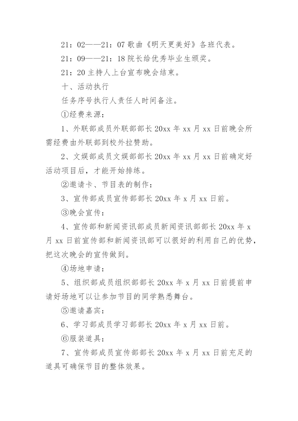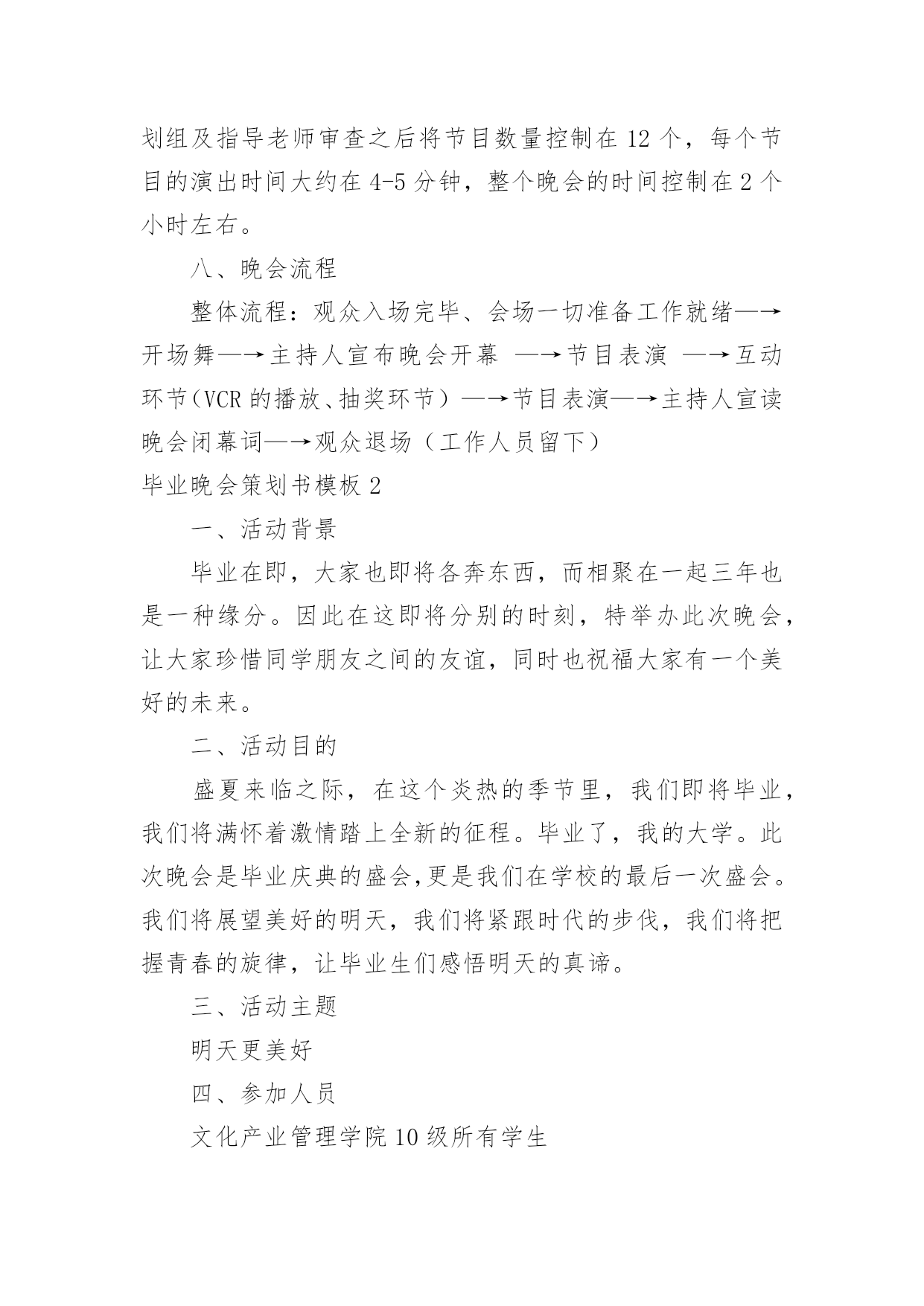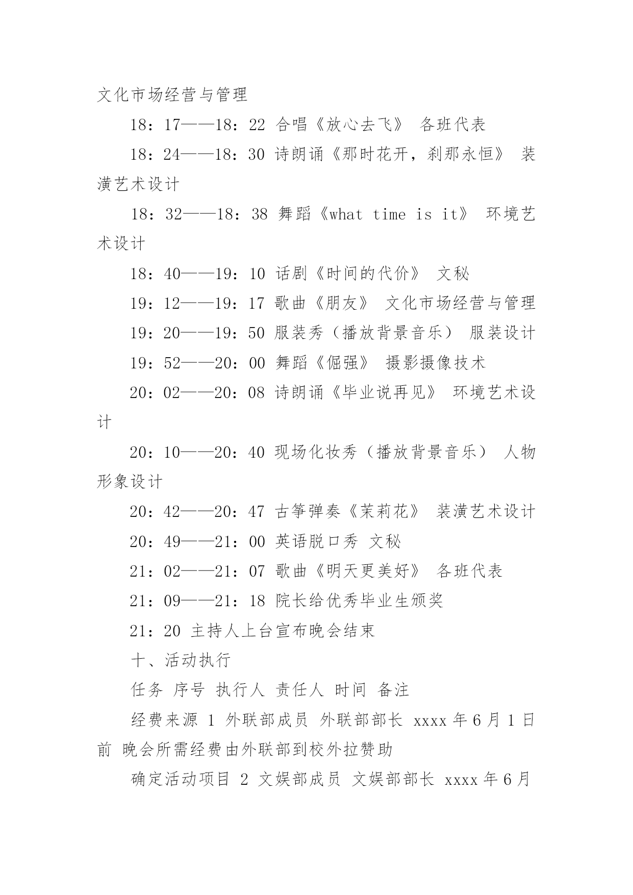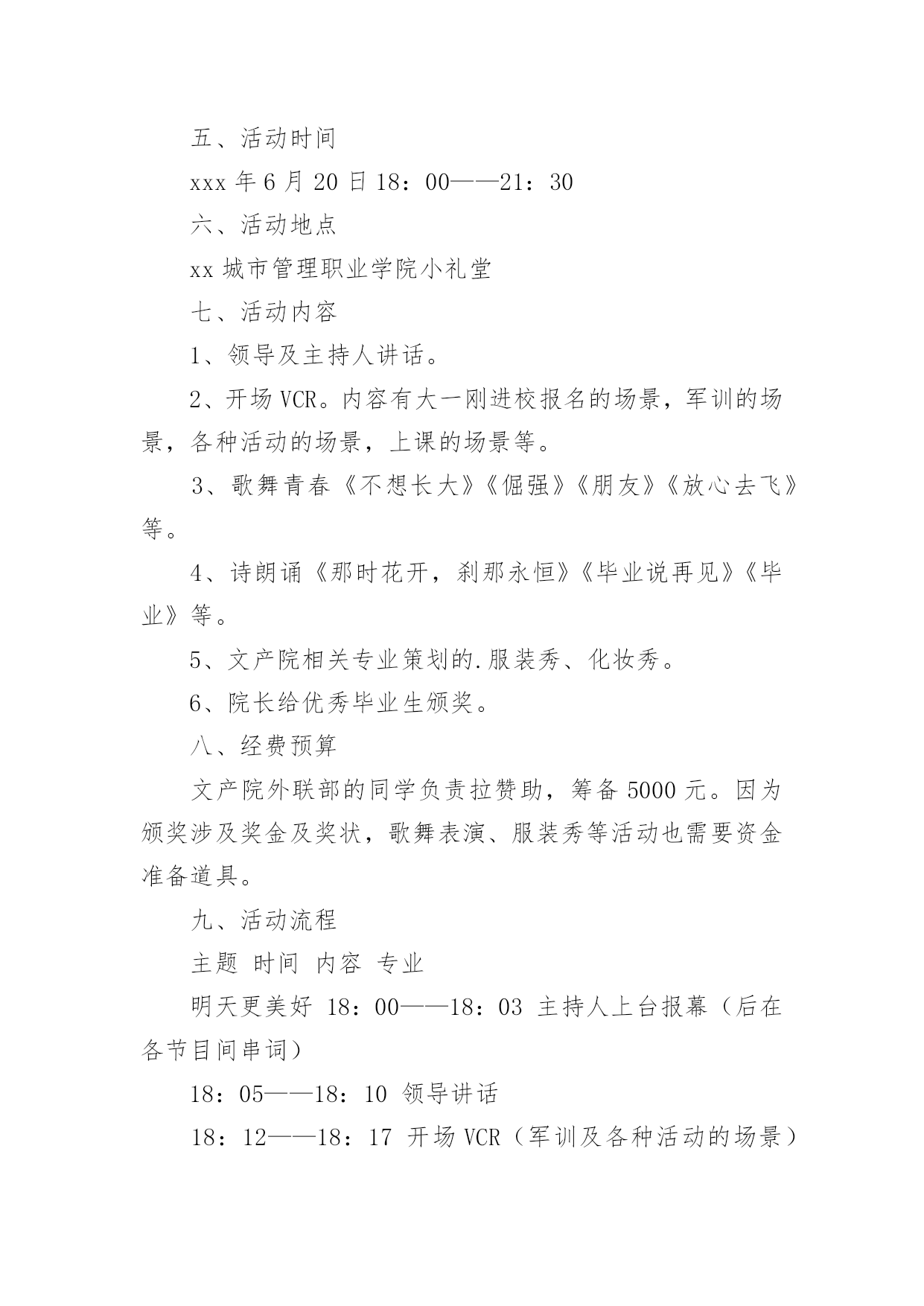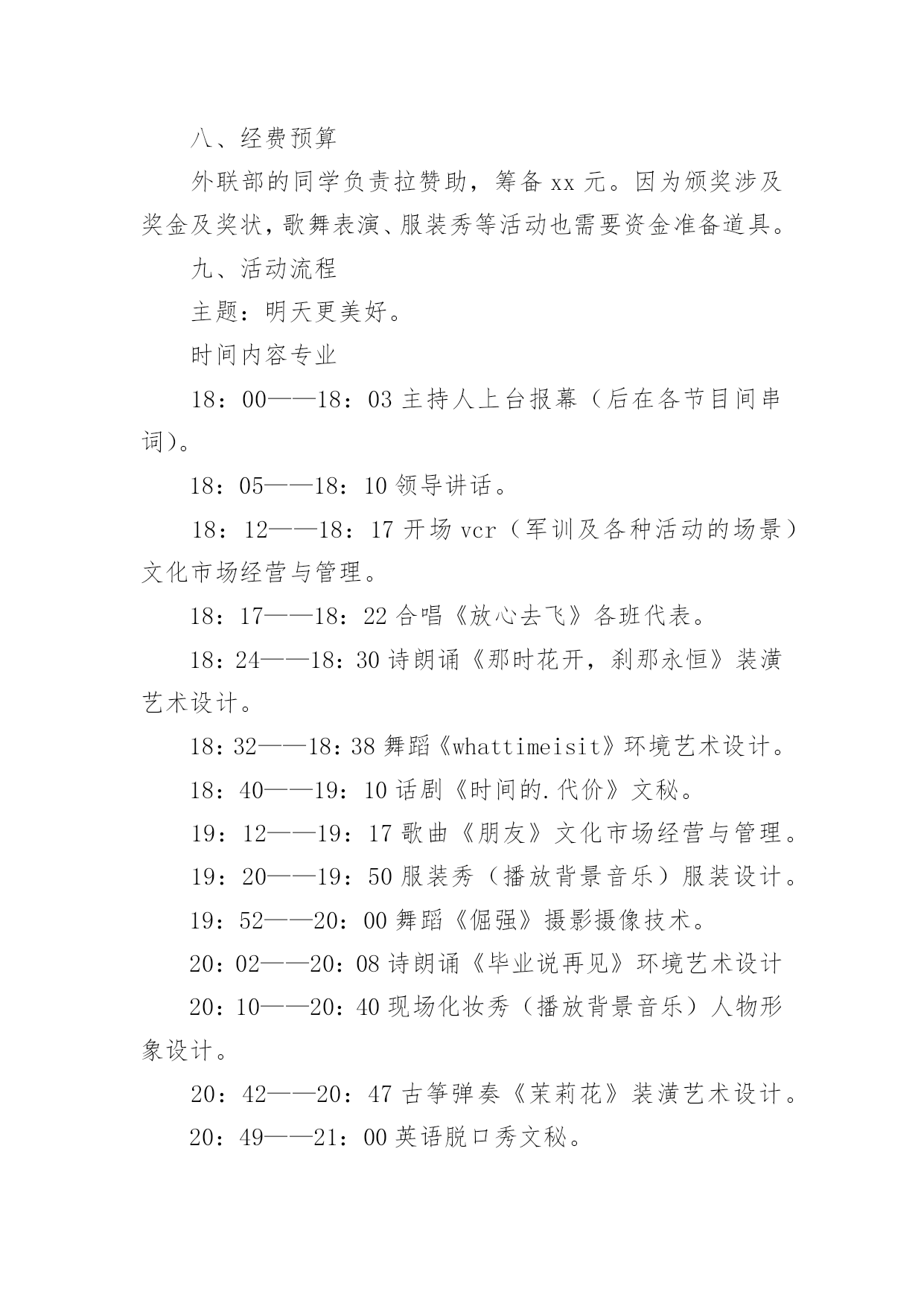 毕业晚会策划书毕业晚会策划书模板一段时间的工作在不知不觉间已经告一段落了,迎接我们的将是新的工作目标,这时候,最关键的策划书怎么能落下!拿起笔的时候却发现不知道写什么,以下是小编帮大家整理的毕业晚会策划书模板,仅供参考,大家一起来看看吧。毕业晚会策划书模板1一、前言时光匆匆,西南科技大学即将送走08级的硕士毕业生,他们满怀激情、斗志昂扬离别西南科技大学这个团结友爱的大家庭的呵护,展翅高飞。西南科技大学研究生会将举办毕业文艺晚会,师生共聚一堂,以表达对毕业生的美好祝福和殷切期望,为他们提供一个展现个人魅力的舞台,共同勾画精彩的毕业诗章,给研究生生涯画上一个圆满的句号!同时,促进新老生交流,老生通过轻松的交谈给新生提供学习、生活、工作、等经验和忠告。主办单位:西南科技大学校团委、西南科技大学研究生部承办单位:西南科技大学研究生会协办单位:西南科技大学各学院研究生分会二、晚会主题挥手青春放飞梦想回首九十风雨辉煌——首届硕士生毕业晚会三、晚会目的这台文艺晚会的主题是“挥手青春放飞梦想回首九十风雨辉煌”。这次晚会主要对象是即将毕业的研究生,借这个晚会把大家对毕业生的美好祝愿予以表达,也借此让毕业生再次感受学校大家庭的温暖的美好回忆,同时也把大家对低年级同学的感情和祝愿表达出来,让他们能愉快无悔地度过在学校的.学习和生活。四、晚会时间20xx年6月20日19:30——21:30分五、晚会地点东八演播大厅六、活动对象:西南科技大学全体硕士研究生七、晚会形式及内容晚会的主要形式是文艺晚会,节目数量控制在12个,其类型包括:歌舞表演、相声、小品、舞台剧等。中间并穿插互动环节,第一,VCR的播放(VCR拍摄关于毕业生临近毕业时段的生活以及硕士生导师对毕业生的美好祝福和寄语)、优秀硕士毕业生对学弟学妹们的建议和祝愿。第二,抽奖环节的设置,根据座位号随机抽取。演出节目组成由学校大学生艺术团选送4个节目、文艺学院选送1-2个节目、以及各学院研究生分会选送1-2个节目,形式不限,但内容必须健康、积极向上。然后对节目进行筛选、采排等,由策划组及指导老师审查之后将节目数量控制在12个,每个节目的演出时间大约在4-5分钟,整个晚会的时间控制在2个小时左右。八、晚会流程整体流程:观众入场完毕、会场一切准备工作就绪—→开场舞—→主持人宣布晚会开幕—→节目表演—→互动环节(VCR的播放、抽奖环节)—→节目表演—→主持人宣读晚会闭幕词—→观众退场(工作人员留下)毕业晚会策划书模板2一、活动背景毕业在即,大家也即将各奔东西,而相聚在一起三年也是一种缘分。因此在这即将分别的时刻,特举办此次晚会,让大家珍惜同学朋友之间的友谊,同时也祝福大家有一个美好的未来。二、活动目的盛夏来临之际,在这个炎热的季节里,我们即将毕业,我们将满怀着激情踏上全新的征程。毕业了,我的大学。此次晚会是毕业庆典的盛会,更是我们在学校的最后一次盛会。我们将展望美好的明天,我们将紧跟时代的步伐,我们将把握青春的旋律,让毕业生们感悟明天的真谛。三、活动主题明天更美好四、参加人员文化产业管理学院10级所有学生五、活动时间xxx年6月20日18:00——21:30六、活动地点xx城市管理职业学院小礼堂七、活动内容1、领导及主持人讲话。2、开场VCR。内容有大一刚进校报名的场景,军训的场景,各种活动的场景,上课的场景等。3、歌舞青春《不想长大》《倔强》《朋友》《放心去飞》等。4、诗朗诵《那时花开,刹那永恒》《毕业说再见》《毕业》等。5、文产院相关专业策划的.服装秀、化妆秀。6、院长给优秀毕业生颁奖。八、经费预算文产院外联部的同学负责拉赞助,筹备5000元。因为颁奖涉及奖金及奖状,歌舞表演、服装秀等活动也需要资金准备道具。九、活动流程主题时间内容专业明天更美好18:00——18:03主持人上台报幕(后在各节目间串词)18:05——18:10领导讲话18:12——18:17开场VCR(军训及各种活动的场景)文化市场经营与管理18:17——18:22合唱《放心去飞》各班代表18:24——18:30诗朗诵《那时花开,刹那永恒》装潢艺术设计18:32——18:38舞蹈《whattimeisit》环境艺术设计18:40——19:10话剧《时间的代价》文秘19:12——19:17歌曲《朋友》文化市场经营与管理19:20——19:50服装秀(播放背景音乐)服装设计19:52——20:00舞蹈《倔强》摄影摄像技术20:02——20:08诗朗诵《毕业说再见》环境艺术设计20:10——20:40现场化妆秀(播放背景音乐)人物形象设计20:42——20:47古筝弹奏《茉莉花》装潢艺术设计20:49——21:00英语脱口秀文秘21:02——21:07歌曲《明天更美好》各班代表21:09——21:18院长给优秀毕业生颁奖21:20主持人