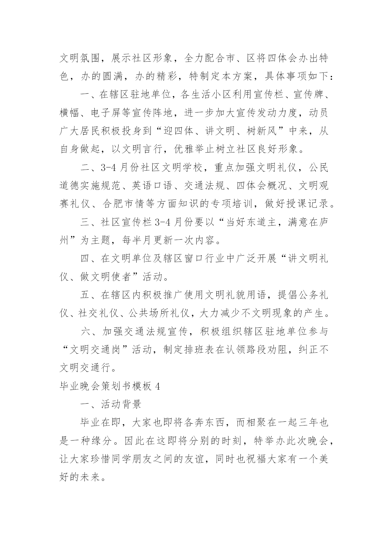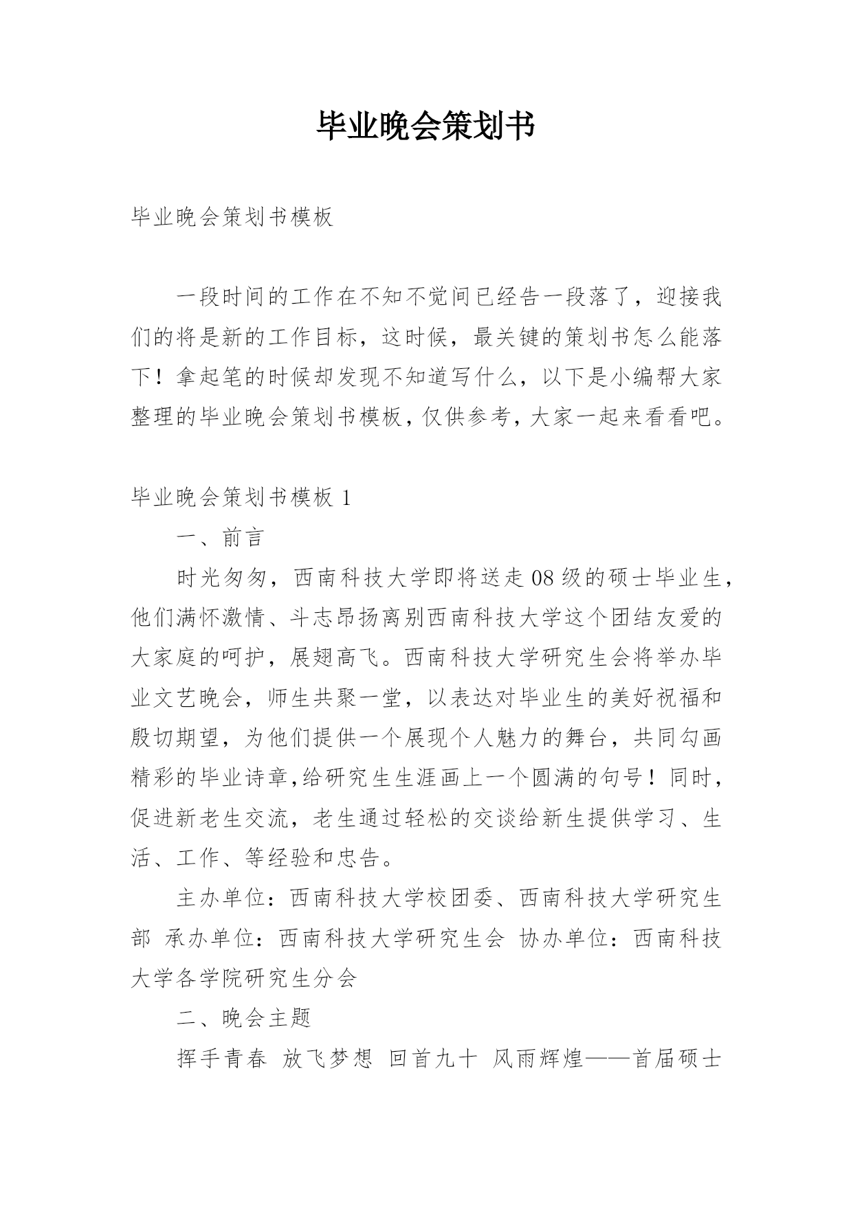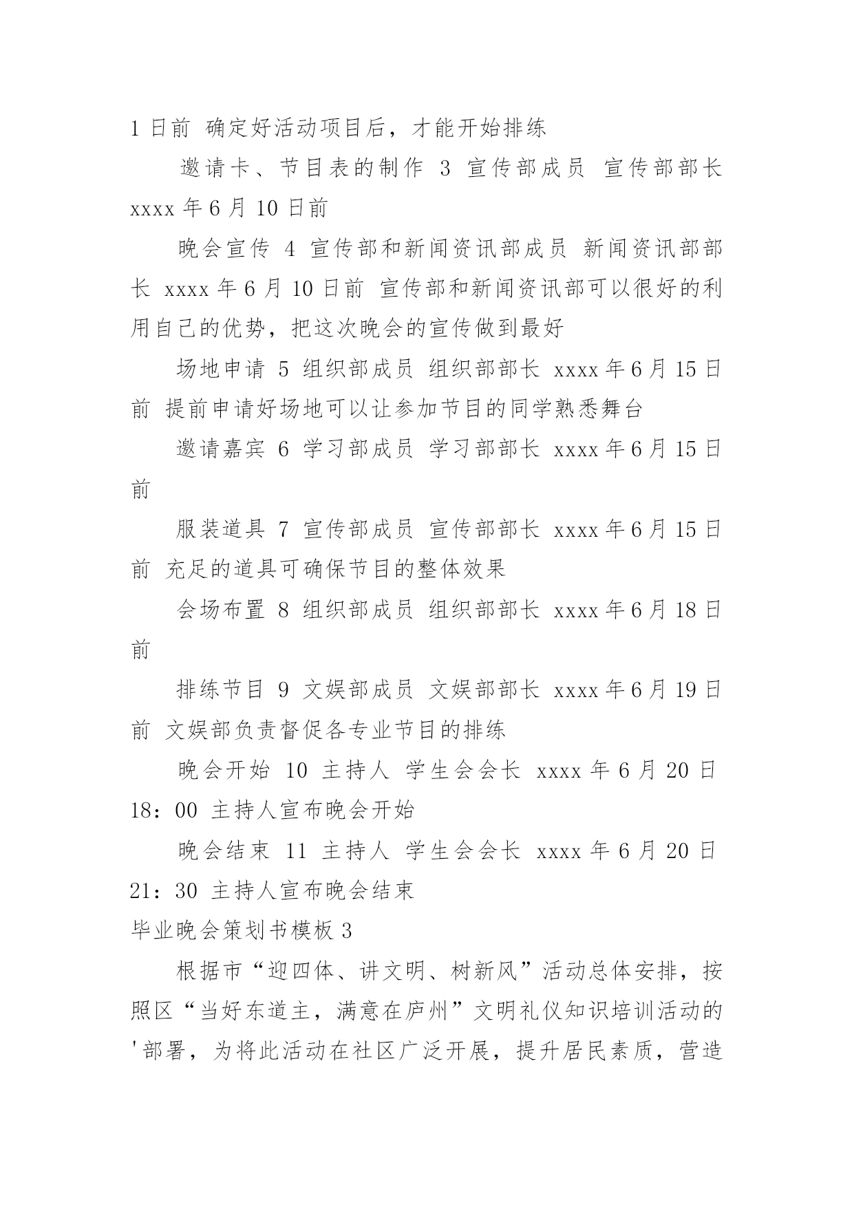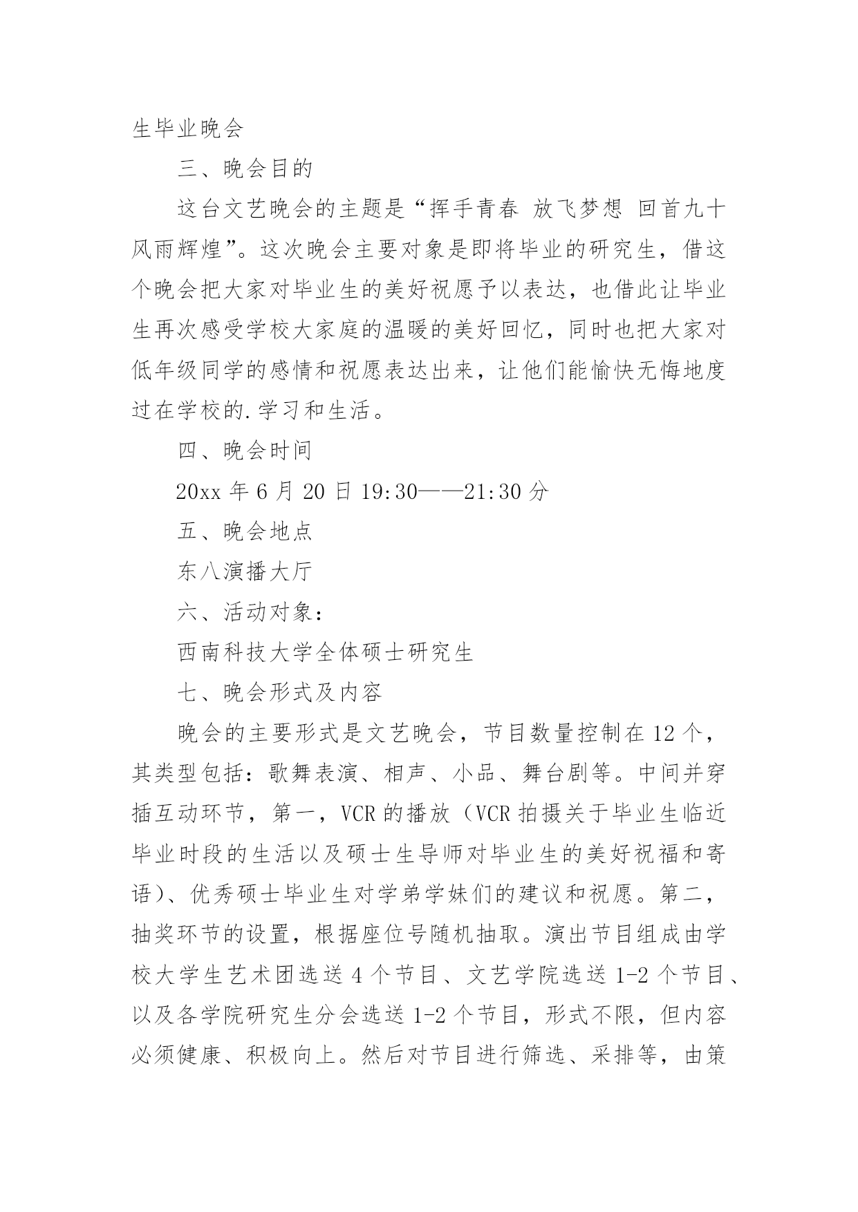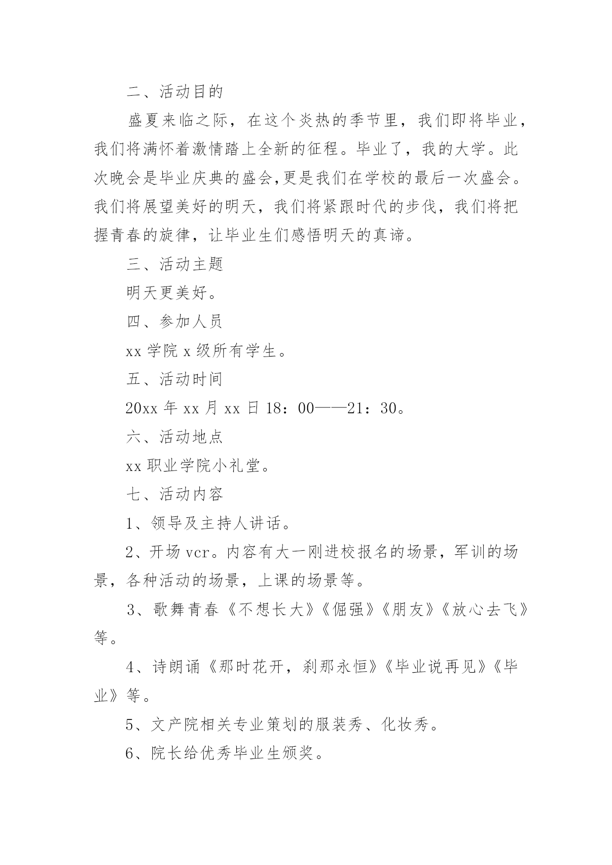 毕业晚会策划书毕业晚会策划书模板一段时间的工作在不知不觉间已经告一段落了,迎接我们的将是新的工作目标,这时候,最关键的策划书怎么能落下!拿起笔的时候却发现不知道写什么,以下是小编帮大家整理的毕业晚会策划书模板,仅供参考,大家一起来看看吧。毕业晚会策划书模板1一、前言时光匆匆,西南科技大学即将送走08级的硕士毕业生,他们满怀激情、斗志昂扬离别西南科技大学这个团结友爱的大家庭的呵护,展翅高飞。西南科技大学研究生会将举办毕业文艺晚会,师生共聚一堂,以表达对毕业生的美好祝福和殷切期望,为他们提供一个展现个人魅力的舞台,共同勾画精彩的毕业诗章,给研究生生涯画上一个圆满的句号!同时,促进新老生交流,老生通过轻松的交谈给新生提供学习、生活、工作、等经验和忠告。主办单位:西南科技大学校团委、西南科技大学研究生部承办单位:西南科技大学研究生会协办单位:西南科技大学各学院研究生分会二、晚会主题挥手青春放飞梦想回首九十风雨辉煌——首届硕士生毕业晚会三、晚会目的这台文艺晚会的主题是“挥手青春放飞梦想回首九十风雨辉煌”。这次晚会主要对象是即将毕业的研究生,借这个晚会把大家对毕业生的美好祝愿予以表达,也借此让毕业生再次感受学校大家庭的温暖的美好回忆,同时也把大家对低年级同学的感情和祝愿表达出来,让他们能愉快无悔地度过在学校的.学习和生活。四、晚会时间20xx年6月20日19:30——21:30分五、晚会地点东八演播大厅六、活动对象:西南科技大学全体硕士研究生七、晚会形式及内容晚会的主要形式是文艺晚会,节目数量控制在12个,其类型包括:歌舞表演、相声、小品、舞台剧等。中间并穿插互动环节,第一,VCR的播放(VCR拍摄关于毕业生临近毕业时段的生活以及硕士生导师对毕业生的美好祝福和寄语)、优秀硕士毕业生对学弟学妹们的建议和祝愿。第二,抽奖环节的设置,根据座位号随机抽取。演出节目组成由学校大学生艺术团选送4个节目、文艺学院选送1-2个节目、以及各学院研究生分会选送1-2个节目,形式不限,但内容必须健康、积极向上。然后对节目进行筛选、采排等,由策划组及指导老师审查之后将节目数量控制在12个,每个节目的演出时间大约在4-5分钟,整个晚会的时间控制在2个小时左右。八、晚会流程整体流程:观众入场完毕、会场一切准备工作就绪—→开场舞—→主持人宣布晚会开幕—→节目表演—→互动环节(VCR的播放、抽奖环节)—→节目表演—→主持人宣读晚会闭幕词—→观众退场(工作人员留下)毕业晚会策划书模板2一、活动背景毕业在即,大家也即将各奔东西,而相聚在一起三年也是一种缘分。因此在这即将分别的时刻,特举办此次晚会,让大家珍惜同学朋友之间的友谊,同时也祝福大家有一个美好的未来。二、活动目的盛夏来临之际,在这个炎热的季节里,我们即将毕业,我们将满怀着激情踏上全新的征程。毕业了,我的大学。此次晚会是毕业庆典的盛会,更是我们在学校的最后一次盛会。我们将展望美好的明天,我们将紧跟时代的步伐,我们将把握青春的旋律,让毕业生们感悟明天的真谛。三、活动主题明天更美好四、参加人员文化产业管理学院10级所有学生五、活动时间xxx年6月20日18:00——21:30六、活动地点xx城市管理职业学院小礼堂七、活动内容1、领导及主持人讲话。2、开场VCR。内容有大一刚进校报名的场景,军训的场景,各种活动的场景,上课的场景等。3、歌舞青春《不想长大》《倔强》《朋友》《放心去飞》等。4、诗朗诵《那时花开,刹那永恒》《毕业说再见》《毕业》等。5、文产院相关专业策划的.服装秀、化妆秀。6、院长给优秀毕业生颁奖。八、经费预算文产院外联部的同学负责拉赞助,筹备5000元。因为颁奖涉及奖金及奖状,歌舞表演、服装秀等活动也需要资金准备道具。九、活动流程主题时间内容专业明天更美好18:00——18:03主持人上台报幕(后在各节目间串词)18:05——18:10领导讲话18:12——18:17开场VCR(军训及各种活动的场景)文化市场经营与管理18:17——18:22合唱《放心去飞》各班代表18:24——18:30诗朗诵《那时花开,刹那永恒》装潢艺术设计18:32——18:38舞蹈《whattimeisit》环境艺术设计18:40——19:10话剧《时间的代价》文秘19:12——19:17歌曲《朋友》文化市场经营与管理19:20——19:50服装秀(播放背景音乐)服装设计19:52——20:00舞蹈《倔强》摄影摄像技术20:02——20:08诗朗诵《毕业说再见》环境艺术设计20:10——20:40现场化妆秀(播放背景音乐)人物形象设计20:42——20:47古筝弹奏《茉莉花》装潢艺术设计20:49——21:00英语脱口秀文秘21:02——21:07歌曲《明天更美好》各班代表21:09——21:18院长给优秀毕业生颁奖21:20主持人