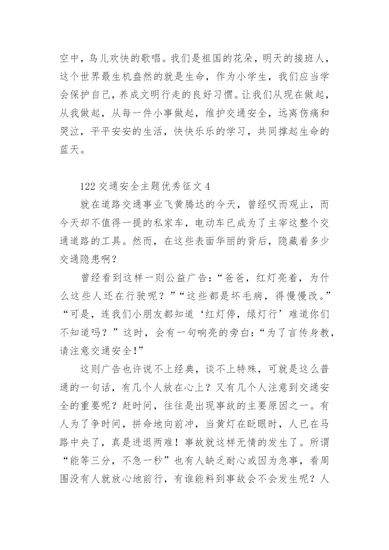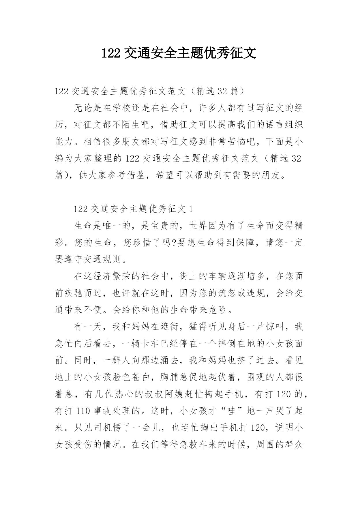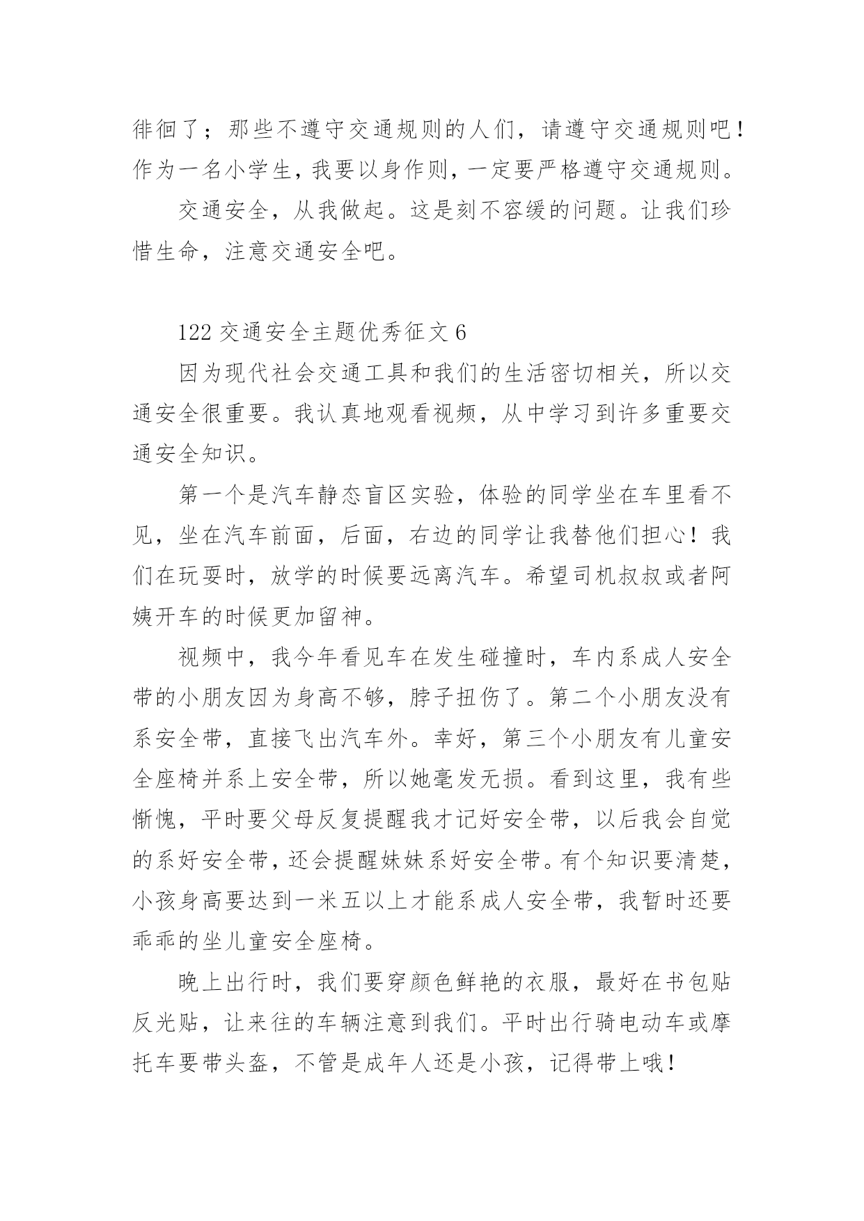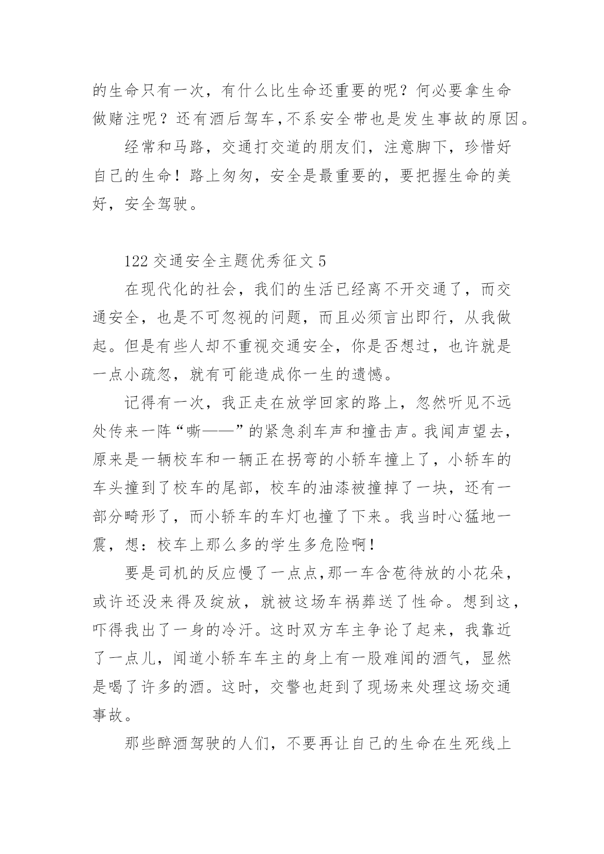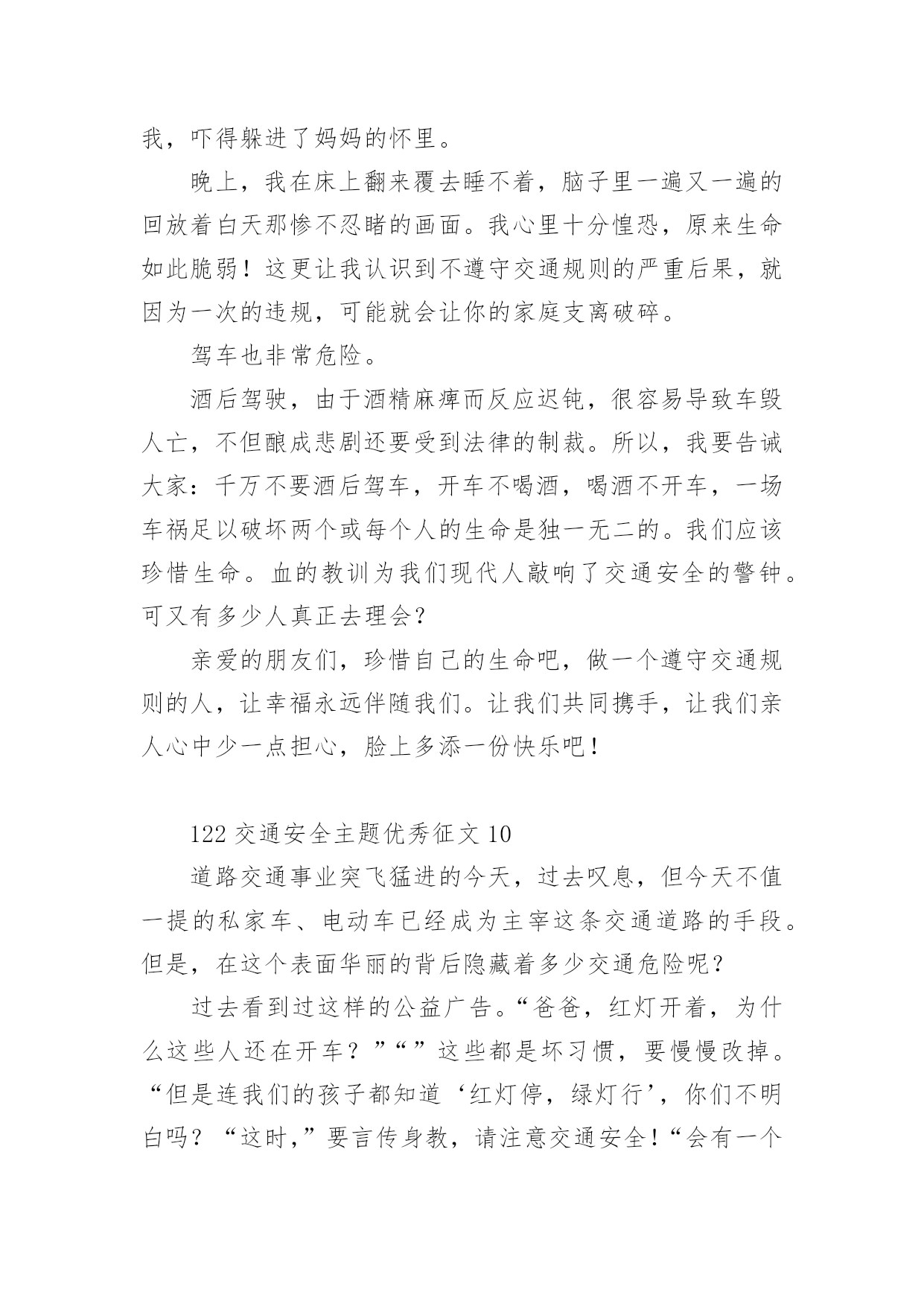 122交通安全主题优秀征文122交通安全主题优秀征文范文(精选32篇)无论是在学校还是在社会中,许多人都有过写征文的经历,对征文都不陌生吧,借助征文可以提高我们的语言组织能力。相信很多朋友都对写征文感到非常苦恼吧,下面是小编为大家整理的122交通安全主题优秀征文范文(精选32篇),供大家参考借鉴,希望可以帮助到有需要的朋友。122交通安全主题优秀征文1生命是唯一的,是宝贵的,世界因为有了生命而变得精彩。您的生命,您珍惜了吗?要想生命得到保障,请您一定要遵守交通规则。在这经济繁荣的社会中,街上的车辆逐渐增多,在您面前疾驰而过,也许就在这时,因为您的疏忽或违规,会给交通带来不便。会给你和他的生命带来危险。有一天,我和妈妈在逛街,猛得听见身后一片惊叫,我急忙向后看去,一辆卡车已经停在一个摔倒在地的小女孩面前。同时,一群人向那边涌去,我和妈妈也挤了过去。看见地上的小女孩脸色苍白,胸脯急促地起伏着,围观的人都很着急,有几位热心的叔叔阿姨赶忙掏起手机,有打120的,有打110事故处理的。这时,小女孩才“哇”地一声哭了起来。只见司机愣了一会儿,也连忙掏出手机打120,说明小女孩受伤的情况。在我们等待急救车来的时候,周围的群众议论纷纷:“哎,这女孩子,这女孩也真是的,不遵守交通规则,幸亏没有什么大碍。”从这起车祸中,让我感受到了交通规则的重要性。如果真有三长两短,双方都得承受现实的压力。像这类的交通事故,记得以前有一新闻报道:一辆大货车和一辆中巴车,因为司机一时疏忽相撞,导致10多人死亡,现场真是惨不忍睹、震撼人心啊!那真是车毁人亡,多少个家庭遭遇不幸啊!所以为了社会的安宁,为了每个人的家庭平安,我们人人都要严格遵守交通规则,注意安全,不要抱有侥幸心理。俗话说:“生命重于泰山,为了自己,为了家人,为了您的生命,请您认真学习交通法,严格遵守交通法,愿您一路平安。”122交通安全主题优秀征文2说到“交通”这个词,大家总会把它与安全连在一齐,因为它与我们的生命息息相关,随着社会的发展,交通事业为社会生产和人们生活带给了便利条件,与此同时,无休止的“马路战争”也时时处处威胁着我们的生命和财产安全,交通事故已成为社会的重大问题之一。由于一些人的交通安全意识不强,平坦的马路上演出了一场场人间杯具,响起了一曲曲人生悲歌。朋友,当你看到无辜的生灵惨死在车轮下,听到失去亲人时催人心碎的哭声时,有谁不感到痛心?他们带走的是和谐,幸福,欢乐,留下的是灾难,痛苦,思念。这血的教训,生命的代价,难道还换不回我们遵守交通法规,时刻注意安全的自觉性吗?人生苦短,哪能半途而废?从小树立安全第一的思想,才能实现我们辉煌的梦想,幸福和欢乐才能永远半随着我们。亲爱的朋友们,当你沐浴着清晨的第一缕阳光,当你与亲人一齐游玩,当你走在回家的路上,当你正为着理想而冲刺,你可曾意识到生命的可贵?如果你拥有一颗爱生命,爱人类的心,那么请提醒你和你的朋友们,必须要遵守交通法规,因为它是你和他人的幸福的保护神。交通法规,务必人人遵守,交通安全是生命的纽带。122交通安全主题优秀征文3交通安全从我做起人生中最宝贵的是生命,然而有些人交通安全的意识淡薄,导致生命就像那薄薄的蝉翼一样脆弱,每当我们看到那触目惊心的车祸惨景时,能不感到痛心疾首吗?在此,我要告诉朋友们,为了您和他人的生命安全,请自觉遵守交通法规,注意道路安全。我曾从电视新闻上听到这样一个故事:一个五岁的小男孩在路边玩皮球,一不留神,球滚到了马路上,小男孩连忙跑到马路上去捡球,突然一辆满载货物的大卡车飞奔而来,还没等男孩反应过来,已经被沉重的车轮压倒在地……一个可爱的生命顿时凋零了,他的家人陷入了无尽的悲痛之中,可那个曾经天真可爱的小男孩永远也不可能回来了……同学们,蔚蓝的大海里鱼儿自由自在的游玩,碧蓝的天空中,鸟儿欢快的歌唱。我们是祖国的花朵,明天的接班人,这个世界最生机盎然的就是生命,作为小学生,我们应当学会保护自己,养成文明行走的良好习惯。让我们从现在做起,从我做起,从每一件小事做起,维护交通安全,远离伤痛和哭泣,平平安安的生活,快快乐乐的学习,共同撑起生命的蓝天。122交通安全主题优秀征文4就在道路交通事业飞黄腾达的今天,曾经叹而观止,而今天却不值得一提的私家车,电动车已成为了主宰这整个交通道路的工具。然而,在这些表面华丽的背后,隐藏着多少交通隐患啊?曾经看到这样一则公益广告:“爸爸,红灯亮着,为什么这些人还在行驶呢?”“这些都是坏毛病,得慢慢改。”“可是,连我们小朋友都知道‘红灯停,绿灯行’难道你们不知道吗?”这时,会有一句响亮的旁白:“为了言传身教,请注意交通安全!”这则广告也许说不上经典,谈不上特殊,可就是这么普通的一句话,有几个人放在心上?又有几个人注意到交通安全的重要呢?赶时间,往往是出现事故的主要原因之一。有人为了争