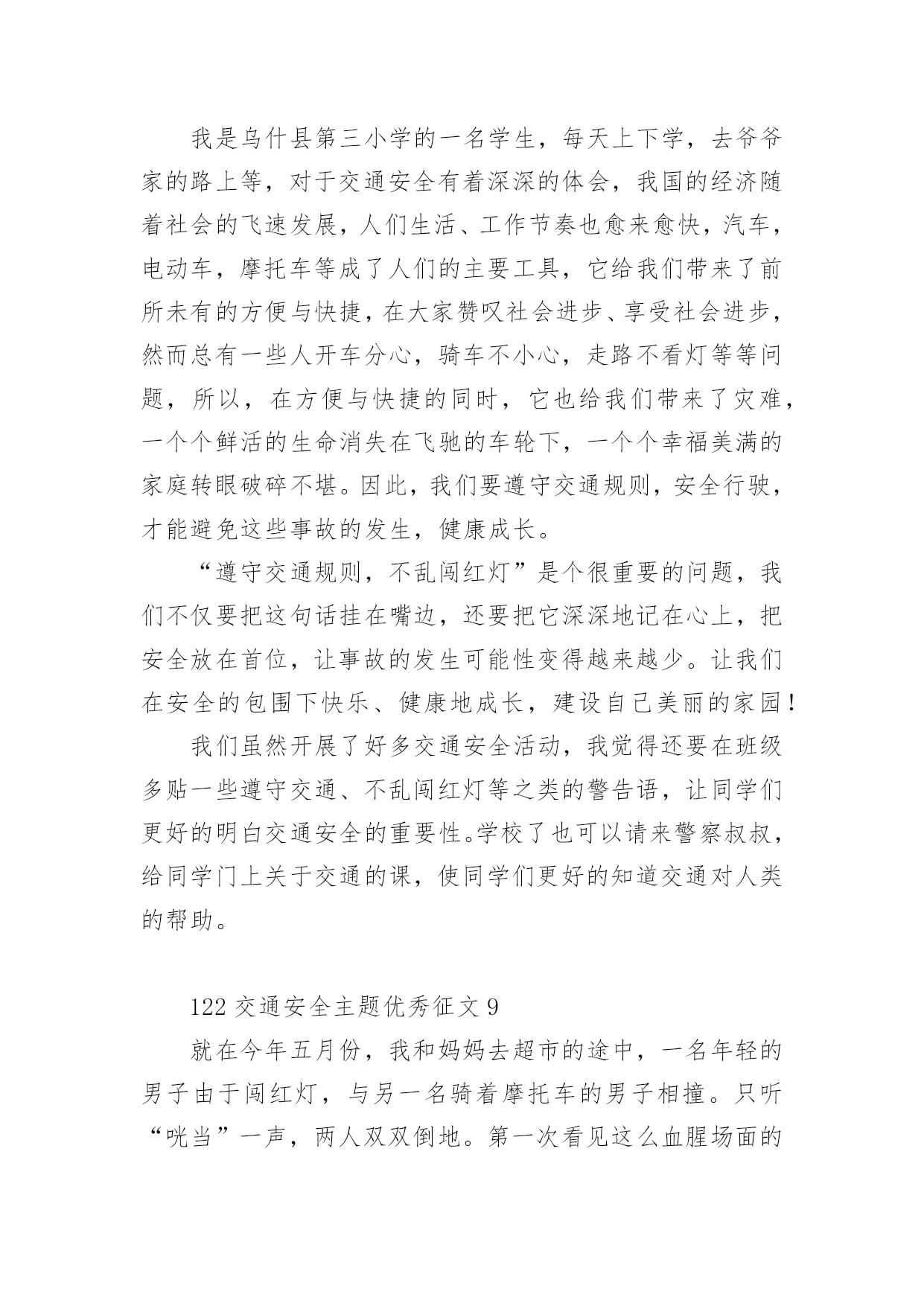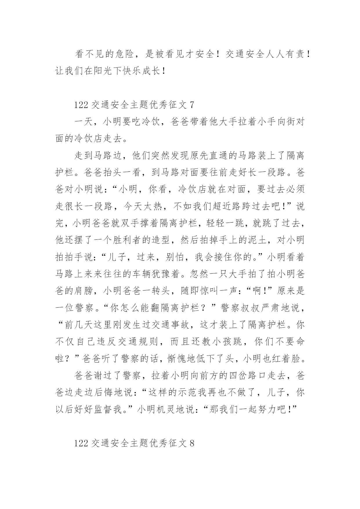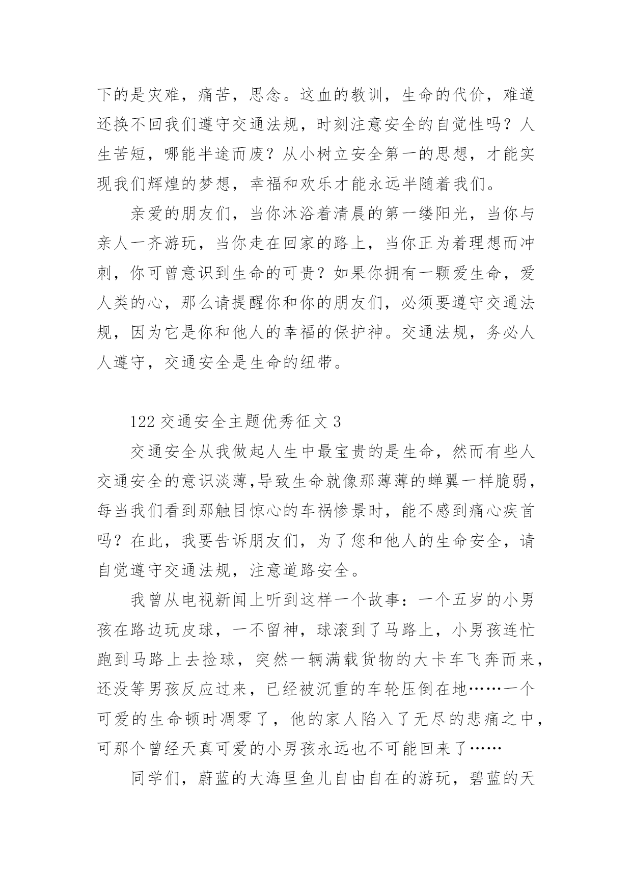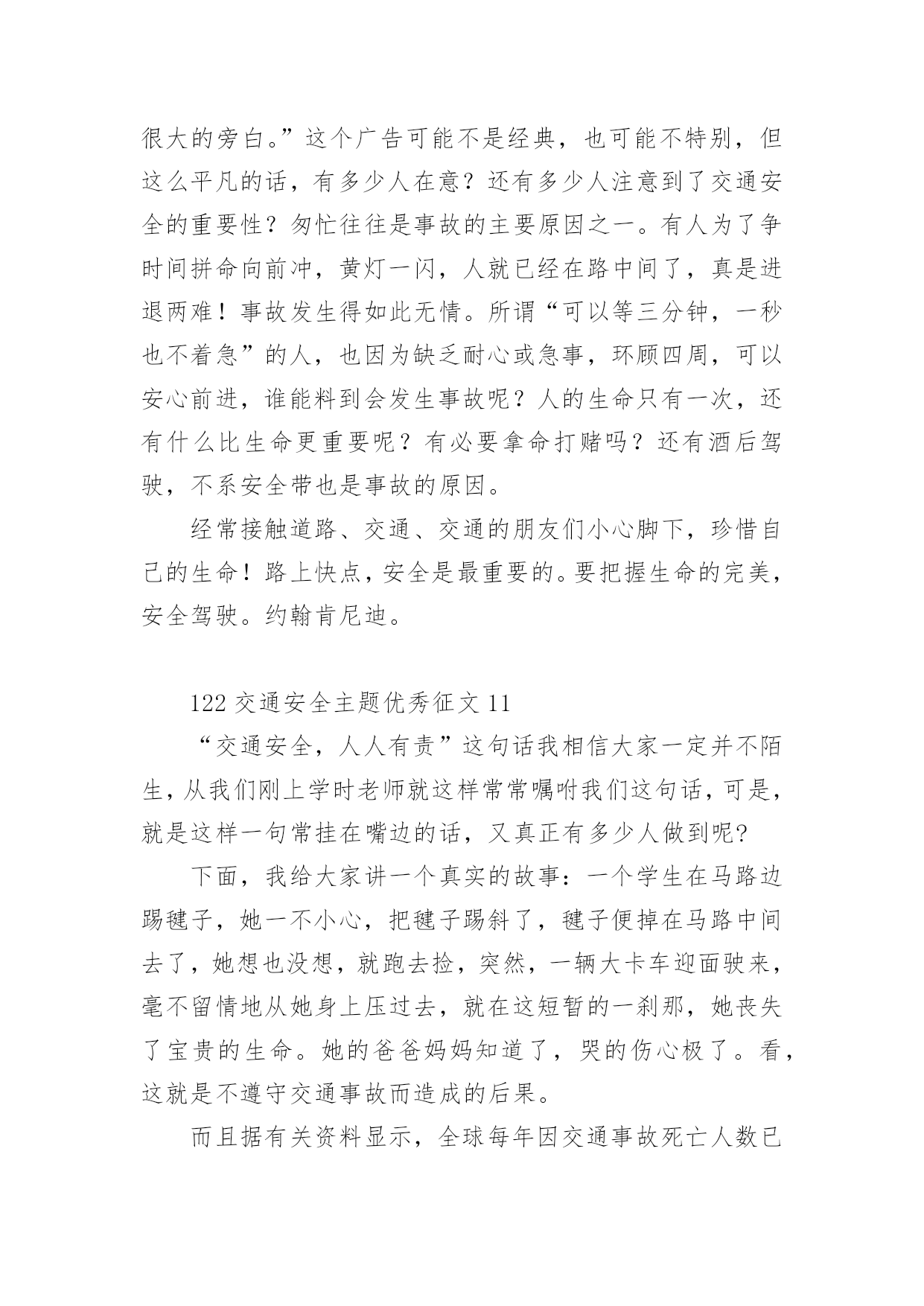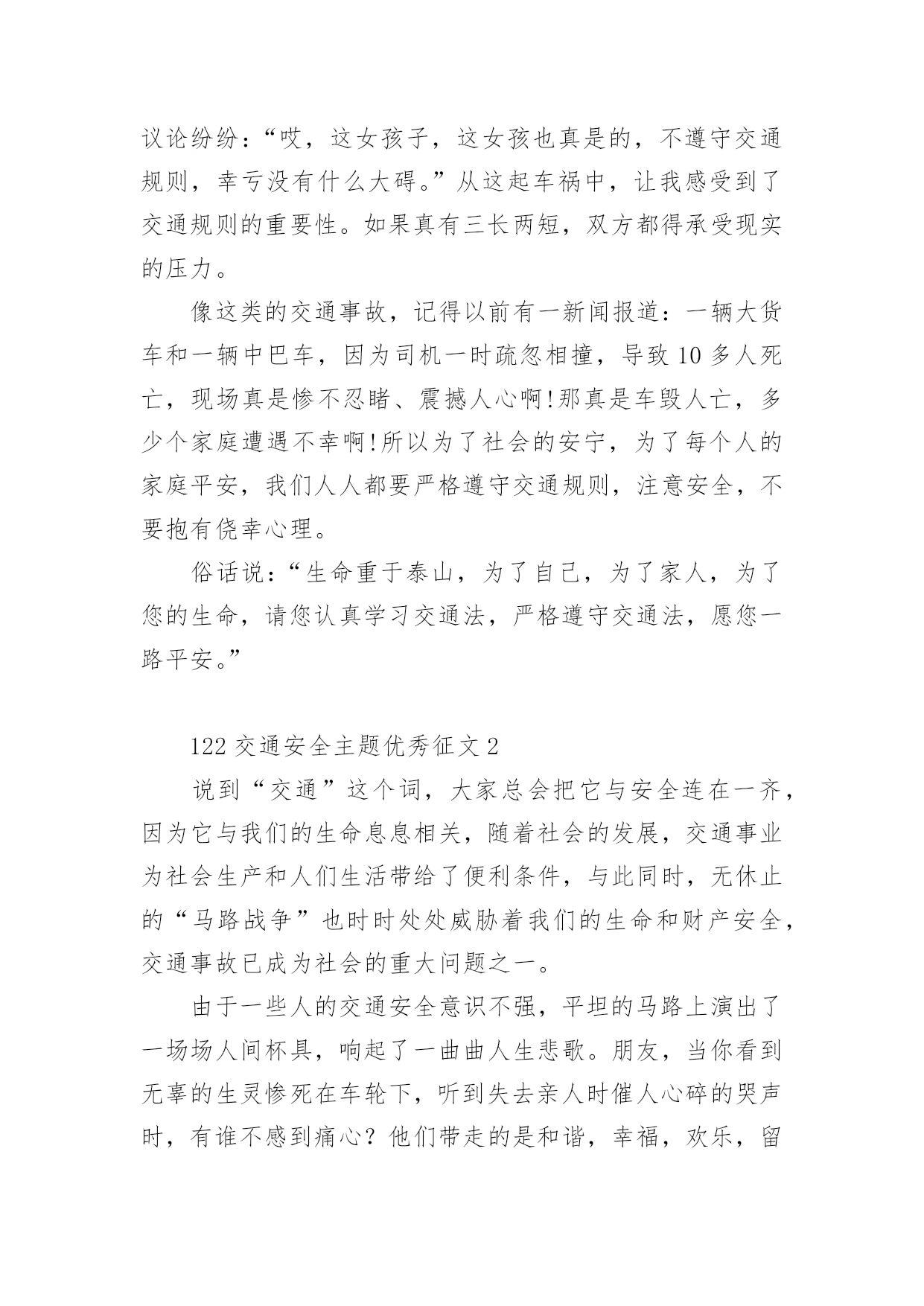 122交通安全主题优秀征文122交通安全主题优秀征文范文(精选32篇)无论是在学校还是在社会中,许多人都有过写征文的经历,对征文都不陌生吧,借助征文可以提高我们的语言组织能力。相信很多朋友都对写征文感到非常苦恼吧,下面是小编为大家整理的122交通安全主题优秀征文范文(精选32篇),供大家参考借鉴,希望可以帮助到有需要的朋友。122交通安全主题优秀征文1生命是唯一的,是宝贵的,世界因为有了生命而变得精彩。您的生命,您珍惜了吗?要想生命得到保障,请您一定要遵守交通规则。在这经济繁荣的社会中,街上的车辆逐渐增多,在您面前疾驰而过,也许就在这时,因为您的疏忽或违规,会给交通带来不便。会给你和他的生命带来危险。有一天,我和妈妈在逛街,猛得听见身后一片惊叫,我急忙向后看去,一辆卡车已经停在一个摔倒在地的小女孩面前。同时,一群人向那边涌去,我和妈妈也挤了过去。看见地上的小女孩脸色苍白,胸脯急促地起伏着,围观的人都很着急,有几位热心的叔叔阿姨赶忙掏起手机,有打120的,有打110事故处理的。这时,小女孩才“哇”地一声哭了起来。只见司机愣了一会儿,也连忙掏出手机打120,说明小女孩受伤的情况。在我们等待急救车来的时候,周围的群众议论纷纷:“哎,这女孩子,这女孩也真是的,不遵守交通规则,幸亏没有什么大碍。”从这起车祸中,让我感受到了交通规则的重要性。如果真有三长两短,双方都得承受现实的压力。像这类的交通事故,记得以前有一新闻报道:一辆大货车和一辆中巴车,因为司机一时疏忽相撞,导致10多人死亡,现场真是惨不忍睹、震撼人心啊!那真是车毁人亡,多少个家庭遭遇不幸啊!所以为了社会的安宁,为了每个人的家庭平安,我们人人都要严格遵守交通规则,注意安全,不要抱有侥幸心理。俗话说:“生命重于泰山,为了自己,为了家人,为了您的生命,请您认真学习交通法,严格遵守交通法,愿您一路平安。”122交通安全主题优秀征文2说到“交通”这个词,大家总会把它与安全连在一齐,因为它与我们的生命息息相关,随着社会的发展,交通事业为社会生产和人们生活带给了便利条件,与此同时,无休止的“马路战争”也时时处处威胁着我们的生命和财产安全,交通事故已成为社会的重大问题之一。由于一些人的交通安全意识不强,平坦的马路上演出了一场场人间杯具,响起了一曲曲人生悲歌。朋友,当你看到无辜的生灵惨死在车轮下,听到失去亲人时催人心碎的哭声时,有谁不感到痛心?他们带走的是和谐,幸福,欢乐,留下的是灾难,痛苦,思念。这血的教训,生命的代价,难道还换不回我们遵守交通法规,时刻注意安全的自觉性吗?人生苦短,哪能半途而废?从小树立安全第一的思想,才能实现我们辉煌的梦想,幸福和欢乐才能永远半随着我们。亲爱的朋友们,当你沐浴着清晨的第一缕阳光,当你与亲人一齐游玩,当你走在回家的路上,当你正为着理想而冲刺,你可曾意识到生命的可贵?如果你拥有一颗爱生命,爱人类的心,那么请提醒你和你的朋友们,必须要遵守交通法规,因为它是你和他人的幸福的保护神。交通法规,务必人人遵守,交通安全是生命的纽带。122交通安全主题优秀征文3交通安全从我做起人生中最宝贵的是生命,然而有些人交通安全的意识淡薄,导致生命就像那薄薄的蝉翼一样脆弱,每当我们看到那触目惊心的车祸惨景时,能不感到痛心疾首吗?在此,我要告诉朋友们,为了您和他人的生命安全,请自觉遵守交通法规,注意道路安全。我曾从电视新闻上听到这样一个故事:一个五岁的小男孩在路边玩皮球,一不留神,球滚到了马路上,小男孩连忙跑到马路上去捡球,突然一辆满载货物的大卡车飞奔而来,还没等男孩反应过来,已经被沉重的车轮压倒在地……一个可爱的生命顿时凋零了,他的家人陷入了无尽的悲痛之中,可那个曾经天真可爱的小男孩永远也不可能回来了……同学们,蔚蓝的大海里鱼儿自由自在的游玩,碧蓝的天空中,鸟儿欢快的歌唱。我们是祖国的花朵,明天的接班人,这个世界最生机盎然的就是生命,作为小学生,我们应当学会保护自己,养成文明行走的良好习惯。让我们从现在做起,从我做起,从每一件小事做起,维护交通安全,远离伤痛和哭泣,平平安安的生活,快快乐乐的学习,共同撑起生命的蓝天。122交通安全主题优秀征文4就在道路交通事业飞黄腾达的今天,曾经叹而观止,而今天却不值得一提的私家车,电动车已成为了主宰这整个交通道路的工具。然而,在这些表面华丽的背后,隐藏着多少交通隐患啊?曾经看到这样一则公益广告:“爸爸,红灯亮着,为什么这些人还在行驶呢?”“这些都是坏毛病,得慢慢改。”“可是,连我们小朋友都知道‘红灯停,绿灯行’难道你们不知道吗?”这时,会有一句响亮的旁白:“为了言传身教,请注意交通安全!”这则广告也许说不上经典,谈不上特殊,可就是这么普通的一句话,有几个人放在心上?又有几个人注意到交通安全的重要呢?赶时间,往往是出现事故的主要原因之一。有人为了争