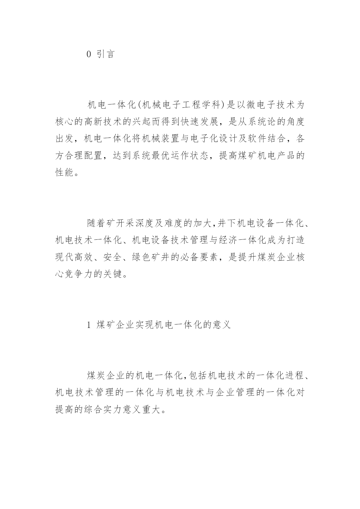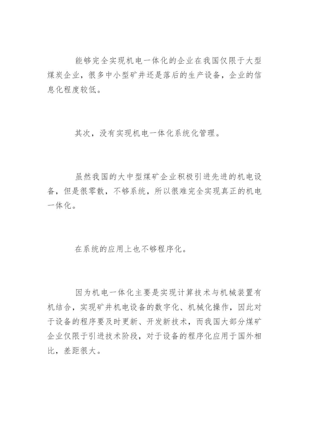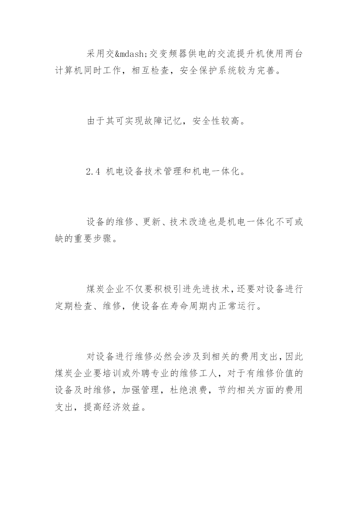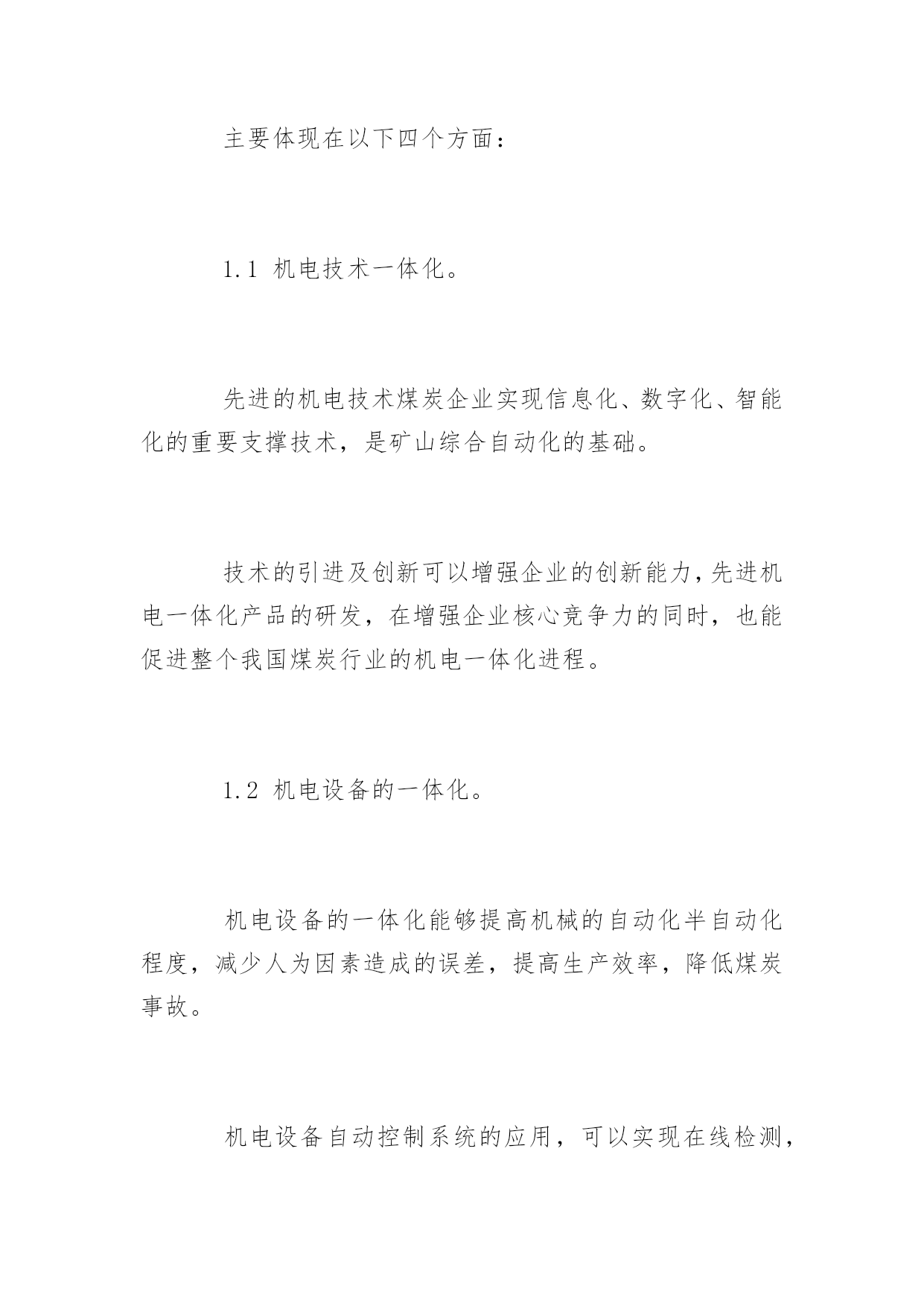 现代煤矿企业的机电一体化现代煤矿企业的机电一体化现代煤矿企业的机电一体化,下面带来现代煤矿企业的机电一体化相关论文范文,欢迎阅读。现代煤矿企业的机电一体化【1】摘要:随着煤炭企业一体化技术的不断发展,煤矿企业的机械系统也有向一体化方向发展的趋势。加快煤炭企业机电一体化进程,不仅能够提高企业的生产效率,加快企业的技术结构调整,同时为保护环境、节约资源贡献自己的力量,最终实现企业的高效持续发展。关键词:现代煤矿机电机电一体化0引言机电一体化(机械电子工程学科)是以微电子技术为核心的高新技术的兴起而得到快速发展,是从系统论的角度出发,机电一体化将机械装置与电子化设计及软件结合,各方合理配置,达到系统最优运作状态,提高煤矿机电产品的性能。随着矿开采深度及难度的加大,井下机电设备一体化、机电技术一体化、机电设备技术管理与经济一体化成为打造现代高效、安全、绿色矿井的必备要素,是提升煤炭企业核心竞争力的关键。1煤矿企业实现机电一体化的意义煤炭企业的机电一体化,包括机电技术的一体化进程、机电技术管理的一体化与机电技术与企业管理的一体化对提高的综合实力意义重大。主要体现在以下四个方面:1.1机电技术一体化。先进的机电技术煤炭企业实现信息化、数字化、智能化的重要支撑技术,是矿山综合自动化的基础。技术的引进及创新可以增强企业的创新能力,先进机电一体化产品的研发,在增强企业核心竞争力的同时,也能促进整个我国煤炭行业的机电一体化进程。1.2机电设备的一体化。机电设备的一体化能够提高机械的自动化半自动化程度,减少人为因素造成的误差,提高生产效率,降低煤炭事故。机电设备自动控制系统的应用,可以实现在线检测,故障报警,大幅度减轻工人劳动强度,精简工作流程,改善井下工作环境,减少安全隐患,提高工作效率。1.3机电设备技术管理与经济一体化可以提高企业的管理水平,促进煤炭企业技术创新。加强机电设备管理,及时对设备检查、维修、保养与更新,提高机电队伍的素质,在为井下生产提供安全可靠地生产设备的同时促进煤炭企业高新技术的发展。1.4机电技术与企业管理的一体化能够提高企业的管理水平,合理支出。建立高素质的机电员工,提高设备的使用效率,实现企业的规模化发展。2煤炭企业机电一体化技术的应用2.1机电一体化在矿井安全生产监测监控系统的应用。煤矿安全生产监控系统是煤矿机电一体化核心技术之一。它通过对煤矿机械中的电动机、传动系统等的在线运行状进行实时监控,实现设备的数字化、智能化运作,一旦井下设备出现故障能够及时进行故障排查,减少因设备故障或认为疏忽而造成事故的概率,简化工作人员设备维护检查工作程序。同时,为促进煤矿企业的安全生产,煤矿安全相关法规要求,在瓦斯事故高发的矿井或者高瓦斯矿井必须安装井下监测监控系统。煤矿安全规程有关条款指导下,规定了我国各大、中、小煤矿的高瓦斯或瓦斯突出矿井必须装备矿井监测监控系统。实践表明,安全监测监控系统对煤矿安全生产和管理起到了十分重要的作用。2.2机电一体化技术在矿井综合采煤设备中的应用。电牵引采煤机运用微电子技术及电子电力技术,通过使采煤结构简单化,在我国新型矿井中得到广泛应用。与旧式采煤机液压系统相比,其具有工况检测和故障判断功能,使机器更加可靠。2.3机电一体化技术在矿井运输提升设备中的应用。矿井提升机的使用也是煤炭企业实现机电一体化重要设备,它集机械、电子、自动化、计算机、信息于一体,不仅提高了提升机工作的可靠性,还可以在工作中传递信息。采用交—交变频器供电的交流提升机使用两台计算机同时工作,相互检查,安全保护系统较为完善。由于其可实现故障记忆,安全性较高。2.4机电设备技术管理和机电一体化。设备的维修、更新、技术改造也是机电一体化不可或缺的重要步骤。煤炭企业不仅要积极引进先进技术,还要对设备进行定期检查、维修,使设备在寿命周期内正常运行。对设备进行维修必然会涉及到相关的费用支出,因此煤炭企业要培训或外聘专业的维修工人,对于有维修价值的设备及时维修,加强管理,杜绝浪费,节约相关方面的费用支出,提高经济效益。3当代煤炭企业机电一体化的发展建议3.1存在的问题。煤炭行业在我国仍面临着高能耗、高污染、低产出、粗放式生产等一系列问题,针对以上问题,国家“十二五”规划明确提出,我国应着力调整产业技术结构,推动技术升级,加强自主创新,推进节能降耗。煤炭企业的一体化发展不仅符合国家“十二五”规划的要求,也是企业自身获得持续发展的需要。随着科学技术的飞速发展,我国煤炭企业机电一体化建设也取得很大的进步,机电设备逐渐实现了数字化、智能化管理,但是在机电一体化建设中人存在诸多问题,需要煤炭企业进一步完善。