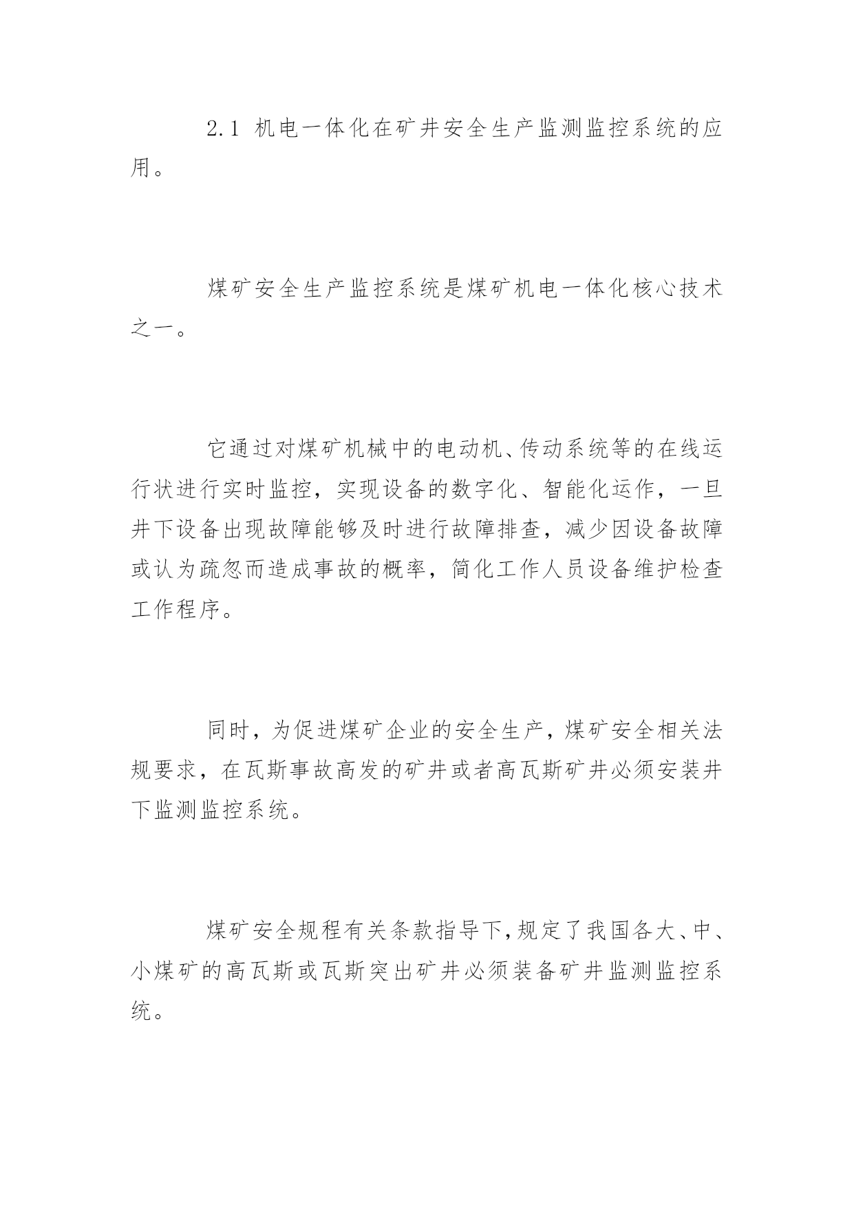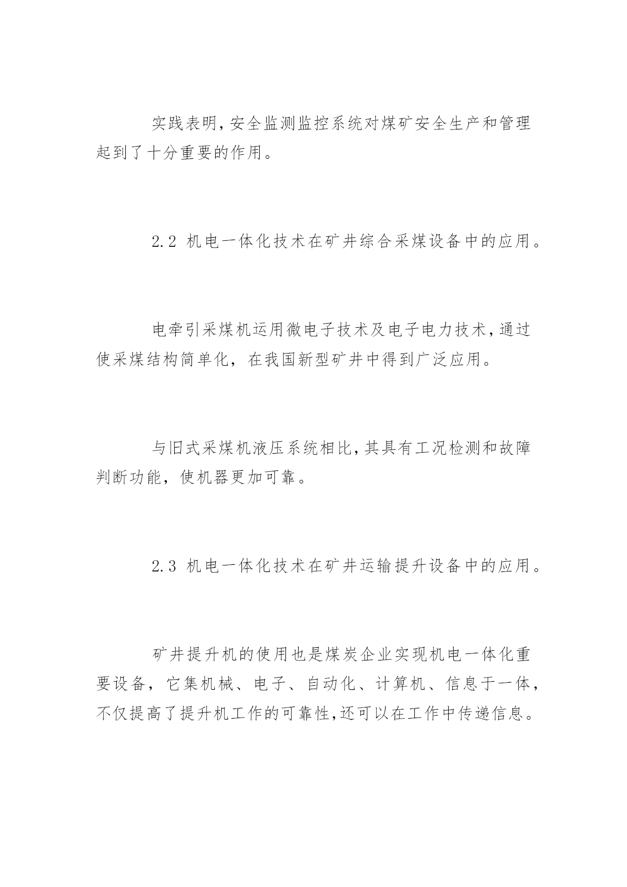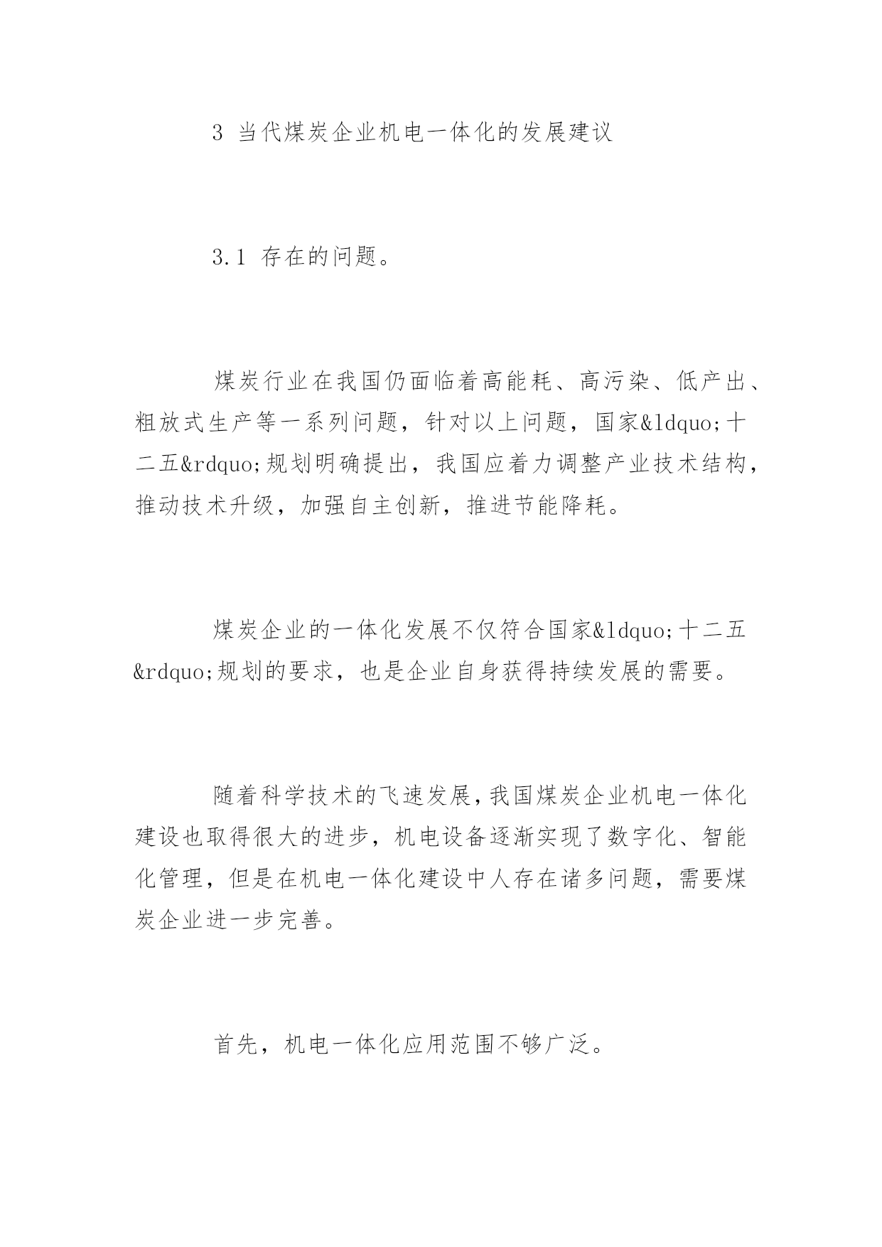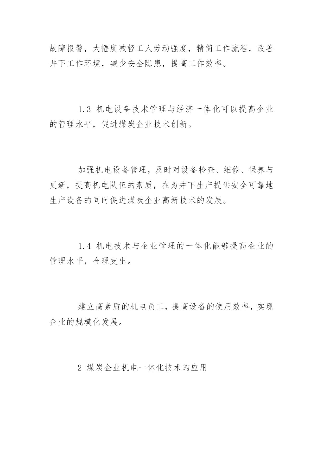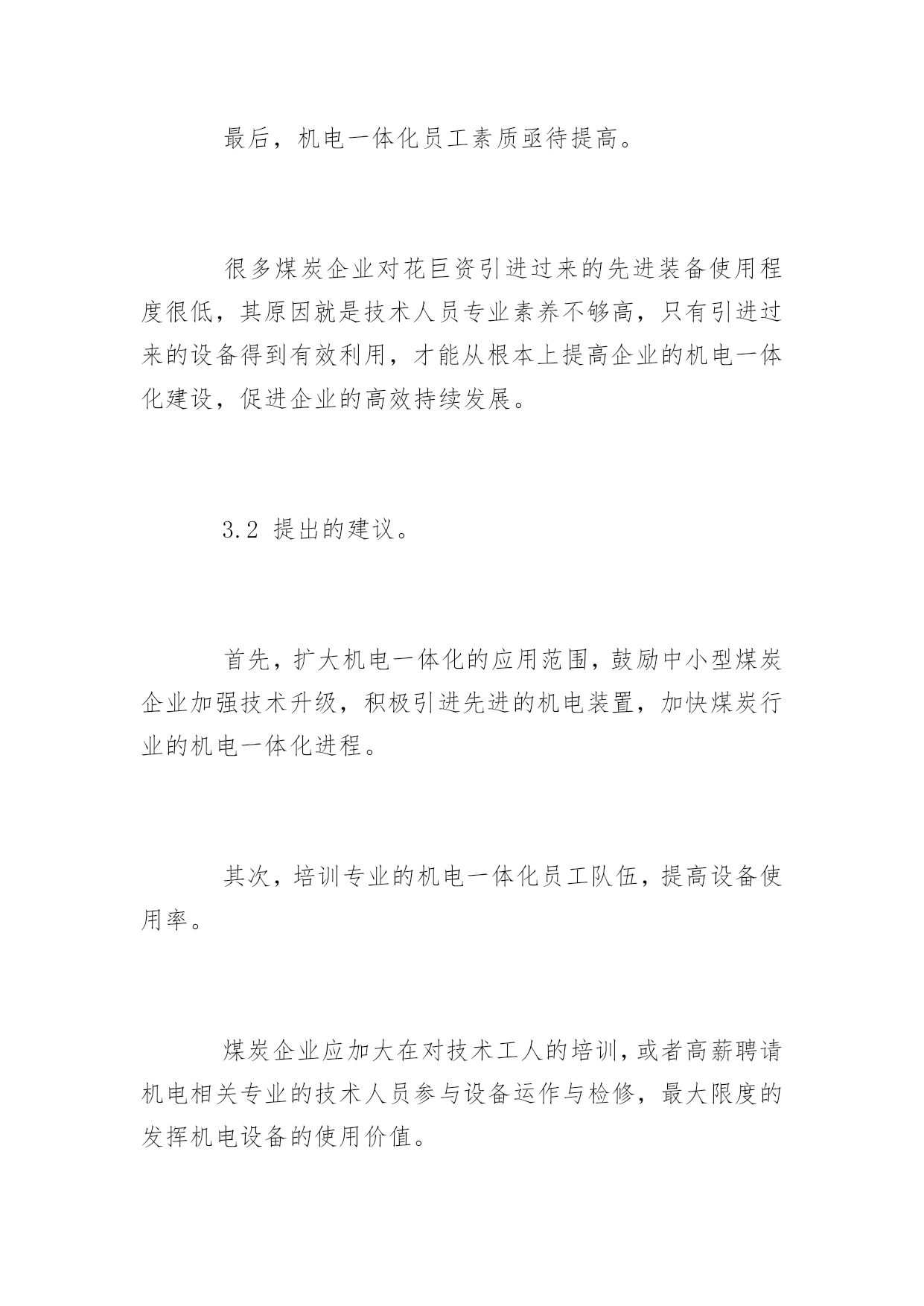 现代煤矿企业的机电一体化现代煤矿企业的机电一体化现代煤矿企业的机电一体化,下面带来现代煤矿企业的机电一体化相关论文范文,欢迎阅读。现代煤矿企业的机电一体化【1】摘要:随着煤炭企业一体化技术的不断发展,煤矿企业的机械系统也有向一体化方向发展的趋势。加快煤炭企业机电一体化进程,不仅能够提高企业的生产效率,加快企业的技术结构调整,同时为保护环境、节约资源贡献自己的力量,最终实现企业的高效持续发展。关键词:现代煤矿机电机电一体化0引言机电一体化(机械电子工程学科)是以微电子技术为核心的高新技术的兴起而得到快速发展,是从系统论的角度出发,机电一体化将机械装置与电子化设计及软件结合,各方合理配置,达到系统最优运作状态,提高煤矿机电产品的性能。随着矿开采深度及难度的加大,井下机电设备一体化、机电技术一体化、机电设备技术管理与经济一体化成为打造现代高效、安全、绿色矿井的必备要素,是提升煤炭企业核心竞争力的关键。1煤矿企业实现机电一体化的意义煤炭企业的机电一体化,包括机电技术的一体化进程、机电技术管理的一体化与机电技术与企业管理的一体化对提高的综合实力意义重大。主要体现在以下四个方面:1.1机电技术一体化。先进的机电技术煤炭企业实现信息化、数字化、智能化的重要支撑技术,是矿山综合自动化的基础。技术的引进及创新可以增强企业的创新能力,先进机电一体化产品的研发,在增强企业核心竞争力的同时,也能促进整个我国煤炭行业的机电一体化进程。1.2机电设备的一体化。机电设备的一体化能够提高机械的自动化半自动化程度,减少人为因素造成的误差,提高生产效率,降低煤炭事故。机电设备自动控制系统的应用,可以实现在线检测,故障报警,大幅度减轻工人劳动强度,精简工作流程,改善井下工作环境,减少安全隐患,提高工作效率。1.3机电设备技术管理与经济一体化可以提高企业的管理水平,促进煤炭企业技术创新。加强机电设备管理,及时对设备检查、维修、保养与更新,提高机电队伍的素质,在为井下生产提供安全可靠地生产设备的同时促进煤炭企业高新技术的发展。1.4机电技术与企业管理的一体化能够提高企业的管理水平,合理支出。建立高素质的机电员工,提高设备的使用效率,实现企业的规模化发展。2煤炭企业机电一体化技术的应用2.1机电一体化在矿井安全生产监测监控系统的应用。煤矿安全生产监控系统是煤矿机电一体化核心技术之一。它通过对煤矿机械中的电动机、传动系统等的在线运行状进行实时监控,实现设备的数字化、智能化运作,一旦井下设备出现故障能够及时进行故障排查,减少因设备故障或认为疏忽而造成事故的概率,简化工作人员设备维护检查工作程序。同时,为促进煤矿企业的安全生产,煤矿安全相关法规要求,在瓦斯事故高发的矿井或者高瓦斯矿井必须安装井下监测监控系统。煤矿安全规程有关条款指导下,规定了我国各大、中、小煤矿的高瓦斯或瓦斯突出矿井必须装备矿井监测监控系统。实践表明,安全监测监控系统对煤矿安全生产和管理起到了十分重要的作用。2.2机电一体化技术在矿井综合采煤设备中的应用。电牵引采煤机运用微电子技术及电子电力技术,通过使采煤结构简单化,在我国新型矿井中得到广泛应用。与旧式采煤机液压系统相比,其具有工况检测和故障判断功能,使机器更加可靠。2.3机电一体化技术在矿井运输提升设备中的应用。矿井提升机的使用也是煤炭企业实现机电一体化重要设备,它集机械、电子、自动化、计算机、信息于一体,不仅提高了提升机工作的可靠性,还可以在工作中传递信息。采用交—交变频器供电的交流提升机使用两台计算机同时工作,相互检查,安全保护系统较为完善。由于其可实现故障记忆,安全性较高。2.4机电设备技术管理和机电一体化。设备的维修、更新、技术改造也是机电一体化不可或缺的重要步骤。煤炭企业不仅要积极引进先进技术,还要对设备进行定期检查、维修,使设备在寿命周期内正常运行。对设备进行维修必然会涉及到相关的费用支出,因此煤炭企业要培训或外聘专业的维修工人,对于有维修价值的设备及时维修,加强管理,杜绝浪费,节约相关方面的费用支出,提高经济效益。3当代煤炭企业机电一体化的发展建议3.1存在的问题。煤炭行业在我国仍面临着高能耗、高污染、低产出、粗放式生产等一系列问题,针对以上问题,国家“十二五”规划明确提出,我国应着力调整产业技术结构,推动技术升级,加强自主创新,推进节能降耗。煤炭企业的一体化发展不仅符合国家“十二五”规划的要求,也是企业自身获得持续发展的需要。随着科学技术的飞速发展,我国煤炭企业机电一体化建设也取得很大的进步,机电设备逐渐实现了数字化、智能化管理,但是在机电一体化建设中人存在诸多问题,需要煤炭企业进一步完善。