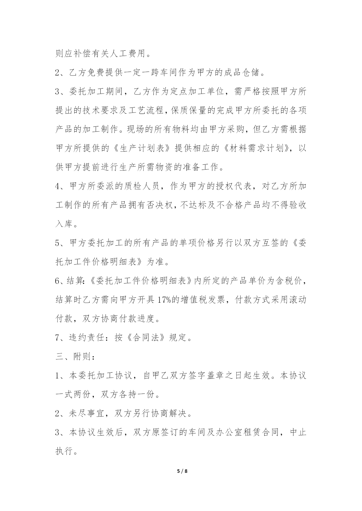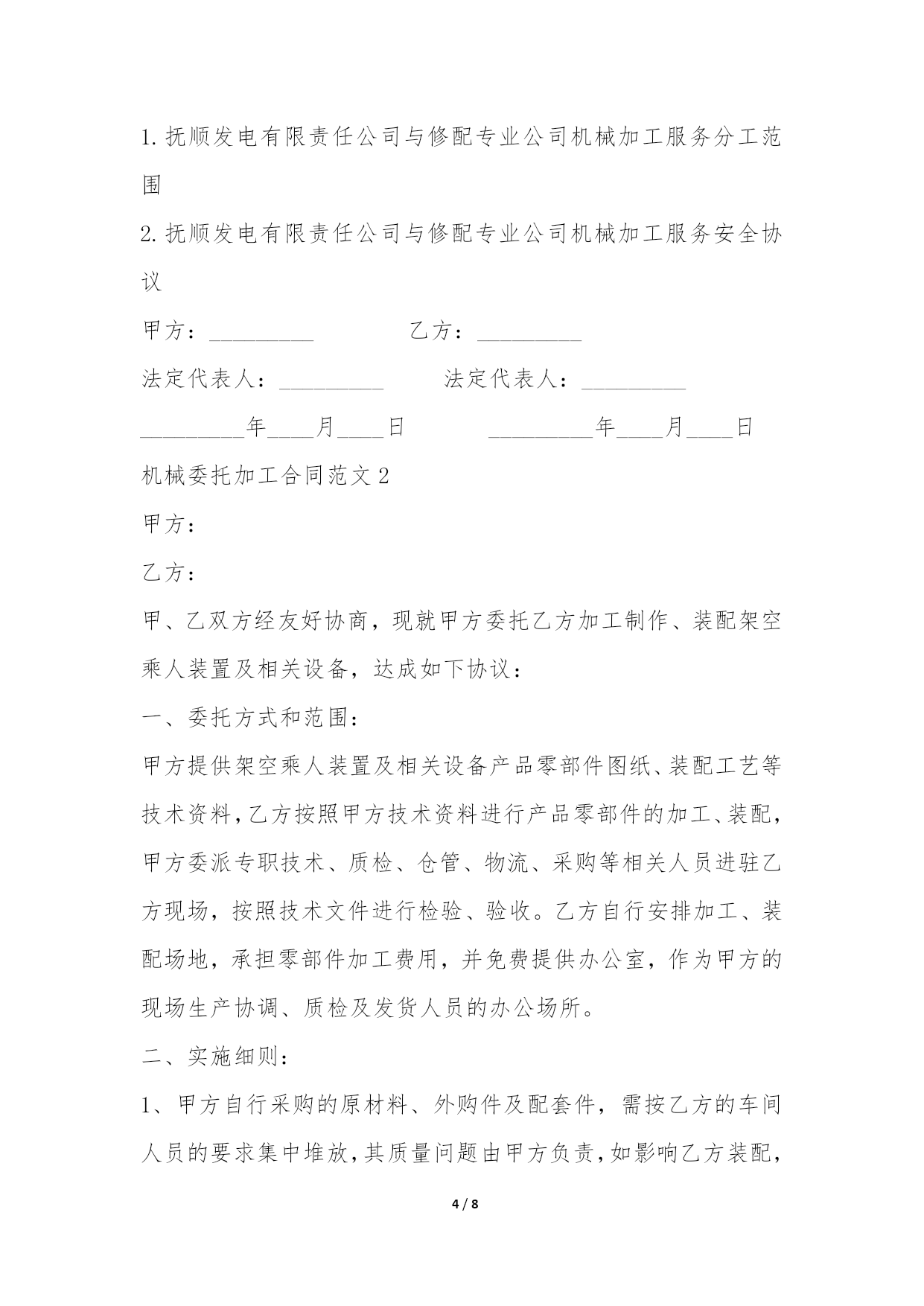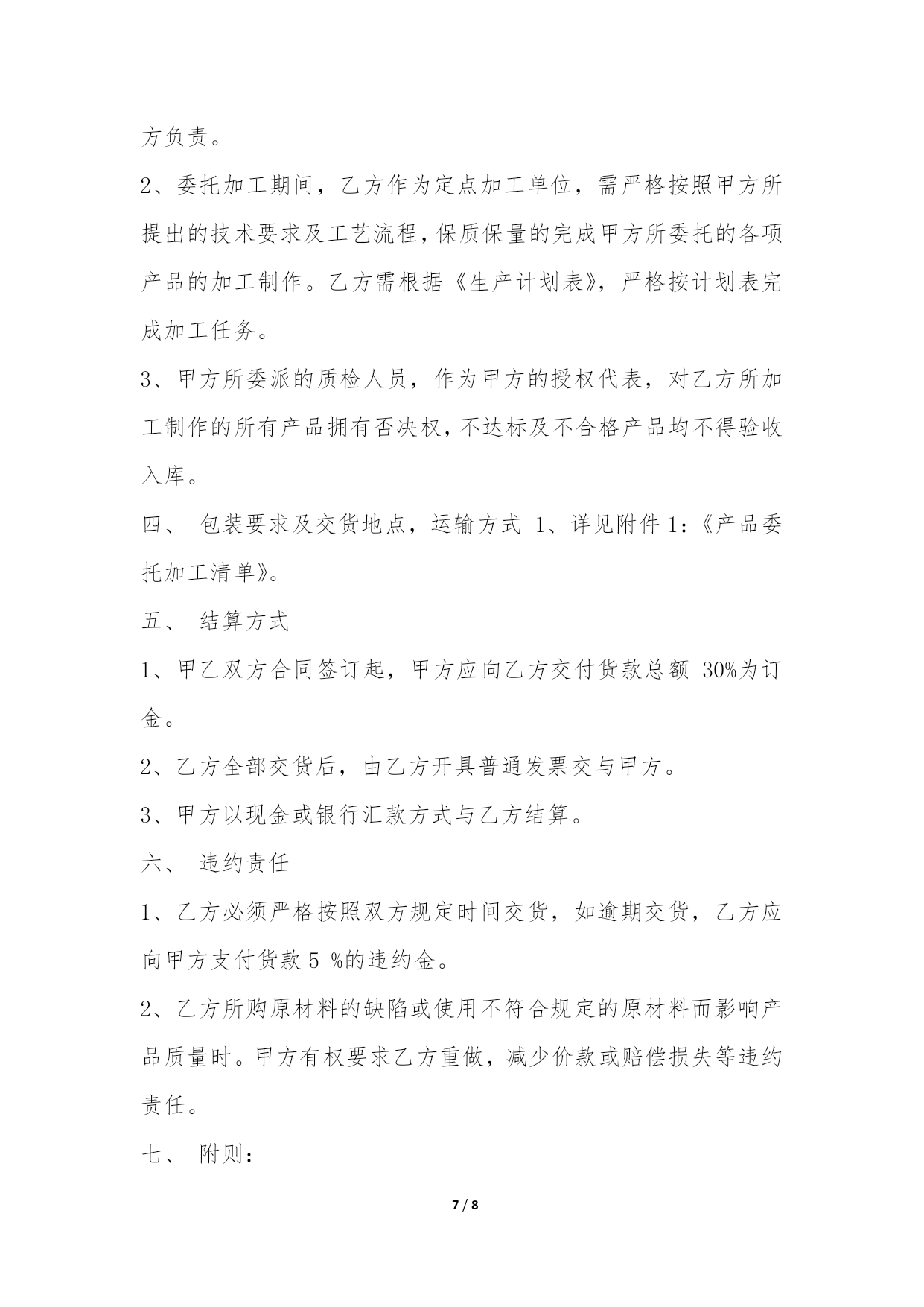 PAGE8/NUMPAGES8机械委托加工合同对机械制造企业而言,委托加工业务因其可以弥补产能不足,有效降低企业生产成本,保持和提高企业核心竞争力的优点,那么签订机械委托加工合同需要注意什么呢?以下是查字典我为大家整理的机械委托加工合同范文,欢迎参考阅读。机械委托加工合同范文1甲方:乙方:根据《中华人民共和国合同法》及有关规定,结合发电有限责任公司的具体情况,经双方协商一致,签订本合同,以资共同遵守。第一条工作范围与内容乙方为甲方提供24小时不间断程控电话通讯服务及市话直线服务;电话机移机服务,微波电路、调度总机、输煤调度系统、自动交换机、生产监控系统、生产用时钟显示系统等服务。第二条合同期限本合同期限一年。第三条承包方式包工不包料第四条合同总价本合同总价为人民币元整。第五条材料供应1.乙方负责本合同范围内所用材料的采购、运输、仓储保管及规定的材料鉴定试验;2.乙方采购的材料须符合国家或行业现行的有关标准,并符合国家及上级主管部门规定的进货渠道。第六条验收标准1.缺陷消除率100%;2.微波设备运行率为99.8%;3.交换设备运行率为99.9%;4.调度总机运行率为99.9%。第七条质量保证金1.本合同质量保证金为合同总价的10%;2.因乙方责任而不能履行合同或不能完全履行合同时扣除全部或部分质量保证金。第八条付款方式甲方按时间进度付款,付款时乙方需开具服务业发票,乙方在每月25日前补开当月差额部分发票,甲方在每月25日前结清当月90%的服务费,其余10%未付部分待质保期满,经验收合格后支付。第九条违约责任1.甲方不按本合同规定向乙方支付款项,应承担违约责任。2.乙方不能按照合同规定的进度完工或质量达不到合同规定的要求而使甲方蒙受重大经济损失,及未按本合同规定向甲方提交资料,应承担违约责任,赔偿因其违约给甲方造成的损失。第十条、争议或纠纷:因本合同的解释、违约等引起的任何争议或纠纷,应通过友好协商解决或委托专家鉴定。如仍未能解决,可提交仲裁机构仲裁,仲裁裁决是终局的,对合同双方都具有约束力。第十一条、不可抗力:由于双方不能预见并且对其发生和后果不能防止或避免的不可抗力,包括但不限于:地震、台风、水灾、火灾、战争以及其它,致使直接影响本合同的履行或者不能按约定的条件履行时,遇有上述不可抗力的一方应尽量设法使损失减少到最低程度,还应书面通知另一方,并应在15天内,提供事件详情及不能全面履行,或者需要延期履约的理由的有效证明文件。此项证明文件应由地区的公证机构出具。双方应按该事件对履行本协议的影响,通过协商决定是否免除或部分免除履行本协议的责任,或者延期履行本合同。第十二条合同变更:本合同签订后,如需修改,经双方协商一致后,可以签订补充协议,作为本合同的补充合同。第十三条附则:本合同一式肆份,双方各执两份,每份均具有同等的法律效力。本合同自签字盖章之日起生效,有效期一年。本合同的附件是本合同的组成部分,与合同具有同样的法律效率。本合同的附件有:1.抚顺发电有限责任公司与修配专业公司机械加工服务分工范围2.抚顺发电有限责任公司与修配专业公司机械加工服务安全协议甲方:_________乙方:_________法定代表人:_________法定代表人:__________________年____月____日_________年____月____日机械委托加工合同范文2甲方:乙方:甲、乙双方经友好协商,现就甲方委托乙方加工制作、装配架空乘人装置及相关设备,达成如下协议:一、委托方式和范围:甲方提供架空乘人装置及相关设备产品零部件图纸、装配工艺等技术资料,乙方按照甲方技术资料进行产品零部件的加工、装配,甲方委派专职技术、质检、仓管、物流、采购等相关人员进驻乙方现场,按照技术文件进行检验、验收。乙方自行安排加工、装配场地,承担零部件加工费用,并免费提供办公室,作为甲方的现场生产协调、质检及发货人员的办公场所。二、实施细则:1、甲方自行采购的原材料、外购件及配套件,需按乙方的车间人员的要求集中堆放,其质量问题由甲方负责,如影响乙方装配,则应补偿有关人工费用。2、乙方免费提供一定一跨车间作为甲方的成品仓储。3、委托加工期间,乙方作为定点加工单位,需严格按照甲方所提出的技术要求及工艺流程,保质保量的完成甲方所委托的各项产品的加工制作。现场的所有物料均由甲方采购,但乙方需根据甲方所提供的《生产计划表》提供相应的《材料需求计划》,以供甲方提前进行生产所需物资的准备工作。4、甲方所委派的质检人员,作为甲方的授权代表,对乙方所加工制作的所有产品拥有否决权,不达标及不合格产品均不得验收入库。5、甲方委托加工的所有产品的单项价格另行以双方互签的《委托加工件价格明细表》为准。6、结算:《委托加工件价格明细表》内所定的产品单价为含税价,结算时乙