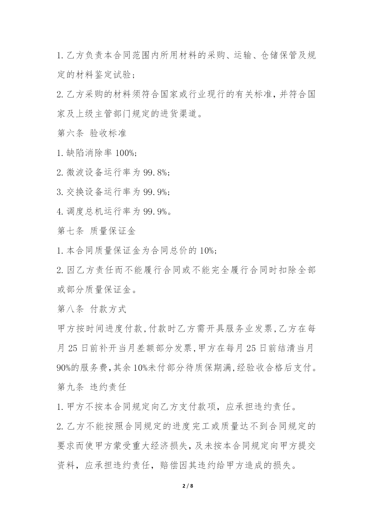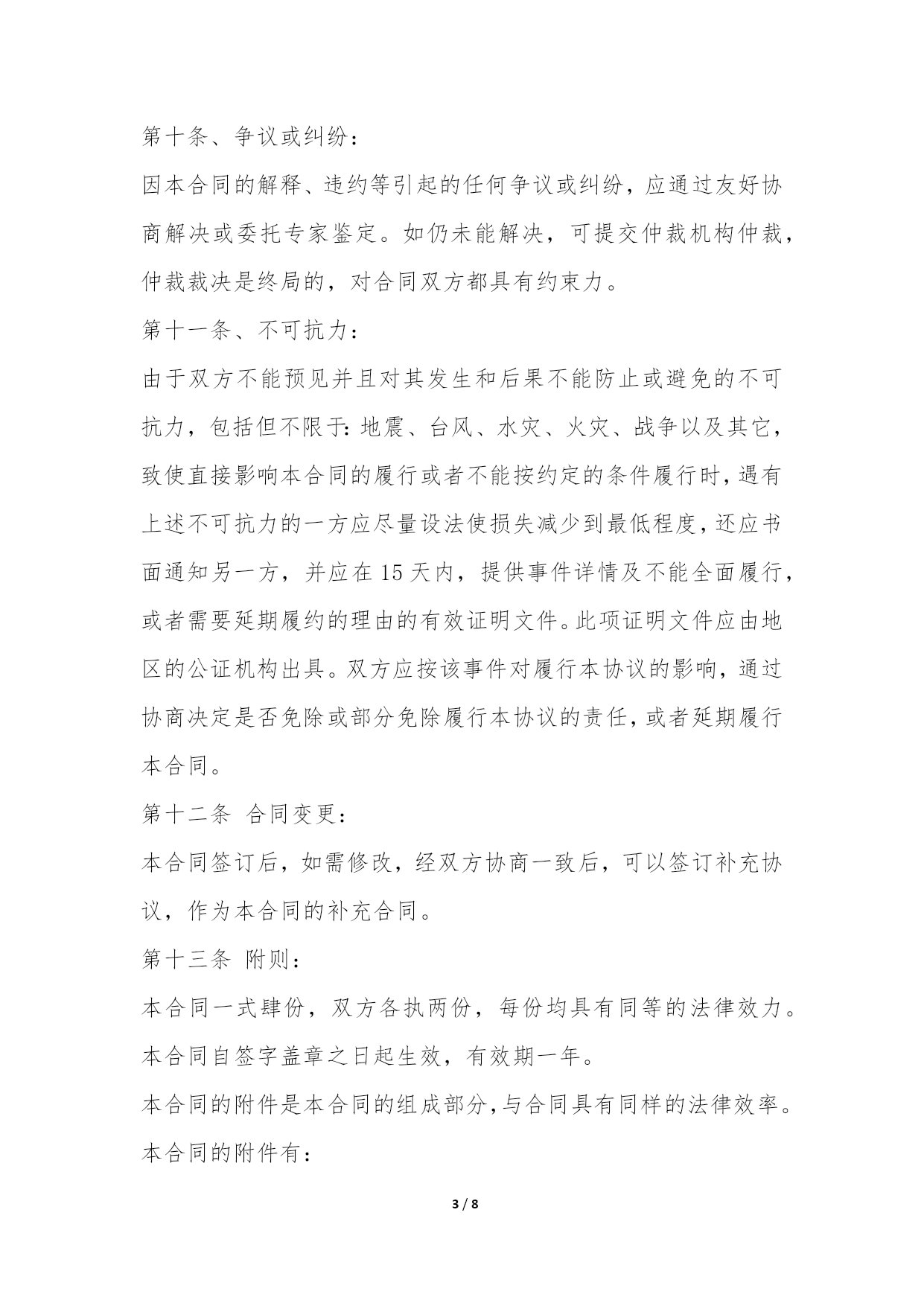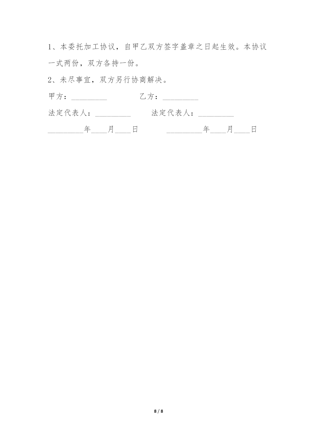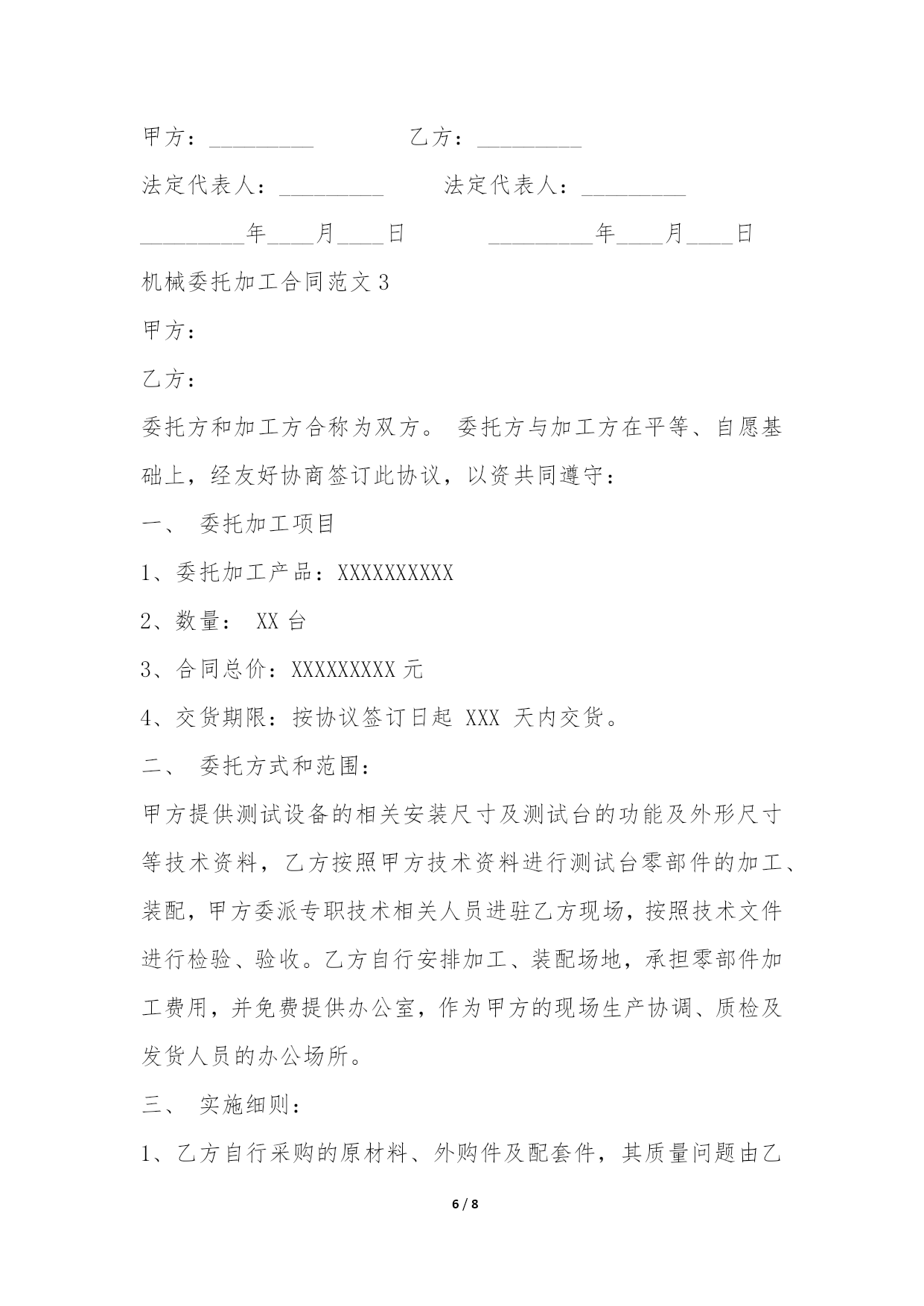 PAGE8/NUMPAGES8机械委托加工合同对机械制造企业而言,委托加工业务因其可以弥补产能不足,有效降低企业生产成本,保持和提高企业核心竞争力的优点,那么签订机械委托加工合同需要注意什么呢?以下是查字典我为大家整理的机械委托加工合同范文,欢迎参考阅读。机械委托加工合同范文1甲方:乙方:根据《中华人民共和国合同法》及有关规定,结合发电有限责任公司的具体情况,经双方协商一致,签订本合同,以资共同遵守。第一条工作范围与内容乙方为甲方提供24小时不间断程控电话通讯服务及市话直线服务;电话机移机服务,微波电路、调度总机、输煤调度系统、自动交换机、生产监控系统、生产用时钟显示系统等服务。第二条合同期限本合同期限一年。第三条承包方式包工不包料第四条合同总价本合同总价为人民币元整。第五条材料供应1.乙方负责本合同范围内所用材料的采购、运输、仓储保管及规定的材料鉴定试验;2.乙方采购的材料须符合国家或行业现行的有关标准,并符合国家及上级主管部门规定的进货渠道。第六条验收标准1.缺陷消除率100%;2.微波设备运行率为99.8%;3.交换设备运行率为99.9%;4.调度总机运行率为99.9%。第七条质量保证金1.本合同质量保证金为合同总价的10%;2.因乙方责任而不能履行合同或不能完全履行合同时扣除全部或部分质量保证金。第八条付款方式甲方按时间进度付款,付款时乙方需开具服务业发票,乙方在每月25日前补开当月差额部分发票,甲方在每月25日前结清当月90%的服务费,其余10%未付部分待质保期满,经验收合格后支付。第九条违约责任1.甲方不按本合同规定向乙方支付款项,应承担违约责任。2.乙方不能按照合同规定的进度完工或质量达不到合同规定的要求而使甲方蒙受重大经济损失,及未按本合同规定向甲方提交资料,应承担违约责任,赔偿因其违约给甲方造成的损失。第十条、争议或纠纷:因本合同的解释、违约等引起的任何争议或纠纷,应通过友好协商解决或委托专家鉴定。如仍未能解决,可提交仲裁机构仲裁,仲裁裁决是终局的,对合同双方都具有约束力。第十一条、不可抗力:由于双方不能预见并且对其发生和后果不能防止或避免的不可抗力,包括但不限于:地震、台风、水灾、火灾、战争以及其它,致使直接影响本合同的履行或者不能按约定的条件履行时,遇有上述不可抗力的一方应尽量设法使损失减少到最低程度,还应书面通知另一方,并应在15天内,提供事件详情及不能全面履行,或者需要延期履约的理由的有效证明文件。此项证明文件应由地区的公证机构出具。双方应按该事件对履行本协议的影响,通过协商决定是否免除或部分免除履行本协议的责任,或者延期履行本合同。第十二条合同变更:本合同签订后,如需修改,经双方协商一致后,可以签订补充协议,作为本合同的补充合同。第十三条附则:本合同一式肆份,双方各执两份,每份均具有同等的法律效力。本合同自签字盖章之日起生效,有效期一年。本合同的附件是本合同的组成部分,与合同具有同样的法律效率。本合同的附件有:1.抚顺发电有限责任公司与修配专业公司机械加工服务分工范围2.抚顺发电有限责任公司与修配专业公司机械加工服务安全协议甲方:_________乙方:_________法定代表人:_________法定代表人:__________________年____月____日_________年____月____日机械委托加工合同范文2甲方:乙方:甲、乙双方经友好协商,现就甲方委托乙方加工制作、装配架空乘人装置及相关设备,达成如下协议:一、委托方式和范围:甲方提供架空乘人装置及相关设备产品零部件图纸、装配工艺等技术资料,乙方按照甲方技术资料进行产品零部件的加工、装配,甲方委派专职技术、质检、仓管、物流、采购等相关人员进驻乙方现场,按照技术文件进行检验、验收。乙方自行安排加工、装配场地,承担零部件加工费用,并免费提供办公室,作为甲方的现场生产协调、质检及发货人员的办公场所。二、实施细则:1、甲方自行采购的原材料、外购件及配套件,需按乙方的车间人员的要求集中堆放,其质量问题由甲方负责,如影响乙方装配,则应补偿有关人工费用。2、乙方免费提供一定一跨车间作为甲方的成品仓储。3、委托加工期间,乙方作为定点加工单位,需严格按照甲方所提出的技术要求及工艺流程,保质保量的完成甲方所委托的各项产品的加工制作。现场的所有物料均由甲方采购,但乙方需根据甲方所提供的《生产计划表》提供相应的《材料需求计划》,以供甲方提前进行生产所需物资的准备工作。4、甲方所委派的质检人员,作为甲方的授权代表,对乙方所加工制作的所有产品拥有否决权,不达标及不合格产品均不得验收入库。5、甲方委托加工的所有产品的单项价格另行以双方互签的《委托加工件价格明细表》为准。6、结算:《委托加工件价格明细表》内所定的产品单价为含税价,结算时乙