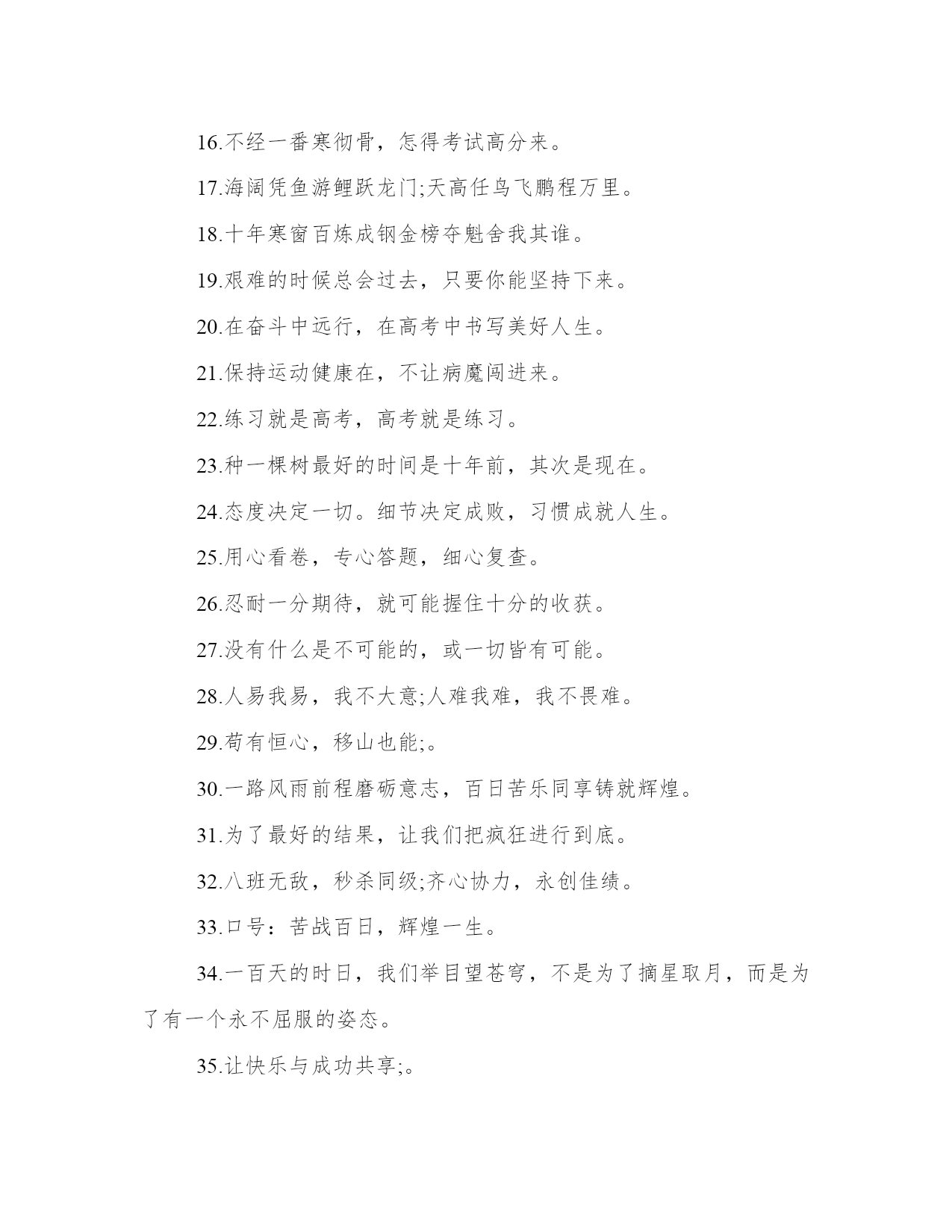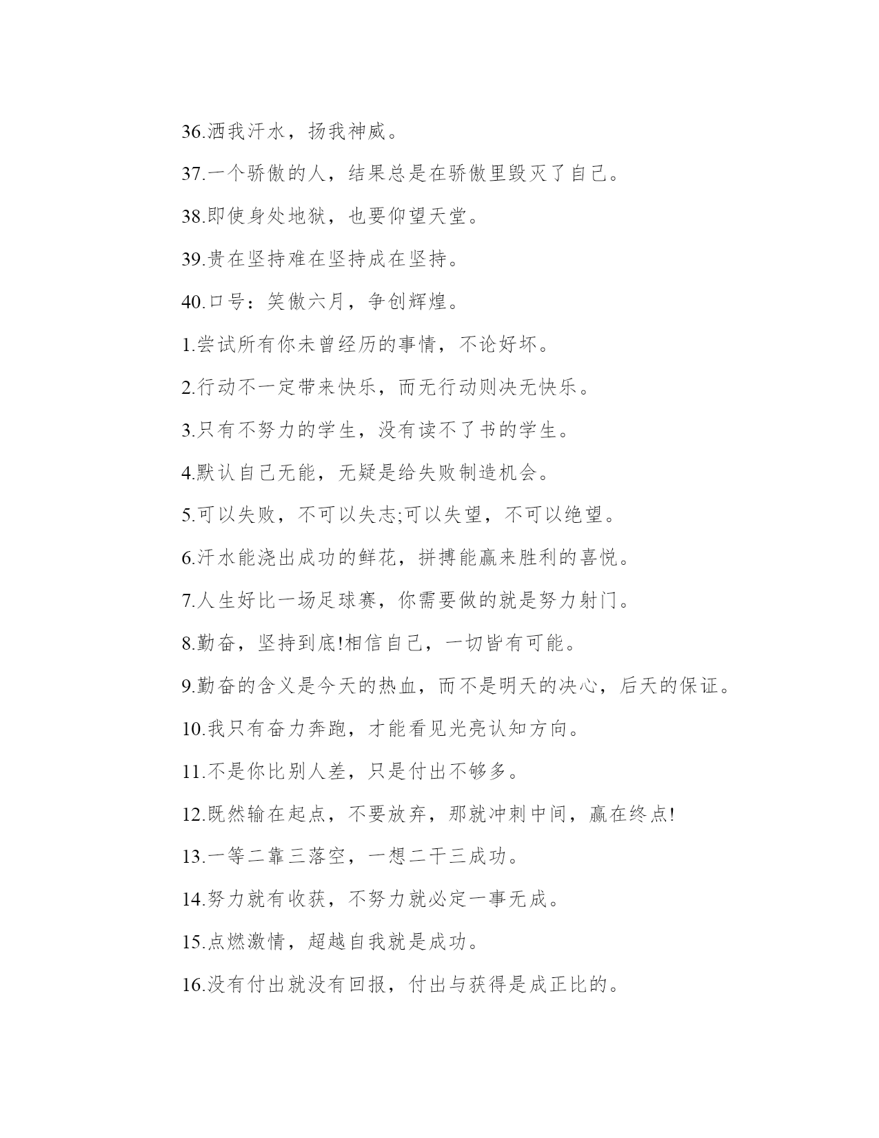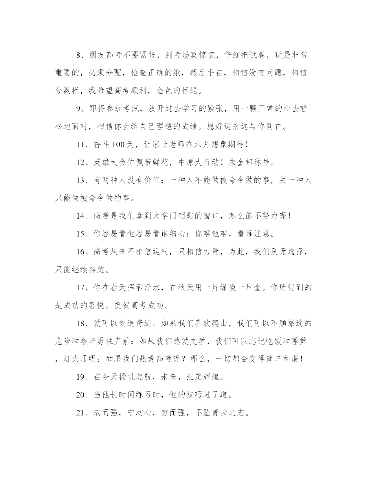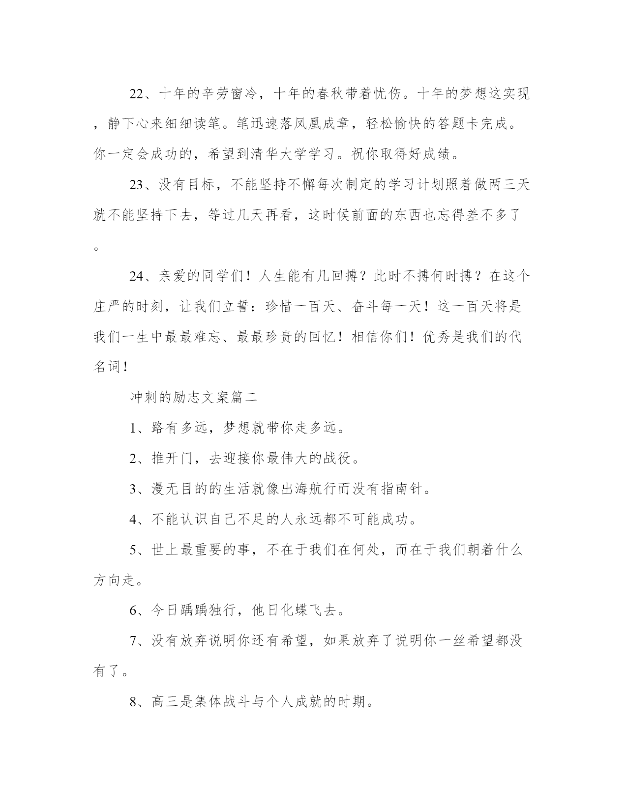 最新冲刺的励志文案(精选14篇)每个人都曾试图在平淡的学习、工作和生活中写一篇文章。写作是培养人的观察、联想、想象、思维和记忆的重要手段。相信许多人会觉得范文很难写?以下是我为大家搜集的优质范文,仅供参考,一起来看看吧冲刺的励志文案篇一1、心态良好,身体健康;发挥优势,填补劣势,高考必胜。2、奋斗88天,夺取高考胜利,考上理想的大学。3、高考没有不及格的事。它带给每个人的深刻的思考和难忘的经历和感受,是宝贵的财富。为我们的理想而奋斗的进程所带来的好处远远超过未知的后果。4、亲爱的同学们,我们在一起这么久了,是你们为我付出了代价。我没有为你做什么下辈子如果做牛做马,我一定要为你除草吃!高考进行得很顺利。5、愿你成为自己的梦想家,勇敢的梦想,勇敢的生活。6、6月大片(高考)今天,全体高三学生扮演“演员”,全体监考老师当“导演”,考生家长扮演“嘉宾”,考场是“电影院”,激情震撼,请准时观看。高考前,笑一笑,乐一乐,祝你高考顺利!7、花开花落,冬梅傲雪望春,春到春来风长浪迎高考。8、朋友高考不要紧张,到考场莫惊慌,仔细把试卷,玩是非常重要的,必须分配,检查正确的纸,然后手在,相信没有问题,相信分数栏,我希望高考顺利,金色的标题。9、即将参加考试,放开过去学习的紧张,用一颗正常的心去轻松地面对,相信你会给自己理想的成绩。愿好运永远与你同在。11、奋斗100天,让家长老师在六月想象期待!12、英雄大会你佩带鲜花,中原大行动!朱金邦称号。13、有两种人没有价值;一种人不能做被命令做的事,另一种人只能做被命令做的事。14、高考是我们拿到大学门钥匙的窗口,怎么能不努力呢!15、你容易看他容易看谁细心;你难他难,看谁注意。16、高考从来不相信运气,只相信力量,为此,我们别无选择,只能继续奔跑。17、你在春天挥洒汗水,在秋天用一片绿换一片金。你所得到的是成功的喜悦。祝贺高考成功。18、爱可以创造奇迹。如果我们喜欢爬山,我们可以不顾旅途的危险和艰辛勇往直前;如果我们热爱文学,我们可以忘记吃饭和睡觉,灯火通明;如果我们热爱高考呢?那么,一切都会变得简单和谐!19、在今天扬帆起航,未来,注定辉煌。20、当他长时间练习时,他的技巧进了道。21、老而强,宁动心,穷而强,不坠青云之志。22、十年的辛劳窗冷,十年的春秋带着忧伤。十年的梦想这实现,静下心来细细读笔。笔迅速落凤凰成章,轻松愉快的答题卡完成。你一定会成功的,希望到清华大学学习。祝你取得好成绩。23、没有目标,不能坚持不懈每次制定的学习计划照着做两三天就不能坚持下去,等过几天再看,这时候前面的东西也忘得差不多了。24、亲爱的同学们!人生能有几回搏?此时不搏何时搏?在这个庄严的时刻,让我们立誓:珍惜一百天、奋斗每一天!这一百天将是我们一生中最最难忘、最最珍贵的回忆!相信你们!优秀是我们的代名词!冲刺的励志文案篇二1、路有多远,梦想就带你走多远。2、推开门,去迎接你最伟大的战役。3、漫无目的的生活就像出海航行而没有指南针。4、不能认识自己不足的人永远都不可能成功。5、世上最重要的事,不在于我们在何处,而在于我们朝着什么方向走。6、今日踽踽独行,他日化蝶飞去。7、没有放弃说明你还有希望,如果放弃了说明你一丝希望都没有了。8、高三是集体战斗与个人成就的时期。9、谁要游戏人生,他就一事无成;谁不能主宰自己,永远是一个奴隶。10、高考不丢分,勤学为其根。11、用今天的泪播种,收获明天的微笑。12、决战高考,改变命运。屡挫屡战,笑傲群雄。13、笔记要便于看,要经常看,这是又一本教材。14、没有人喜欢考试,但是社会中都需要考试。15、不思,故有惑;不求,故无得;不问,故不知。16、环境不会改变,解决之道在于改变自己。17、考前一个月就是冲刺。养兵千日,用兵一时。18、愿你成为自己的太阳,无需凭借谁的光。19、奋斗没有终点,任何时候都是起点。20、拼一载春秋,搏一生无悔。21、最淡的墨水也胜过的记忆。22、奇迹,不过是努力的另一名字。23、怕什么真理无穷,进一步有进一步的欢喜。24、凌晨的月亮很美,像极了夜灯下的你。25、今朝有心苦勤奋,明朝一举步青云。26、在人生第一个叉路口上,转出一个漂亮的.弯!27、当有人说你是傻瓜时,证明你离成功不远了。28、过去的是远了淡了的暮霭,未来的是近了亮了的晨光。29、人生最大的敌人就是我们自己,让我们超越自我,挑战极限,决胜考场!30、微笑面对高考,成功已在眉睫。31、载拼搏,一朝同梦;百日会战,三天定夺。32、遇到会做的题:仔细;遇到不会做的题:冷静。33、人不能要求环境适应自己,只能自己适应环境。34、鲲鹏之志,挥毫纸间,一跃龙门,得偿所愿。35、每个人都是