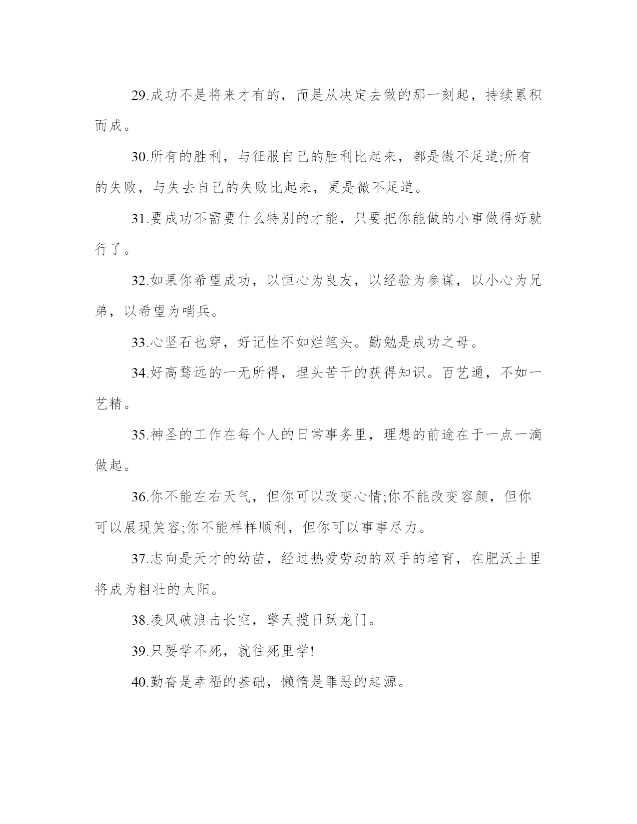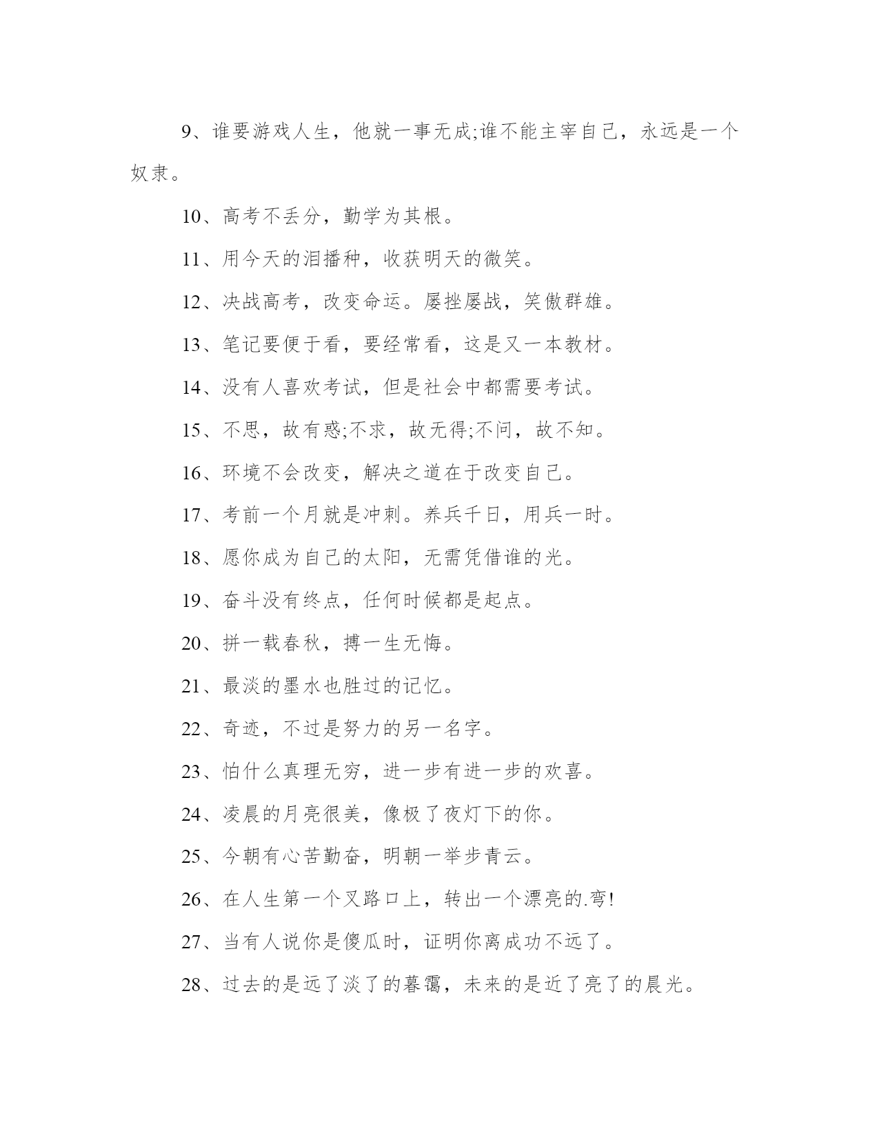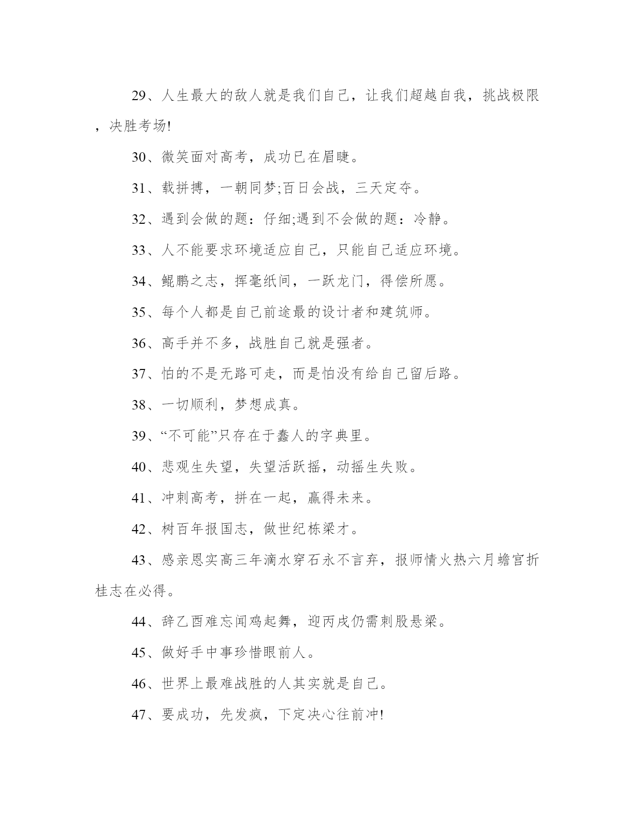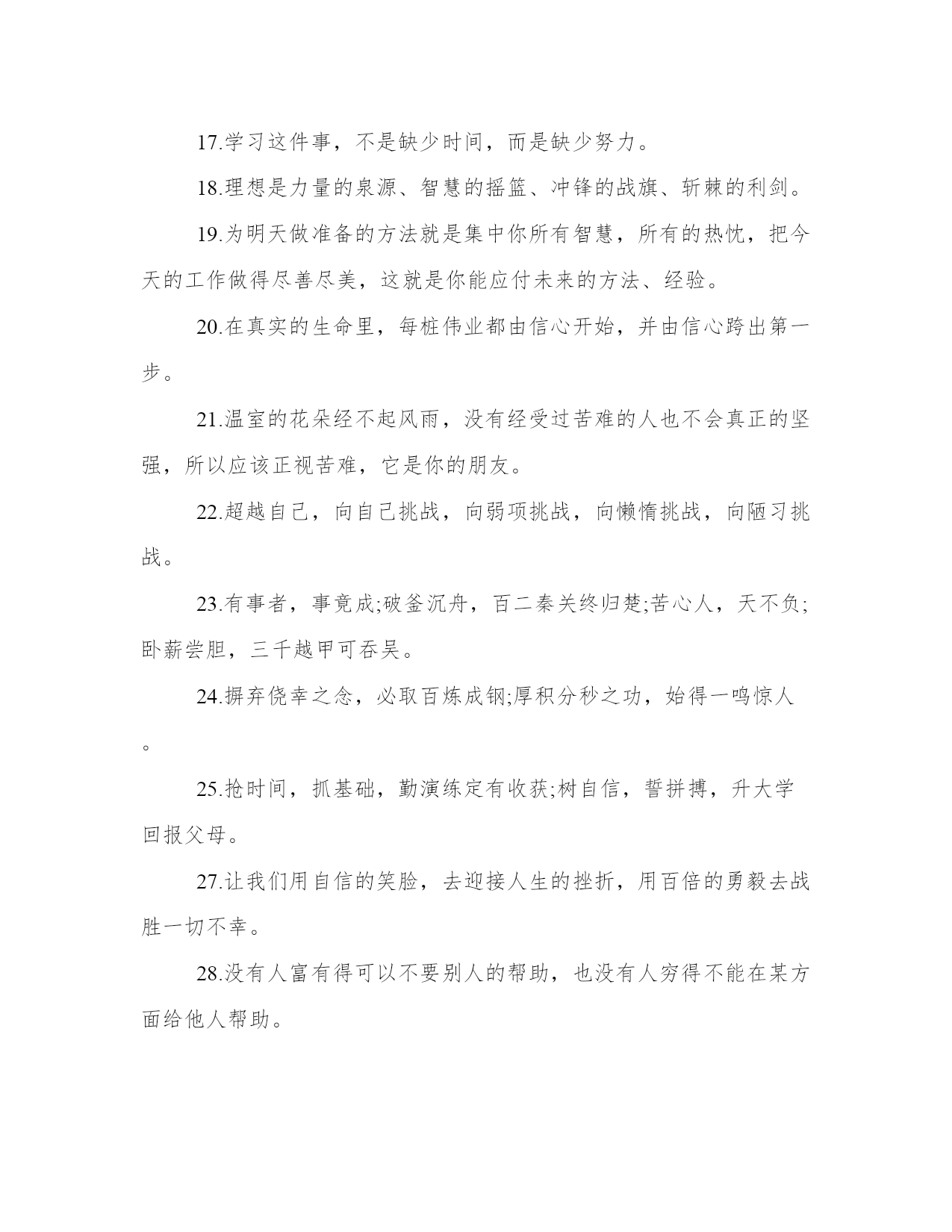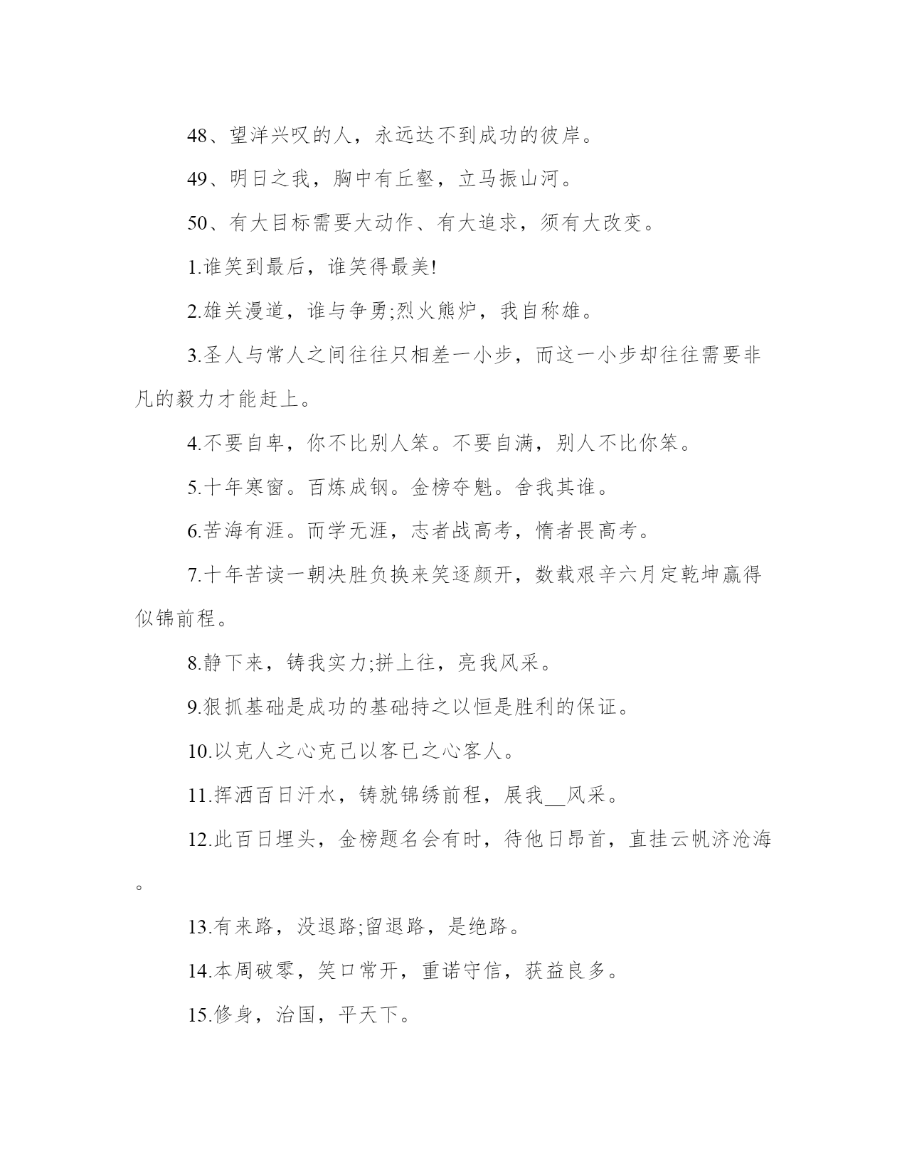 最新冲刺的励志文案(精选14篇)每个人都曾试图在平淡的学习、工作和生活中写一篇文章。写作是培养人的观察、联想、想象、思维和记忆的重要手段。相信许多人会觉得范文很难写?以下是我为大家搜集的优质范文,仅供参考,一起来看看吧冲刺的励志文案篇一1、心态良好,身体健康;发挥优势,填补劣势,高考必胜。2、奋斗88天,夺取高考胜利,考上理想的大学。3、高考没有不及格的事。它带给每个人的深刻的思考和难忘的经历和感受,是宝贵的财富。为我们的理想而奋斗的进程所带来的好处远远超过未知的后果。4、亲爱的同学们,我们在一起这么久了,是你们为我付出了代价。我没有为你做什么下辈子如果做牛做马,我一定要为你除草吃!高考进行得很顺利。5、愿你成为自己的梦想家,勇敢的梦想,勇敢的生活。6、6月大片(高考)今天,全体高三学生扮演“演员”,全体监考老师当“导演”,考生家长扮演“嘉宾”,考场是“电影院”,激情震撼,请准时观看。高考前,笑一笑,乐一乐,祝你高考顺利!7、花开花落,冬梅傲雪望春,春到春来风长浪迎高考。8、朋友高考不要紧张,到考场莫惊慌,仔细把试卷,玩是非常重要的,必须分配,检查正确的纸,然后手在,相信没有问题,相信分数栏,我希望高考顺利,金色的标题。9、即将参加考试,放开过去学习的紧张,用一颗正常的心去轻松地面对,相信你会给自己理想的成绩。愿好运永远与你同在。11、奋斗100天,让家长老师在六月想象期待!12、英雄大会你佩带鲜花,中原大行动!朱金邦称号。13、有两种人没有价值;一种人不能做被命令做的事,另一种人只能做被命令做的事。14、高考是我们拿到大学门钥匙的窗口,怎么能不努力呢!15、你容易看他容易看谁细心;你难他难,看谁注意。16、高考从来不相信运气,只相信力量,为此,我们别无选择,只能继续奔跑。17、你在春天挥洒汗水,在秋天用一片绿换一片金。你所得到的是成功的喜悦。祝贺高考成功。18、爱可以创造奇迹。如果我们喜欢爬山,我们可以不顾旅途的危险和艰辛勇往直前;如果我们热爱文学,我们可以忘记吃饭和睡觉,灯火通明;如果我们热爱高考呢?那么,一切都会变得简单和谐!19、在今天扬帆起航,未来,注定辉煌。20、当他长时间练习时,他的技巧进了道。21、老而强,宁动心,穷而强,不坠青云之志。22、十年的辛劳窗冷,十年的春秋带着忧伤。十年的梦想这实现,静下心来细细读笔。笔迅速落凤凰成章,轻松愉快的答题卡完成。你一定会成功的,希望到清华大学学习。祝你取得好成绩。23、没有目标,不能坚持不懈每次制定的学习计划照着做两三天就不能坚持下去,等过几天再看,这时候前面的东西也忘得差不多了。24、亲爱的同学们!人生能有几回搏?此时不搏何时搏?在这个庄严的时刻,让我们立誓:珍惜一百天、奋斗每一天!这一百天将是我们一生中最最难忘、最最珍贵的回忆!相信你们!优秀是我们的代名词!冲刺的励志文案篇二1、路有多远,梦想就带你走多远。2、推开门,去迎接你最伟大的战役。3、漫无目的的生活就像出海航行而没有指南针。4、不能认识自己不足的人永远都不可能成功。5、世上最重要的事,不在于我们在何处,而在于我们朝着什么方向走。6、今日踽踽独行,他日化蝶飞去。7、没有放弃说明你还有希望,如果放弃了说明你一丝希望都没有了。8、高三是集体战斗与个人成就的时期。9、谁要游戏人生,他就一事无成;谁不能主宰自己,永远是一个奴隶。10、高考不丢分,勤学为其根。11、用今天的泪播种,收获明天的微笑。12、决战高考,改变命运。屡挫屡战,笑傲群雄。13、笔记要便于看,要经常看,这是又一本教材。14、没有人喜欢考试,但是社会中都需要考试。15、不思,故有惑;不求,故无得;不问,故不知。16、环境不会改变,解决之道在于改变自己。17、考前一个月就是冲刺。养兵千日,用兵一时。18、愿你成为自己的太阳,无需凭借谁的光。19、奋斗没有终点,任何时候都是起点。20、拼一载春秋,搏一生无悔。21、最淡的墨水也胜过的记忆。22、奇迹,不过是努力的另一名字。23、怕什么真理无穷,进一步有进一步的欢喜。24、凌晨的月亮很美,像极了夜灯下的你。25、今朝有心苦勤奋,明朝一举步青云。26、在人生第一个叉路口上,转出一个漂亮的.弯!27、当有人说你是傻瓜时,证明你离成功不远了。28、过去的是远了淡了的暮霭,未来的是近了亮了的晨光。29、人生最大的敌人就是我们自己,让我们超越自我,挑战极限,决胜考场!30、微笑面对高考,成功已在眉睫。31、载拼搏,一朝同梦;百日会战,三天定夺。32、遇到会做的题:仔细;遇到不会做的题:冷静。33、人不能要求环境适应自己,只能自己适应环境。34、鲲鹏之志,挥毫纸间,一跃龙门,得偿所愿。35、每个人都是