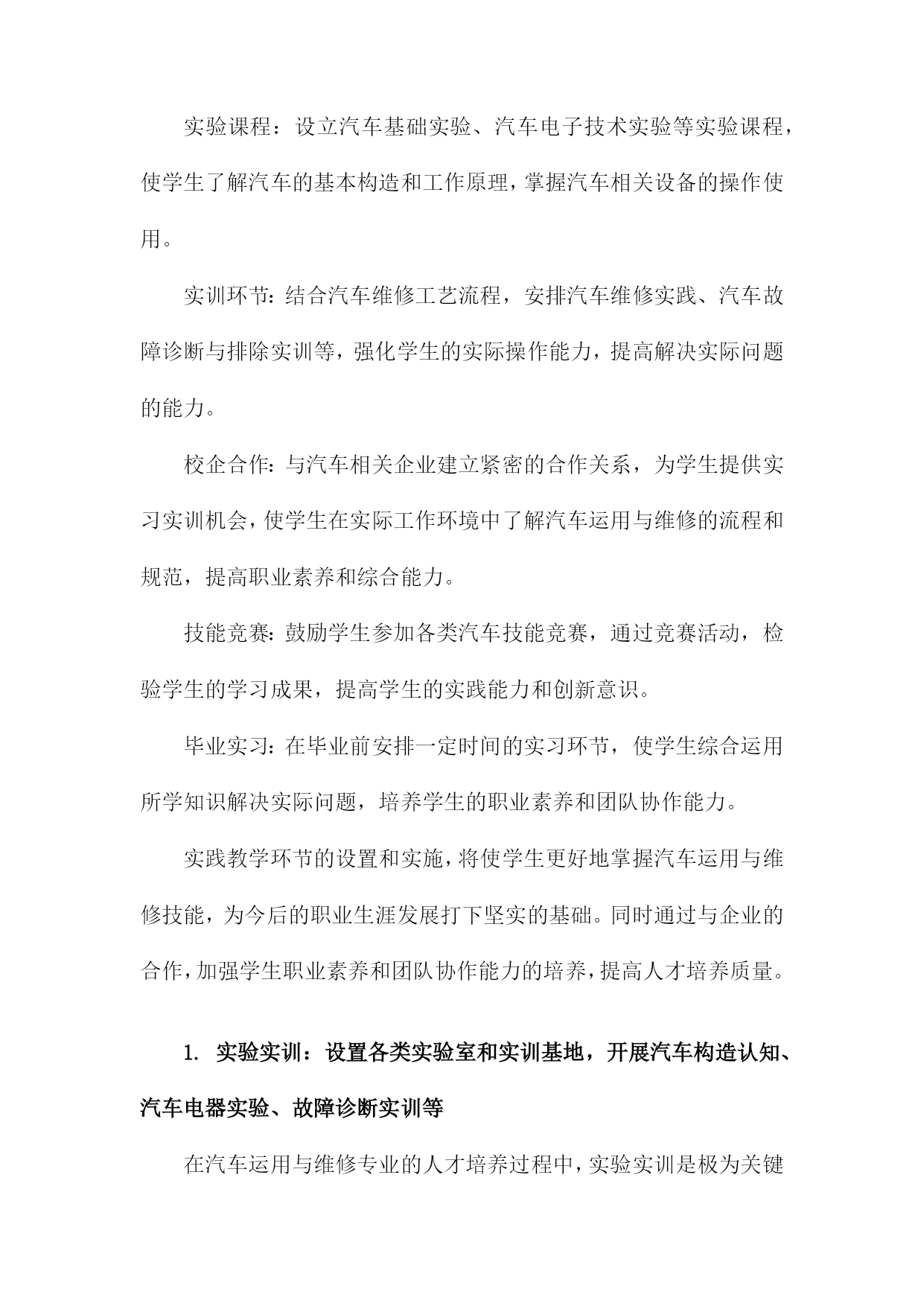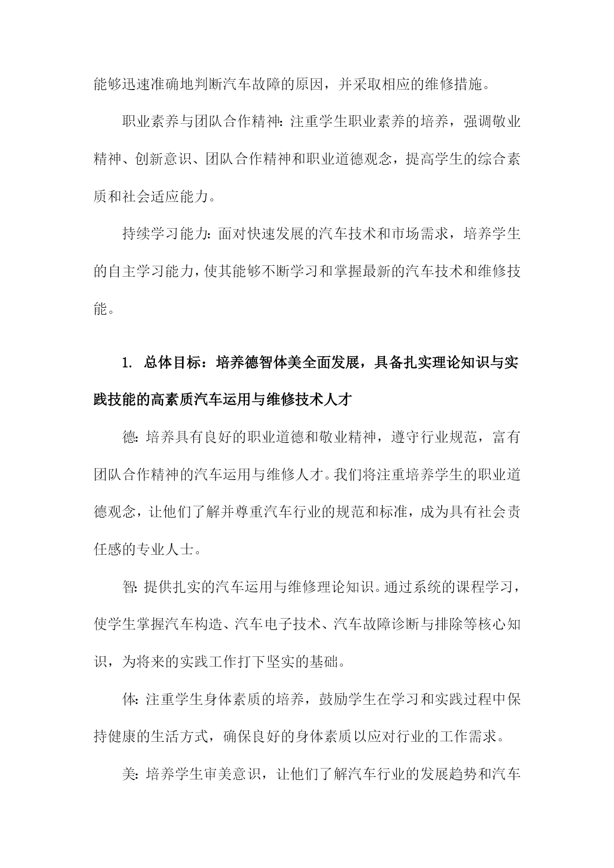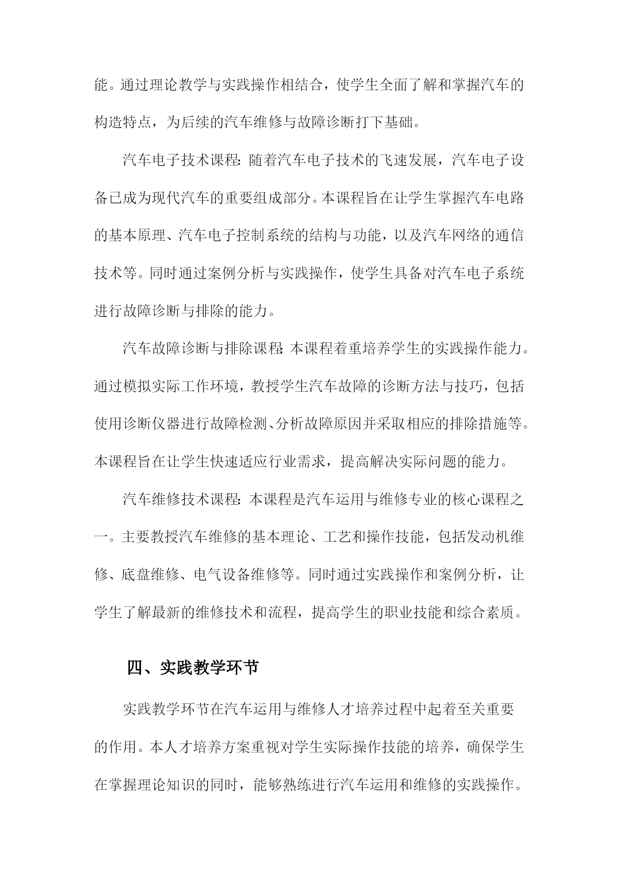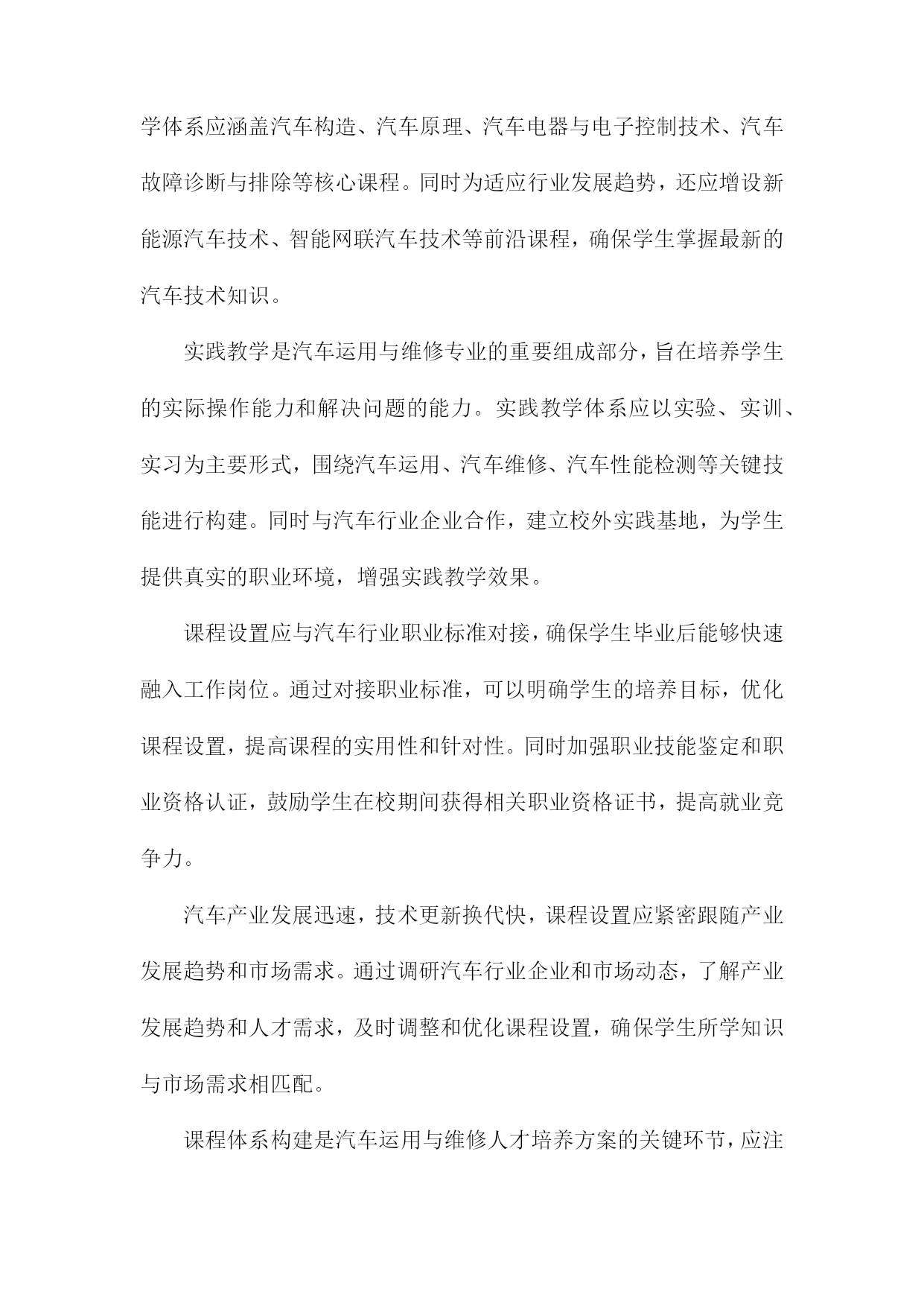 汽车运用与维修人才培养方案一、概括《汽车运用与维修人才培养方案》是一篇关于汽车专业人才培养的指导性文档,旨在提升汽车运用与维修领域的技术水平和专业能力,满足社会对高素质汽车维修人才的需求。本文方案概述了汽车运用与维修人才的培养目标、培养方式、课程设置、实践教学以及评价体系等方面的内容。在当前汽车市场迅猛发展的背景下,本方案着重强调理论与实践相结合的教学模式,注重培养学生的实际操作能力,以更好地适应汽车行业的需求。同时通过优化课程设置和强化实践教学,提高学生的综合素质和创新能力,为汽车行业的持续发展提供有力的人才支撑。二、人才培养目标掌握汽车技术知识:使学生全面掌握汽车运用技术和汽车维修技术,包括汽车发动机、底盘、电气设备、车身等方面的理论知识。实践操作技能培养:强调学生的实际操作能力,使学生具备独立解决实际问题的能力,熟悉汽车维修工艺流程和规范操作,能够在各类汽车维护、修理、调试工作中发挥重要作用。故障诊断与排除能力:培养学生掌握汽车故障诊断与排除的技能,能够迅速准确地判断汽车故障的原因,并采取相应的维修措施。职业素养与团队合作精神:注重学生职业素养的培养,强调敬业精神、创新意识、团队合作精神和职业道德观念,提高学生的综合素质和社会适应能力。持续学习能力:面对快速发展的汽车技术和市场需求,培养学生的自主学习能力,使其能够不断学习和掌握最新的汽车技术和维修技能。1.总体目标:培养德智体美全面发展,具备扎实理论知识与实践技能的高素质汽车运用与维修技术人才德:培养具有良好的职业道德和敬业精神,遵守行业规范,富有团队合作精神的汽车运用与维修人才。我们将注重培养学生的职业道德观念,让他们了解并尊重汽车行业的规范和标准,成为具有社会责任感的专业人士。智:提供扎实的汽车运用与维修理论知识。通过系统的课程学习,使学生掌握汽车构造、汽车电子技术、汽车故障诊断与排除等核心知识,为将来的实践工作打下坚实的基础。体:注重学生身体素质的培养,鼓励学生在学习和实践过程中保持健康的生活方式,确保良好的身体素质以应对行业的工作需求。美:培养学生审美意识,让他们了解汽车行业的发展趋势和汽车设计美学,提高他们在汽车造型设计、色彩搭配等方面的审美能力。实践技能:强化实践技能的培养,通过实验室实训、校企合作、顶岗实习等方式,使学生掌握汽车运用与汽车维修的实际操作技能,成为理论与实践并重的高素质技术人才。2.具体目标:掌握汽车基本原理、故障诊断、维修技术等方面的专业知识,具备独立解决实际问题的能力;具备良好的职业素养和团队合作精神,适应汽车行业发展趋势在汽车产业的蓬勃发展下,对汽车运用与汽车维修的专业人才的需求日益增长。为适应行业发展需求,提高人才培养质量,本汽车运用与维修人才培养方案设定了具体目标,旨在培养出掌握汽车基本原理、故障诊断、维修技术等方面的专业知识,具备独立解决实际问题的能力,同时具备良好的职业素养和团队合作精神的专业人才。本方案的首要目标是使学员全面掌握汽车基本原理,包括汽车发动机、底盘、电器、车身等各个部分的工作原理和构造。这需要学员通过系统学习汽车理论知识,理解汽车各系统的运行规律,为后续的故障诊断和维修打下坚实的基础。掌握故障诊断和维修技术是汽车运用与维修专业人才的核心能力。学员需要通过实践学习和案例分析,熟悉各种汽车故障的表现和原因,掌握使用诊断工具和设备进行故障诊断的方法,以及针对不同故障进行维修的技术和流程。独立解决问题的能力是人才培养的重要目标,学员不仅需要掌握理论知识,还需要能够将理论知识应用于实践,独立解决汽车运用和维修过程中遇到的实际问题。这需要学员具备丰富的实践经验,灵活应用所学知识,创新解决问题。职业素养是人才发展的基础,良好的职业素养包括敬业精神、服务意识、安全意识、环保意识等。本方案强调培养学员的职业素养,使学员在工作中能够遵守职业道德规范,以高度的责任感和专业精神投入工作。团队合作精神是现代职场的重要能力,在汽车运用与维修工作中,往往需要团队协作,共同解决问题。因此本方案注重培养学员的团队合作精神,通过集体项目、团队协作等活动,增强学员的团队协作能力,以适应汽车行业发展趋势。三、课程体系构建课程体系构建是汽车运用与维修人才培养方案中的核心环节,直接决定了学生的知识结构和技能水平。针对汽车运用与维修领域的特点,课程体系构建应遵循理论与实践相结合、需求导向、产教融合的原则。汽车运用与维修专业的基础理论知识是课程体系的基础,理论教学体系应涵盖汽车构造、汽车原理、汽车电器与电子控制技术、汽车故障诊断与排除等核心课程。同时为适应行业发展趋势,还应增设新能源汽车技术、智能网联汽车技术等前沿课程,确保学生掌握最新的汽车技术知识。实践教学是汽车运用与维修专业的重要组成部分,旨在培养学生的实