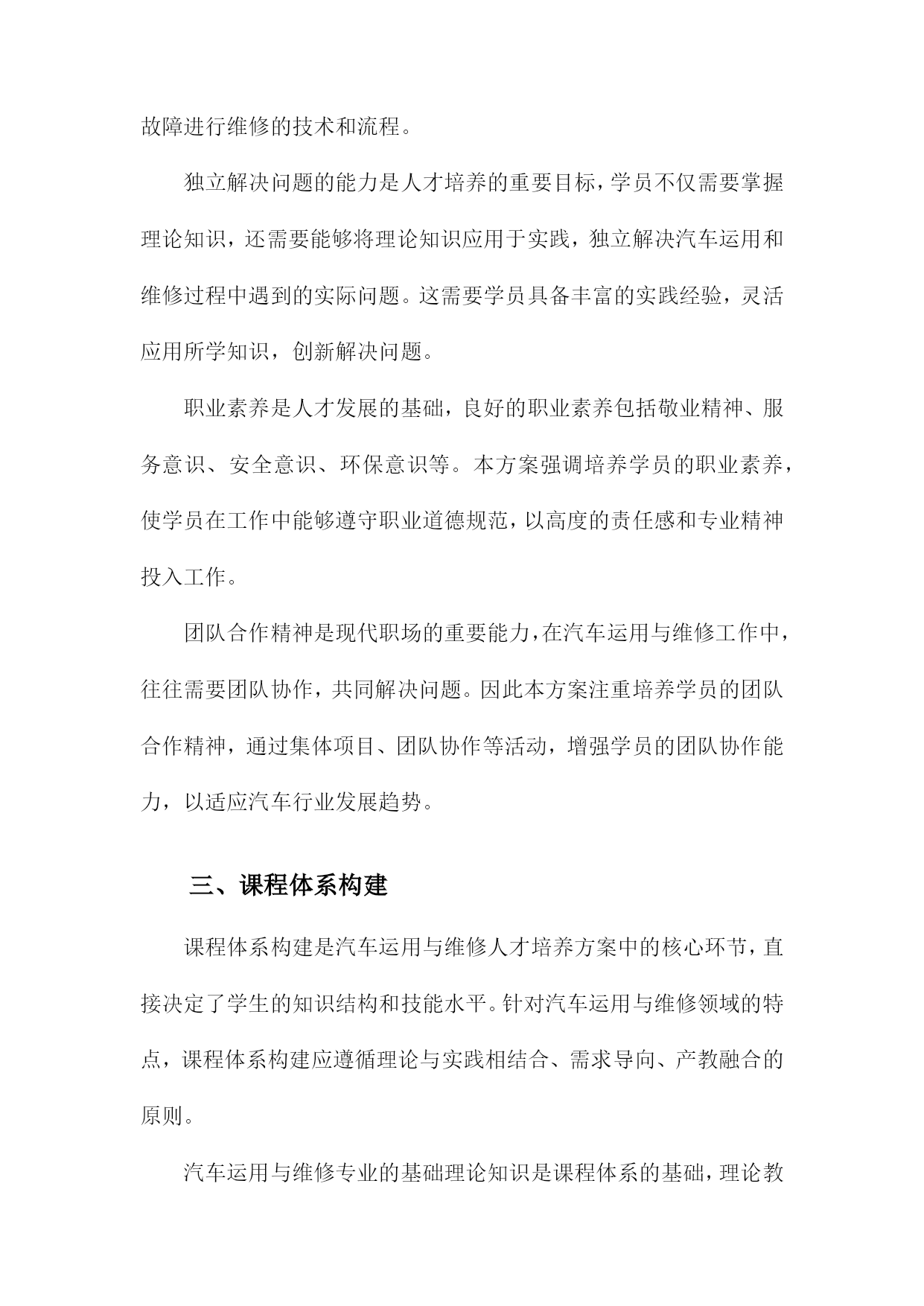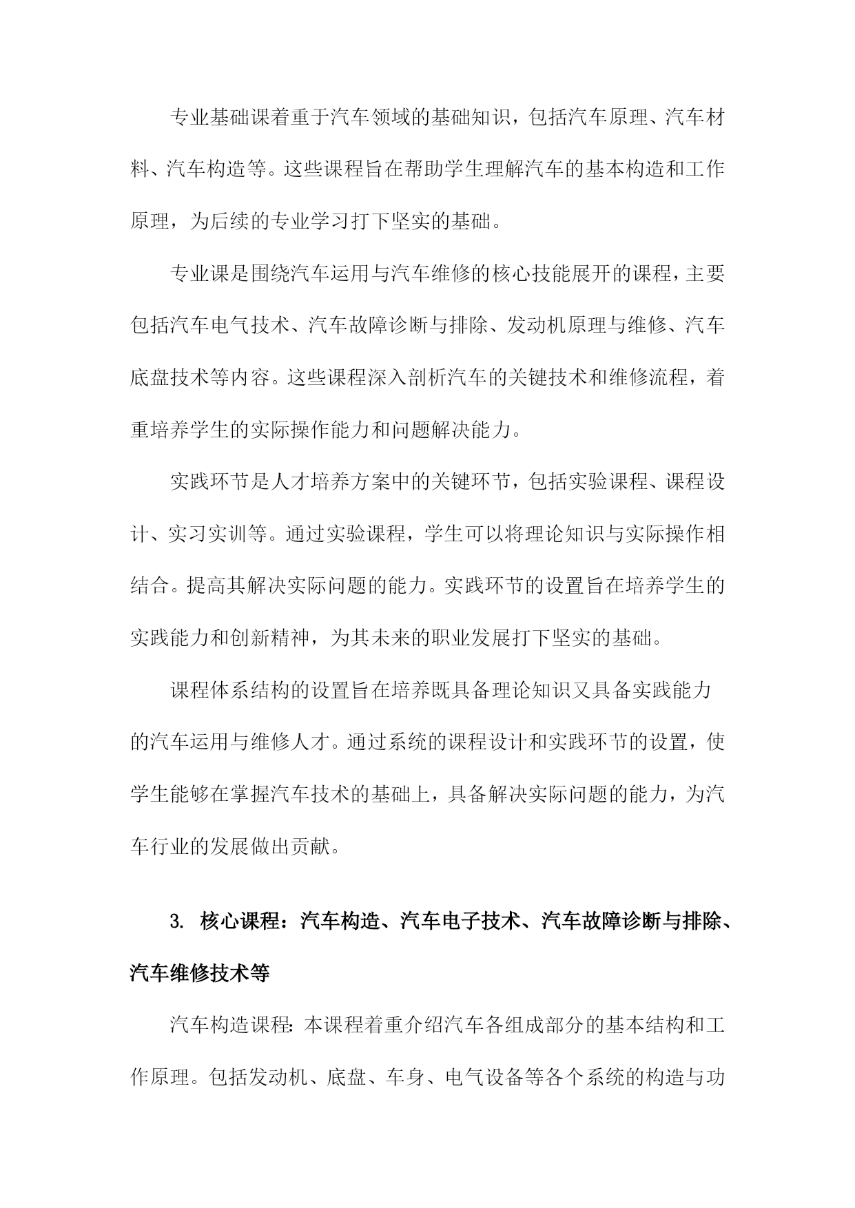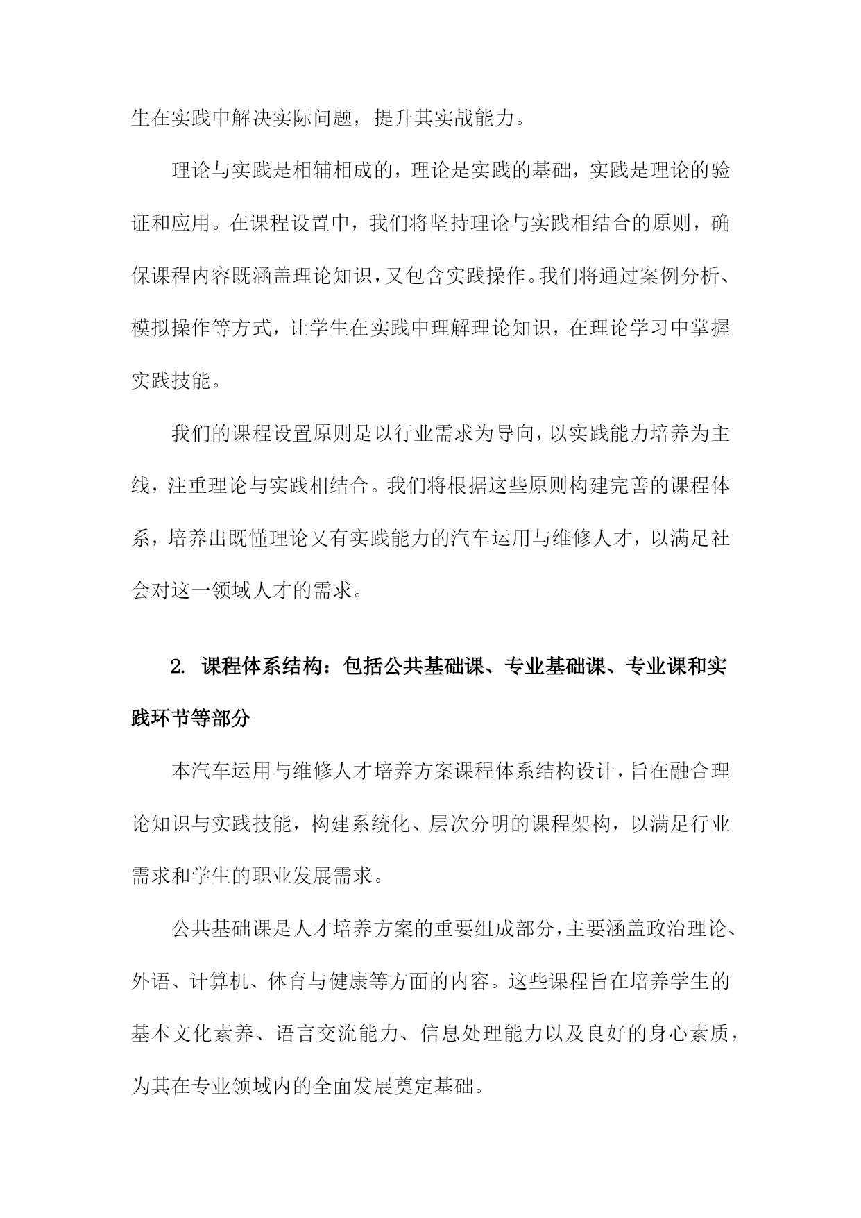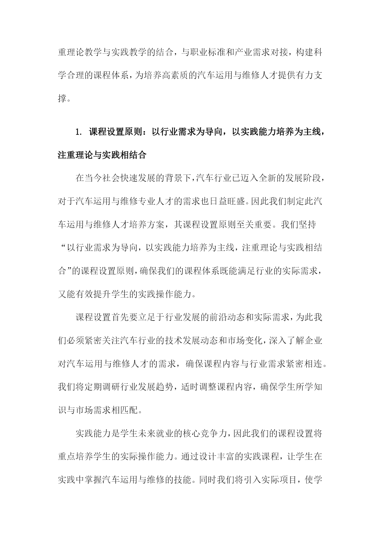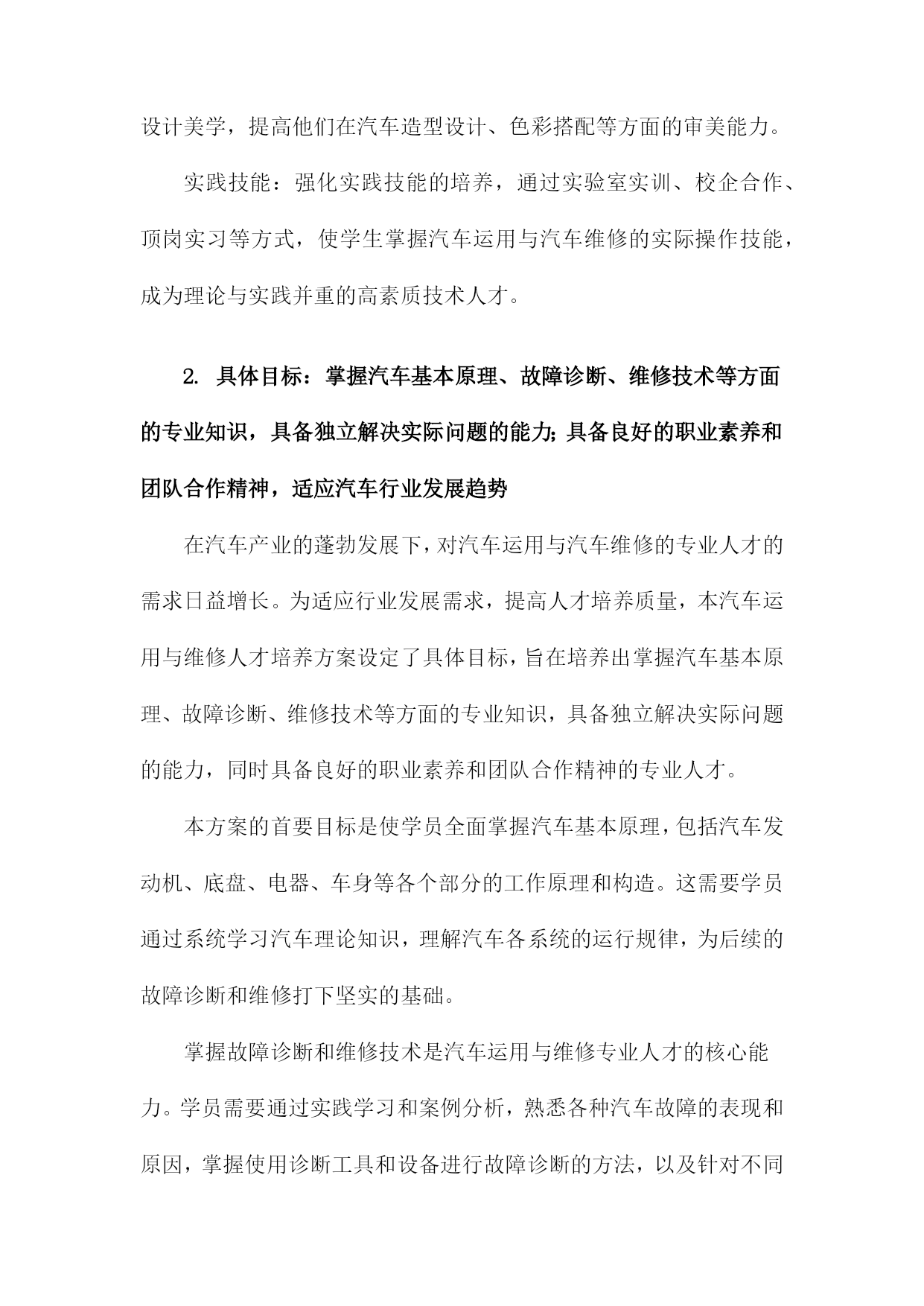 汽车运用与维修人才培养方案一、概括《汽车运用与维修人才培养方案》是一篇关于汽车专业人才培养的指导性文档,旨在提升汽车运用与维修领域的技术水平和专业能力,满足社会对高素质汽车维修人才的需求。本文方案概述了汽车运用与维修人才的培养目标、培养方式、课程设置、实践教学以及评价体系等方面的内容。在当前汽车市场迅猛发展的背景下,本方案着重强调理论与实践相结合的教学模式,注重培养学生的实际操作能力,以更好地适应汽车行业的需求。同时通过优化课程设置和强化实践教学,提高学生的综合素质和创新能力,为汽车行业的持续发展提供有力的人才支撑。二、人才培养目标掌握汽车技术知识:使学生全面掌握汽车运用技术和汽车维修技术,包括汽车发动机、底盘、电气设备、车身等方面的理论知识。实践操作技能培养:强调学生的实际操作能力,使学生具备独立解决实际问题的能力,熟悉汽车维修工艺流程和规范操作,能够在各类汽车维护、修理、调试工作中发挥重要作用。故障诊断与排除能力:培养学生掌握汽车故障诊断与排除的技能,能够迅速准确地判断汽车故障的原因,并采取相应的维修措施。职业素养与团队合作精神:注重学生职业素养的培养,强调敬业精神、创新意识、团队合作精神和职业道德观念,提高学生的综合素质和社会适应能力。持续学习能力:面对快速发展的汽车技术和市场需求,培养学生的自主学习能力,使其能够不断学习和掌握最新的汽车技术和维修技能。1.总体目标:培养德智体美全面发展,具备扎实理论知识与实践技能的高素质汽车运用与维修技术人才德:培养具有良好的职业道德和敬业精神,遵守行业规范,富有团队合作精神的汽车运用与维修人才。我们将注重培养学生的职业道德观念,让他们了解并尊重汽车行业的规范和标准,成为具有社会责任感的专业人士。智:提供扎实的汽车运用与维修理论知识。通过系统的课程学习,使学生掌握汽车构造、汽车电子技术、汽车故障诊断与排除等核心知识,为将来的实践工作打下坚实的基础。体:注重学生身体素质的培养,鼓励学生在学习和实践过程中保持健康的生活方式,确保良好的身体素质以应对行业的工作需求。美:培养学生审美意识,让他们了解汽车行业的发展趋势和汽车设计美学,提高他们在汽车造型设计、色彩搭配等方面的审美能力。实践技能:强化实践技能的培养,通过实验室实训、校企合作、顶岗实习等方式,使学生掌握汽车运用与汽车维修的实际操作技能,成为理论与实践并重的高素质技术人才。2.具体目标:掌握汽车基本原理、故障诊断、维修技术等方面的专业知识,具备独立解决实际问题的能力;具备良好的职业素养和团队合作精神,适应汽车行业发展趋势在汽车产业的蓬勃发展下,对汽车运用与汽车维修的专业人才的需求日益增长。为适应行业发展需求,提高人才培养质量,本汽车运用与维修人才培养方案设定了具体目标,旨在培养出掌握汽车基本原理、故障诊断、维修技术等方面的专业知识,具备独立解决实际问题的能力,同时具备良好的职业素养和团队合作精神的专业人才。本方案的首要目标是使学员全面掌握汽车基本原理,包括汽车发动机、底盘、电器、车身等各个部分的工作原理和构造。这需要学员通过系统学习汽车理论知识,理解汽车各系统的运行规律,为后续的故障诊断和维修打下坚实的基础。掌握故障诊断和维修技术是汽车运用与维修专业人才的核心能力。学员需要通过实践学习和案例分析,熟悉各种汽车故障的表现和原因,掌握使用诊断工具和设备进行故障诊断的方法,以及针对不同故障进行维修的技术和流程。独立解决问题的能力是人才培养的重要目标,学员不仅需要掌握理论知识,还需要能够将理论知识应用于实践,独立解决汽车运用和维修过程中遇到的实际问题。这需要学员具备丰富的实践经验,灵活应用所学知识,创新解决问题。职业素养是人才发展的基础,良好的职业素养包括敬业精神、服务意识、安全意识、环保意识等。本方案强调培养学员的职业素养,使学员在工作中能够遵守职业道德规范,以高度的责任感和专业精神投入工作。团队合作精神是现代职场的重要能力,在汽车运用与维修工作中,往往需要团队协作,共同解决问题。因此本方案注重培养学员的团队合作精神,通过集体项目、团队协作等活动,增强学员的团队协作能力,以适应汽车行业发展趋势。三、课程体系构建课程体系构建是汽车运用与维修人才培养方案中的核心环节,直接决定了学生的知识结构和技能水平。针对汽车运用与维修领域的特点,课程体系构建应遵循理论与实践相结合、需求导向、产教融合的原则。汽车运用与维修专业的基础理论知识是课程体系的基础,理论教学体系应涵盖汽车构造、汽车原理、汽车电器与电子控制技术、汽车故障诊断与排除等核心课程。同时为适应行业发展趋势,还应增设新能源汽车技术、智能网联汽车技术等前沿课程,确保学生掌握最新的汽车技术知识。实践教学是汽车运用与维修专业的重要组成部分,旨在培养学生的实