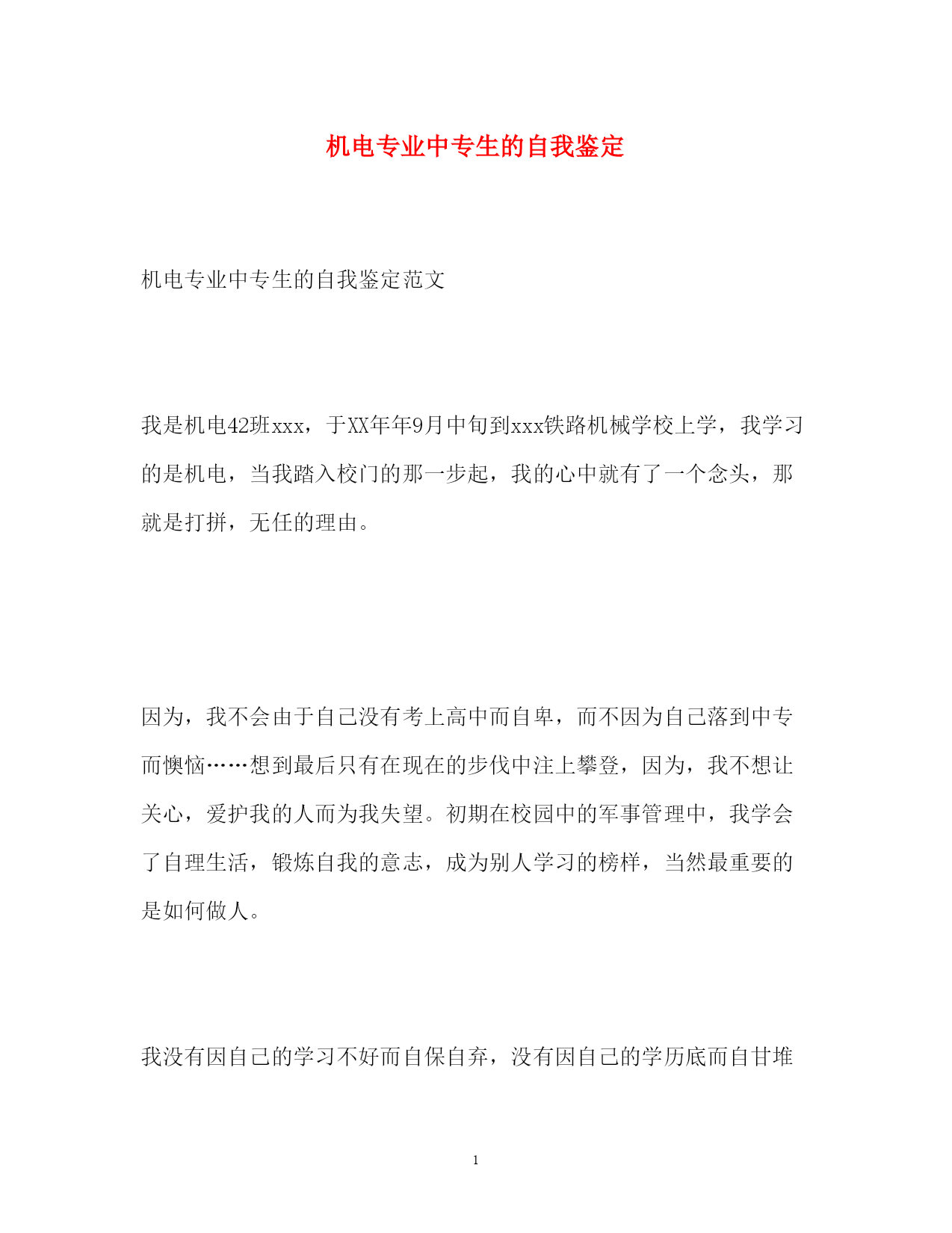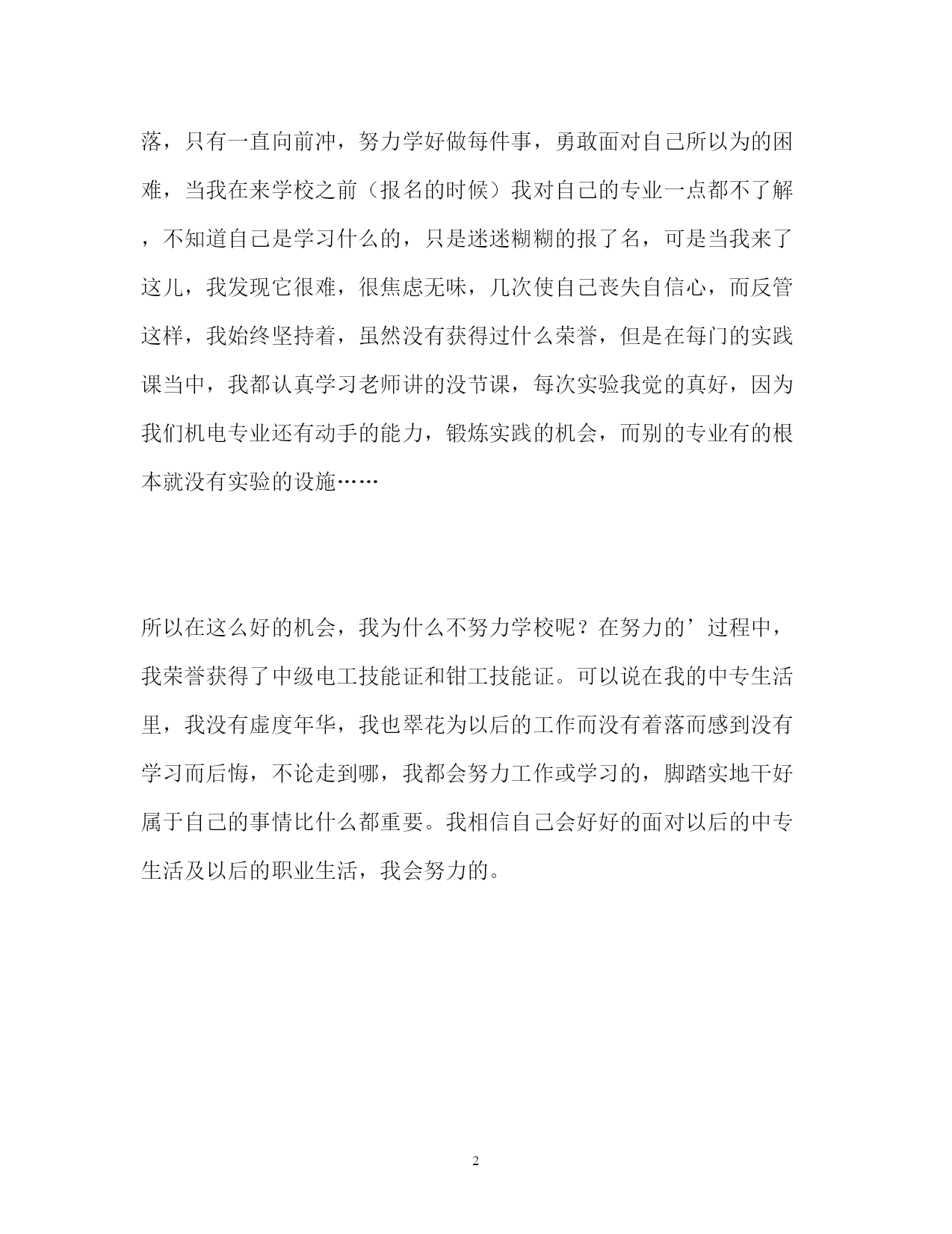 此资料由网络收集而来,如有侵权请告知上传者立即删除。资料共分享,我们负责传递知识。PAGEPAGE2机电专业中专生的自我鉴定机电专业中专生的自我鉴定范文我是机电42班xxx,于XX年年9月中旬到xxx铁路机械学校上学,我学习的是机电,当我踏入校门的那一步起,我的心中就有了一个念头,那就是打拼,无任的理由。因为,我不会由于自己没有考上高中而自卑,而不因为自己落到中专而懊恼……想到最后只有在现在的步伐中注上攀登,因为,我不想让关心,爱护我的人而为我失望。初期在校园中的军事管理中,我学会了自理生活,锻炼自我的意志,成为别人学习的榜样,当然最重要的是如何做人。我没有因自己的学习不好而自保自弃,没有因自己的学历底而自甘堆落,只有一直向前冲,努力学好做每件事,勇敢面对自己所以为的困难,当我在来学校之前(报名的时候)我对自己的专业一点都不了解,不知道自己是学习什么的,只是迷迷糊糊的报了名,可是当我来了这儿,我发现它很难,很焦虑无味,几次使自己丧失自信心,而反管这样,我始终坚持着,虽然没有获得过什么荣誉,但是在每门的实践课当中,我都认真学习老师讲的没节课,每次实验我觉的真好,因为我们机电专业还有动手的能力,锻炼实践的机会,而别的专业有的根本就没有实验的设施……所以在这么好的机会,我为什么不努力学校呢?在努力的’过程中,我荣誉获得了中级电工技能证和钳工技能证。可以说在我的中专生活里,我没有虚度年华,我也翠花为以后的工作而没有着落而感到没有学习而后悔,不论走到哪,我都会努力工作或学习的,脚踏实地干好属于自己的事情比什么都重要。我相信自己会好好的面对以后的中专生活及以后的职业生活,我会努力的。