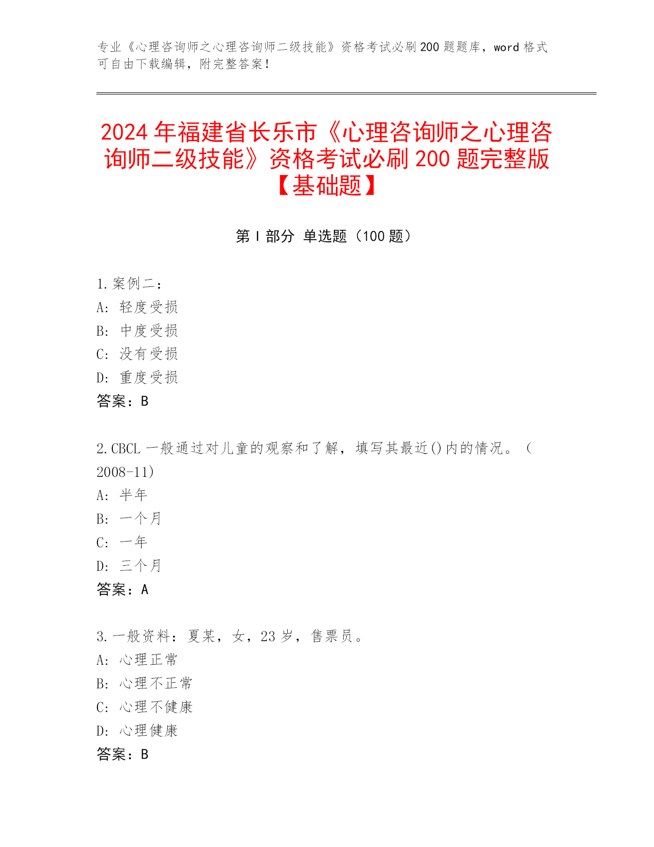 福建省长乐市2024年《心理咨询师之心理咨询师二级技能》资格考试必刷200题真题下载答案