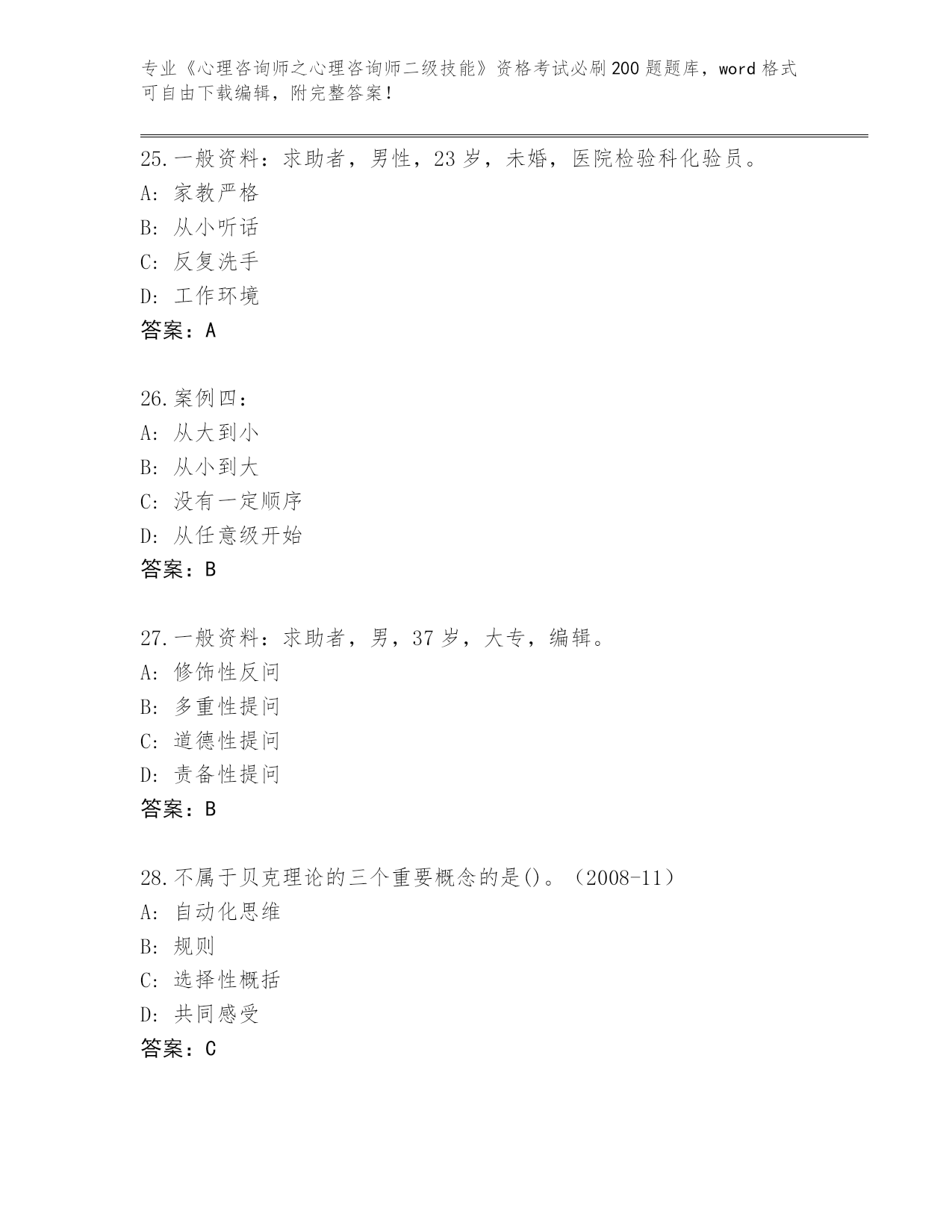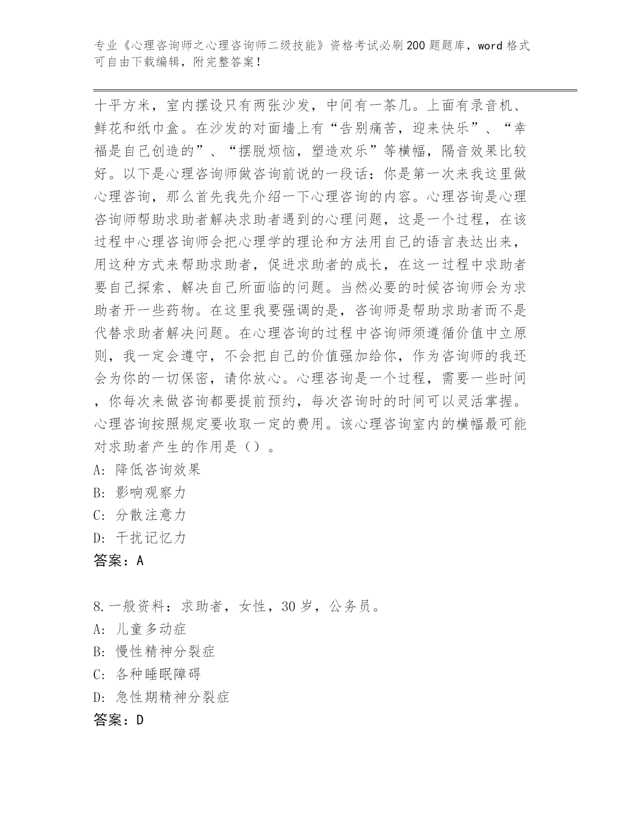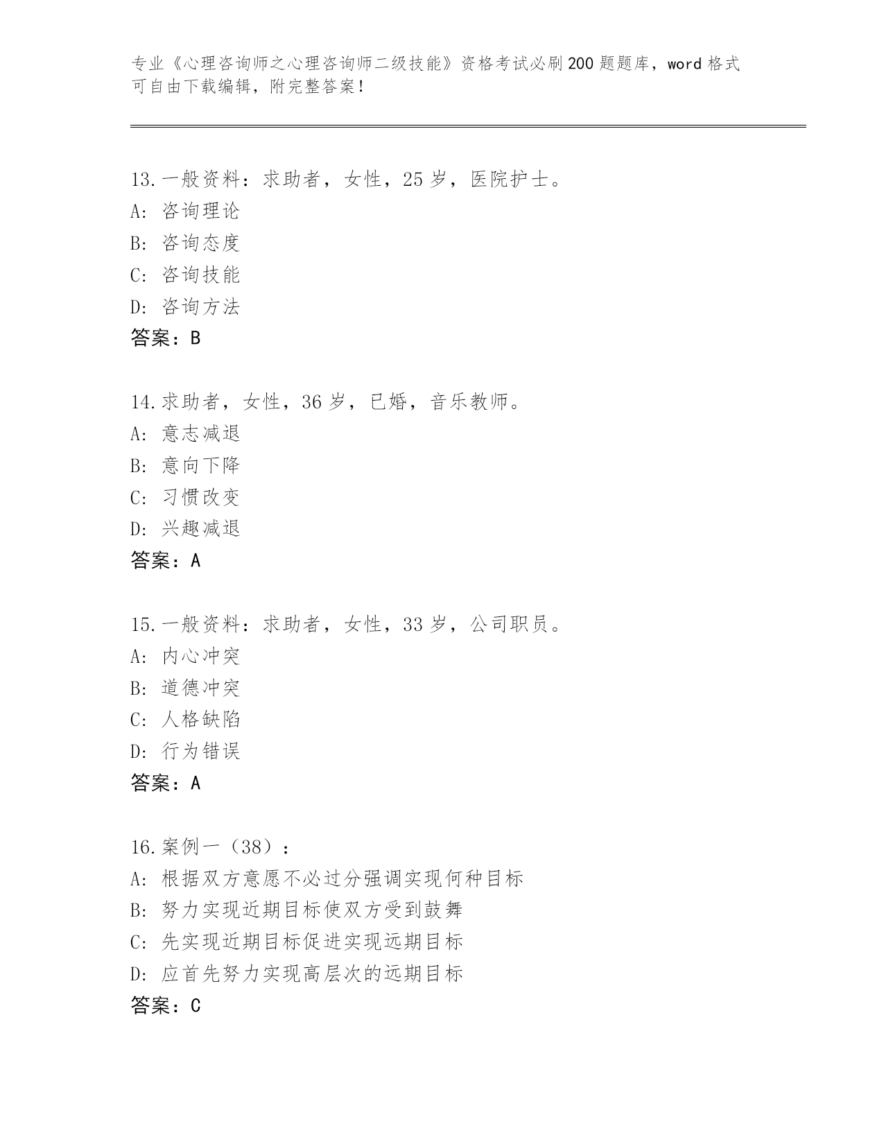 福建省长乐市《心理咨询师之心理咨询师二级技能》资格考试必刷200题大全及答案(易错题)