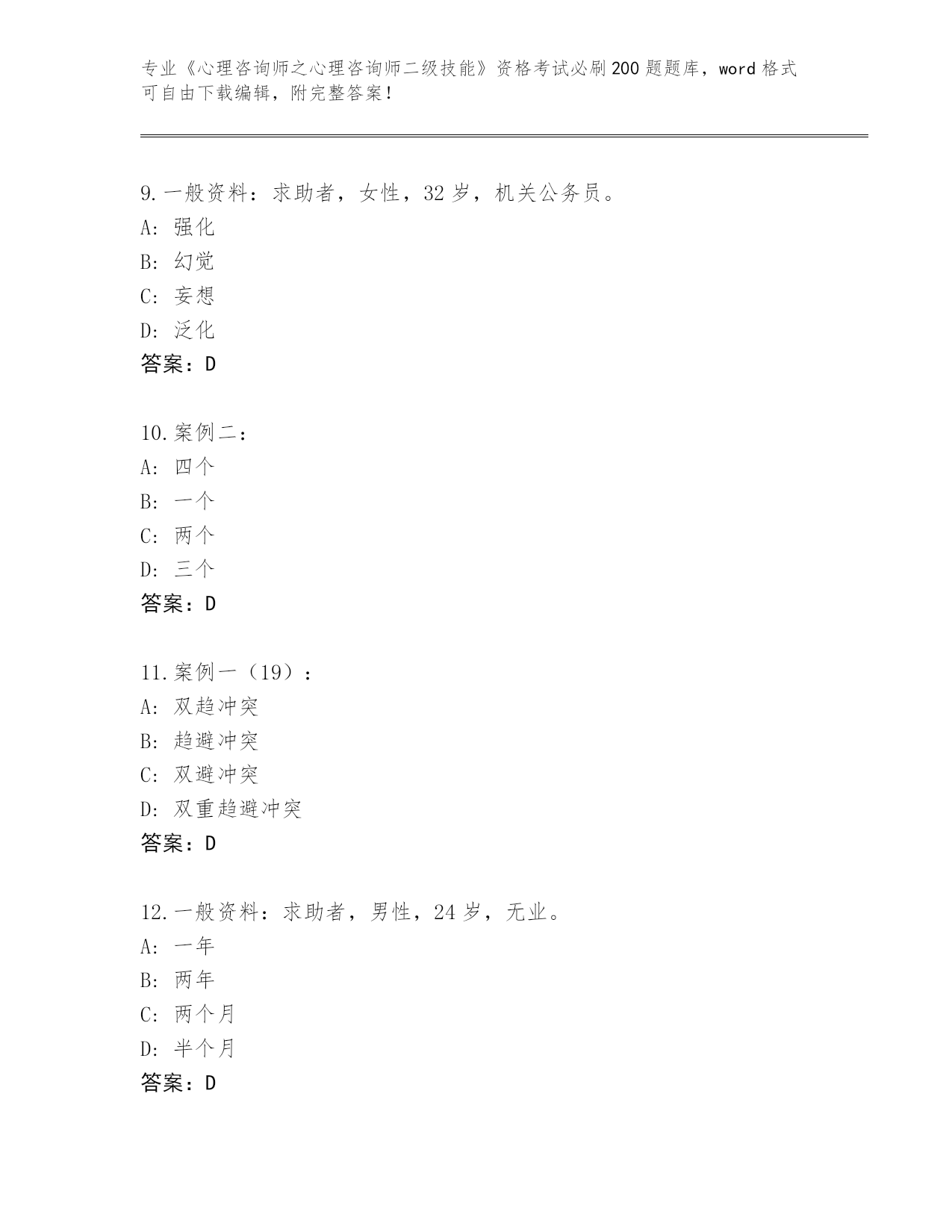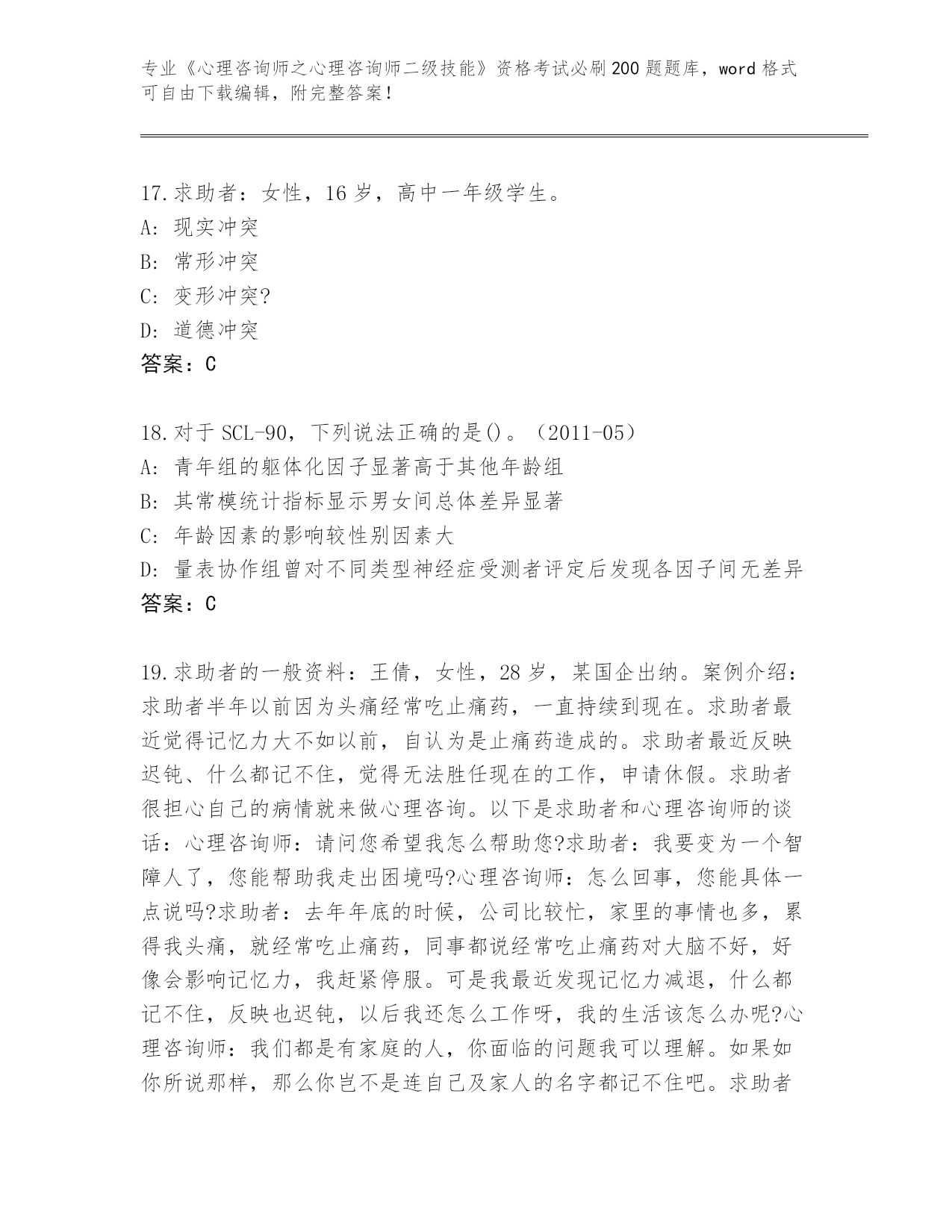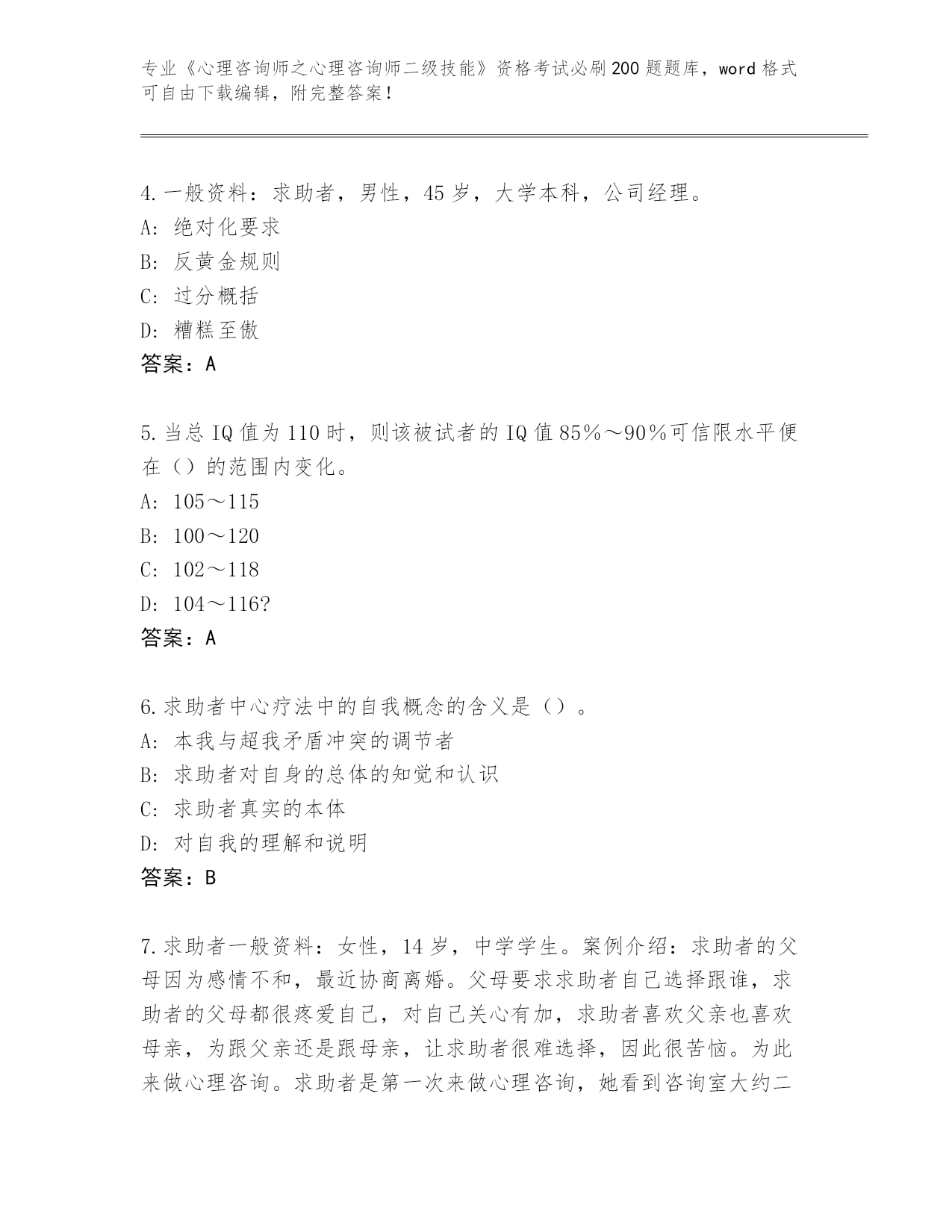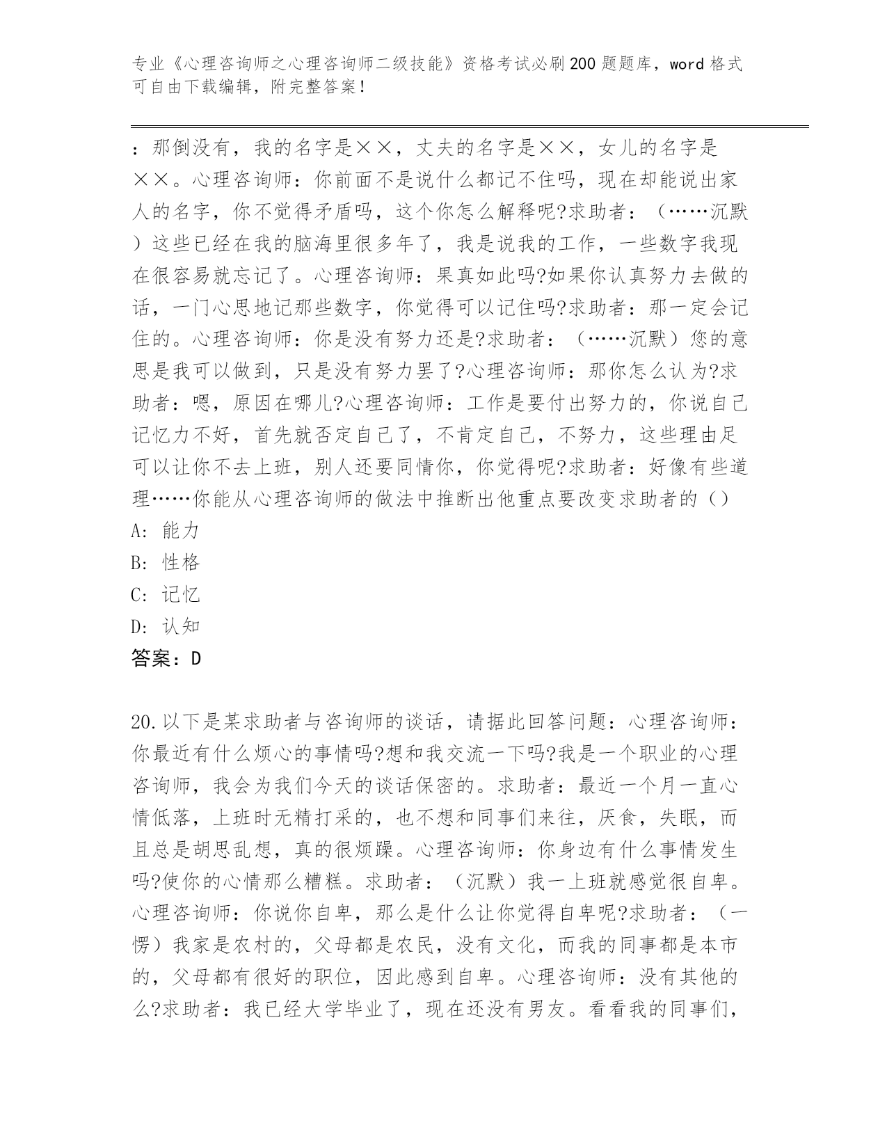 福建省长乐市《心理咨询师之心理咨询师二级技能》资格考试必刷200题大全及答案(易错题)