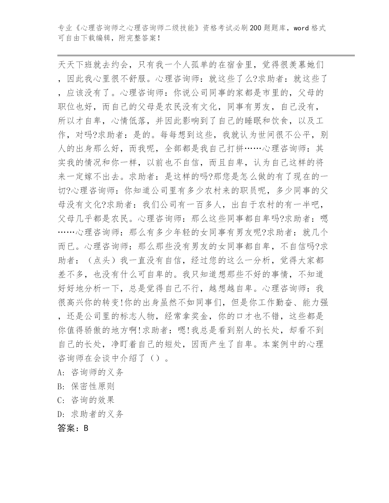 完整版福建省长乐市《心理咨询师之心理咨询师二级技能》考试必刷200题大全含答案(名师推荐)