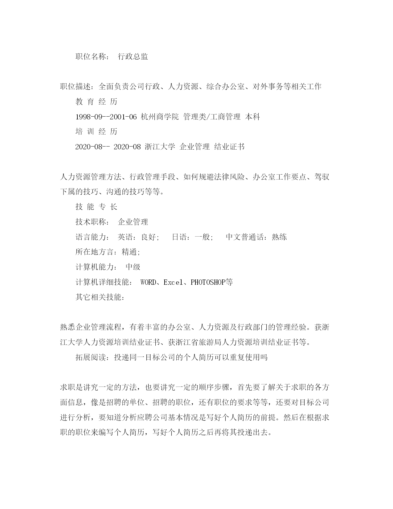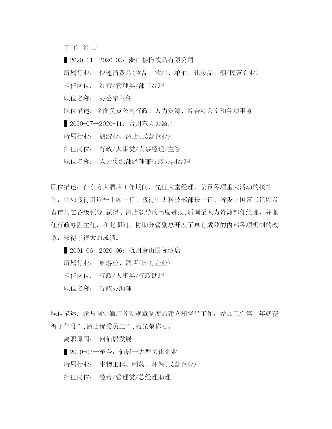 此资料由网络收集而来,如有侵权请告知上传者立即删除。资料共分享,我们负责传递知识。最新工商管理毕业简历范文学习写个人简历首先要做好相关的调查,了解全面的企业信息以及招聘信息之后,就有了总体的思路。然后在根据个人简历的一般格式以及内容,来设计出个人简历模板,也可以直接在网络上下载模板。优秀的个人简历要求内容上不能频频出错,该有的信息也要完整。个人信息XXX性别:男年龄:37岁民族:汉族工作经验:10年以上居住地:浙江台州仙居县身高:CM户口:浙江台州仙居县自我评价多年的行政、办公室、人力资源工作培育了我坚韧、沉稳的性格。在管理上有自已独道的见解,熟悉”;5S”;管理、擅长社会交际及与人沟通,善于处理各种复杂、棘手的行政问题,有较好的社会人脉关系。我非常自信自己会是一位合格的行政管理人员的。求职意向希望岗位:行政/人事类-行政总监行政/人事类-行政经理/主管行政/人事类-人事经理/主管寻求职位:行政副总、行政总监希望工作地点:浙江台州仙居县期望工资:/月(可面议)到岗时间:随时到岗工作目标/发展方向行政副总、行政总监工作经历▌2020-11--2020-03:浙江杨梅饮品有限公司所属行业:快速消费品(食品、饮料、粮油、化妆品、烟(民营企业)担任岗位:经营/管理类/部门经理职位名称:办公室主任职位描述:全面负责公司行政、人力资源、综合办公室和各项事务▌2020-07--2020-11:台州东方大酒店所属行业:旅游业、酒店(民营企业)担任岗位:行政/人事类/人事经理/主管职位名称:人力资源部经理兼行政办副经理职位描述:在东方大酒店工作期间,先任大堂经理,负责各项重大活动的接待工作,例如接待习近平主席一行、接待中央科技部部长一行、省委周国富书记以及省市其它各级领导;赢得了酒店领导的高度赞扬;后调至人力资源部任经理,并兼任行政办副主任,在此期间,协助分管副总开展了卓有成效的内部各项机制的改革,取得了很大的成绩。▌2001-06--2020-06:杭州萧山国际酒店所属行业:旅游业、酒店(国有企业)担任岗位:行政/人事类/行政助理职位名称:行政办助理职位描述:参与制定酒店各项规章制度的建立和督导工作,参加工作第一年就获得了年度”;酒店优秀员工”;的光荣称号。离职原因:回仙居发展▌2020-03--至今:仙居一大型医化企业所属行业:生物工程、制药、环保(民营企业)担任岗位:经营/管理类/总经理助理职位名称:行政总监职位描述:全面负责公司行政、人力资源、综合办公室、对外事务等相关工作教育经历1998-09--2001-06杭州商学院管理类/工商管理本科培训经历2020-08--2020-08浙江大学企业管理结业证书人力资源管理方法、行政管理手段、如何规避法律风险、办公室工作要点、驾驭下属的技巧、沟通的技巧等等。技能专长技术职称:企业管理语言能力:英语:良好;日语:一般;中文普通话:熟练所在地方言:精通;计算机能力:中级计算机详细技能:WORD、Excel、PHOTOSHOP等其它相关技能:熟悉企业管理流程,有着丰富的办公室、人力资源及行政部门的管理经验。获浙江大学人力资源培训结业证书、获浙江省旅游局人力资源培训结业证书等。拓展阅读:投递同一目标公司的个人简历可以重复使用吗求职是讲究一定的方法,也要讲究一定的顺序步骤,首先要了解关于求职的各方面信息,像是招聘的单位、招聘的职位,还有职位的要求等等,还要对目标公司进行分析,要知道分析应聘公司基本情况是写好个人简历的前提。然后在根据求职的职位来编写个人简历,写好个人简历之后再将其投递出去。在求职过程中经常能遇到失败的情况,但是,一次的失败不代表就没有机会了。有不少人参加一个大公司的招聘进过数次才取得成功。那么,在简历的投递上,同一的目标公司可以使用同样的个人简历吗?个人简历上的内容很多都是相同的,像是基本的档案,教育信息,还有工作经验,一般来说是同一个人,这些内容就都是一样。但是,在投递个人简历的时候,也不能在一家公司投递同样一份个人简历。首先,个人简历的寿命周期非常短个人简历的寿命周期非常短,一般只有一分多钟,如果在这一分多钟内目标用人单位并没有看中,那么就表示这份个人简历已经失去了自身的价值。如果想要重复投递,再来一次就要重新撰写个人简历。其次,投递的个人简历质量要提高既然这份简历投递之后并没有得到认可,就说明这份个人简历不合格,或者说其中没有吸引对方的重点。像这样的个人简历,也是有问题的个人简历的即便是再重新投递,依然是不能通过。想要求职成功可以重复投递,但是必须要保证个人简历的质量有所增长。最后,同一份个人简历多投也会引起对方反感相信很多人在与人聊天的时候,也都非常不喜欢自