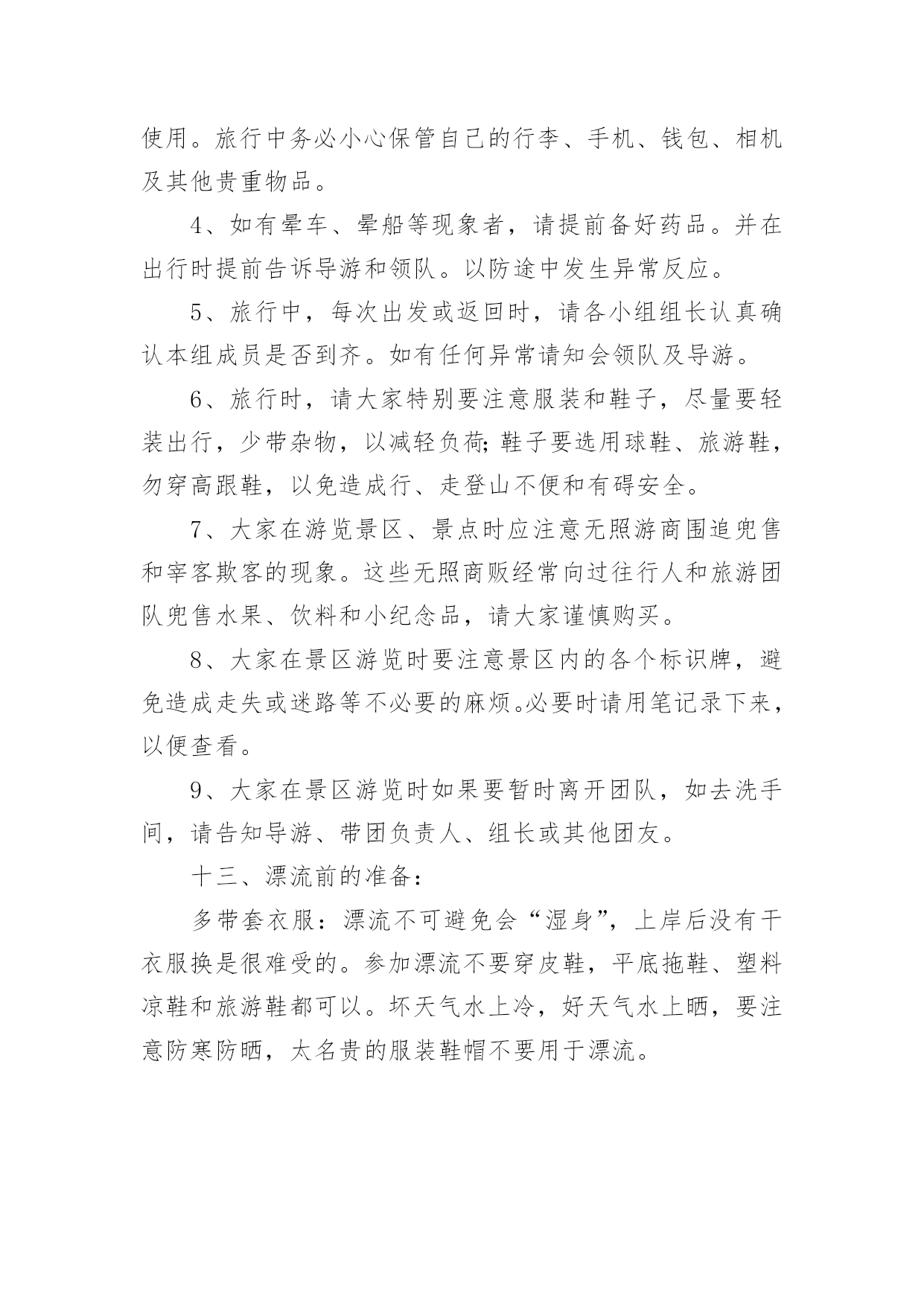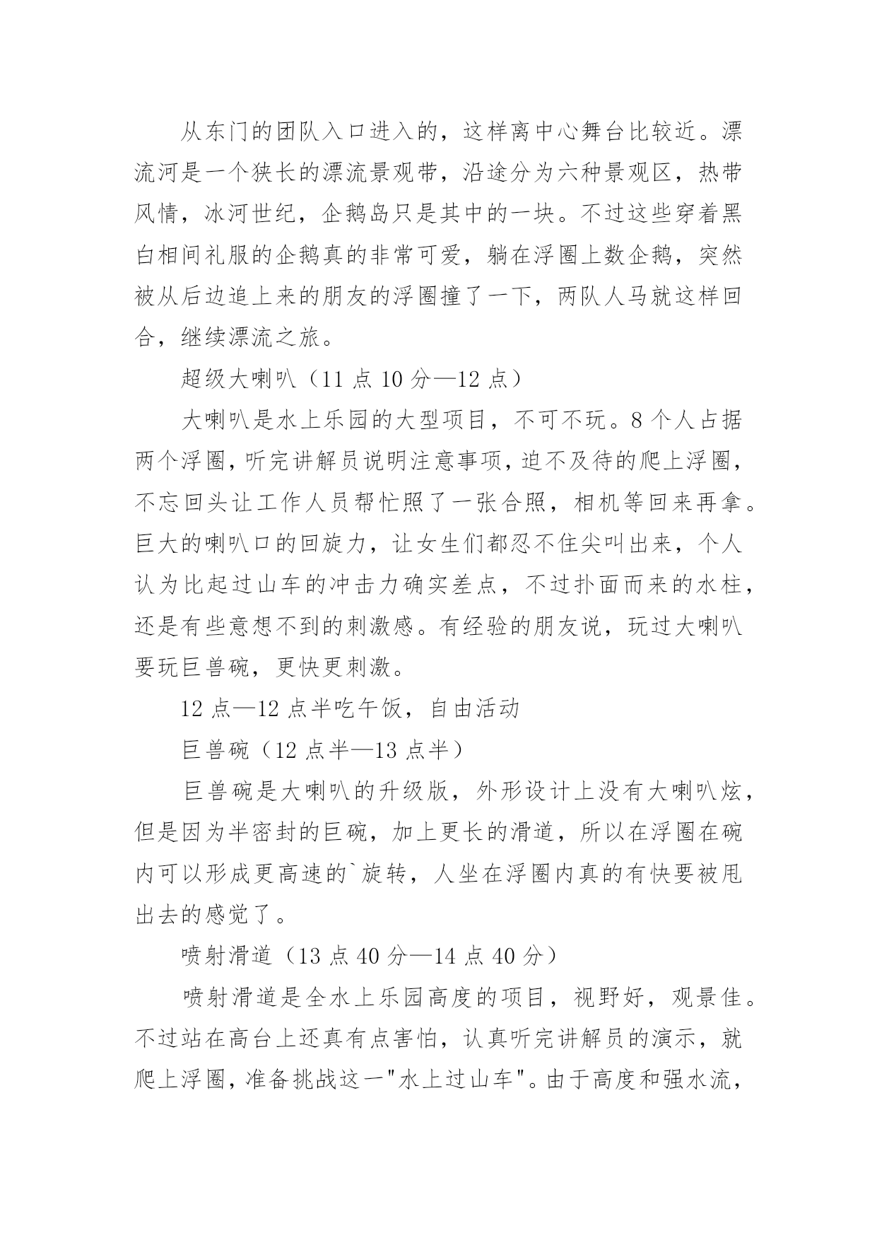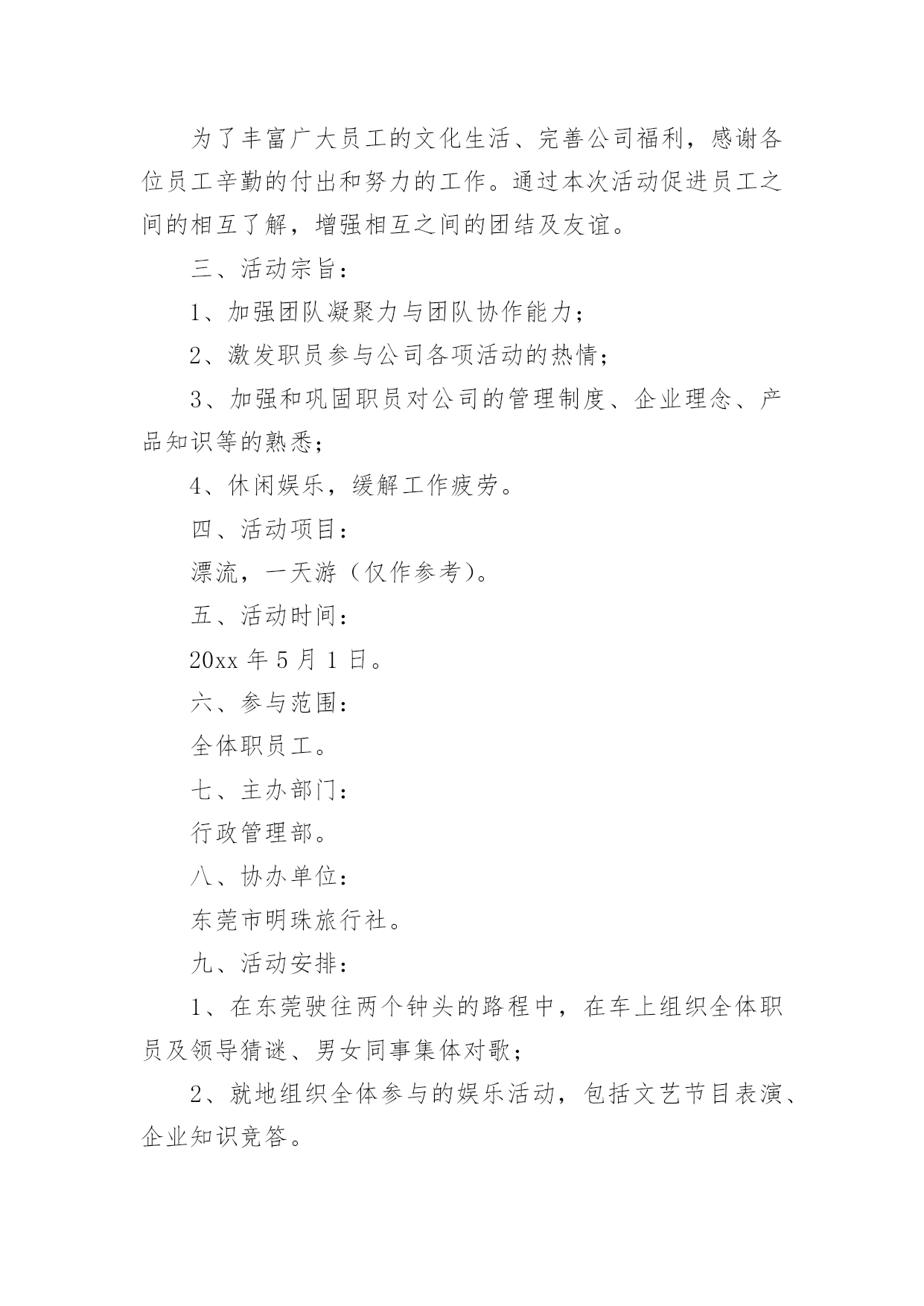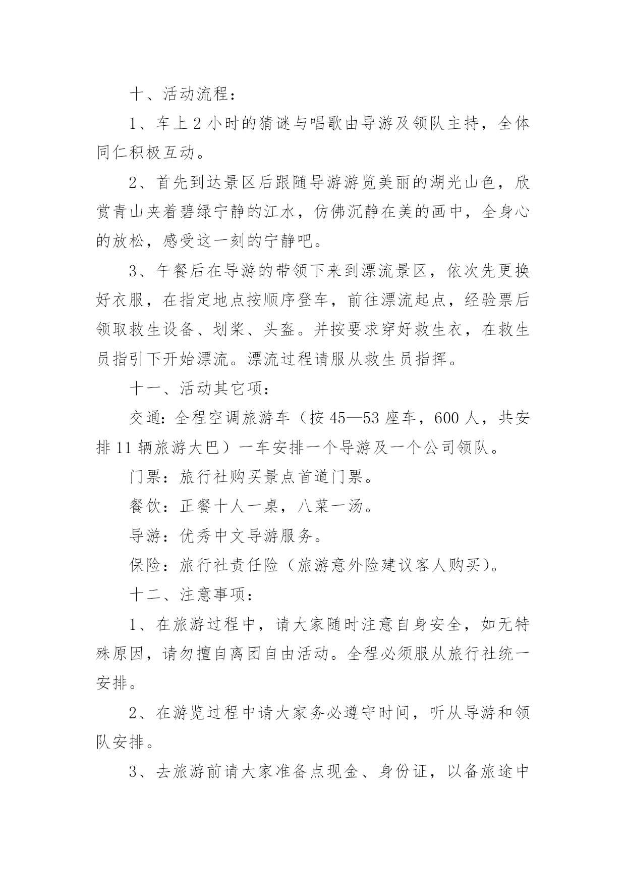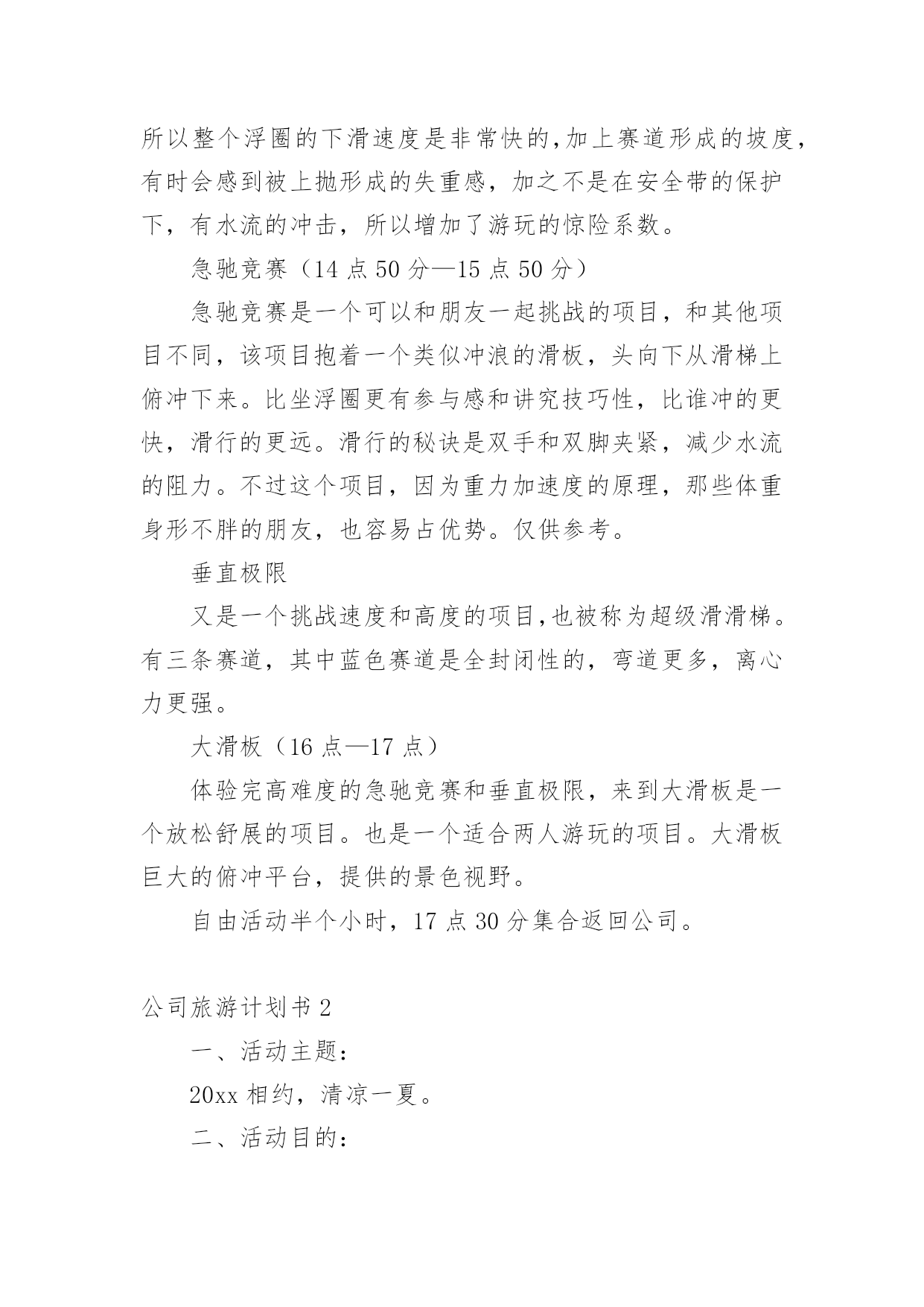 公司旅游计划书时间的脚步是无声的,它在不经意间流逝,迎接我们的将是新的生活,新的挑战,此时此刻我们需要开始做一个计划。相信大家又在为写计划犯愁了?以下是小编收集整理的公司旅游计划书,希望能够帮助到大家。公司旅游计划书1一、活动宗旨1、加强团队凝聚力与团队协作能力;2、激发职员参与公司各项活动的热情;3、加强和巩固职员对公司的管理制度、企业理念、产品知识等的熟悉;4、休闲娱乐,缓解工作疲劳。二、活动对象时速全体职工。三、活动时间20xx年8月中旬,或20xx年9月中旬。四、活动地点长隆水上乐园。五、旅游线路早上8点从公司集合完毕出发,9点抵达广州长隆水上乐园。漂流河(10点—11点)从东门的团队入口进入的,这样离中心舞台比较近。漂流河是一个狭长的漂流景观带,沿途分为六种景观区,热带风情,冰河世纪,企鹅岛只是其中的一块。不过这些穿着黑白相间礼服的企鹅真的非常可爱,躺在浮圈上数企鹅,突然被从后边追上来的朋友的浮圈撞了一下,两队人马就这样回合,继续漂流之旅。超级大喇叭(11点10分—12点)大喇叭是水上乐园的大型项目,不可不玩。8个人占据两个浮圈,听完讲解员说明注意事项,迫不及待的爬上浮圈,不忘回头让工作人员帮忙照了一张合照,相机等回来再拿。巨大的喇叭口的回旋力,让女生们都忍不住尖叫出来,个人认为比起过山车的冲击力确实差点,不过扑面而来的水柱,还是有些意想不到的刺激感。有经验的朋友说,玩过大喇叭要玩巨兽碗,更快更刺激。12点—12点半吃午饭,自由活动巨兽碗(12点半—13点半)巨兽碗是大喇叭的升级版,外形设计上没有大喇叭炫,但是因为半密封的巨碗,加上更长的滑道,所以在浮圈在碗内可以形成更高速的`旋转,人坐在浮圈内真的有快要被甩出去的感觉了。喷射滑道(13点40分—14点40分)喷射滑道是全水上乐园高度的项目,视野好,观景佳。不过站在高台上还真有点害怕,认真听完讲解员的演示,就爬上浮圈,准备挑战这一"水上过山车"。由于高度和强水流,所以整个浮圈的下滑速度是非常快的,加上赛道形成的坡度,有时会感到被上抛形成的失重感,加之不是在安全带的保护下,有水流的冲击,所以增加了游玩的惊险系数。急驰竞赛(14点50分—15点50分)急驰竞赛是一个可以和朋友一起挑战的项目,和其他项目不同,该项目抱着一个类似冲浪的滑板,头向下从滑梯上俯冲下来。比坐浮圈更有参与感和讲究技巧性,比谁冲的更快,滑行的更远。滑行的秘诀是双手和双脚夹紧,减少水流的阻力。不过这个项目,因为重力加速度的原理,那些体重身形不胖的朋友,也容易占优势。仅供参考。垂直极限又是一个挑战速度和高度的项目,也被称为超级滑滑梯。有三条赛道,其中蓝色赛道是全封闭性的,弯道更多,离心力更强。大滑板(16点—17点)体验完高难度的急驰竞赛和垂直极限,来到大滑板是一个放松舒展的项目。也是一个适合两人游玩的项目。大滑板巨大的俯冲平台,提供的景色视野。自由活动半个小时,17点30分集合返回公司。公司旅游计划书2一、活动主题:20xx相约,清凉一夏。二、活动目的:为了丰富广大员工的文化生活、完善公司福利,感谢各位员工辛勤的付出和努力的工作。通过本次活动促进员工之间的相互了解,增强相互之间的团结及友谊。三、活动宗旨:1、加强团队凝聚力与团队协作能力;2、激发职员参与公司各项活动的热情;3、加强和巩固职员对公司的管理制度、企业理念、产品知识等的熟悉;4、休闲娱乐,缓解工作疲劳。四、活动项目:漂流,一天游(仅作参考)。五、活动时间:20xx年5月1日。六、参与范围:全体职员工。七、主办部门:行政管理部。八、协办单位:东莞市明珠旅行社。九、活动安排:1、在东莞驶往两个钟头的路程中,在车上组织全体职员及领导猜谜、男女同事集体对歌;2、就地组织全体参与的娱乐活动,包括文艺节目表演、企业知识竞答。十、活动流程:1、车上2小时的猜谜与唱歌由导游及领队主持,全体同仁积极互动。2、首先到达景区后跟随导游游览美丽的湖光山色,欣赏青山夹着碧绿宁静的江水,仿佛沉静在美的画中,全身心的放松,感受这一刻的宁静吧。3、午餐后在导游的带领下来到漂流景区,依次先更换好衣服,在指定地点按顺序登车,前往漂流起点,经验票后领取救生设备、划桨、头盔。并按要求穿好救生衣,在救生员指引下开始漂流。漂流过程请服从救生员指挥。十一、活动其它项:交通:全程空调旅游车(按45—53座车,600人,共安排11辆旅游大巴)一车安排一个导游及一个公司领队。门票:旅行社购买景点首道门票。餐饮:正餐十人一桌,八菜一汤。导游:优秀中文导游服务。保险:旅行社责任险(旅游意外险建议客人购买)。十二、注意事项:1、在旅游过程中,请大家随时注意自身安全,如无特殊原因,请勿擅自离团自由活动。全程必须服从旅行社统一安排。2、在游览过程中请大家务必遵守时间,听从导游和领队安排。3、去旅游前请