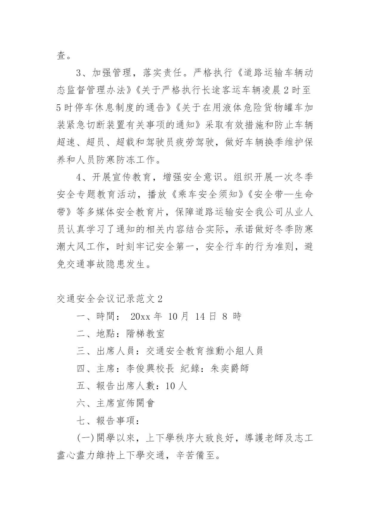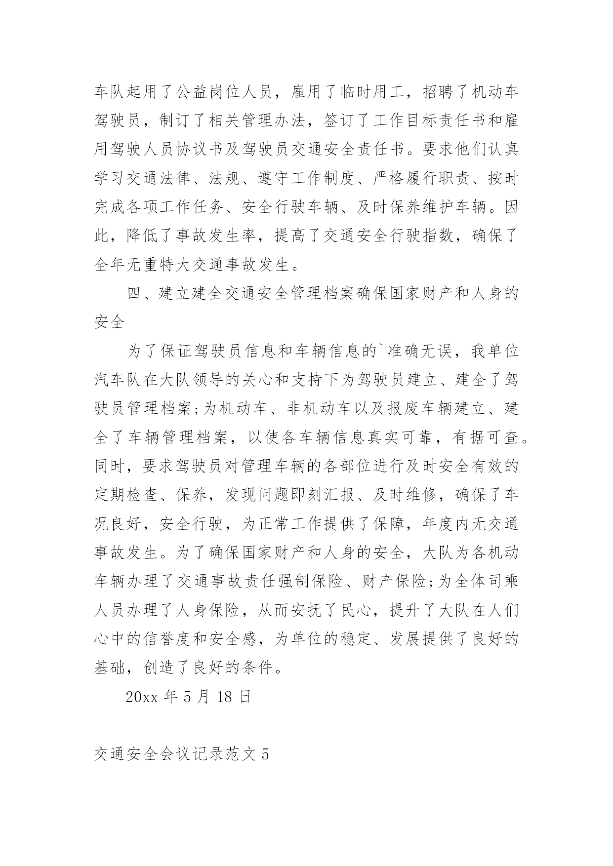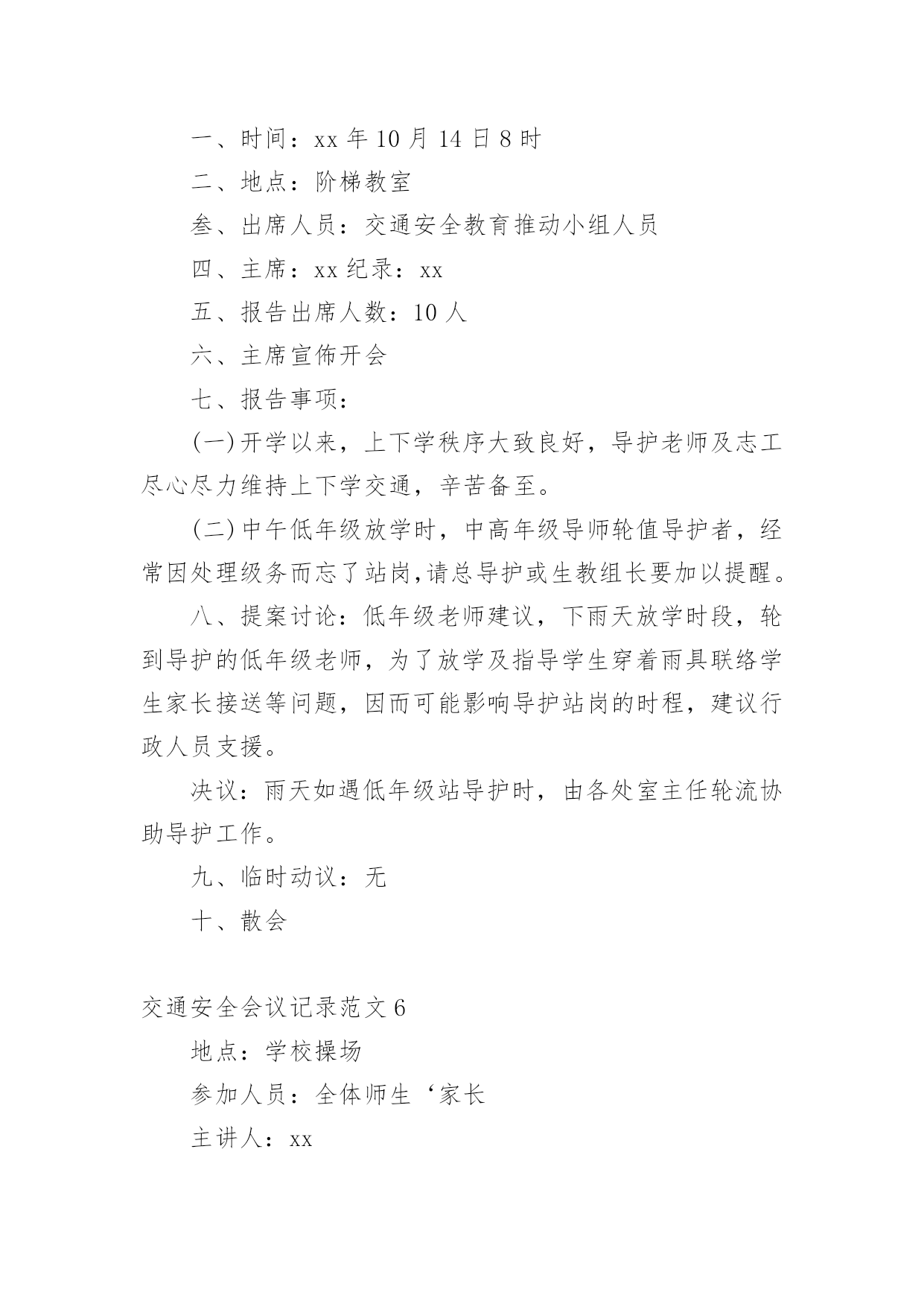 交通安全会议记录交通安全会议记录范文交通安全会议记录范文1时间:20xx年11月5日地点:公司会议室人员:全体司机内容:交通运输部关于20xx-20xx年防范寒潮大风工作11月4日接到辽宁省交通厅运输管理局转发交通运输部关于做好20xx-20xx年度防范寒潮大风工作的通知。通知要求:1、提高认识,加强领导。正值秋冬季节更迭之际,各地气候复杂多变,雨雪、大风、沙尘暴、大雾和霾多发。严重影响道路运输生产安全,一定要增强安全责任意识,采取有力的措施,早准备、早部署、早防范,针对冬季客运量大,司乘人员劳动强度大、行车环境恶劣健全完善应急预案。2、组织检查,消除隐患。及时排查消除可能因雪灾和降温天气造成的隐患,要结合有关规定,在入冬前组织开展一次全面的.安全生产检查活动。重点对道路旅客运输和危险化学品运输企业及客运站进行重点检查,对问题和隐患进行整改,切实做到措施、责任、资金、时限和预案“五到位”对冬季使用的暖风空调系统和燃油加热设备要进行重点检查。3、加强管理,落实责任。严格执行《道路运输车辆动态监督管理办法》《关于严格执行长途客运车辆凌晨2时至5时停车休息制度的通告》《关于在用液体危险货物罐车加装紧急切断装置有关事项的通知》采取有效措施和防止车辆超速、超员、超载和驾驶员疲劳驾驶,做好车辆换季维护保养和人员防寒防冻工作。4、开展宣传教育,增强安全意识。组织开展一次冬季安全专题教育活动,播放《乘车安全须知》《安全带—生命带》等多媒体安全教育片,保障道路运输安全我公司从业人员认真学习了通知的相关内容结合实际,承诺做好冬季防寒潮大风工作,时刻牢记安全第一,安全行车的行为准则,避免交通事故隐患发生。交通安全会议记录范文2一、時間:20xx年10月14日8時二、地點:階梯教室三、出席人員:交通安全教育推動小組人員四、主席:李俊興校長紀錄:朱奕爵師五、報告出席人數:10人六、主席宣佈開會七、報告事項:(一)開學以來,上下學秩序大致良好,導護老師及志工盡心盡力維持上下學交通,辛苦備至。(二)中午低年級放學時,中高年級導師輪值導護者,經常因處理級務而忘了站崗,請總導護或生教組長要加以提醒。八、提案討論:低年級老師建議,下雨天放學時段,輪到導護的低年級老師,為了放學及指導學生穿著雨具聯絡學生家長接送等問題,因而可能影響導護站崗的時程,建議行政人員支援。決議:雨天如遇低年級站導護時,由各處室主任輪流協助導護工作。九、臨時動議:無十、散會主席:記錄:交通安全会议记录范文3时间:20xx年xx月xx日地点:参加人:主持人:xx记录人:xx会议内容:1、开学学校安全工作分析,制定和落实相应的安全工作,尤其针对开学初特点特别强调重点防控措施。2、要求学校保卫和保安加强安全管理,尤其是大门口的进出人员以及夜间的巡逻管理。3、全校范围的校园安全及安全设施安全检查。4、布置保安开会的.工作任务和内容。5、加强进出车辆的管理,要求规范停车管理。6、传达教育局安全工作会议精神,结合本次学校安全会议精神进行大检查。交通安全会议记录范文4交通安全会议记录会议参与人:xxxx会议地点:xxxxxx会议时间:20xx年xx月xx日下午15:00主持人:xxxx一、认真学习严格遵守交通法律法规及各项规章制度xx汽车队全体司乘人员在主管领导的大力支持和关心下,不断组织交通安全培训,认真学习法律、法规知识,使员工的交通安全意识不断的提升。通过学习员工认识到遵纪守法的重要性,认识到只有遵守交通法律、法规,按规定行驶车辆,做到“文明出行、平安归来”才能保证他人和自身的人身安全,才能做到无重特大交通事故发生;通过学习大家认识到在行驶过程中不仅要做到遵规、守法、安全行驶,更应该时刻把“生命曾宝贵,安全是首位。”记在心上、印在脑海,同时也要改正以往的一些不良行为。做到:不违规、违法开车,不醉酒驾车行驶,不超员、超载,不疲劳驾驶,不超速行驶、不向车外乱吐、乱扔杂物;杜绝变道不打灯、开车打电话、过坑不慢行、遇水还加速等现象发生。让文明交通、安全行驶与人们时刻相伴,做文明行车人。二、大力宣传交通法律法规从源头上治理防患未然为了有效的排除交通安全隐患、防患未然,大队领导组织全体司乘人员大力宣传交通法律、法规,力求从源头上治理预防交通事故的发生。他们相互传阅宣传资料、传递图片或以口头宣传,用事实说话,让大家从思想上真正认识到了遵纪守法的重要性,大大的提高了大队司乘人员的文明出行交通安全意识和道德修养;通过大力宣传,关爱生命、文明出行已成为他们的自觉行为。三、制订交通安全责任书确保全年无重特大交通事故发生为了认真贯彻执行“安全第一,预防为主”的交通安全方针,年初大队制订了有效的交通安全制度、驾驶员工作守则并与园林局交安委、大队汽车队签订了一系列交通安全责任书及其安全生产目标责任书。汽车队负责人根据责任目