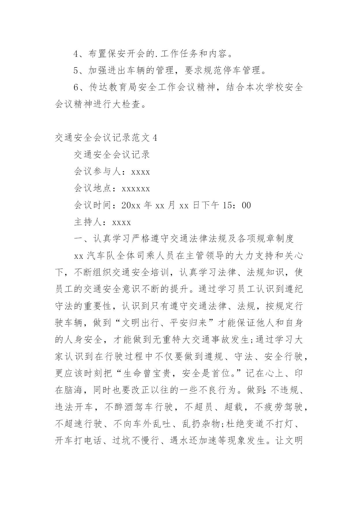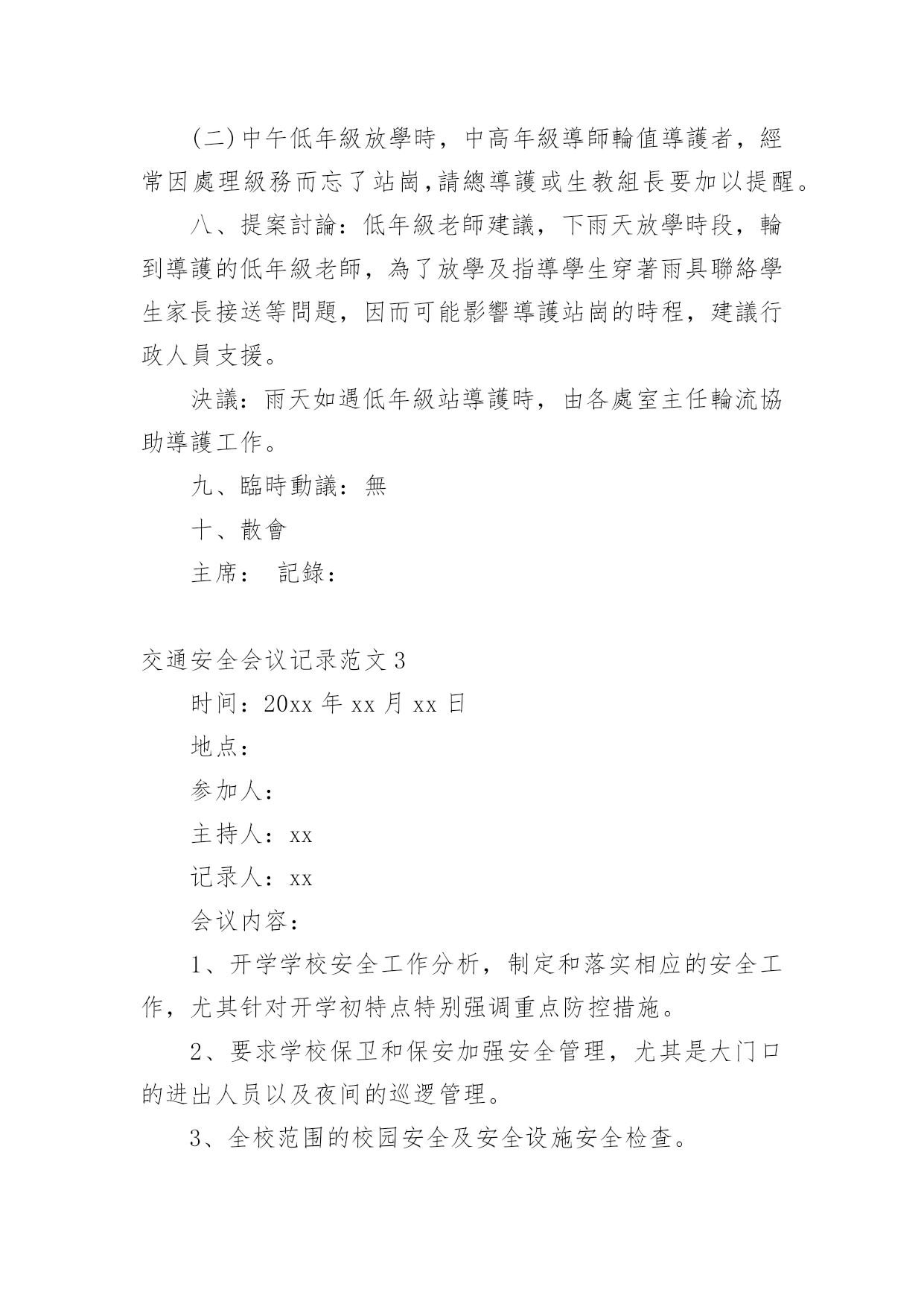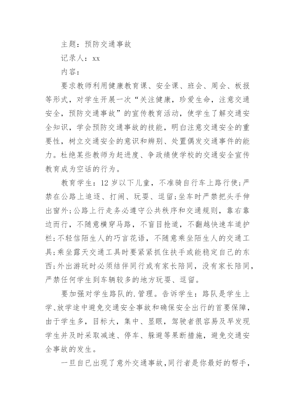 交通安全会议记录交通安全会议记录范文交通安全会议记录范文1时间:20xx年11月5日地点:公司会议室人员:全体司机内容:交通运输部关于20xx-20xx年防范寒潮大风工作11月4日接到辽宁省交通厅运输管理局转发交通运输部关于做好20xx-20xx年度防范寒潮大风工作的通知。通知要求:1、提高认识,加强领导。正值秋冬季节更迭之际,各地气候复杂多变,雨雪、大风、沙尘暴、大雾和霾多发。严重影响道路运输生产安全,一定要增强安全责任意识,采取有力的措施,早准备、早部署、早防范,针对冬季客运量大,司乘人员劳动强度大、行车环境恶劣健全完善应急预案。2、组织检查,消除隐患。及时排查消除可能因雪灾和降温天气造成的隐患,要结合有关规定,在入冬前组织开展一次全面的.安全生产检查活动。重点对道路旅客运输和危险化学品运输企业及客运站进行重点检查,对问题和隐患进行整改,切实做到措施、责任、资金、时限和预案“五到位”对冬季使用的暖风空调系统和燃油加热设备要进行重点检查。3、加强管理,落实责任。严格执行《道路运输车辆动态监督管理办法》《关于严格执行长途客运车辆凌晨2时至5时停车休息制度的通告》《关于在用液体危险货物罐车加装紧急切断装置有关事项的通知》采取有效措施和防止车辆超速、超员、超载和驾驶员疲劳驾驶,做好车辆换季维护保养和人员防寒防冻工作。4、开展宣传教育,增强安全意识。组织开展一次冬季安全专题教育活动,播放《乘车安全须知》《安全带—生命带》等多媒体安全教育片,保障道路运输安全我公司从业人员认真学习了通知的相关内容结合实际,承诺做好冬季防寒潮大风工作,时刻牢记安全第一,安全行车的行为准则,避免交通事故隐患发生。交通安全会议记录范文2一、時間:20xx年10月14日8時二、地點:階梯教室三、出席人員:交通安全教育推動小組人員四、主席:李俊興校長紀錄:朱奕爵師五、報告出席人數:10人六、主席宣佈開會七、報告事項:(一)開學以來,上下學秩序大致良好,導護老師及志工盡心盡力維持上下學交通,辛苦備至。(二)中午低年級放學時,中高年級導師輪值導護者,經常因處理級務而忘了站崗,請總導護或生教組長要加以提醒。八、提案討論:低年級老師建議,下雨天放學時段,輪到導護的低年級老師,為了放學及指導學生穿著雨具聯絡學生家長接送等問題,因而可能影響導護站崗的時程,建議行政人員支援。決議:雨天如遇低年級站導護時,由各處室主任輪流協助導護工作。九、臨時動議:無十、散會主席:記錄:交通安全会议记录范文3时间:20xx年xx月xx日地点:参加人:主持人:xx记录人:xx会议内容:1、开学学校安全工作分析,制定和落实相应的安全工作,尤其针对开学初特点特别强调重点防控措施。2、要求学校保卫和保安加强安全管理,尤其是大门口的进出人员以及夜间的巡逻管理。3、全校范围的校园安全及安全设施安全检查。4、布置保安开会的.工作任务和内容。5、加强进出车辆的管理,要求规范停车管理。6、传达教育局安全工作会议精神,结合本次学校安全会议精神进行大检查。交通安全会议记录范文4交通安全会议记录会议参与人:xxxx会议地点:xxxxxx会议时间:20xx年xx月xx日下午15:00主持人:xxxx一、认真学习严格遵守交通法律法规及各项规章制度xx汽车队全体司乘人员在主管领导的大力支持和关心下,不断组织交通安全培训,认真学习法律、法规知识,使员工的交通安全意识不断的提升。通过学习员工认识到遵纪守法的重要性,认识到只有遵守交通法律、法规,按规定行驶车辆,做到“文明出行、平安归来”才能保证他人和自身的人身安全,才能做到无重特大交通事故发生;通过学习大家认识到在行驶过程中不仅要做到遵规、守法、安全行驶,更应该时刻把“生命曾宝贵,安全是首位。”记在心上、印在脑海,同时也要改正以往的一些不良行为。做到:不违规、违法开车,不醉酒驾车行驶,不超员、超载,不疲劳驾驶,不超速行驶、不向车外乱吐、乱扔杂物;杜绝变道不打灯、开车打电话、过坑不慢行、遇水还加速等现象发生。让文明交通、安全行驶与人们时刻相伴,做文明行车人。二、大力宣传交通法律法规从源头上治理防患未然为了有效的排除交通安全隐患、防患未然,大队领导组织全体司乘人员大力宣传交通法律、法规,力求从源头上治理预防交通事故的发生。他们相互传阅宣传资料、传递图片或以口头宣传,用事实说话,让大家从思想上真正认识到了遵纪守法的重要性,大大的提高了大队司乘人员的文明出行交通安全意识和道德修养;通过大力宣传,关爱生命、文明出行已成为他们的自觉行为。三、制订交通安全责任书确保全年无重特大交通事故发生为了认真贯彻执行“安全第一,预防为主”的交通安全方针,年初大队制订了有效的交通安全制度、驾驶员工作守则并与园林局交安委、大队汽车队签订了一系列交通安全责任书及其安全生产目标责任书。汽车队负责人根据责任目