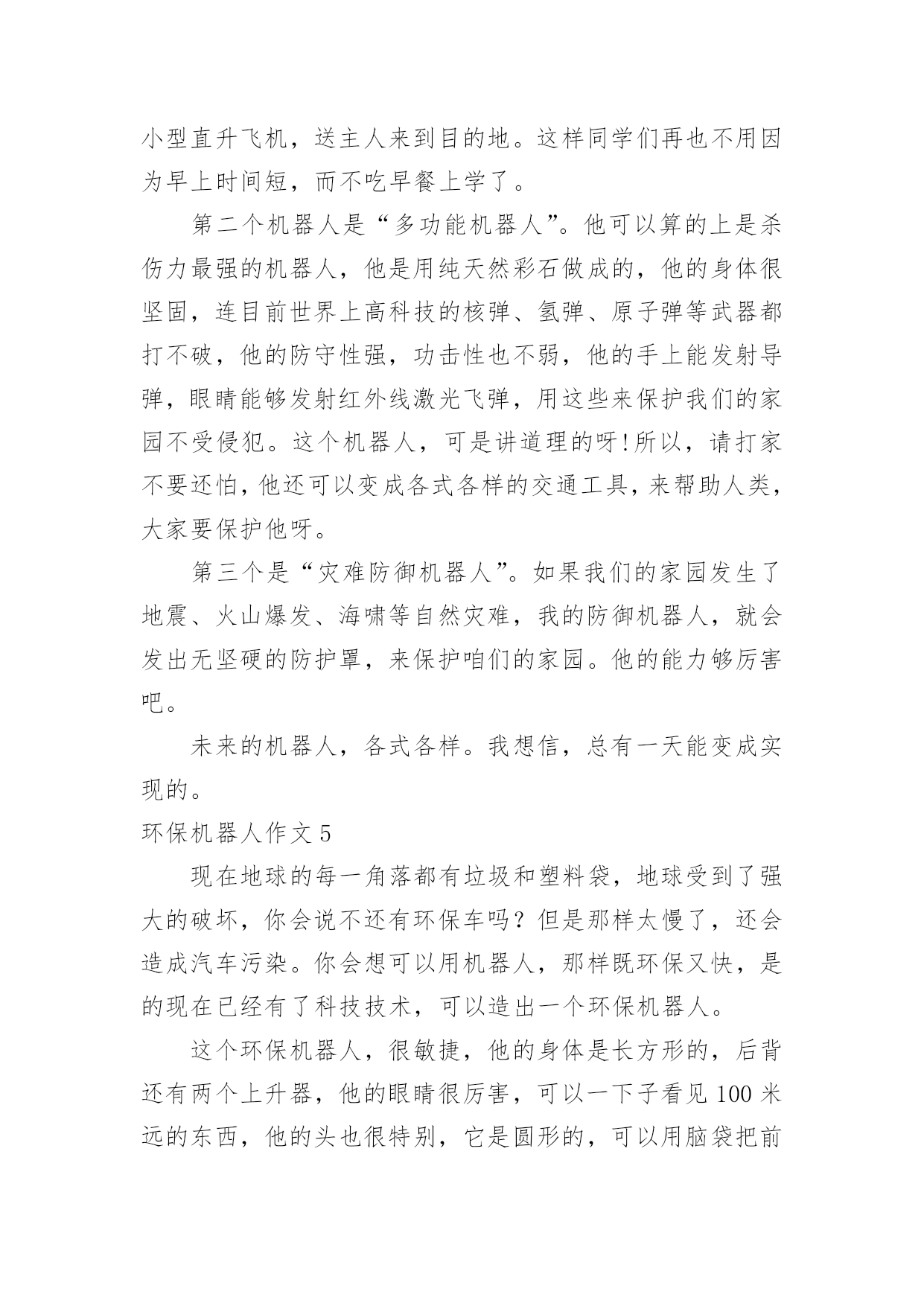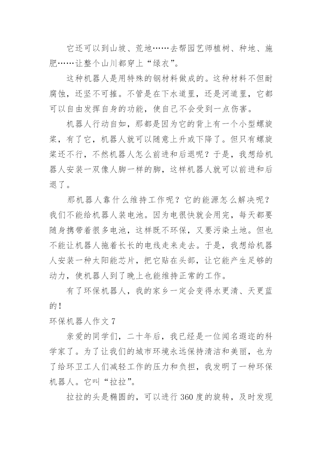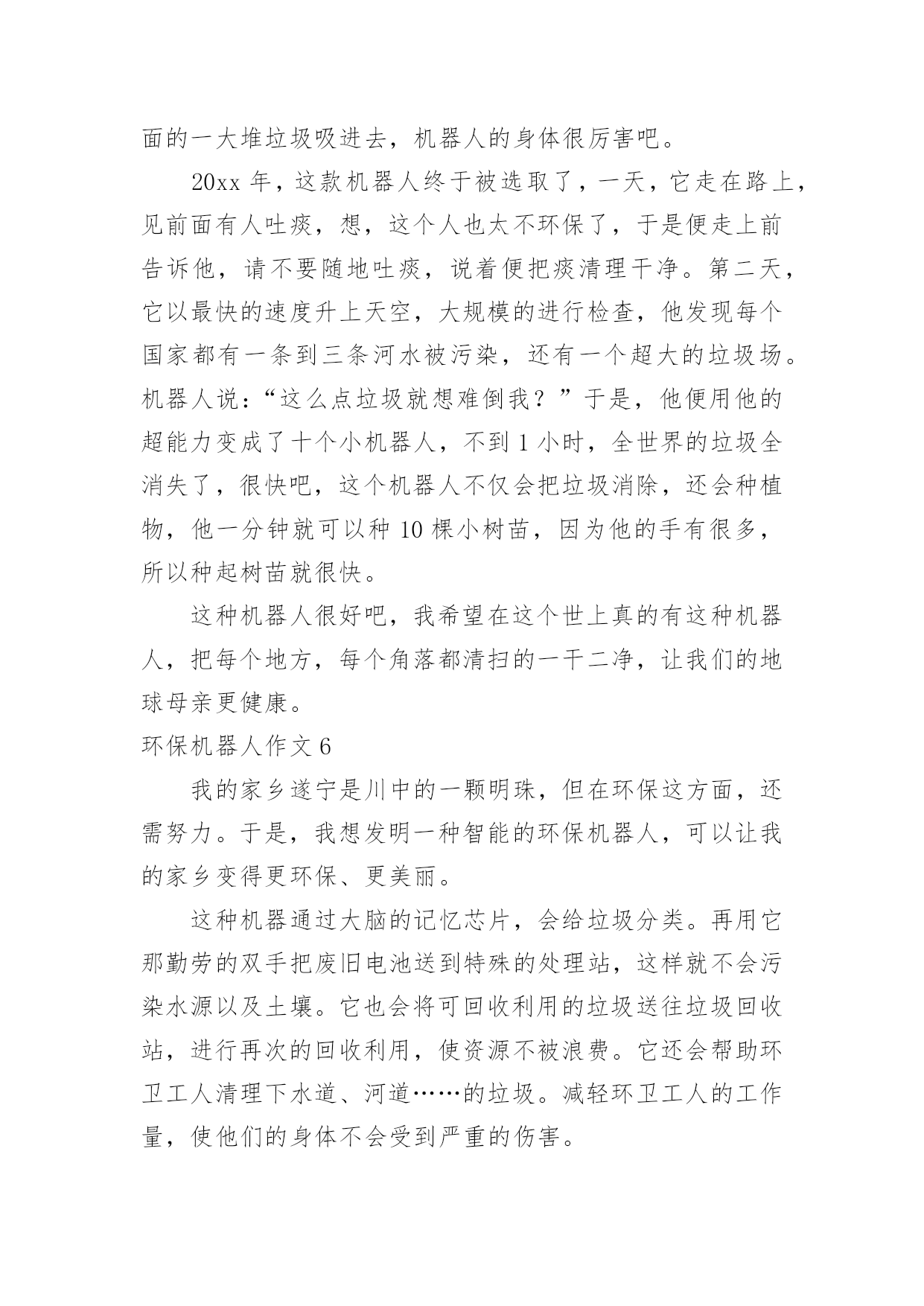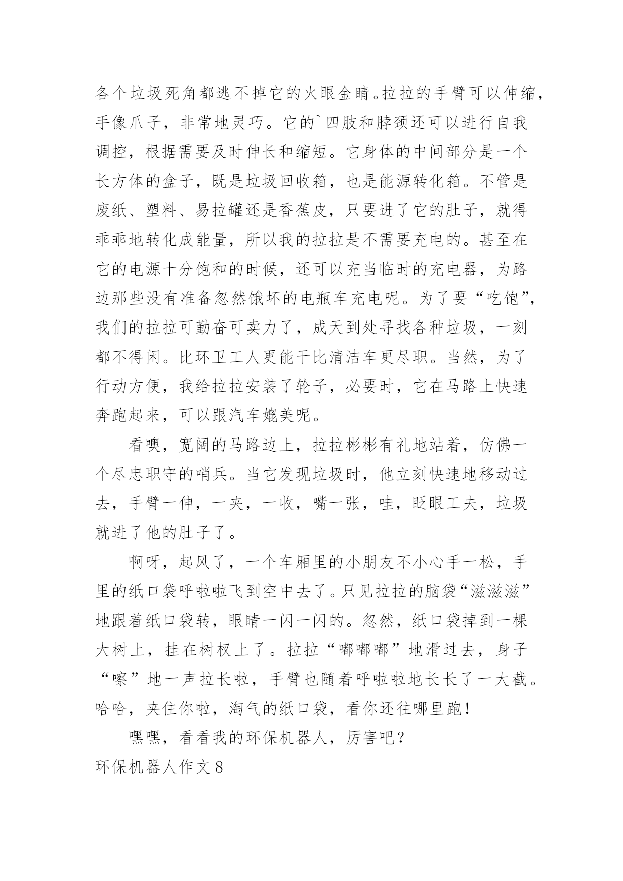 环保机器人作文环保机器人作文(汇编10篇)在日常学习、工作和生活中,大家都不可避免地会接触到作文吧,作文可分为小学作文、中学作文、大学作文(论文)。那么你有了解过作文吗?下面是小编帮大家整理的环保机器人作文,欢迎阅读与收藏。环保机器人作文1环保机器人的设计十分新颖,它的头是圆形的,身体是椭圆形的,没有开启的时候,它的全身就像是一个大圆球似的。它头上有一个小小的显示屏,显示屏旁边有红、绿、紫三种颜色的按键。它的脚就是两排轮子,这些轮子可以同时一起走,也可以转来转去的。它的身体有一些白色的波浪条纹,机器人一走动起来,这些条纹也会动起来,不过不是跟着机器人动,而是自己上下起伏,仿佛如海浪似的条纹。我的这个环保机器人扫起地来,可谓是功能强大啊!按下红色的按键,机器人就会自动打扫卫生。机器人打扫时有好几只手,本身的两只手可以伸长一米,平时打扫不到位的地方就可以轻而易举的打扫到。机器人如果打扫到有很多灰尘的地方,它就会把灰尘吸进去,然后把灰尘变为风从排风口排出,并且这样的风不会对人体造成伤害。绿色的按键是净化空气时用的,有些空气受了污染,机器人就会把污染源全部吸进去,把空气净化,再把净化了的空气放出来,这样就不用担心家里的空气不清新了。紫色的按键非常的神奇,它能变废为宝,把打扫了的垃圾吃进去后按下它可以把垃圾转换成彩纸,文具盒,笔,尺子等实用的学习用品,把这些文具送给偏远山区的儿童,也体现我们的一片爱心。对了,忘记告诉你了,机器人是不用充电或放电池的,只要把垃圾吃进去,不用按什么键,就可以把垃圾转换为能源。怎么样?我的机器人是不是非常的环保,非常的牛逼,你想不想拥有一个?老实告诉我,现在的科技飞速发展,在未来会有更多有趣的,功能强大的机器人被创造出来。我一定要努力读书,将来设计一台属于自己的机器人。环保机器人作文2这种垃圾桶绝不会是破破烂烂的样子。制做这种垃圾桶的材料是经过多层安全检验后特别批准的,不会对人体造成任何伤害。机器人型的垃圾桶的“体重”是30千克,身高是1.2米。因为是特意为小学设计的,所以机器人垃圾桶的身高才会是1.2米,这样就可以让一年级小朋友也为环保做出了一份力量!它是有“眼睛、鼻子、嘴巴、头、肚子、手、脚”的。机器人垃圾桶的头是可以取下来的。学校里的老师可以在第二天来到时,在班里放出前一天谁在校园里乱丢垃圾,以此告诉同学门要保护环境,不要乱丢垃圾。那时垃圾的人就该脸红了。器人垃圾桶的“眼睛”其实是一架微型相机。也就是会把同学随手乱丢垃圾的情况拍摄下来。如果:一位小朋友随手把手里的垃圾扔到地上,机器人垃圾桶看到了以后,立刻跑到小朋友身旁温柔的说:“小朋友,请你为保护环境出一份力量,把垃圾捡起来。”如果这位小朋友不听机器人的好心劝告。那么,机器人的“眼睛”就会拍摄下来。机器人垃圾桶的嘴巴是可以说话的。它可以随时提醒人们保护环境!垃圾的“肚子”是可以自动分类成可回收与不可回收物品的,且分的清清楚楚、丝毫不差、阿姨们便可以直接把可回收不可回收物品区分出来,这样他们即可以节省出时间去为人民服务,又可以提高公作的效率。机器人型垃圾桶的脚又大又宽,因为只有又大又宽的脚,才可以支撑起整个身体。当然,垃圾桶的脚还可以到处跑着捡垃圾。我现在一定好好学习,长大后发明出这种垃圾桶。环保机器人作文3我们的家乡到处都有垃圾,学校、家里有垃圾,广场、街道更是垃圾成堆,臭气熏天。如果有一个环保机器人,能帮我们清理垃圾,那该多好呀!假如有环保机器人,我们就幸福了。每天可以帮我们清理家里垃圾,如果我们不小心把垃圾丢在地上,环保机器人也能马上帮我们把垃圾吃到肚子里。每天晚上,他就把吃了各家各户的垃圾,自动分类,分成可回收类和不可回收类。清理好的可回收类的垃圾,固定放在一个小仓库里,专门有人把这些垃圾加工成有用的东西。把不可回收的垃圾消耗掉,转化成他所需的能量,同时散发出芬芳的香味,人们不再因为街道、广场有臭气而发愁了。每到周末,机器人就为我们擦玻璃,擦外墙。机器人能够自动伸缩,不管楼层有多高,机器人都可以够着。机器人好像有洁癖症,只有发现一点灰尘,它都不会放过。这样,家乡天天带给人们是清新的感觉。家家户户,老老小小,一个个早早地起来,有的去广场上,有的上学校,有的在自家小院内舒活筋骨,抖擞精神,然后再各做各的事去。环保机器还有很多好处呢!一是它的能源主要是太阳能,二氧化碳,所以根本就不用担心能源问题。二是这种环保机器人,它可以去发现“猎物”,24小时可以不用休息。还有一种神奇的功能,就是能感觉你身边有伤害你的细菌,并能立刻帮你把细菌清理掉。这种机器人,不仅制造方便,而且好处很多。我爱这环保机器人,我一定要宣传出去。环保机器人作文4终于到了2036年,我成了一名机器人工程师,我设计了许多功能不同的机器人,下面我给大家介绍一下吧!自从我成了工程师以后,我每