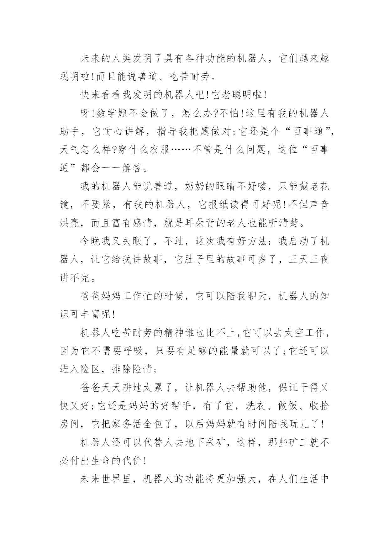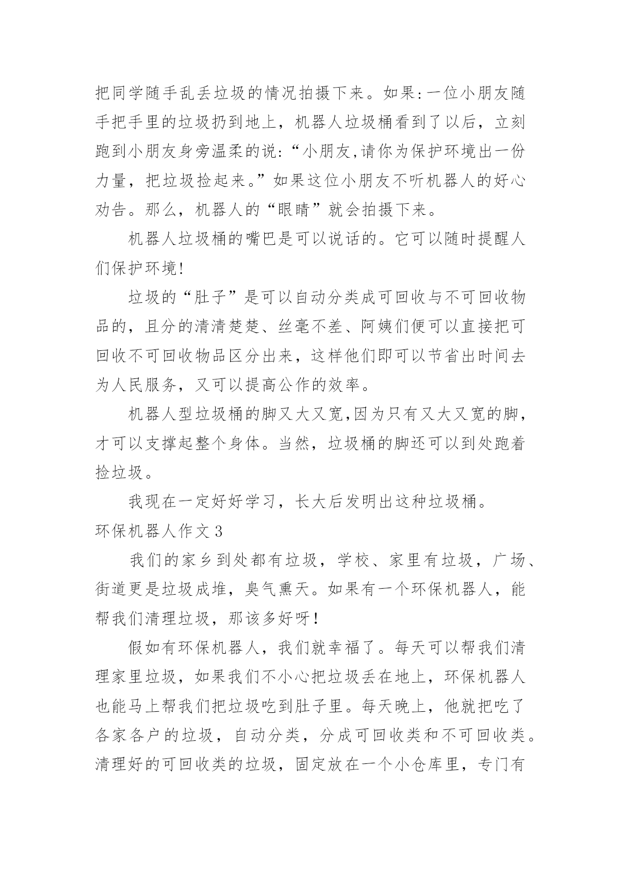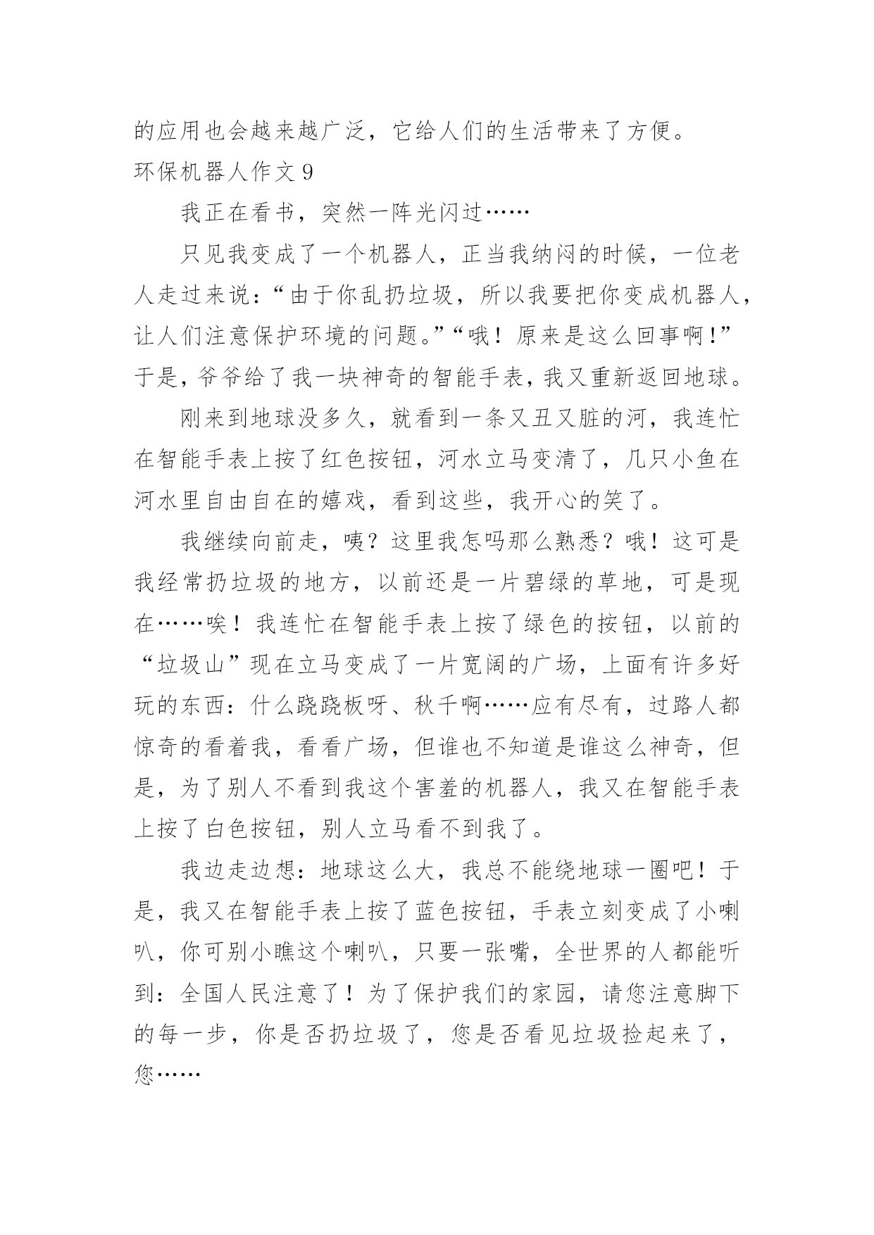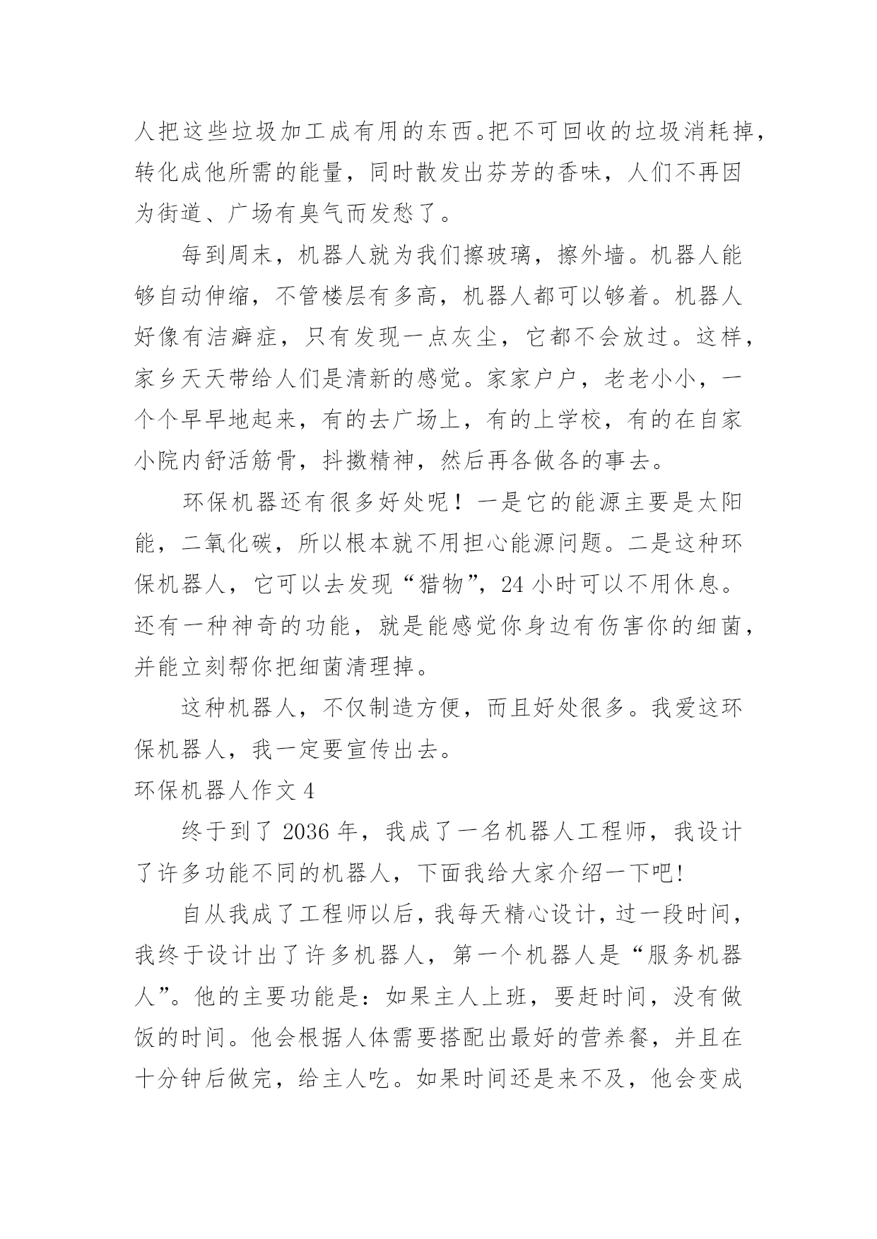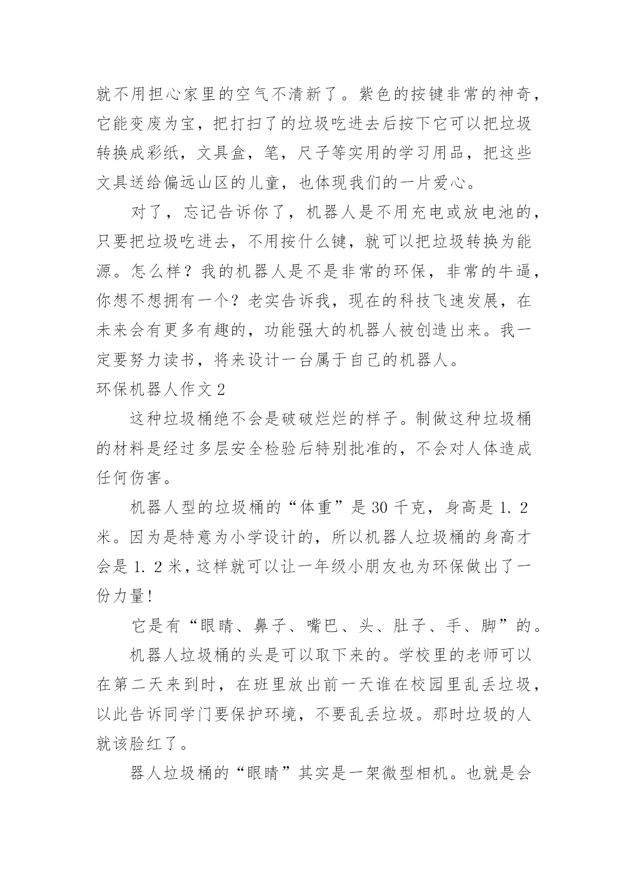 环保机器人作文环保机器人作文(汇编10篇)在日常学习、工作和生活中,大家都不可避免地会接触到作文吧,作文可分为小学作文、中学作文、大学作文(论文)。那么你有了解过作文吗?下面是小编帮大家整理的环保机器人作文,欢迎阅读与收藏。环保机器人作文1环保机器人的设计十分新颖,它的头是圆形的,身体是椭圆形的,没有开启的时候,它的全身就像是一个大圆球似的。它头上有一个小小的显示屏,显示屏旁边有红、绿、紫三种颜色的按键。它的脚就是两排轮子,这些轮子可以同时一起走,也可以转来转去的。它的身体有一些白色的波浪条纹,机器人一走动起来,这些条纹也会动起来,不过不是跟着机器人动,而是自己上下起伏,仿佛如海浪似的条纹。我的这个环保机器人扫起地来,可谓是功能强大啊!按下红色的按键,机器人就会自动打扫卫生。机器人打扫时有好几只手,本身的两只手可以伸长一米,平时打扫不到位的地方就可以轻而易举的打扫到。机器人如果打扫到有很多灰尘的地方,它就会把灰尘吸进去,然后把灰尘变为风从排风口排出,并且这样的风不会对人体造成伤害。绿色的按键是净化空气时用的,有些空气受了污染,机器人就会把污染源全部吸进去,把空气净化,再把净化了的空气放出来,这样就不用担心家里的空气不清新了。紫色的按键非常的神奇,它能变废为宝,把打扫了的垃圾吃进去后按下它可以把垃圾转换成彩纸,文具盒,笔,尺子等实用的学习用品,把这些文具送给偏远山区的儿童,也体现我们的一片爱心。对了,忘记告诉你了,机器人是不用充电或放电池的,只要把垃圾吃进去,不用按什么键,就可以把垃圾转换为能源。怎么样?我的机器人是不是非常的环保,非常的牛逼,你想不想拥有一个?老实告诉我,现在的科技飞速发展,在未来会有更多有趣的,功能强大的机器人被创造出来。我一定要努力读书,将来设计一台属于自己的机器人。环保机器人作文2这种垃圾桶绝不会是破破烂烂的样子。制做这种垃圾桶的材料是经过多层安全检验后特别批准的,不会对人体造成任何伤害。机器人型的垃圾桶的“体重”是30千克,身高是1.2米。因为是特意为小学设计的,所以机器人垃圾桶的身高才会是1.2米,这样就可以让一年级小朋友也为环保做出了一份力量!它是有“眼睛、鼻子、嘴巴、头、肚子、手、脚”的。机器人垃圾桶的头是可以取下来的。学校里的老师可以在第二天来到时,在班里放出前一天谁在校园里乱丢垃圾,以此告诉同学门要保护环境,不要乱丢垃圾。那时垃圾的人就该脸红了。器人垃圾桶的“眼睛”其实是一架微型相机。也就是会把同学随手乱丢垃圾的情况拍摄下来。如果:一位小朋友随手把手里的垃圾扔到地上,机器人垃圾桶看到了以后,立刻跑到小朋友身旁温柔的说:“小朋友,请你为保护环境出一份力量,把垃圾捡起来。”如果这位小朋友不听机器人的好心劝告。那么,机器人的“眼睛”就会拍摄下来。机器人垃圾桶的嘴巴是可以说话的。它可以随时提醒人们保护环境!垃圾的“肚子”是可以自动分类成可回收与不可回收物品的,且分的清清楚楚、丝毫不差、阿姨们便可以直接把可回收不可回收物品区分出来,这样他们即可以节省出时间去为人民服务,又可以提高公作的效率。机器人型垃圾桶的脚又大又宽,因为只有又大又宽的脚,才可以支撑起整个身体。当然,垃圾桶的脚还可以到处跑着捡垃圾。我现在一定好好学习,长大后发明出这种垃圾桶。环保机器人作文3我们的家乡到处都有垃圾,学校、家里有垃圾,广场、街道更是垃圾成堆,臭气熏天。如果有一个环保机器人,能帮我们清理垃圾,那该多好呀!假如有环保机器人,我们就幸福了。每天可以帮我们清理家里垃圾,如果我们不小心把垃圾丢在地上,环保机器人也能马上帮我们把垃圾吃到肚子里。每天晚上,他就把吃了各家各户的垃圾,自动分类,分成可回收类和不可回收类。清理好的可回收类的垃圾,固定放在一个小仓库里,专门有人把这些垃圾加工成有用的东西。把不可回收的垃圾消耗掉,转化成他所需的能量,同时散发出芬芳的香味,人们不再因为街道、广场有臭气而发愁了。每到周末,机器人就为我们擦玻璃,擦外墙。机器人能够自动伸缩,不管楼层有多高,机器人都可以够着。机器人好像有洁癖症,只有发现一点灰尘,它都不会放过。这样,家乡天天带给人们是清新的感觉。家家户户,老老小小,一个个早早地起来,有的去广场上,有的上学校,有的在自家小院内舒活筋骨,抖擞精神,然后再各做各的事去。环保机器还有很多好处呢!一是它的能源主要是太阳能,二氧化碳,所以根本就不用担心能源问题。二是这种环保机器人,它可以去发现“猎物”,24小时可以不用休息。还有一种神奇的功能,就是能感觉你身边有伤害你的细菌,并能立刻帮你把细菌清理掉。这种机器人,不仅制造方便,而且好处很多。我爱这环保机器人,我一定要宣传出去。环保机器人作文4终于到了2036年,我成了一名机器人工程师,我设计了许多功能不同的机器人,下面我给大家介绍一下吧!自从我成了工程师以后,我每