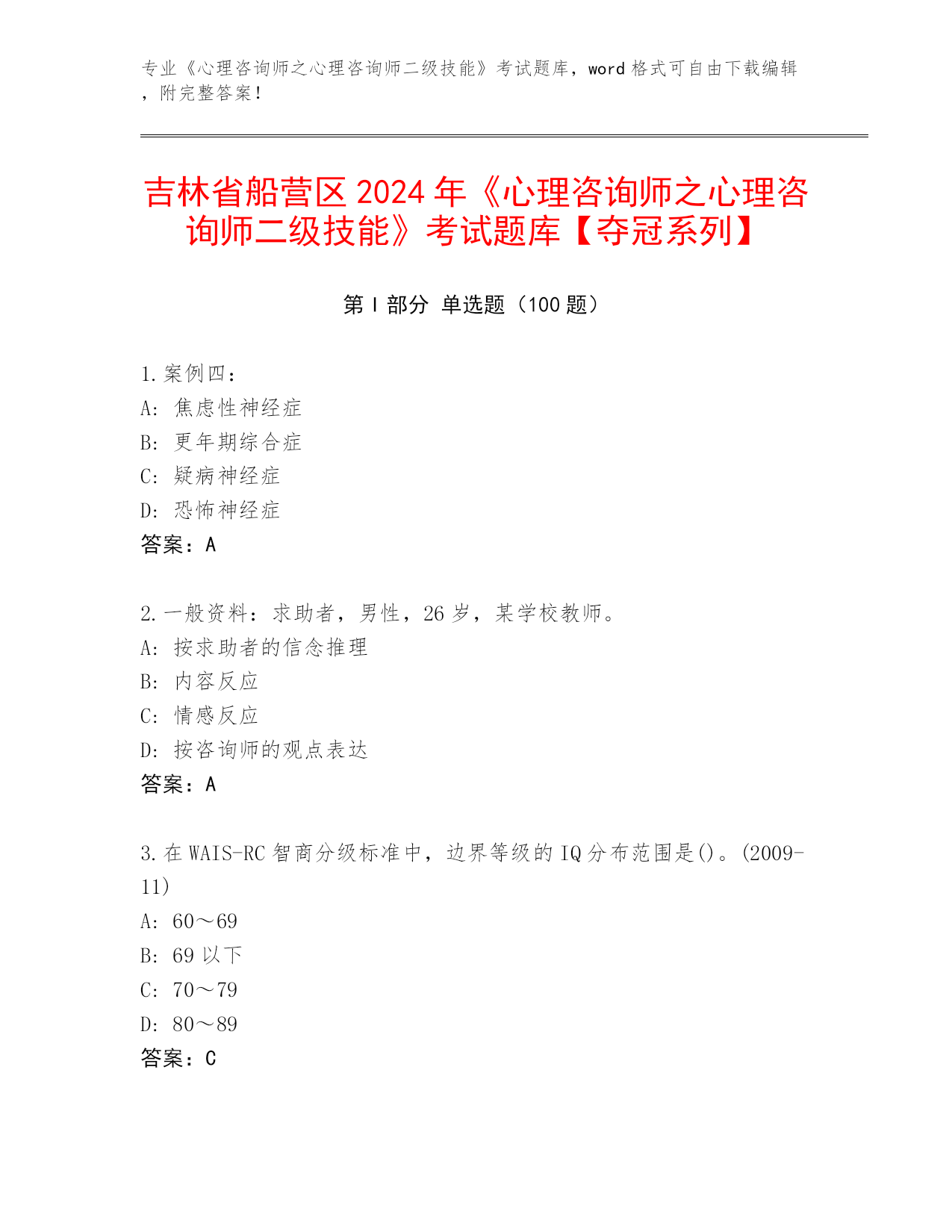 吉林省《心理咨询师之心理咨询师二级技能》资格考试必刷200题通关秘籍题库【夺冠系列】