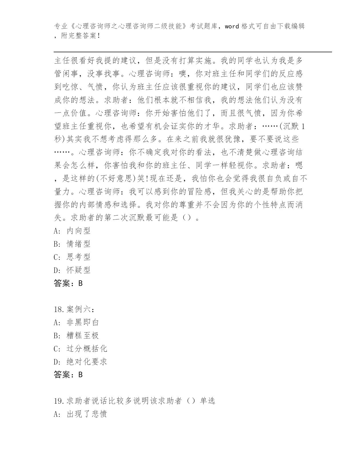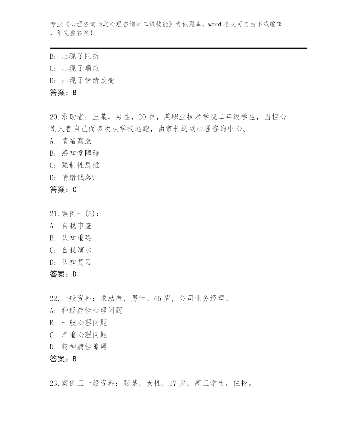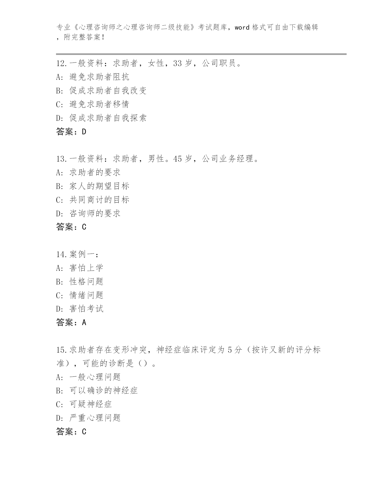 吉林省绿园区整理《心理咨询师之心理咨询师二级技能》考试必考200题完整题库(夺冠系列)