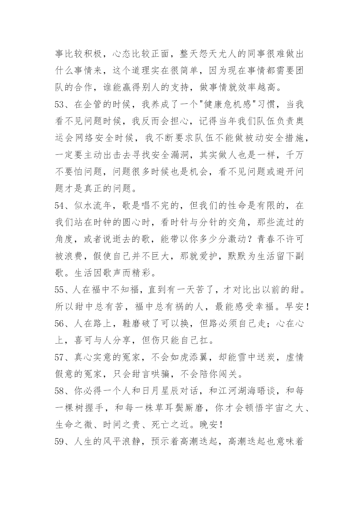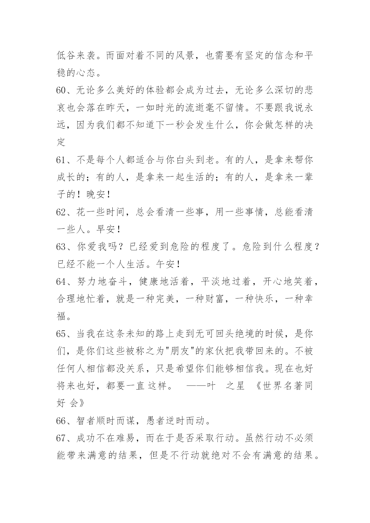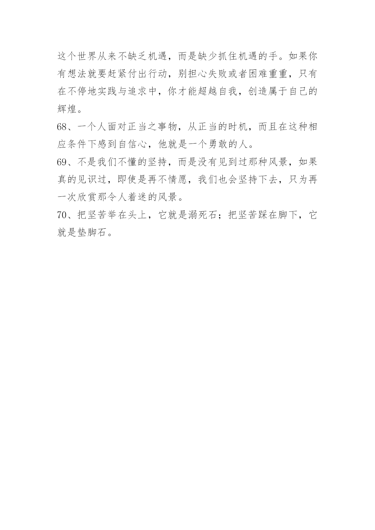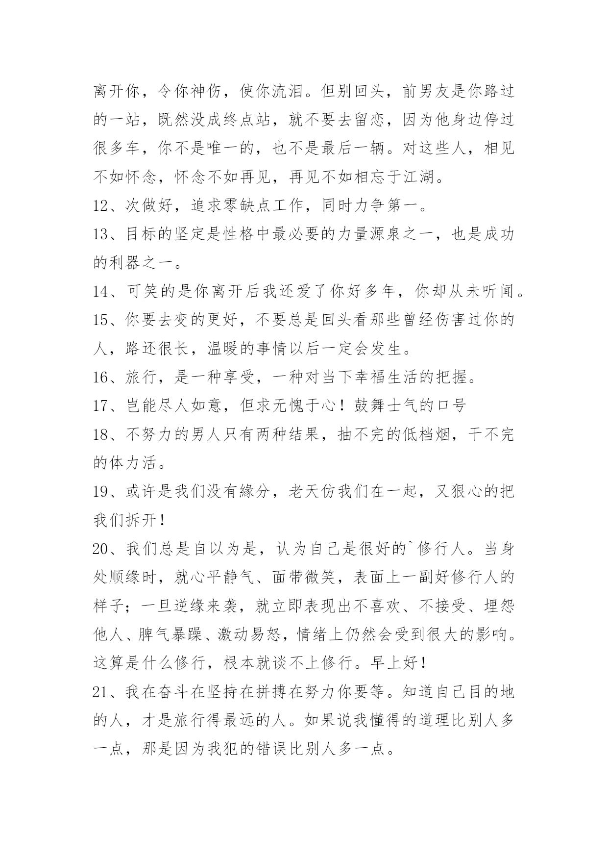工作励志语录70条【精华】工作励志语录70条无论如何,路都要自己走,苦都要自己吃,任何人都无法给予全部依赖。早安![太阳][太阳]下面是关于工作励志语录70条,感兴趣的一起来看看吧。1、最有希望的成功者并不都是才华出众的人,而是那些最善于利用每一时机去发掘开拓的人。2、真是认为自己能行的人,越能够变得聪明能行。积极的心态是创造成功的契机。3、成功不单指生意方面,拥有一个成功的家庭那是很重要的。成家是容易,但是拥有一个高品质的家,那很难。如果是自觉自愿的为这个家去奋斗,那就更难。4、友谊也像花朵,好好地培养,可以开得更心花怒放,可是一旦任性或者不幸从根本上破坏了友谊,这朵心上盛开的花,可以立刻萎颓凋谢的。恋爱不会因结婚而终止:爱的事业是永无止境的。树是不愿离开花的,是花离开了树。——大仲马5、人在成功的道路上,都是会遇到形形色色的诱惑,而会显现出本能的贪欲,想消除贪欲之心,免去贪欲之苦,必须做到克制、忍耐。能够拯救你的,只能是你自己,做好自己世界就会美好。6、年轻人,在做任何事情之前,如果能够充分肯定自我,就等于已经成功了一半。当你们面对挑战时,不妨告诉自己:你就是最优秀的和最聪明的!你们是未来的希望,从小养成信赖自己的习惯,对将来的成长是极有好处的。7、世界就是如此,如果舍不得放弃,就不会有新的收获。故事中的小女孩如果舍不得那条玻璃项链,就不会得到爸爸送给她的珍珠项链。生活中人们总是想要最好的,紧紧抓住眼前最好的不放。每个人的承受能力有限,如果总是选择眼前最好的,就没有机会去获取未来最好的。眼前最好的,未来未必是最好的。只有懂得舍弃,腾出空间,才能容纳未来的美好。只有懂得了舍得的人生大智慧,才能够将自己的人生经营得有声有色,拥有成功而幸福的生活。8、俞敏洪——唯有奋斗能改变命运:如果总认为别人抓住机会,是因为他有什么社会关系,是因为世道太黑暗,那我这辈子肯定不能坐在这里。俞敏洪驳斥了这种论调,他说:能够到达金字塔顶端的只有两种动物,一是雄鹰一种是蜗牛。而他自己其实就是只蜗牛。9、一个人不管遇到任何困难,只要能够跨出他可以明确看出确乎很合理的小小的第一步,那他就会发现,接下去不论是再确定或者实际跨出第二步,就都十分容易了。10、自信是成功的源泉,自省是成长的阶梯,自强是进取的前奏,自豪是未来的序曲。用心去触摸属于自己的阳光,用爱去创造属于自己的世纪。自己读懂了自己,世界才能读懂你。11、有些夜晚,你会想起曾爱过的人。他们伤害你,背叛你,离开你,令你神伤,使你流泪。但别回头,前男友是你路过的一站,既然没成终点站,就不要去留恋,因为他身边停过很多车,你不是唯一的,也不是最后一辆。对这些人,相见不如怀念,怀念不如再见,再见不如相忘于江湖。12、次做好,追求零缺点工作,同时力争第一。13、目标的坚定是性格中最必要的力量源泉之一,也是成功的利器之一。14、可笑的是你离开后我还爱了你好多年,你却从未听闻。15、你要去变的更好,不要总是回头看那些曾经伤害过你的人,路还很长,温暖的事情以后一定会发生。16、旅行,是一种享受,一种对当下幸福生活的把握。17、岂能尽人如意,但求无愧于心!鼓舞士气的口号18、不努力的男人只有两种结果,抽不完的低档烟,干不完的体力活。19、或许是我们没有緣分,老天仿我们在一起,又狠心的把我们拆开!20、我们总是自以为是,认为自己是很好的`修行人。当身处顺缘时,就心平静气、面带微笑,表面上一副好修行人的样子;一旦逆缘来袭,就立即表现出不喜欢、不接受、埋怨他人、脾气暴躁、激动易怒,情绪上仍然会受到很大的影响。这算是什么修行,根本就谈不上修行。早上好!21、我在奋斗在坚持在拼搏在努力你要等。知道自己目的地的人,才是旅行得最远的人。如果说我懂得的道理比别人多一点,那是因为我犯的错误比别人多一点。22、如果一个人喜欢历史和哲学,心就会变得强大无比。因为历史讲永恒,时间上的永恒;而哲学讲无限,范围的无限。有了永恒和无限,别人无奈时,你就会释然;别人恐慌时,你就会勇敢。23、我们总要去自己尝试一些事,才知道他其中的滋味,吞咽别人的经验固然省力,却少了些自己开拓的乐趣。24、珍惜F在,展望未恚^去的美好只需回味。25、人生如登山,如果只关注山巅,那你将失去美丽的过程。26、不时常的交流并没有使我们的关系边的那么冷,因为我们的始终关心着。最主要的,记住了身体是自己的,健康,开心的,我就能感觉到你的快乐!27、人生有两大欢乐,一是拥有后细细的品味,二是追求之中倍感无比充实。有些人为了享乐而苦了生命,有些人为了休息却忙了生命。人们总是在不停地追求完美,却往往错过了当下的完美,要记住:贪婪是最真实的贫穷,满足是最真实的财富!愿你愉悦生命!28、细节往往是成功和失败的关键,所以不能忽略任何细节,不管它看似多么的无关紧要。29、无须匆忙,该来