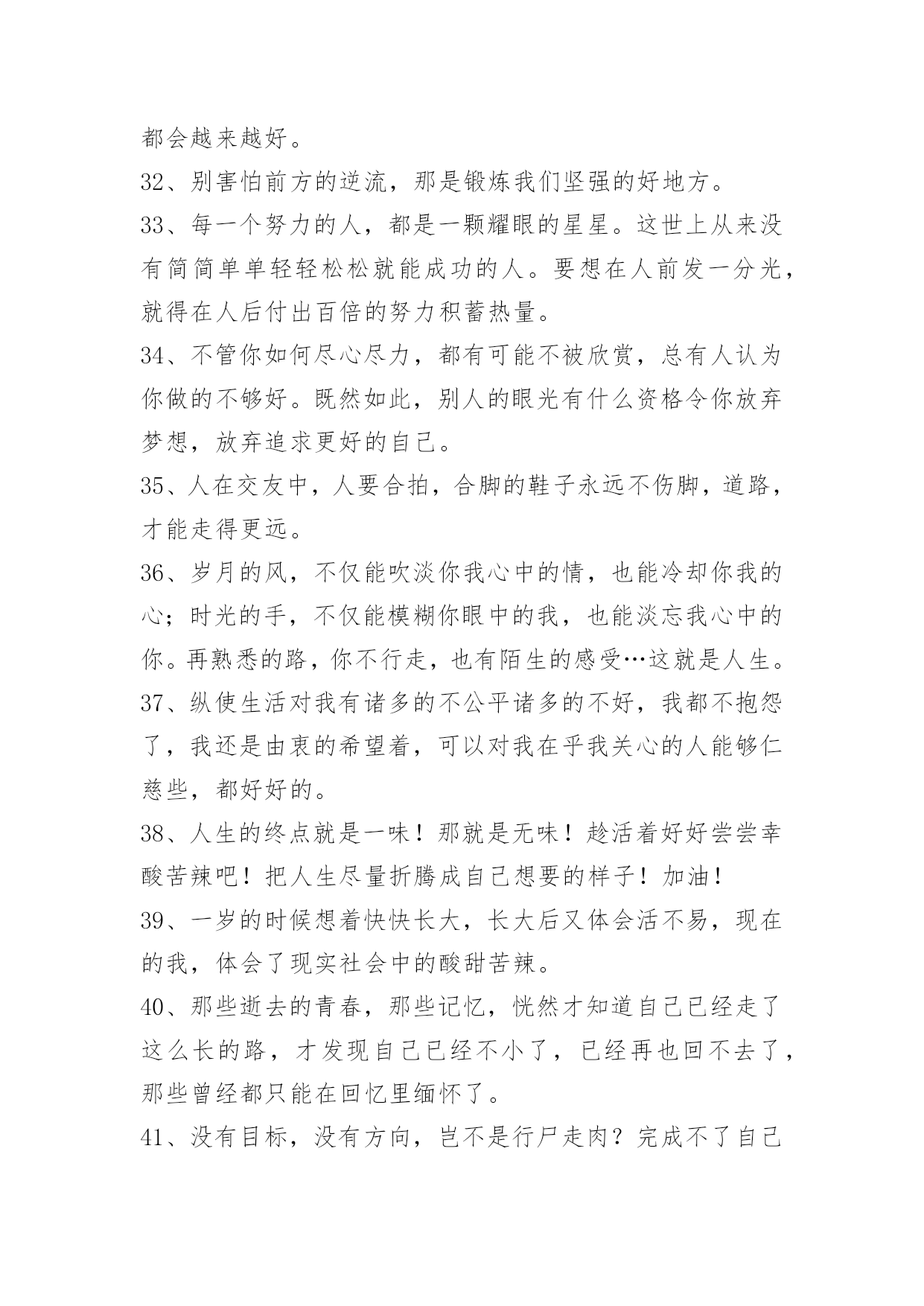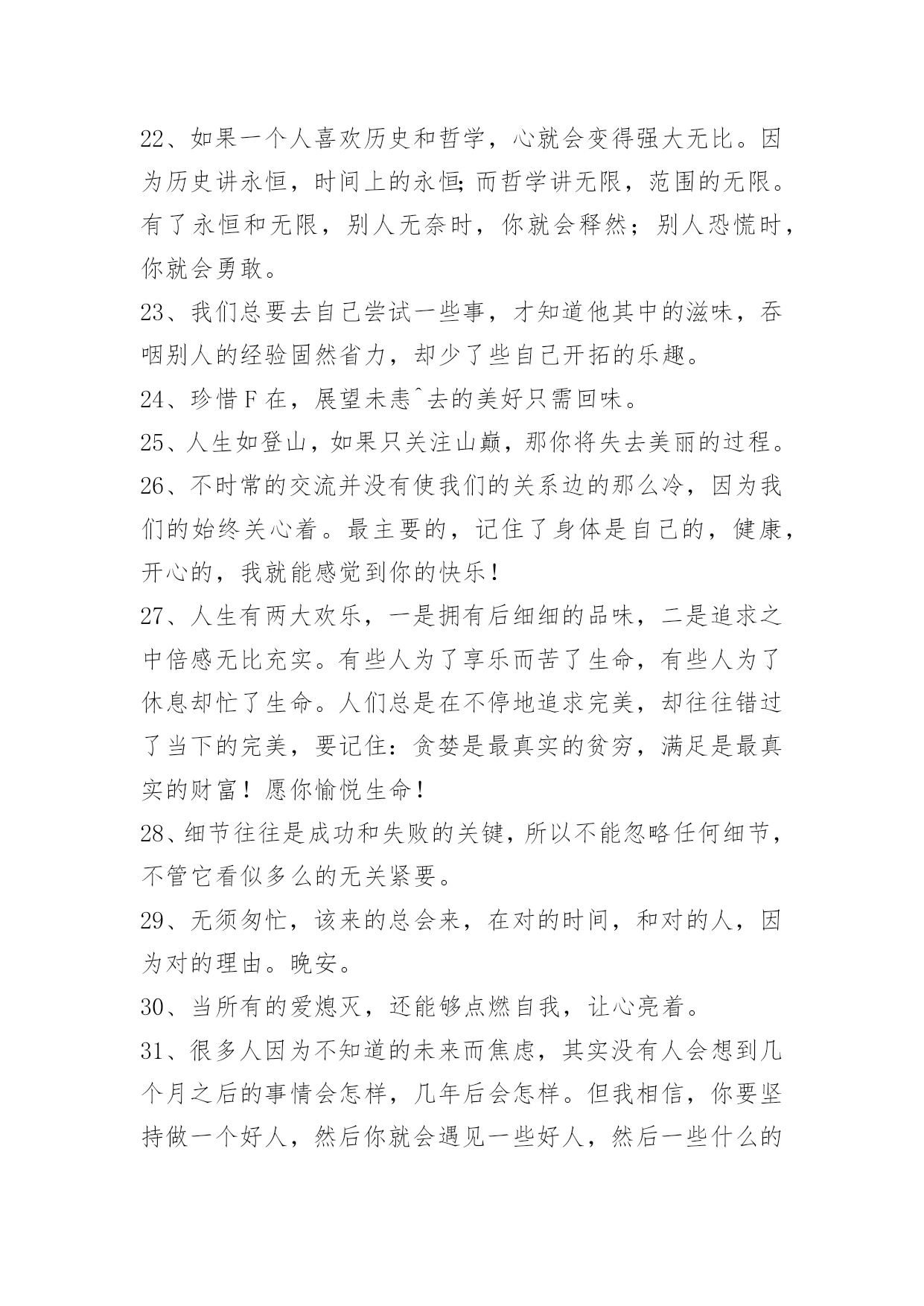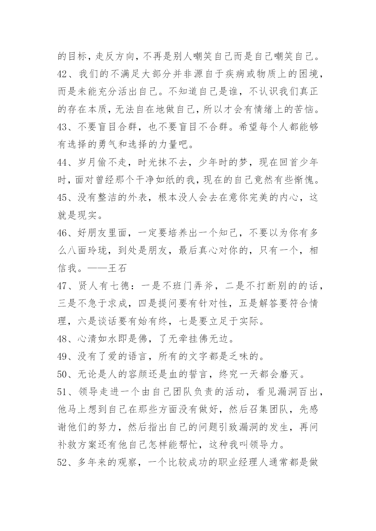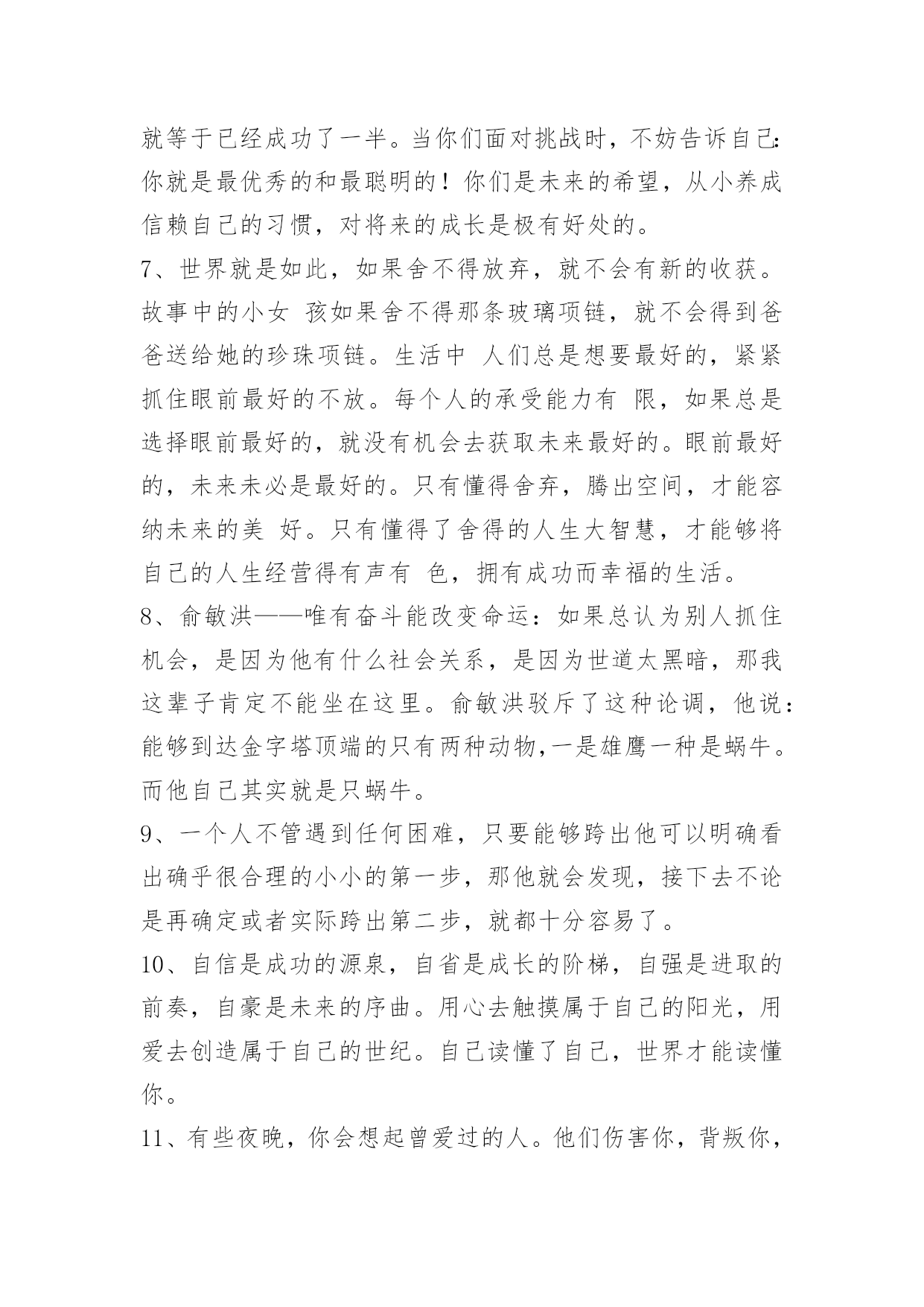 工作励志语录70条【精华】工作励志语录70条无论如何,路都要自己走,苦都要自己吃,任何人都无法给予全部依赖。早安![太阳][太阳]下面是关于工作励志语录70条,感兴趣的一起来看看吧。1、最有希望的成功者并不都是才华出众的人,而是那些最善于利用每一时机去发掘开拓的人。2、真是认为自己能行的人,越能够变得聪明能行。积极的心态是创造成功的契机。3、成功不单指生意方面,拥有一个成功的家庭那是很重要的。成家是容易,但是拥有一个高品质的家,那很难。如果是自觉自愿的为这个家去奋斗,那就更难。4、友谊也像花朵,好好地培养,可以开得更心花怒放,可是一旦任性或者不幸从根本上破坏了友谊,这朵心上盛开的花,可以立刻萎颓凋谢的。恋爱不会因结婚而终止:爱的事业是永无止境的。树是不愿离开花的,是花离开了树。——大仲马5、人在成功的道路上,都是会遇到形形色色的诱惑,而会显现出本能的贪欲,想消除贪欲之心,免去贪欲之苦,必须做到克制、忍耐。能够拯救你的,只能是你自己,做好自己世界就会美好。6、年轻人,在做任何事情之前,如果能够充分肯定自我,就等于已经成功了一半。当你们面对挑战时,不妨告诉自己:你就是最优秀的和最聪明的!你们是未来的希望,从小养成信赖自己的习惯,对将来的成长是极有好处的。7、世界就是如此,如果舍不得放弃,就不会有新的收获。故事中的小女孩如果舍不得那条玻璃项链,就不会得到爸爸送给她的珍珠项链。生活中人们总是想要最好的,紧紧抓住眼前最好的不放。每个人的承受能力有限,如果总是选择眼前最好的,就没有机会去获取未来最好的。眼前最好的,未来未必是最好的。只有懂得舍弃,腾出空间,才能容纳未来的美好。只有懂得了舍得的人生大智慧,才能够将自己的人生经营得有声有色,拥有成功而幸福的生活。8、俞敏洪——唯有奋斗能改变命运:如果总认为别人抓住机会,是因为他有什么社会关系,是因为世道太黑暗,那我这辈子肯定不能坐在这里。俞敏洪驳斥了这种论调,他说:能够到达金字塔顶端的只有两种动物,一是雄鹰一种是蜗牛。而他自己其实就是只蜗牛。9、一个人不管遇到任何困难,只要能够跨出他可以明确看出确乎很合理的小小的第一步,那他就会发现,接下去不论是再确定或者实际跨出第二步,就都十分容易了。10、自信是成功的源泉,自省是成长的阶梯,自强是进取的前奏,自豪是未来的序曲。用心去触摸属于自己的阳光,用爱去创造属于自己的世纪。自己读懂了自己,世界才能读懂你。11、有些夜晚,你会想起曾爱过的人。他们伤害你,背叛你,离开你,令你神伤,使你流泪。但别回头,前男友是你路过的一站,既然没成终点站,就不要去留恋,因为他身边停过很多车,你不是唯一的,也不是最后一辆。对这些人,相见不如怀念,怀念不如再见,再见不如相忘于江湖。12、次做好,追求零缺点工作,同时力争第一。13、目标的坚定是性格中最必要的力量源泉之一,也是成功的利器之一。14、可笑的是你离开后我还爱了你好多年,你却从未听闻。15、你要去变的更好,不要总是回头看那些曾经伤害过你的人,路还很长,温暖的事情以后一定会发生。16、旅行,是一种享受,一种对当下幸福生活的把握。17、岂能尽人如意,但求无愧于心!鼓舞士气的口号18、不努力的男人只有两种结果,抽不完的低档烟,干不完的体力活。19、或许是我们没有緣分,老天仿我们在一起,又狠心的把我们拆开!20、我们总是自以为是,认为自己是很好的`修行人。当身处顺缘时,就心平静气、面带微笑,表面上一副好修行人的样子;一旦逆缘来袭,就立即表现出不喜欢、不接受、埋怨他人、脾气暴躁、激动易怒,情绪上仍然会受到很大的影响。这算是什么修行,根本就谈不上修行。早上好!21、我在奋斗在坚持在拼搏在努力你要等。知道自己目的地的人,才是旅行得最远的人。如果说我懂得的道理比别人多一点,那是因为我犯的错误比别人多一点。22、如果一个人喜欢历史和哲学,心就会变得强大无比。因为历史讲永恒,时间上的永恒;而哲学讲无限,范围的无限。有了永恒和无限,别人无奈时,你就会释然;别人恐慌时,你就会勇敢。23、我们总要去自己尝试一些事,才知道他其中的滋味,吞咽别人的经验固然省力,却少了些自己开拓的乐趣。24、珍惜F在,展望未恚^去的美好只需回味。25、人生如登山,如果只关注山巅,那你将失去美丽的过程。26、不时常的交流并没有使我们的关系边的那么冷,因为我们的始终关心着。最主要的,记住了身体是自己的,健康,开心的,我就能感觉到你的快乐!27、人生有两大欢乐,一是拥有后细细的品味,二是追求之中倍感无比充实。有些人为了享乐而苦了生命,有些人为了休息却忙了生命。人们总是在不停地追求完美,却往往错过了当下的完美,要记住:贪婪是最真实的贫穷,满足是最真实的财富!愿你愉悦生命!28、细节往往是成功和失败的关键,所以不能忽略任何细节,不管它看似多么的无关紧要。29、无须匆忙,该来