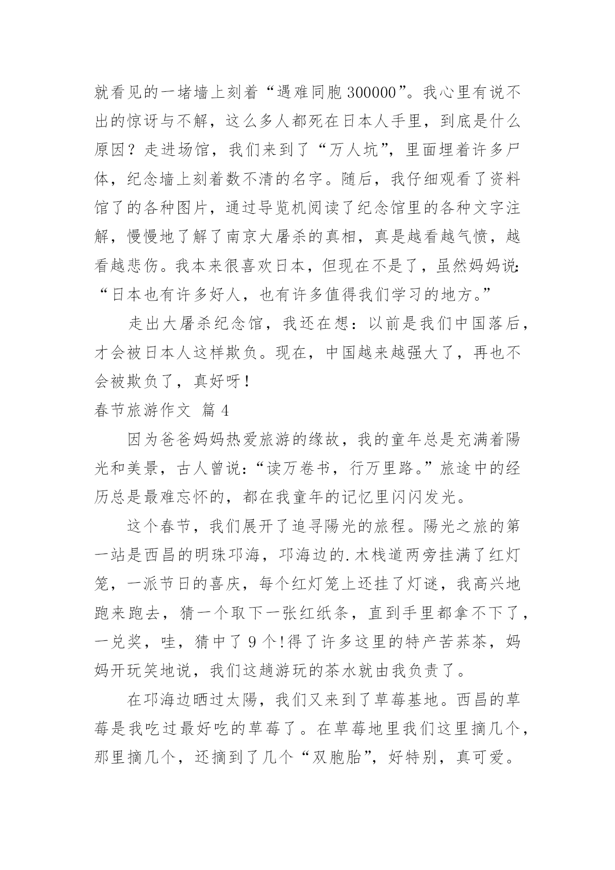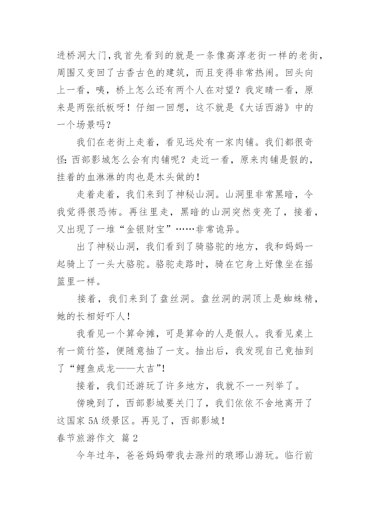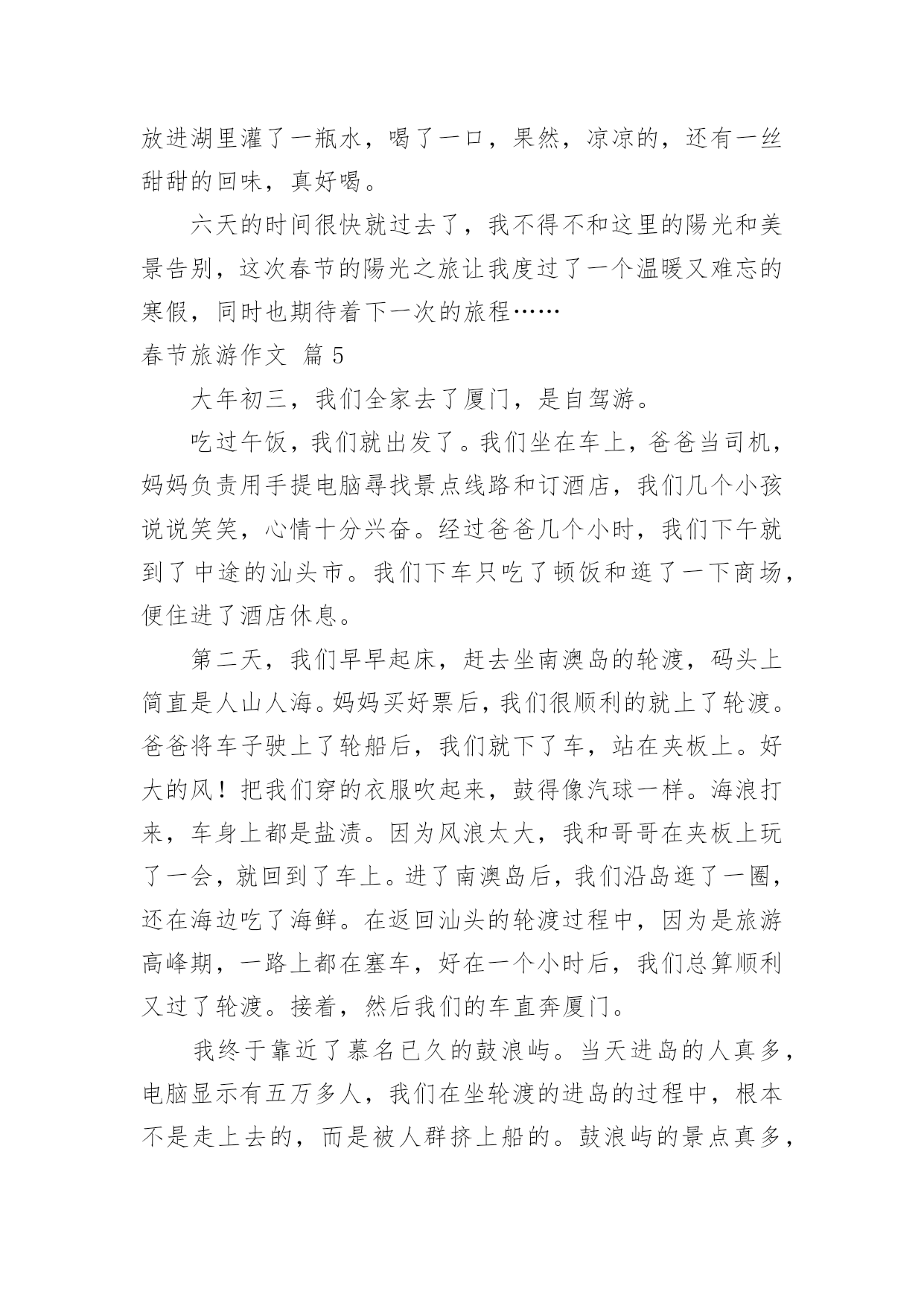 春节旅游作文春节旅游作文合集五篇在平平淡淡的学习、工作、生活中,大家都不可避免地会接触到作文吧,作文可分为小学作文、中学作文、大学作文(论文)。你知道作文怎样才能写的好吗?以下是小编帮大家整理的春节旅游作文5篇,仅供参考,大家一起来看看吧。春节旅游作文篇1今年春节,爸爸妈妈、大伯、三爸和来自意大利的朋友莉莉的爸爸妈妈带着堂哥、大堂姐、二堂姐、哥哥、莉莉和我一起去参观了古装电影之城——西部影城。西部影城位于银川的郊区,是拍古装电影的地方,连著名的大电影《大话西游》、《红高粱》、《锦衣卫》等都是在这儿拍的呢!刚到西部影城的门口,我看见的都是古色古香的建筑,连旁边的小吃店和里面的小卖部都是古屋的造型,令人赞叹不已。进去后,我发现建筑物少了很多,周围都是一望无边的沙石地,让我想起了“我家住在黄土高坡”的歌句。再往里走,景观又不一样了:地还是沙石地,变化是地上多了一群跳舞的人,还多了一条长廊和一阵阵悠扬的歌声。我们顺着长廊入口真正地进入到了西部影城的内部,走进桥洞大门,我首先看到的就是一条像高淳老街一样的老街,周围又变回了古香古色的建筑,而且变得非常热闹。回头向上一看,咦,桥上怎么还有两个人在对望?我定睛一看,原来是两张纸板呀!仔细一回想,这不就是《大话西游》中的一个场景吗?我们在老街上走着,看见远处有一家肉铺。我们都很奇怪:西部影城怎么会有肉铺呢?走近一看,原来肉铺是假的,挂着的血淋淋的肉也是木头做的!走着走着,我们来到了神秘山洞。山洞里非常黑暗,令我觉得很恐怖。再往里走,黑暗的山洞突然变亮了,接着,又出现了一堆“金银财宝”……非常诡异。出了神秘山洞,我们看到了骑骆驼的地方,我和妈妈一起骑上了一头大骆驼。骆驼走路时,骑在它身上好像坐在摇篮里一样。接着,我们来到了盘丝洞。盘丝洞的洞顶上是蜘蛛精,她的长相好吓人!我看见一个算命摊,可是算命的人是假人。我看见桌上有一筒竹签,便随意抽了一支。抽出后,我发现自己竟抽到了“鲤鱼成龙——大吉”!接着,我们还游玩了许多地方,我就不一一列举了。傍晚到了,西部影城要关门了,我们依依不舍地离开了这国家5A级景区。再见了,西部影城!春节旅游作文篇2今年过年,爸爸妈妈带我去滁州的琅琊山游玩。临行前妈妈带我读了欧阳修的《醉翁亭记》,了解到醉翁亭是琅琊山上的琅琊寺里的一位叫智仙的和尚建造的,山上还有一道泉水叫酿泉。其中我最喜欢里面的野草发而幽香,佳木秀而繁阴,风霜高洁,水落而石出者,山间之四时也。从中可以想象那里的风景有多么美。我多想亲自去看一看,那才好呢。春节旅游作文篇3春节的大年初三,我和爸爸、妈妈、姥姥、姥爷,还有阿舅、舅妈和妹妹,全家人一起去南京旅游。我们一共游玩了三天,游览了许多著名景点,如:夫子庙、总统府、中山林、明孝陵、南京大屠杀纪念馆……其中,我印象最深刻的就是夫子庙和南京大屠杀纪念馆了。我们住在南京大石坝街的桔子酒店,夫子庙就在附近。我们来到夫子庙时正好是中午,夫子庙早已是人山人海,真不愧是南京最著名、最热闹的步行街。人们有的在忙着拍照,有的在品尝小吃,还有的在买各种各样有趣的小玩意……街道两旁的树上、房檐下挂着一个个的大红灯笼,不计其数的商店里人来人往,各种各样的东西摆满了店铺的柜台。夫子庙就在历史上赫赫有名的秦淮河边,许多游船在秦淮河上行驶,这是最吸引我和妹妹的。爸爸去买了游船的票,于是,我们乘着古香古色的画舫,绕着秦淮河转了一圈。游船上还有导游的讲解录音,我一边听,一边将头伸出窗外,迎面吹来的风让人神清气爽。第二天下午,我们按照妈妈的计划,来到了南京大屠杀纪念馆。从外面看,纪念馆像一面巨大的墙,我刚走进里面就看见的一堵墙上刻着“遇难同胞300000”。我心里有说不出的惊讶与不解,这么多人都死在日本人手里,到底是什么原因?走进场馆,我们来到了“万人坑”,里面埋着许多尸体,纪念墙上刻着数不清的名字。随后,我仔细观看了资料馆了的各种图片,通过导览机阅读了纪念馆里的各种文字注解,慢慢地了解了南京大屠杀的真相,真是越看越气愤,越看越悲伤。我本来很喜欢日本,但现在不是了,虽然妈妈说:“日本也有许多好人,也有许多值得我们学习的地方。”走出大屠杀纪念馆,我还在想:以前是我们中国落后,才会被日本人这样欺负。现在,中国越来越强大了,再也不会被欺负了,真好呀!春节旅游作文篇4因为爸爸妈妈热爱旅游的缘故,我的童年总是充满着陽光和美景,古人曾说:“读万卷书,行万里路。”旅途中的经历总是最难忘怀的,都在我童年的记忆里闪闪发光。这个春节,我们展开了追寻陽光的旅程。陽光之旅的第一站是西昌的明珠邛海,邛海边的.木栈道两旁挂满了红灯笼,一派节日的喜庆,每个红灯笼上还挂了灯谜,我高兴地跑来跑去,猜一个取下一张红纸条,直到手里都拿不下了,一兑奖,哇,猜中了9个!得了许多这里的特产苦荞茶,妈妈开玩笑地说,我们这趟游玩的茶水就由我