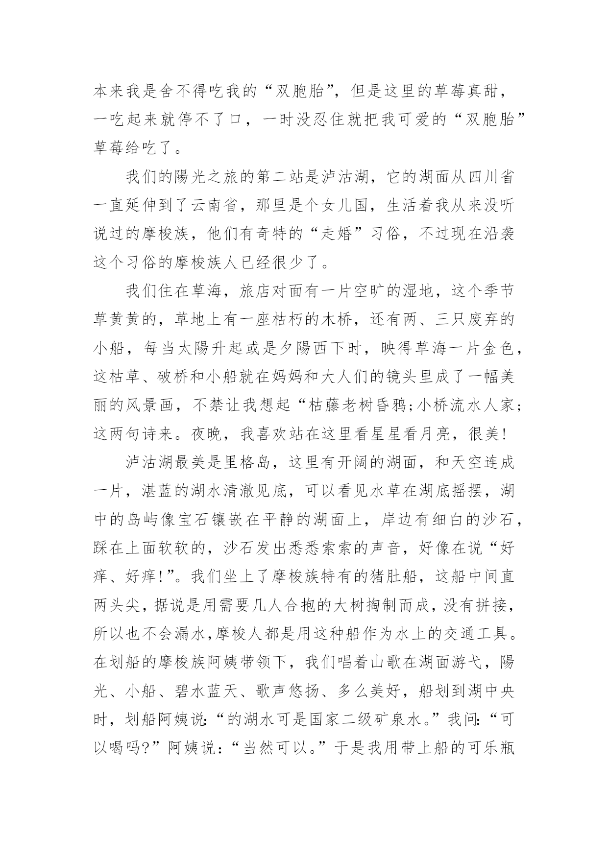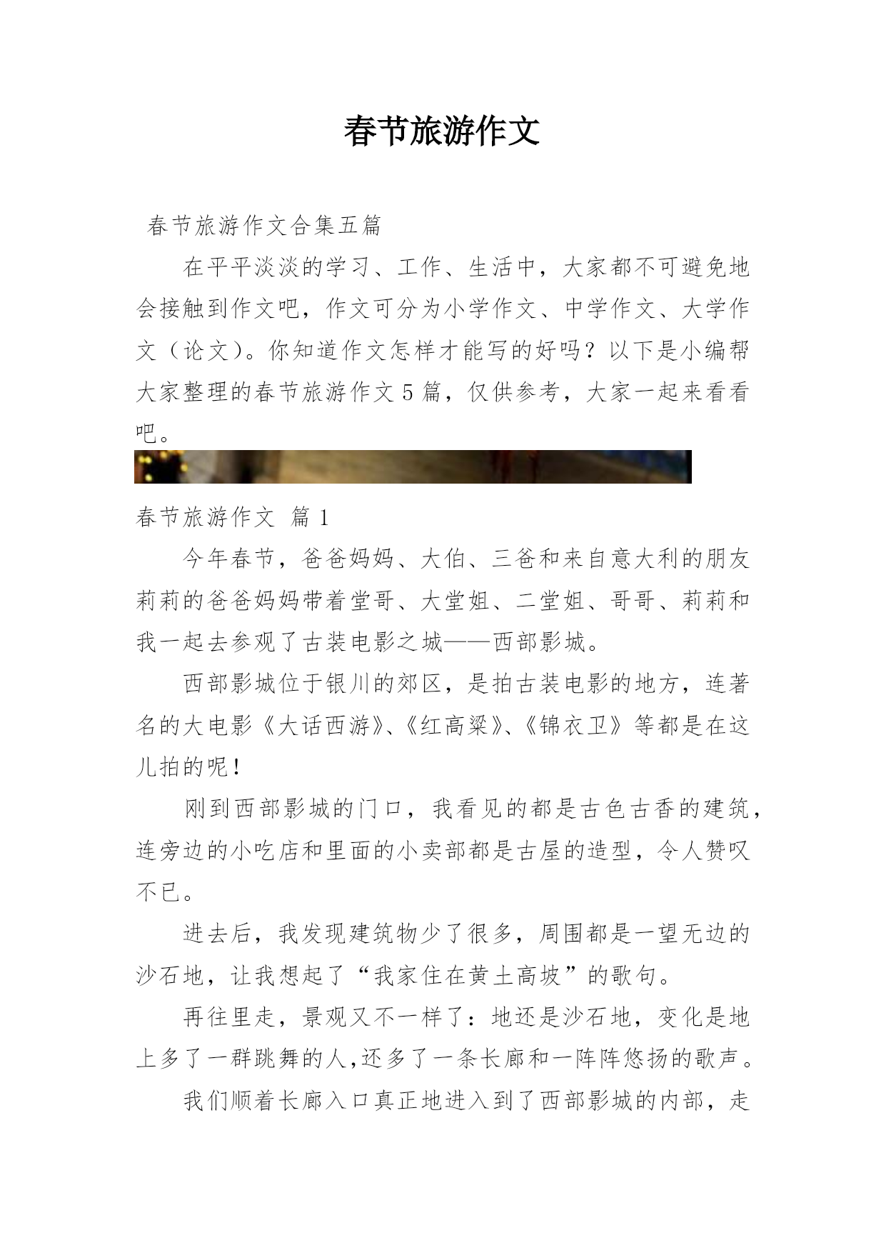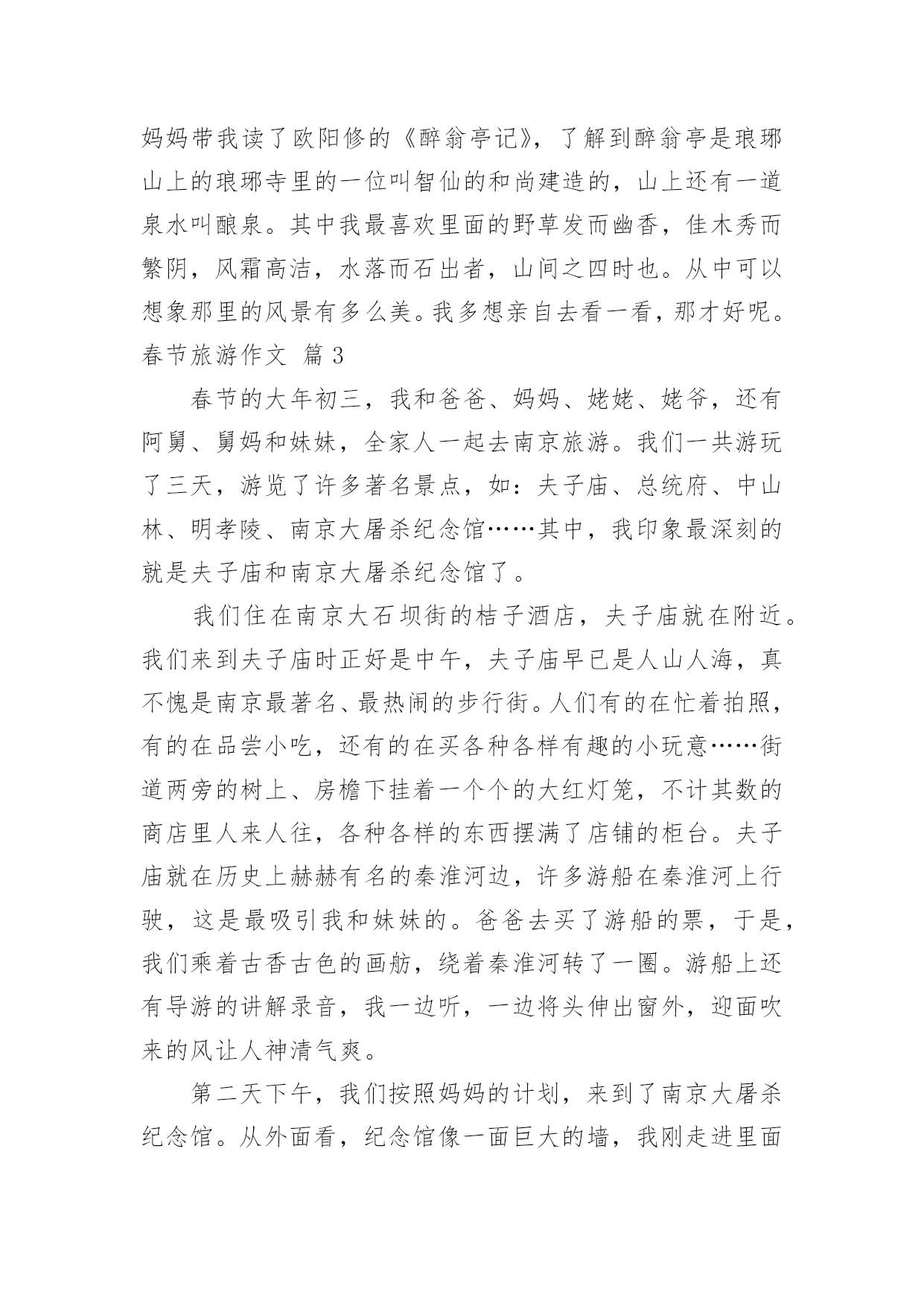 春节旅游作文春节旅游作文合集五篇在平平淡淡的学习、工作、生活中,大家都不可避免地会接触到作文吧,作文可分为小学作文、中学作文、大学作文(论文)。你知道作文怎样才能写的好吗?以下是小编帮大家整理的春节旅游作文5篇,仅供参考,大家一起来看看吧。春节旅游作文篇1今年春节,爸爸妈妈、大伯、三爸和来自意大利的朋友莉莉的爸爸妈妈带着堂哥、大堂姐、二堂姐、哥哥、莉莉和我一起去参观了古装电影之城——西部影城。西部影城位于银川的郊区,是拍古装电影的地方,连著名的大电影《大话西游》、《红高粱》、《锦衣卫》等都是在这儿拍的呢!刚到西部影城的门口,我看见的都是古色古香的建筑,连旁边的小吃店和里面的小卖部都是古屋的造型,令人赞叹不已。进去后,我发现建筑物少了很多,周围都是一望无边的沙石地,让我想起了“我家住在黄土高坡”的歌句。再往里走,景观又不一样了:地还是沙石地,变化是地上多了一群跳舞的人,还多了一条长廊和一阵阵悠扬的歌声。我们顺着长廊入口真正地进入到了西部影城的内部,走进桥洞大门,我首先看到的就是一条像高淳老街一样的老街,周围又变回了古香古色的建筑,而且变得非常热闹。回头向上一看,咦,桥上怎么还有两个人在对望?我定睛一看,原来是两张纸板呀!仔细一回想,这不就是《大话西游》中的一个场景吗?我们在老街上走着,看见远处有一家肉铺。我们都很奇怪:西部影城怎么会有肉铺呢?走近一看,原来肉铺是假的,挂着的血淋淋的肉也是木头做的!走着走着,我们来到了神秘山洞。山洞里非常黑暗,令我觉得很恐怖。再往里走,黑暗的山洞突然变亮了,接着,又出现了一堆“金银财宝”……非常诡异。出了神秘山洞,我们看到了骑骆驼的地方,我和妈妈一起骑上了一头大骆驼。骆驼走路时,骑在它身上好像坐在摇篮里一样。接着,我们来到了盘丝洞。盘丝洞的洞顶上是蜘蛛精,她的长相好吓人!我看见一个算命摊,可是算命的人是假人。我看见桌上有一筒竹签,便随意抽了一支。抽出后,我发现自己竟抽到了“鲤鱼成龙——大吉”!接着,我们还游玩了许多地方,我就不一一列举了。傍晚到了,西部影城要关门了,我们依依不舍地离开了这国家5A级景区。再见了,西部影城!春节旅游作文篇2今年过年,爸爸妈妈带我去滁州的琅琊山游玩。临行前妈妈带我读了欧阳修的《醉翁亭记》,了解到醉翁亭是琅琊山上的琅琊寺里的一位叫智仙的和尚建造的,山上还有一道泉水叫酿泉。其中我最喜欢里面的野草发而幽香,佳木秀而繁阴,风霜高洁,水落而石出者,山间之四时也。从中可以想象那里的风景有多么美。我多想亲自去看一看,那才好呢。春节旅游作文篇3春节的大年初三,我和爸爸、妈妈、姥姥、姥爷,还有阿舅、舅妈和妹妹,全家人一起去南京旅游。我们一共游玩了三天,游览了许多著名景点,如:夫子庙、总统府、中山林、明孝陵、南京大屠杀纪念馆……其中,我印象最深刻的就是夫子庙和南京大屠杀纪念馆了。我们住在南京大石坝街的桔子酒店,夫子庙就在附近。我们来到夫子庙时正好是中午,夫子庙早已是人山人海,真不愧是南京最著名、最热闹的步行街。人们有的在忙着拍照,有的在品尝小吃,还有的在买各种各样有趣的小玩意……街道两旁的树上、房檐下挂着一个个的大红灯笼,不计其数的商店里人来人往,各种各样的东西摆满了店铺的柜台。夫子庙就在历史上赫赫有名的秦淮河边,许多游船在秦淮河上行驶,这是最吸引我和妹妹的。爸爸去买了游船的票,于是,我们乘着古香古色的画舫,绕着秦淮河转了一圈。游船上还有导游的讲解录音,我一边听,一边将头伸出窗外,迎面吹来的风让人神清气爽。第二天下午,我们按照妈妈的计划,来到了南京大屠杀纪念馆。从外面看,纪念馆像一面巨大的墙,我刚走进里面就看见的一堵墙上刻着“遇难同胞300000”。我心里有说不出的惊讶与不解,这么多人都死在日本人手里,到底是什么原因?走进场馆,我们来到了“万人坑”,里面埋着许多尸体,纪念墙上刻着数不清的名字。随后,我仔细观看了资料馆了的各种图片,通过导览机阅读了纪念馆里的各种文字注解,慢慢地了解了南京大屠杀的真相,真是越看越气愤,越看越悲伤。我本来很喜欢日本,但现在不是了,虽然妈妈说:“日本也有许多好人,也有许多值得我们学习的地方。”走出大屠杀纪念馆,我还在想:以前是我们中国落后,才会被日本人这样欺负。现在,中国越来越强大了,再也不会被欺负了,真好呀!春节旅游作文篇4因为爸爸妈妈热爱旅游的缘故,我的童年总是充满着陽光和美景,古人曾说:“读万卷书,行万里路。”旅途中的经历总是最难忘怀的,都在我童年的记忆里闪闪发光。这个春节,我们展开了追寻陽光的旅程。陽光之旅的第一站是西昌的明珠邛海,邛海边的.木栈道两旁挂满了红灯笼,一派节日的喜庆,每个红灯笼上还挂了灯谜,我高兴地跑来跑去,猜一个取下一张红纸条,直到手里都拿不下了,一兑奖,哇,猜中了9个!得了许多这里的特产苦荞茶,妈妈开玩笑地说,我们这趟游玩的茶水就由我